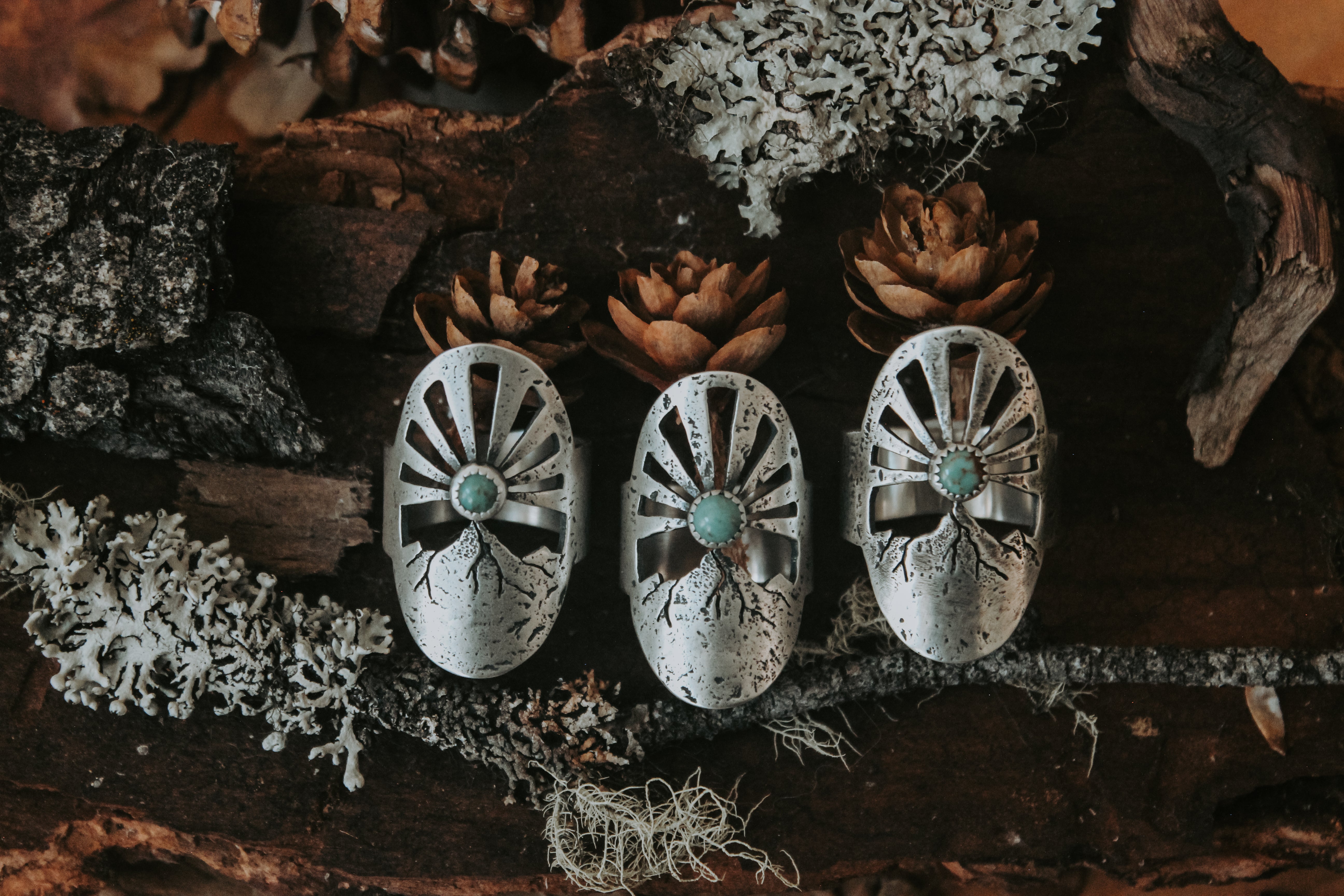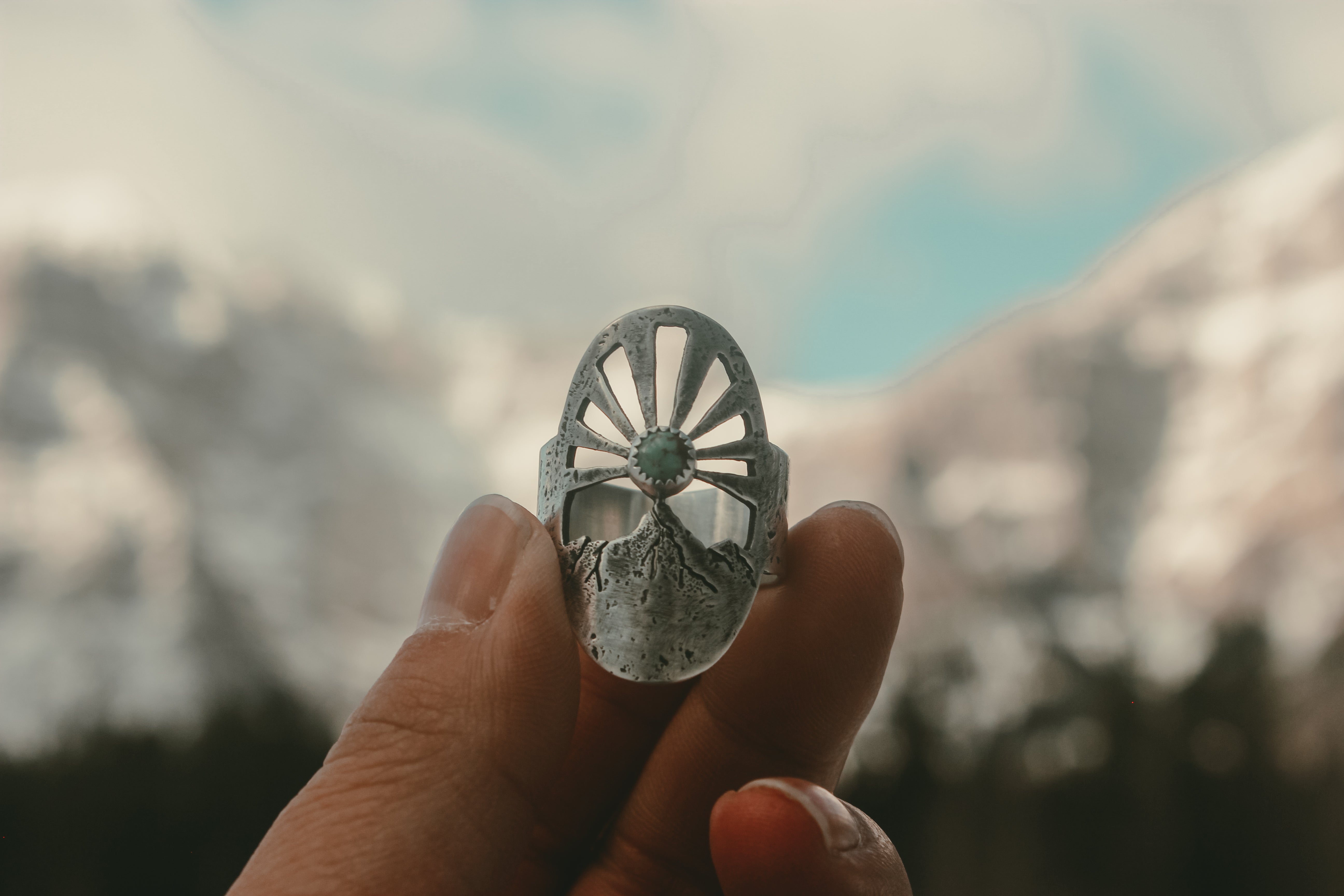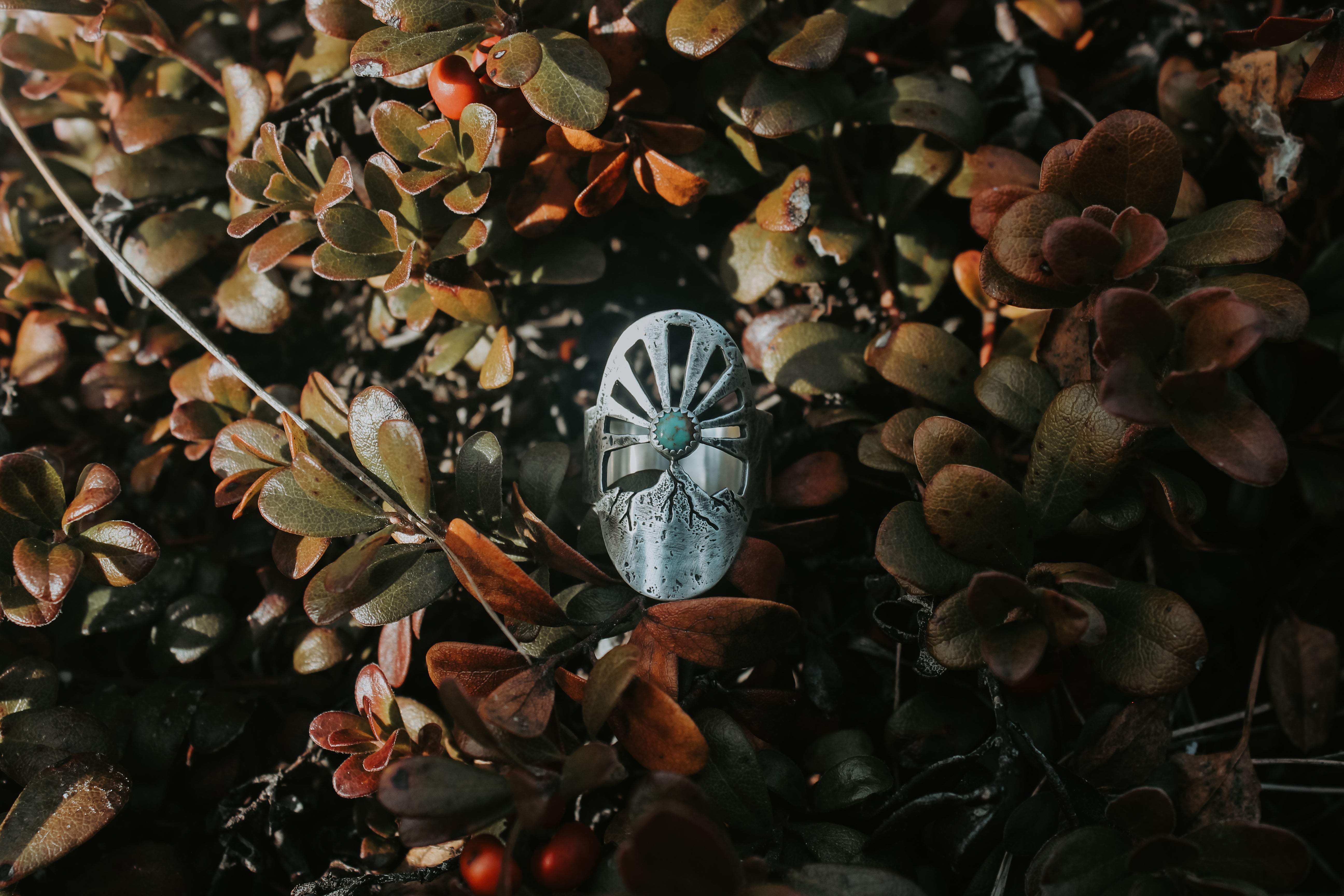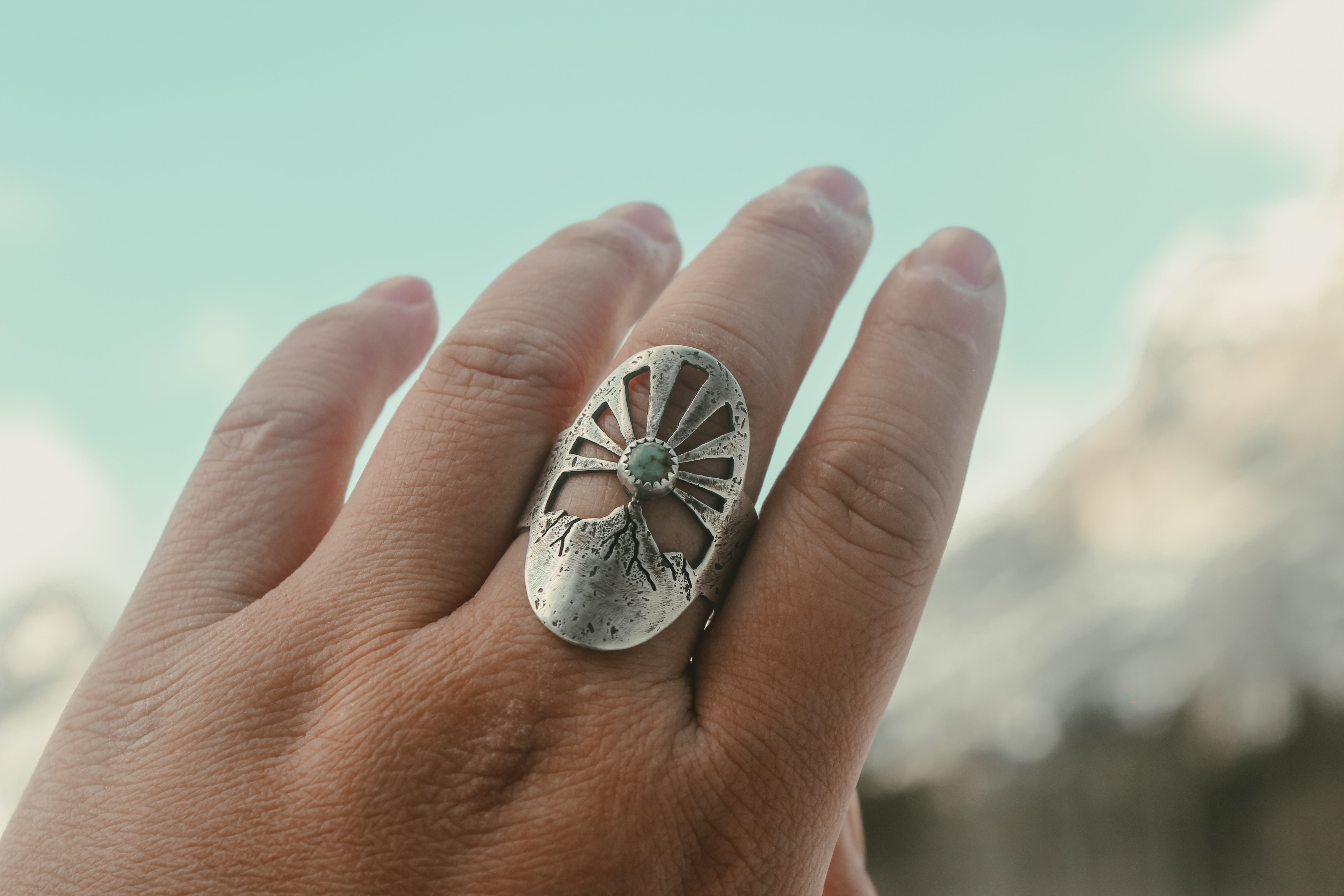 This ring was inspired by these magnificent moments before the sun peeks out, with a turquoise sun beaming rays of light into the sky. Each ray was sawn out by hand, and each ring textured with the rocks of the mountains themselves. Gritty and worn, yet smooth and weathered. It feels like it's been loved for years, already broken in in just the right places.