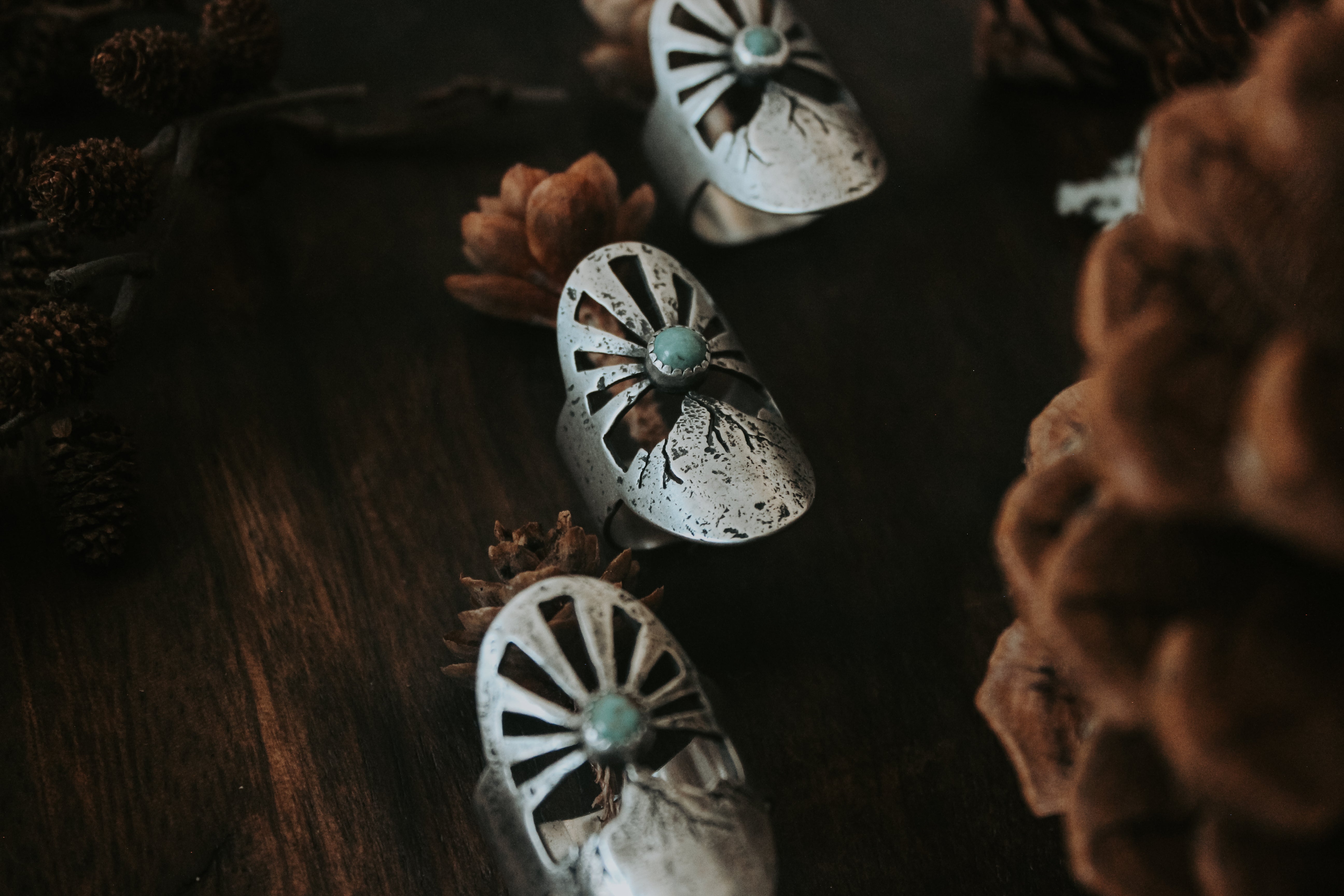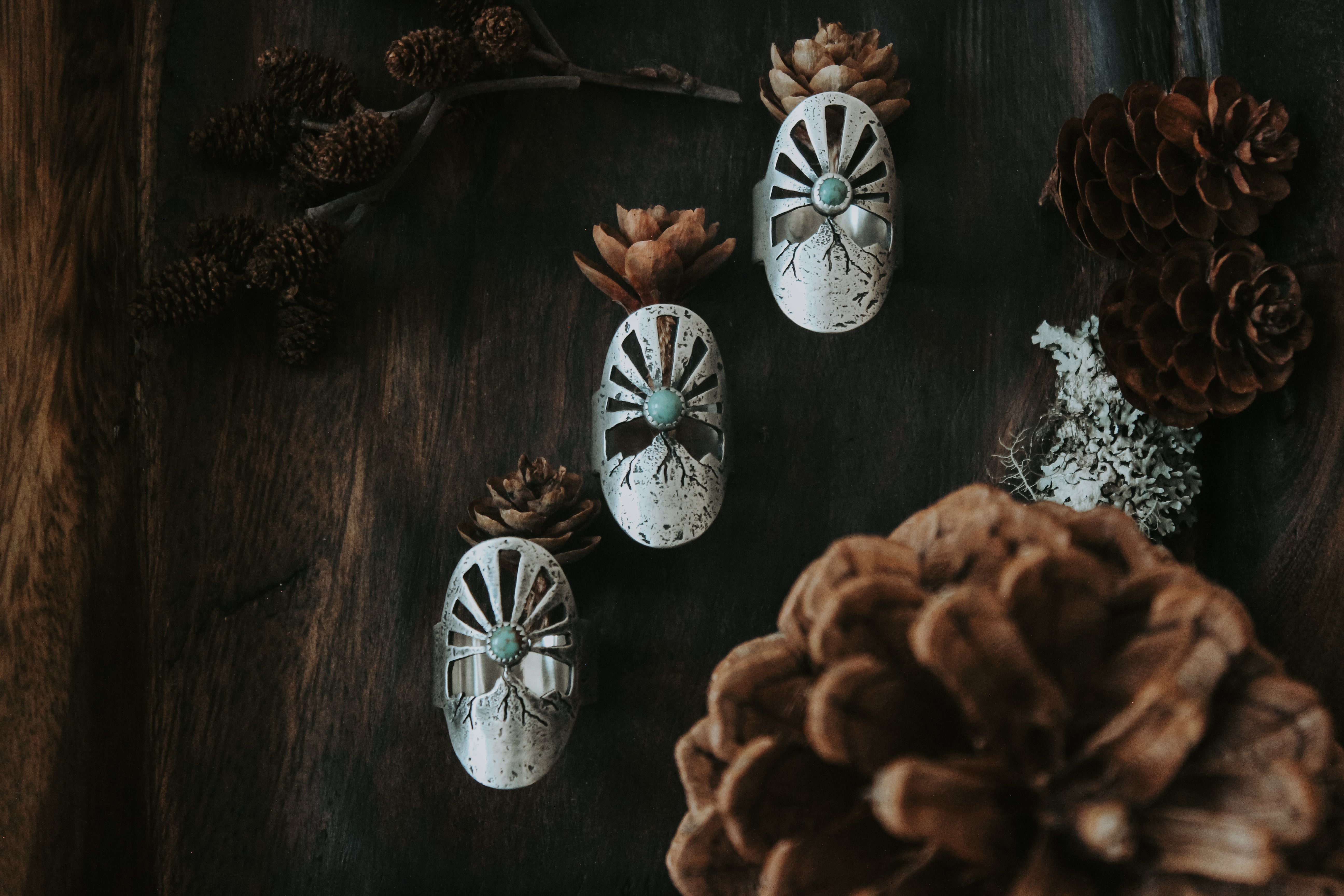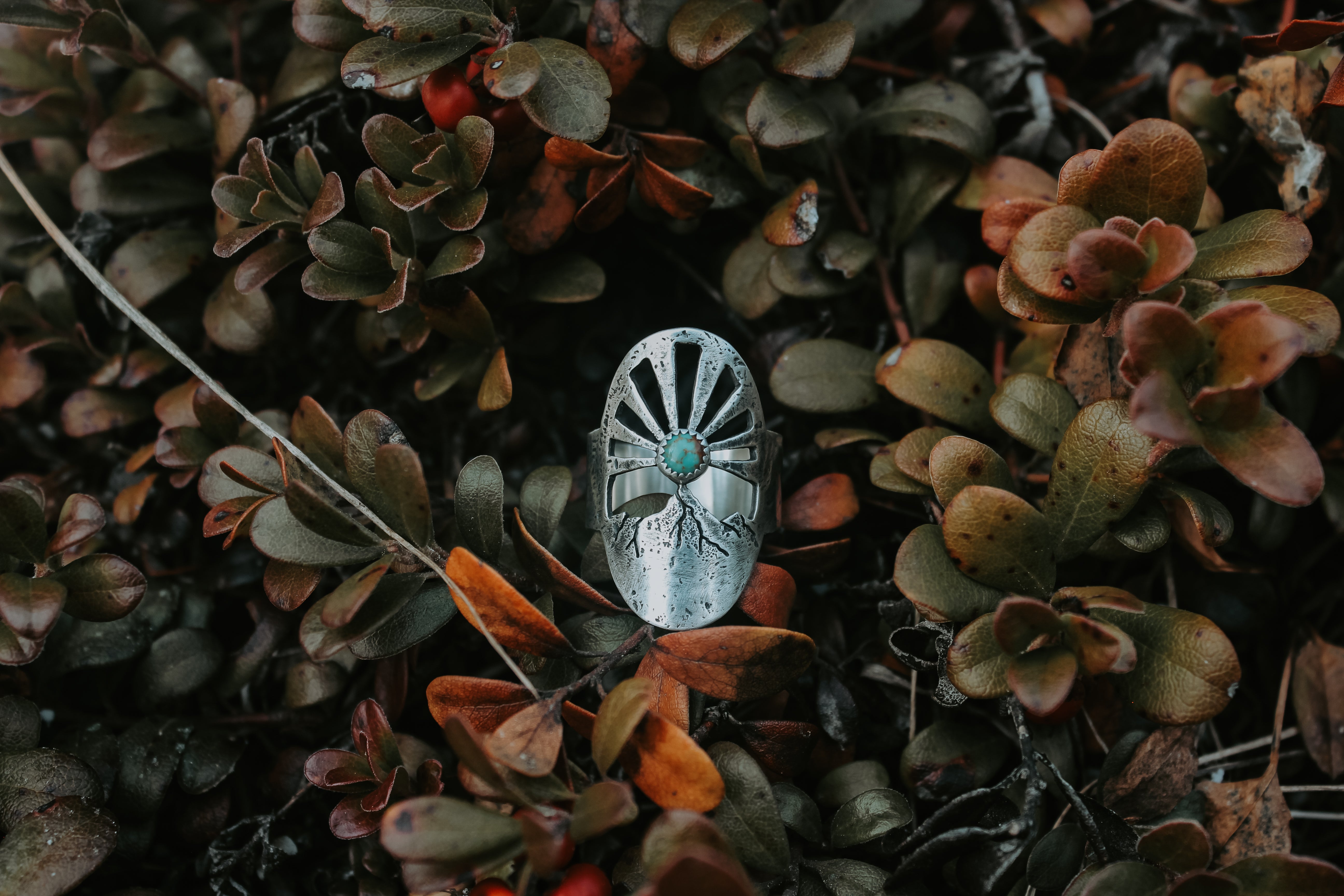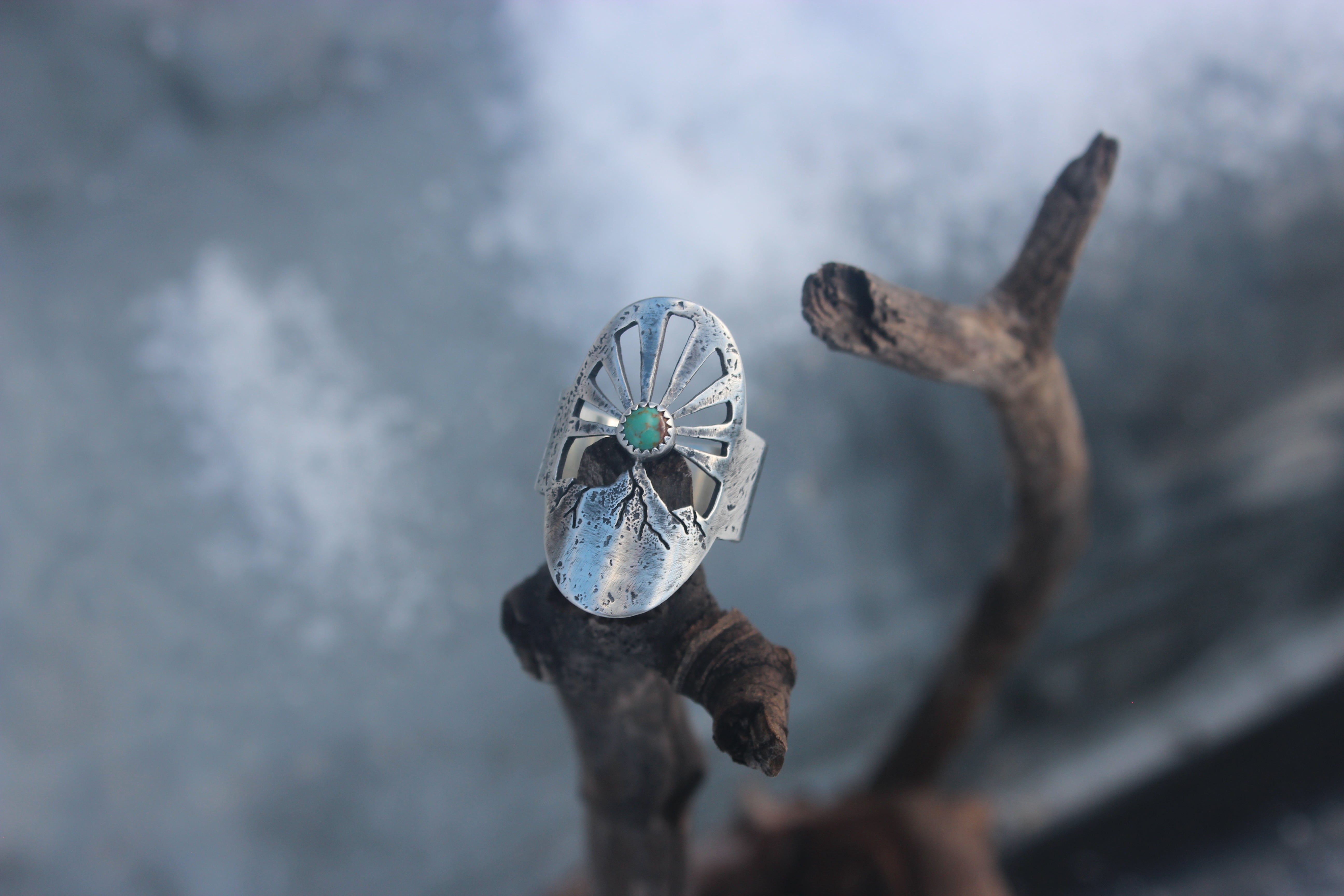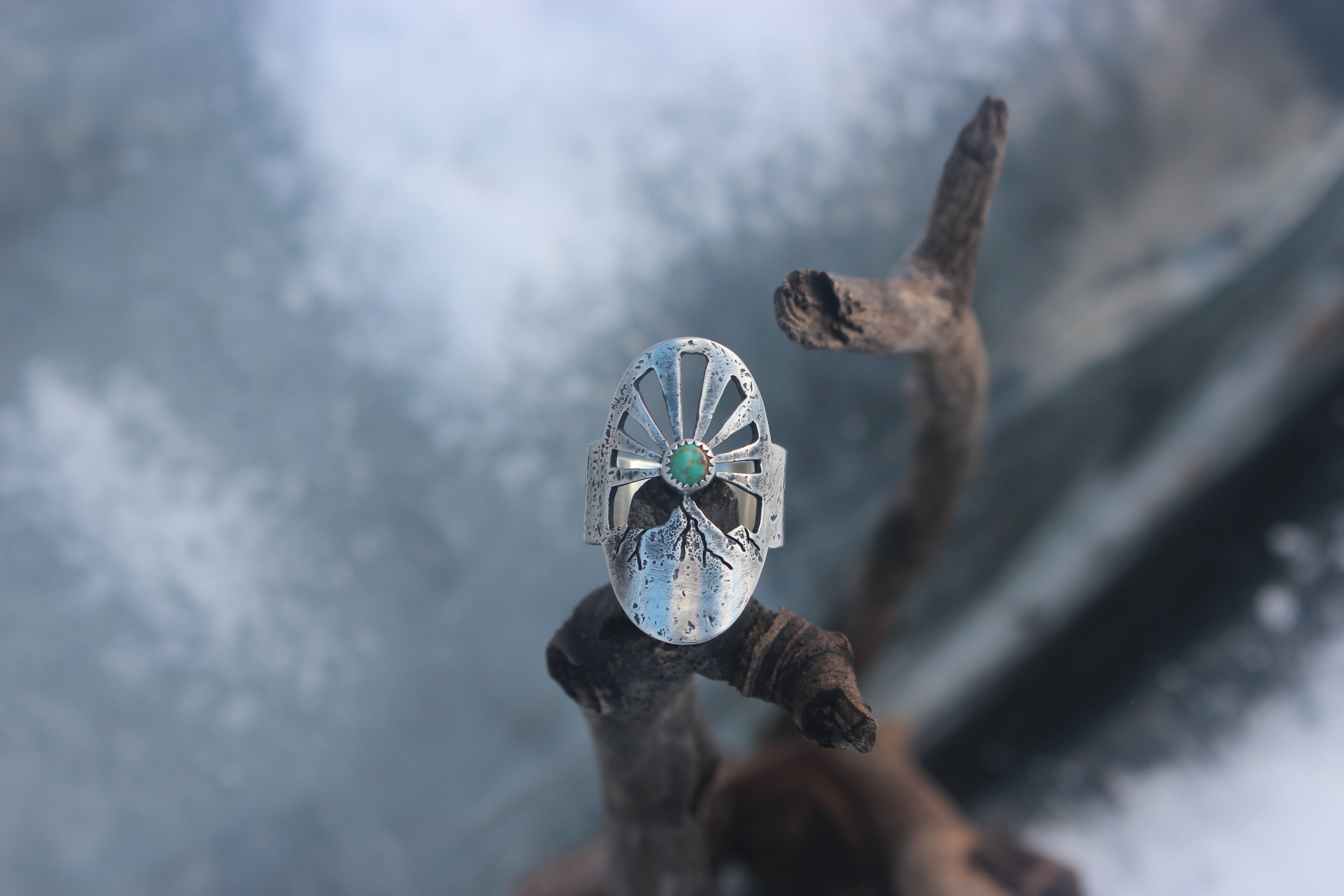 This ring was inspired by these magnificent moments before the sun peeks out, with a turquoise sun beaming rays of light into the sky. Each ray was sawn out by hand, and each ring textured with the rocks of the mountains themselves. Gritty and worn, yet smooth and weathered. It feels like it's been loved for years, already broken in in just the right places.