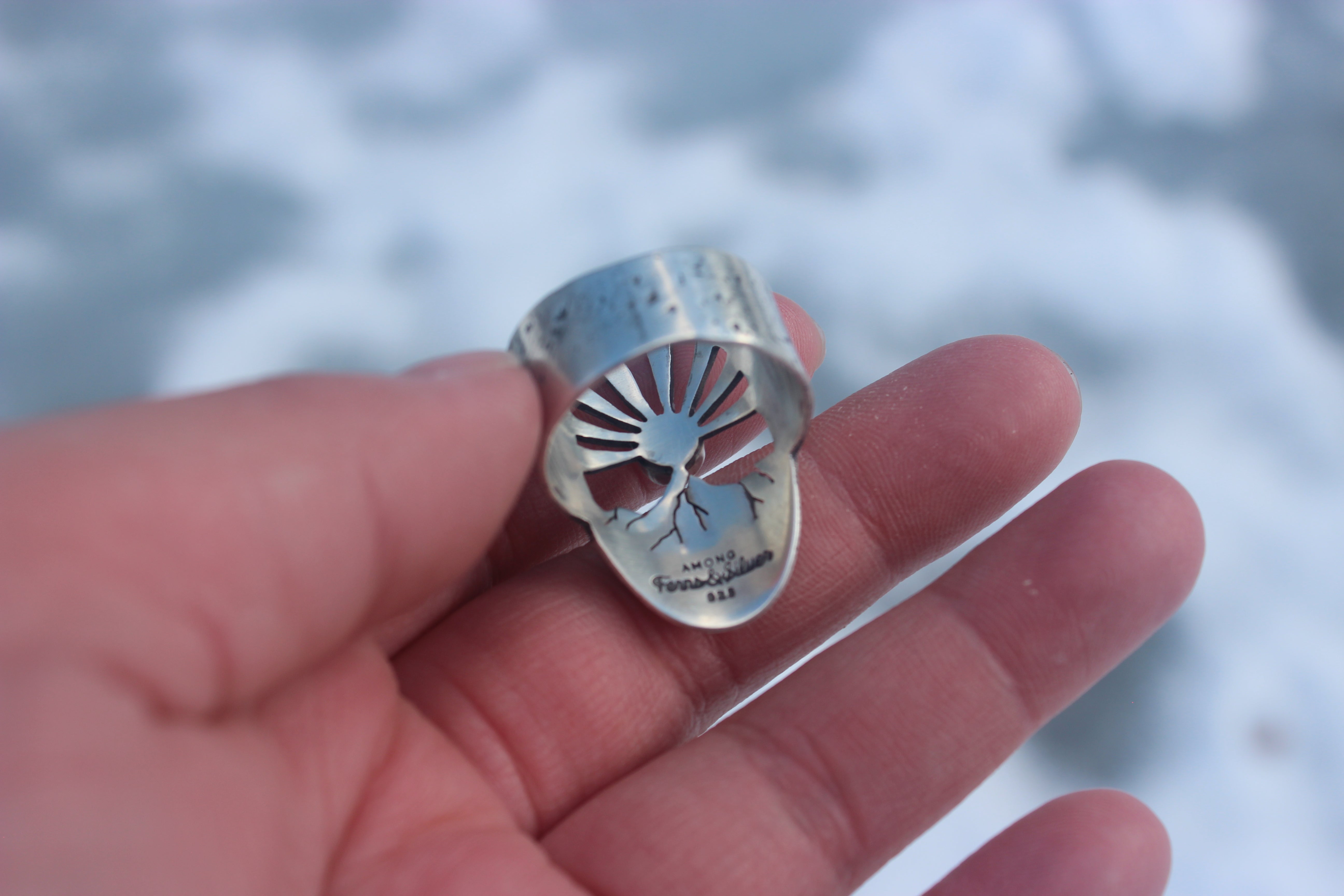 Made in your size, please choose your size from the drop down menu. If you require a size that is not listed, please get in touch!- You will need to size up 1/2 to a full size for this style of ring. For example, if you are a size 7, you may want to size up to either a 7 1/2, 7/3/4, or an 8. If you have a particularly thick base on your finger, I suggest sizing up a full size. These rings are very unforgiving when they're too small, but much more forgiving when they're a bit too large.