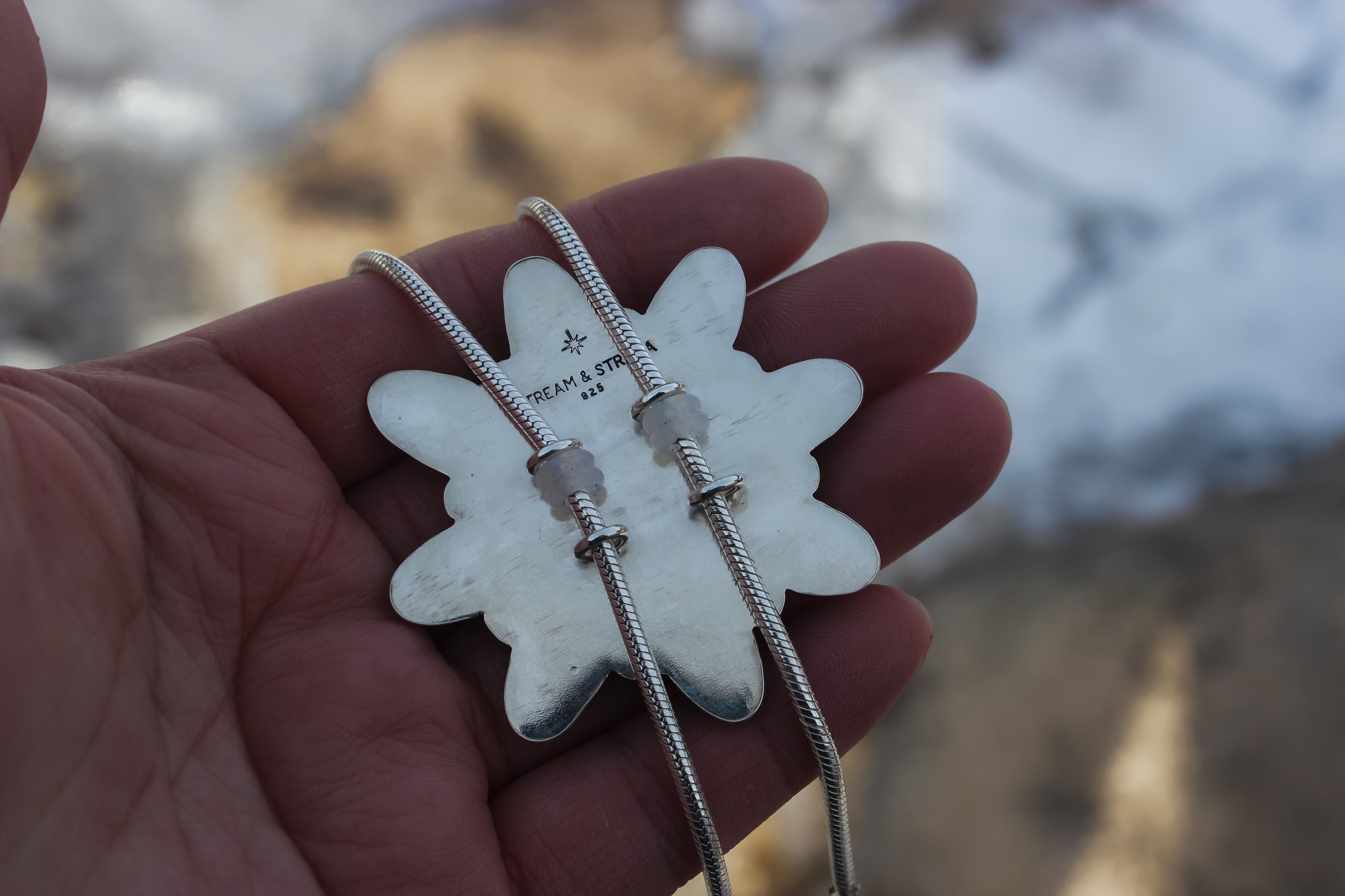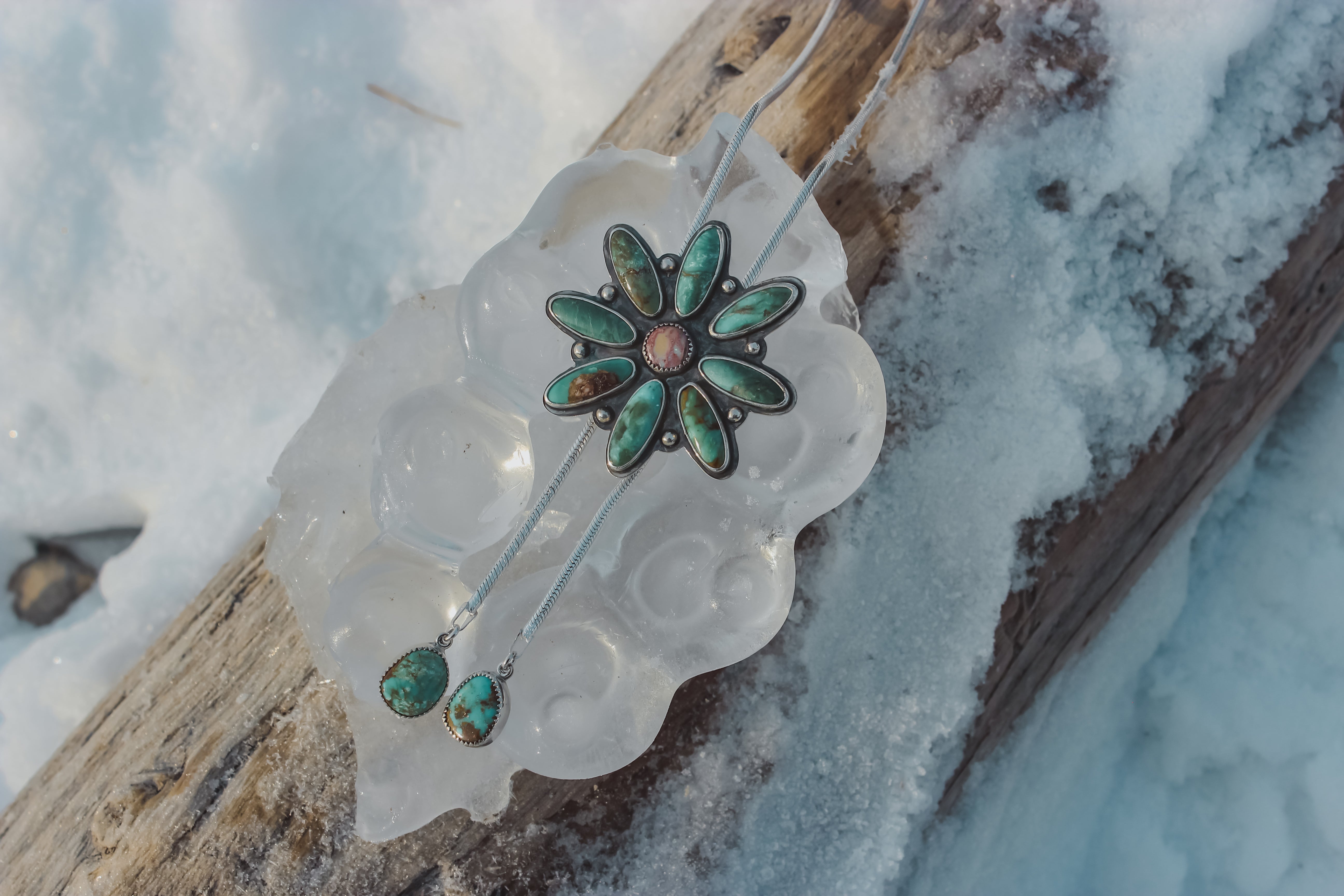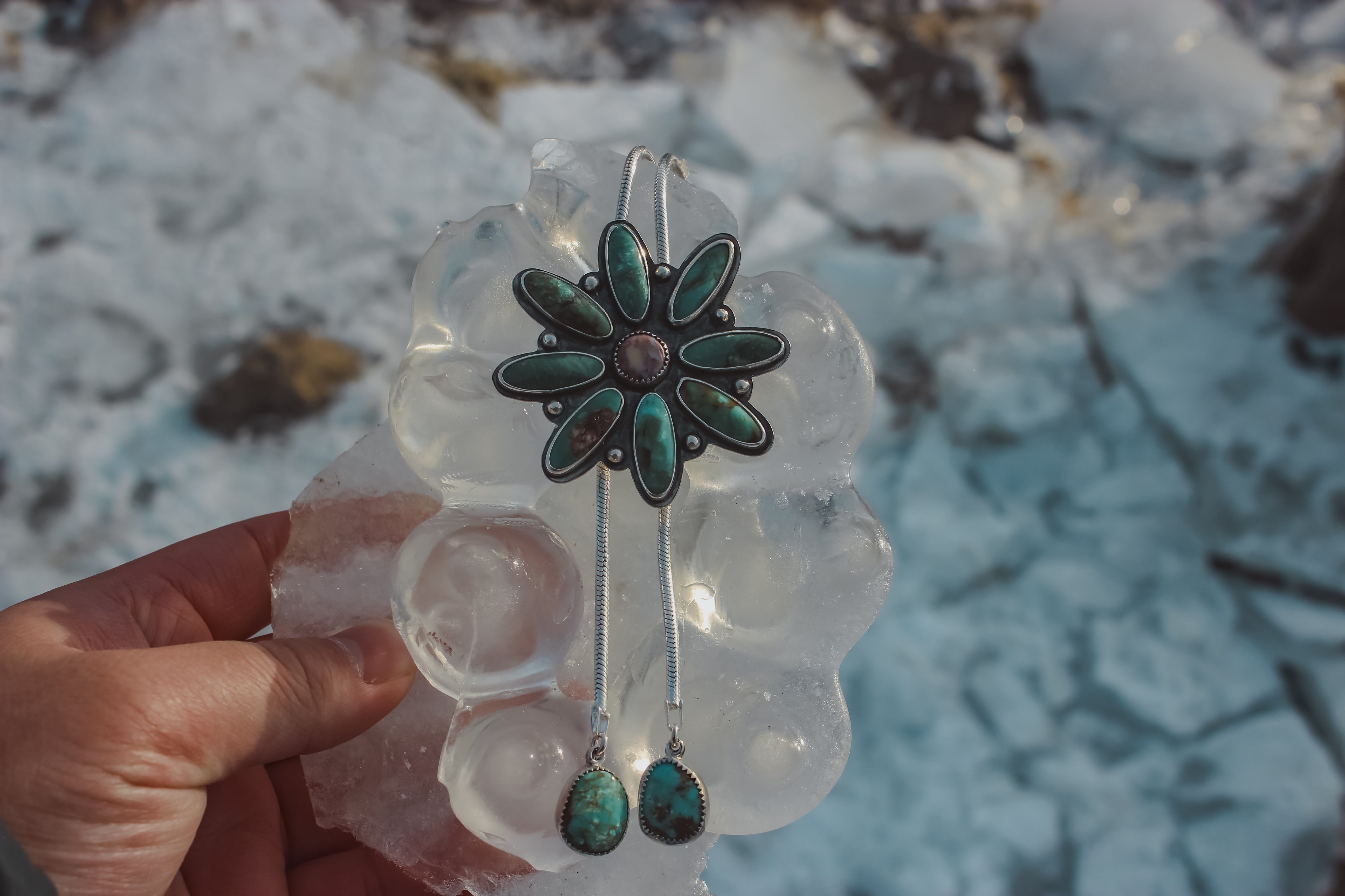 The most glorious piece I've ever made! This turquoise beauty boasts 11 stones clustered into a big flower for a statement that also looks refined. The chain bolo is a bit more feminine than a regular leather bolo, and pairs well with everything from a sun dress to a cozy knit sweater. It is fully adjustable, secure and slips on and off the head for easy wear.