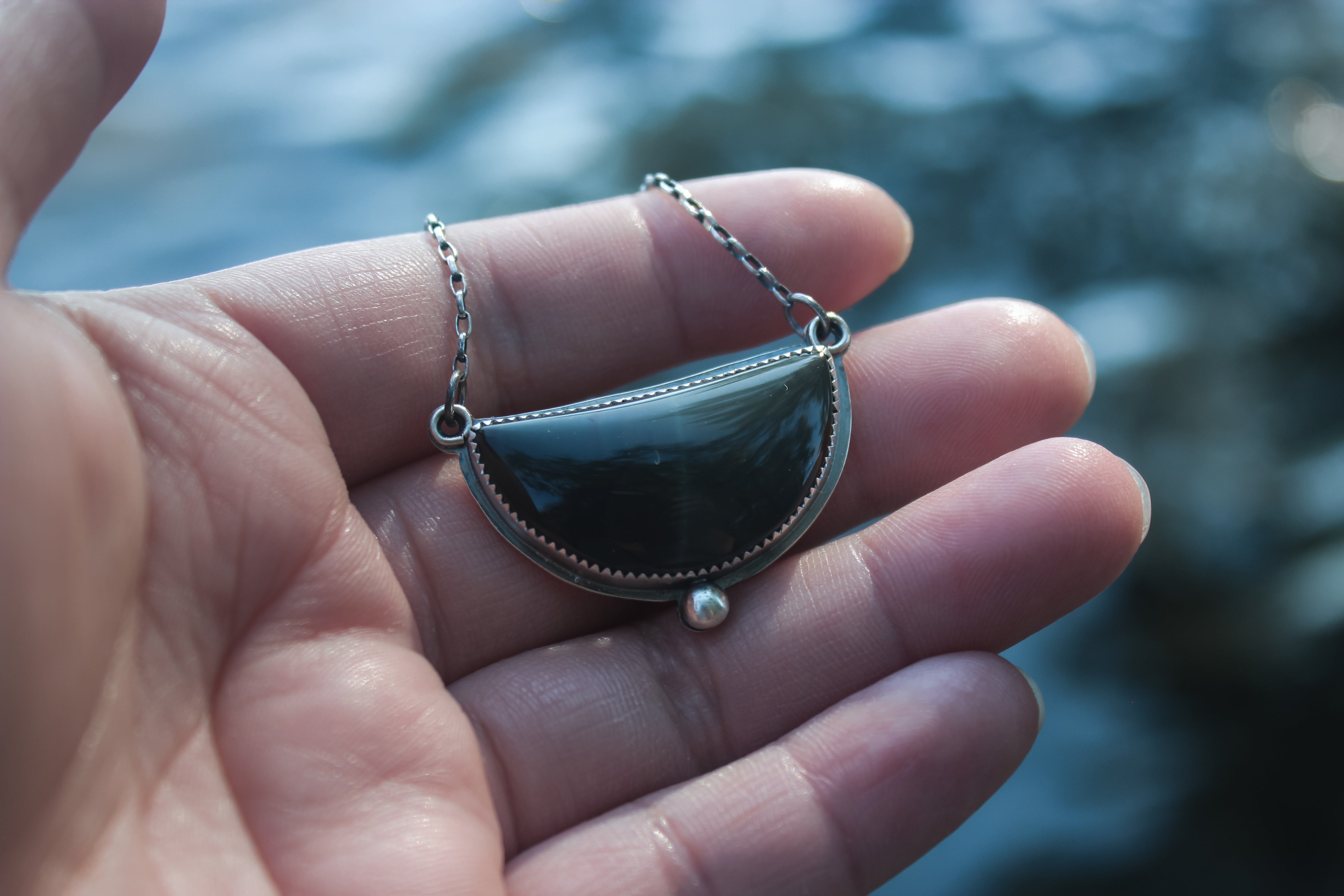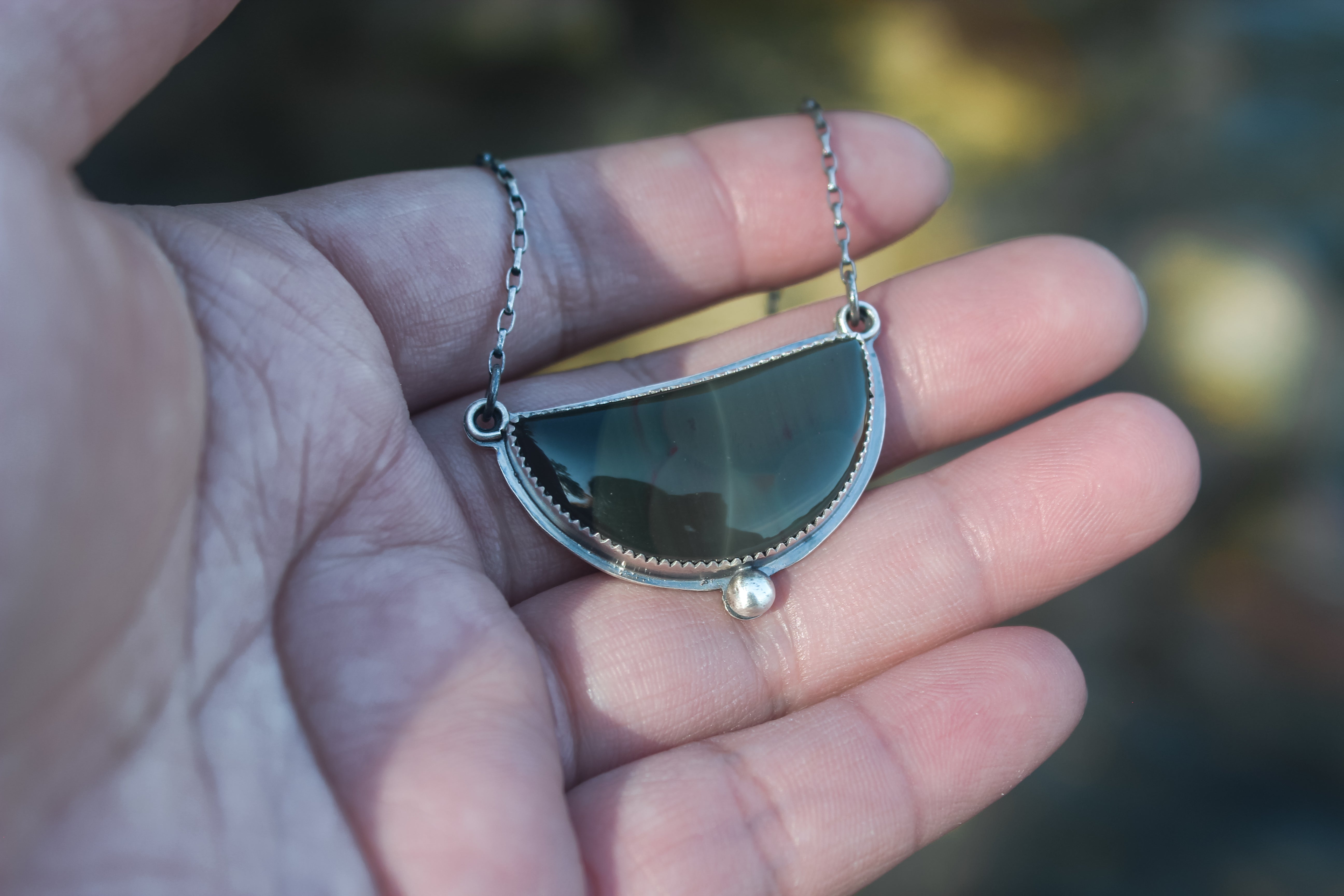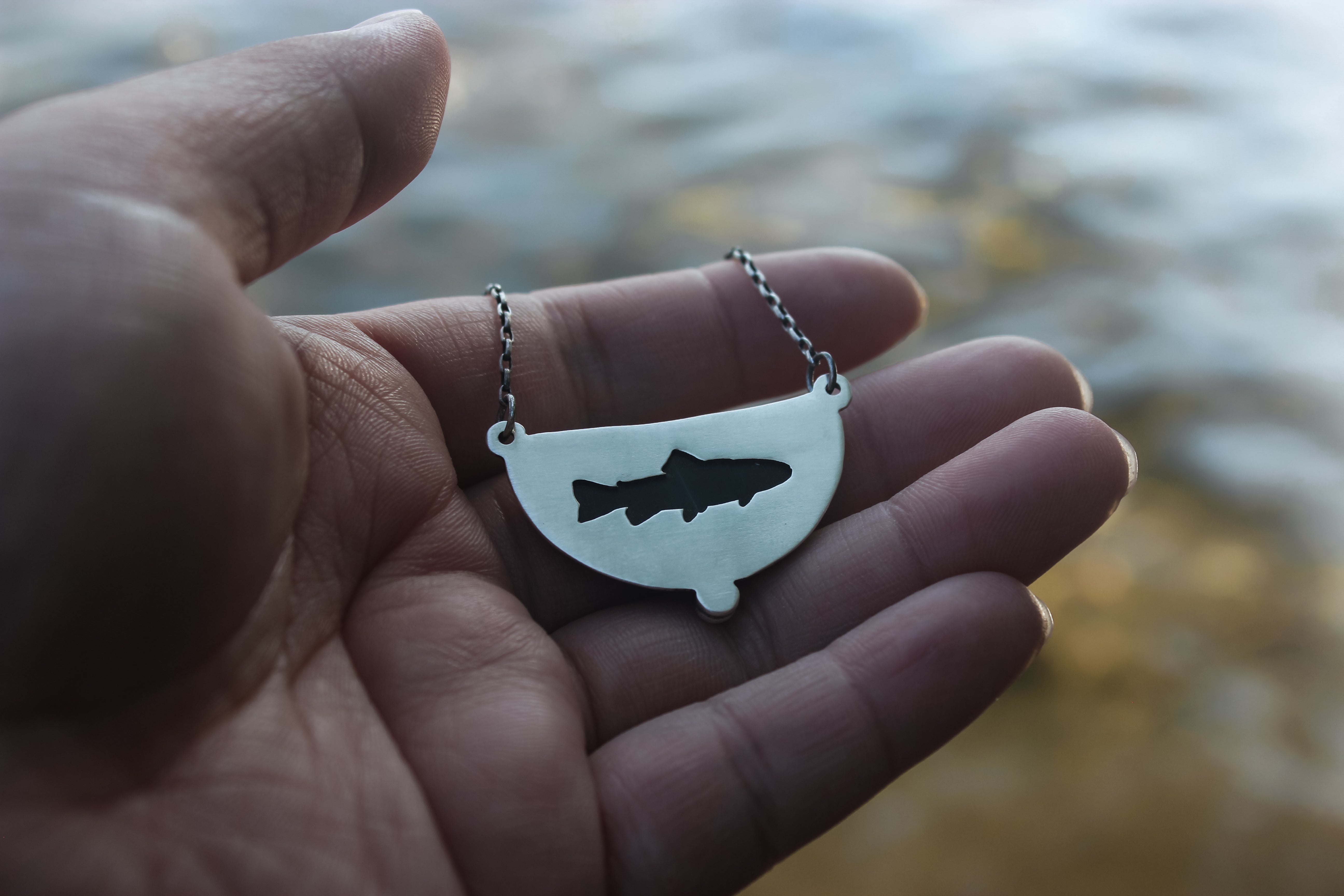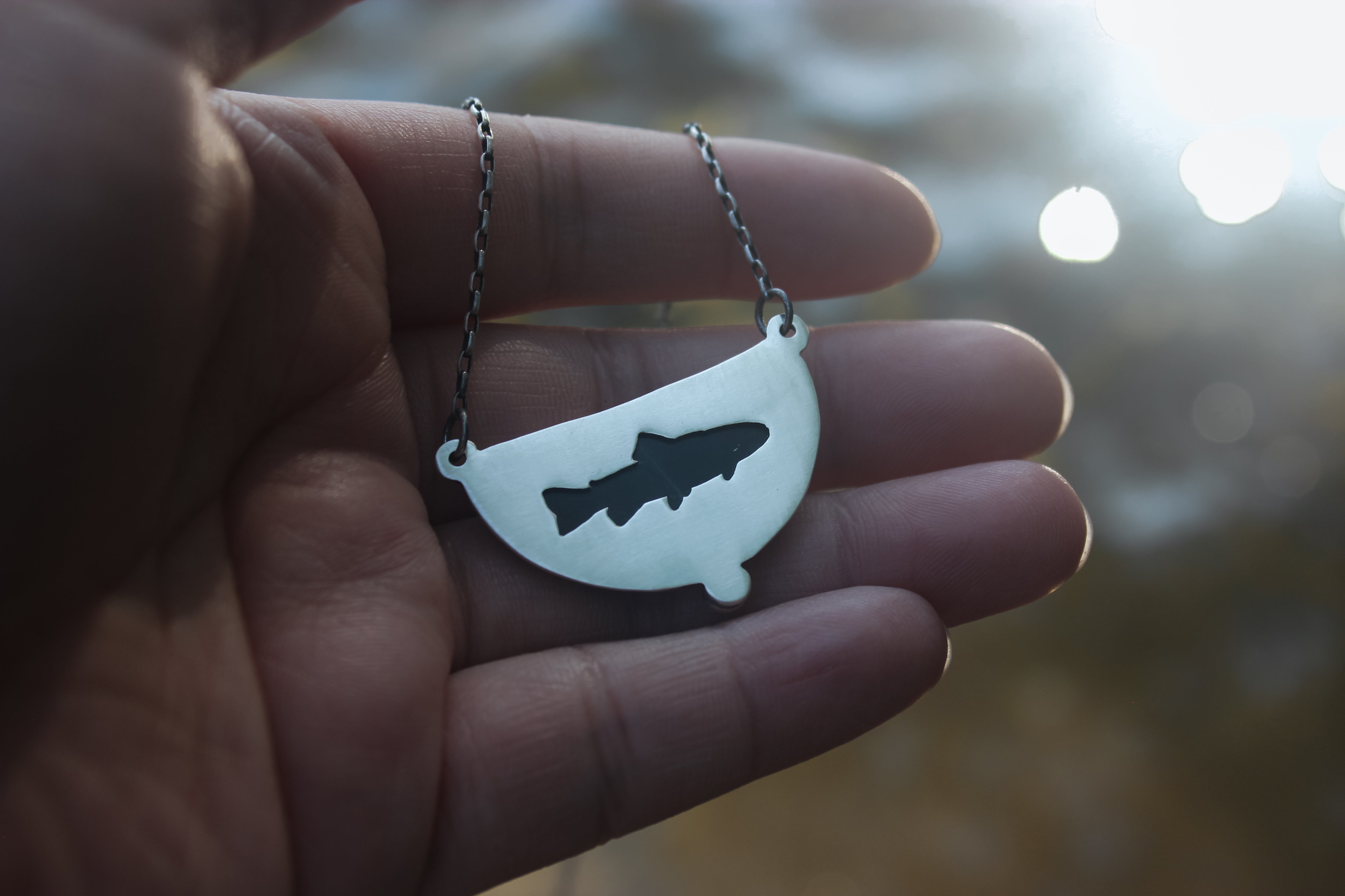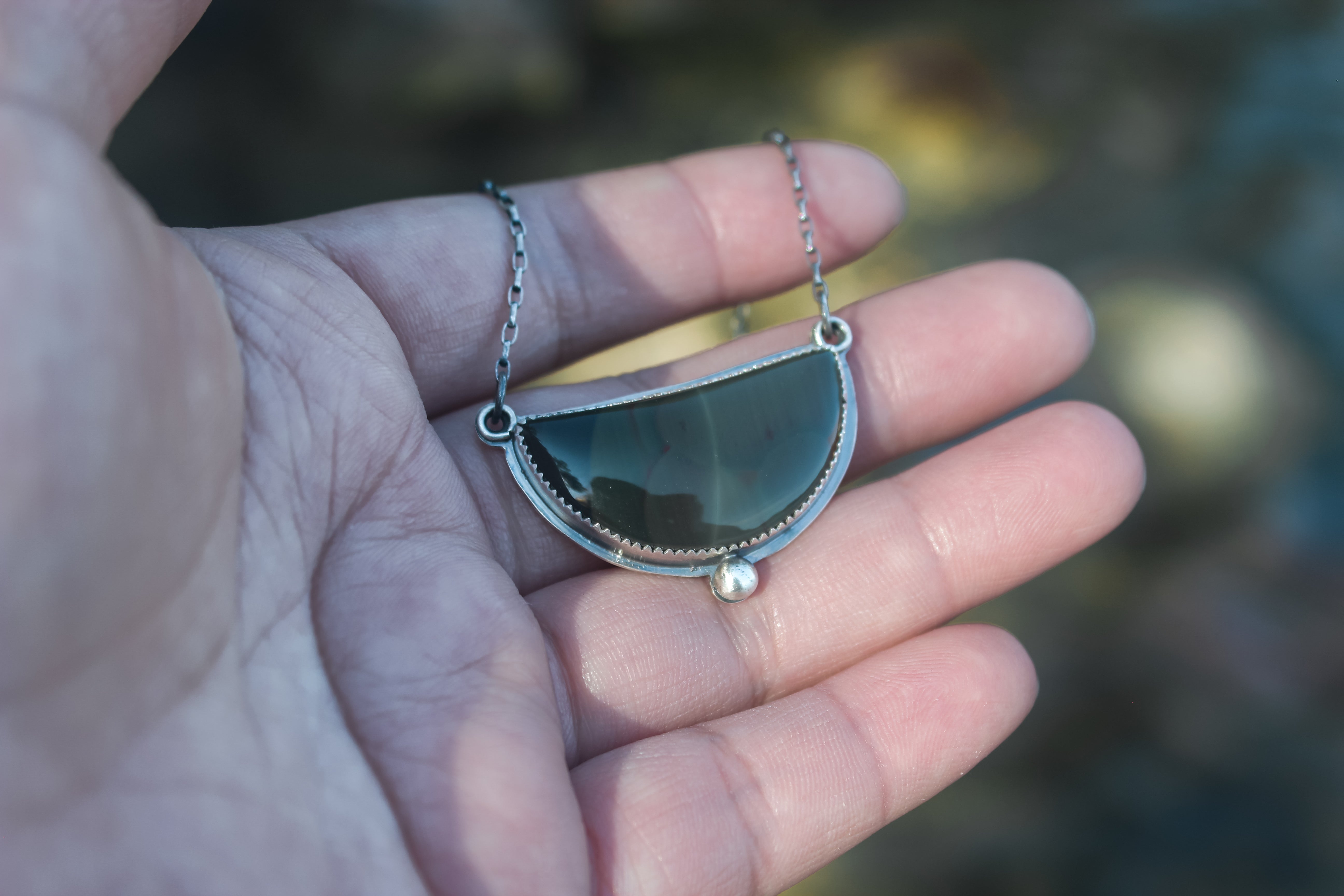 The stone in this necklace likes to hide from the spotlight! It features swirling orbs of blue and green with subtle stripes of red, all nestled into a subtle crescent moon shape. The backside features a trout cutout, letting the color shifts of the stone to shine through. It's a truly remarkable stone that you need to see in person!