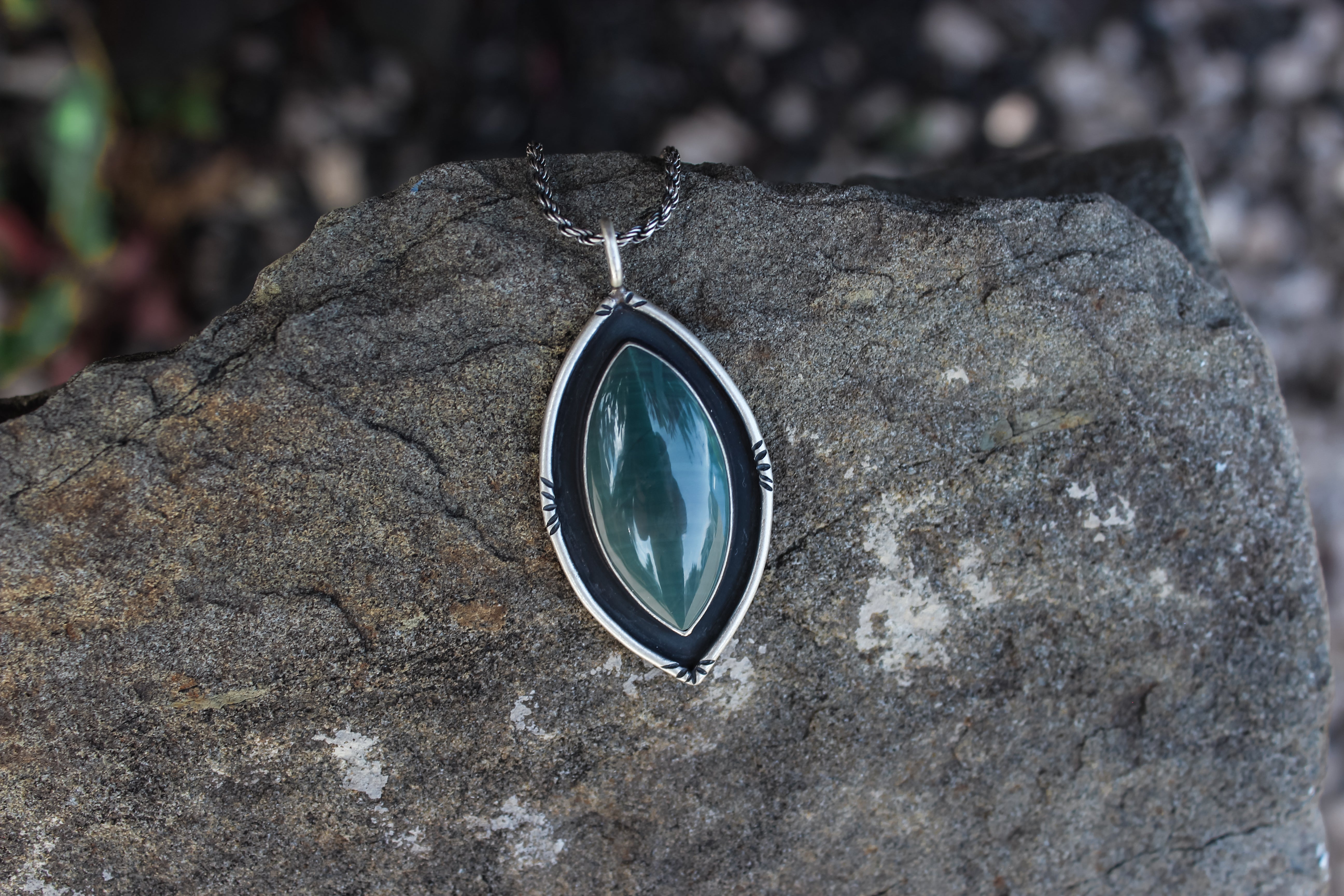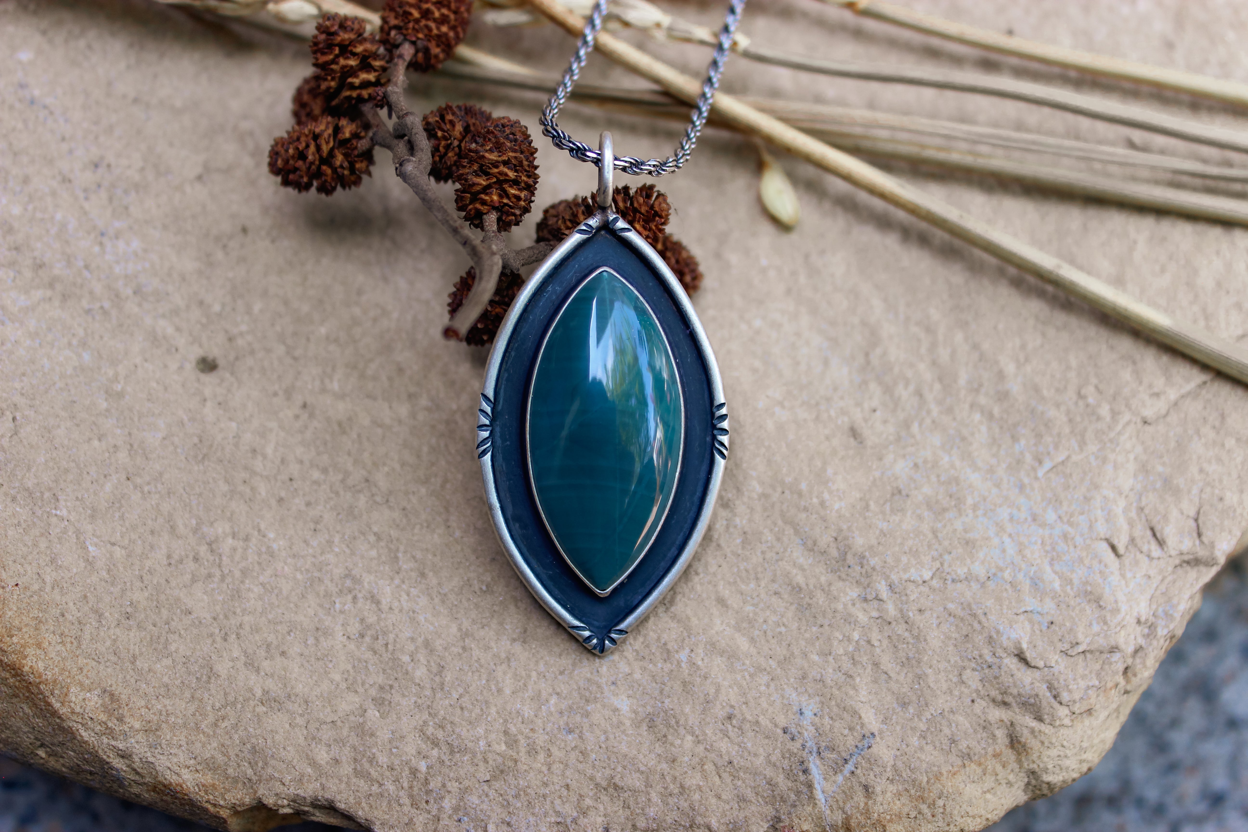 A beautiful teal Skaggs jasper is set within a shadowbox style setting, to bring out the color of this amazing stone. An open back and detailed stamping around the border complete this piece perfectly. Great for layering and everyday wear.