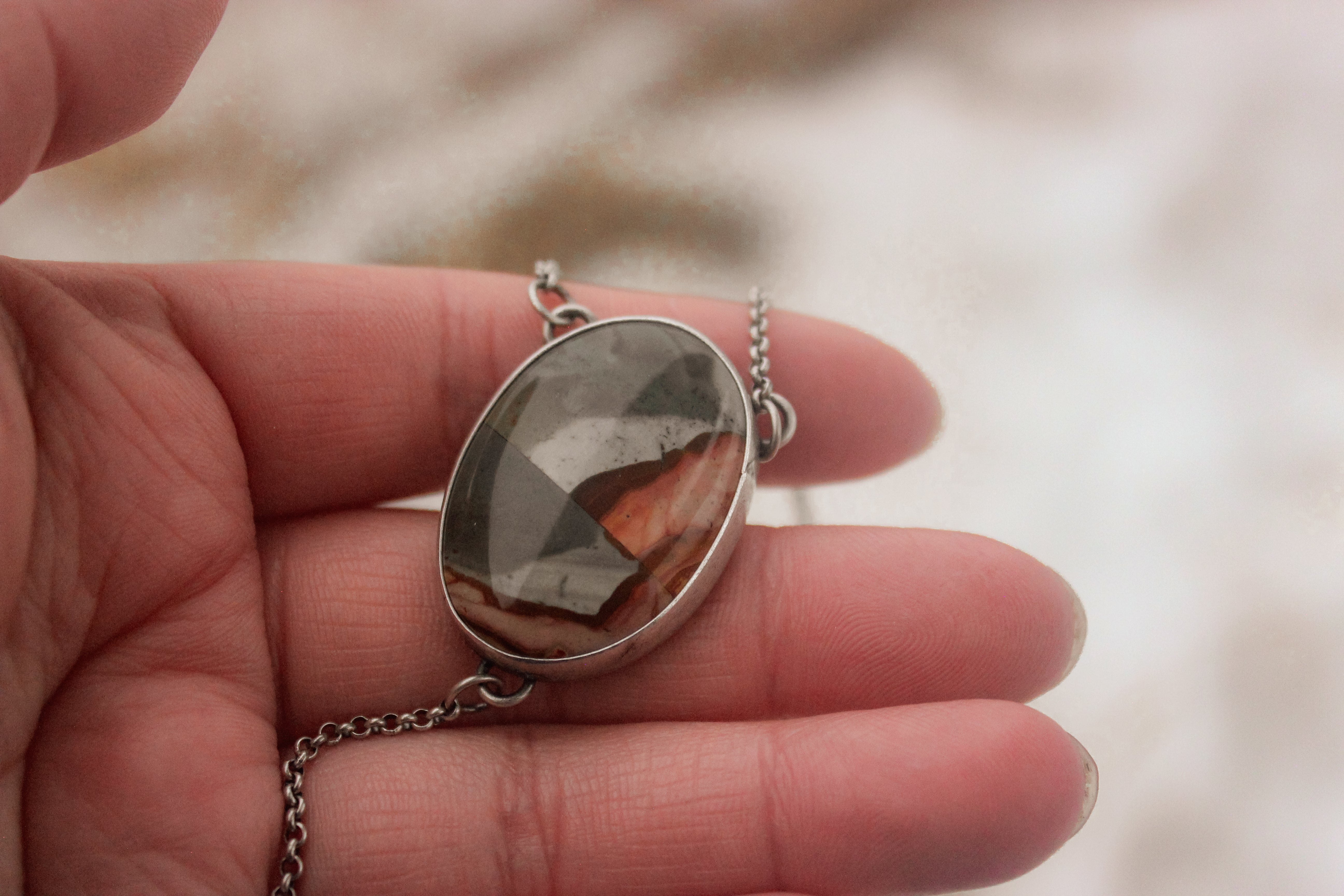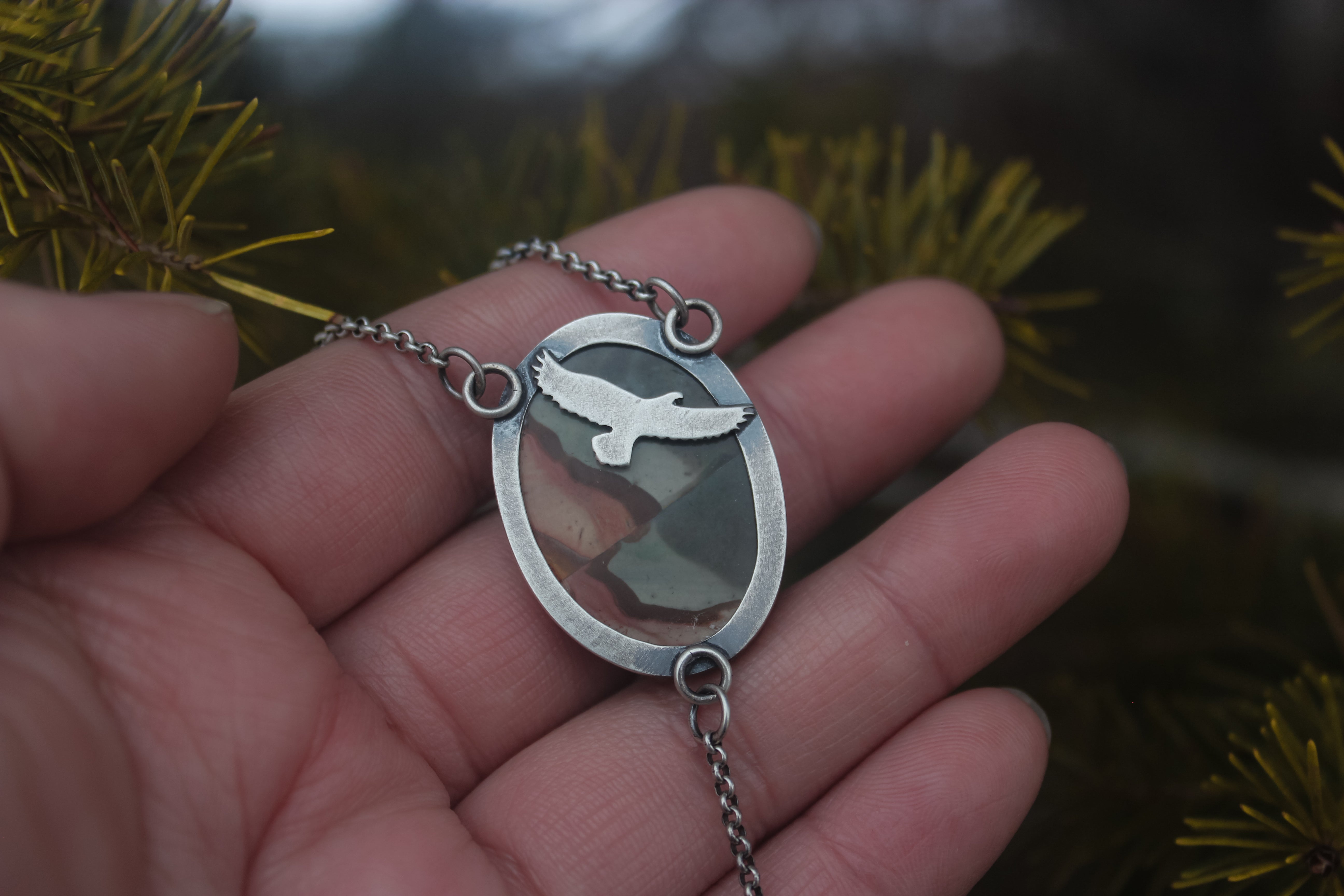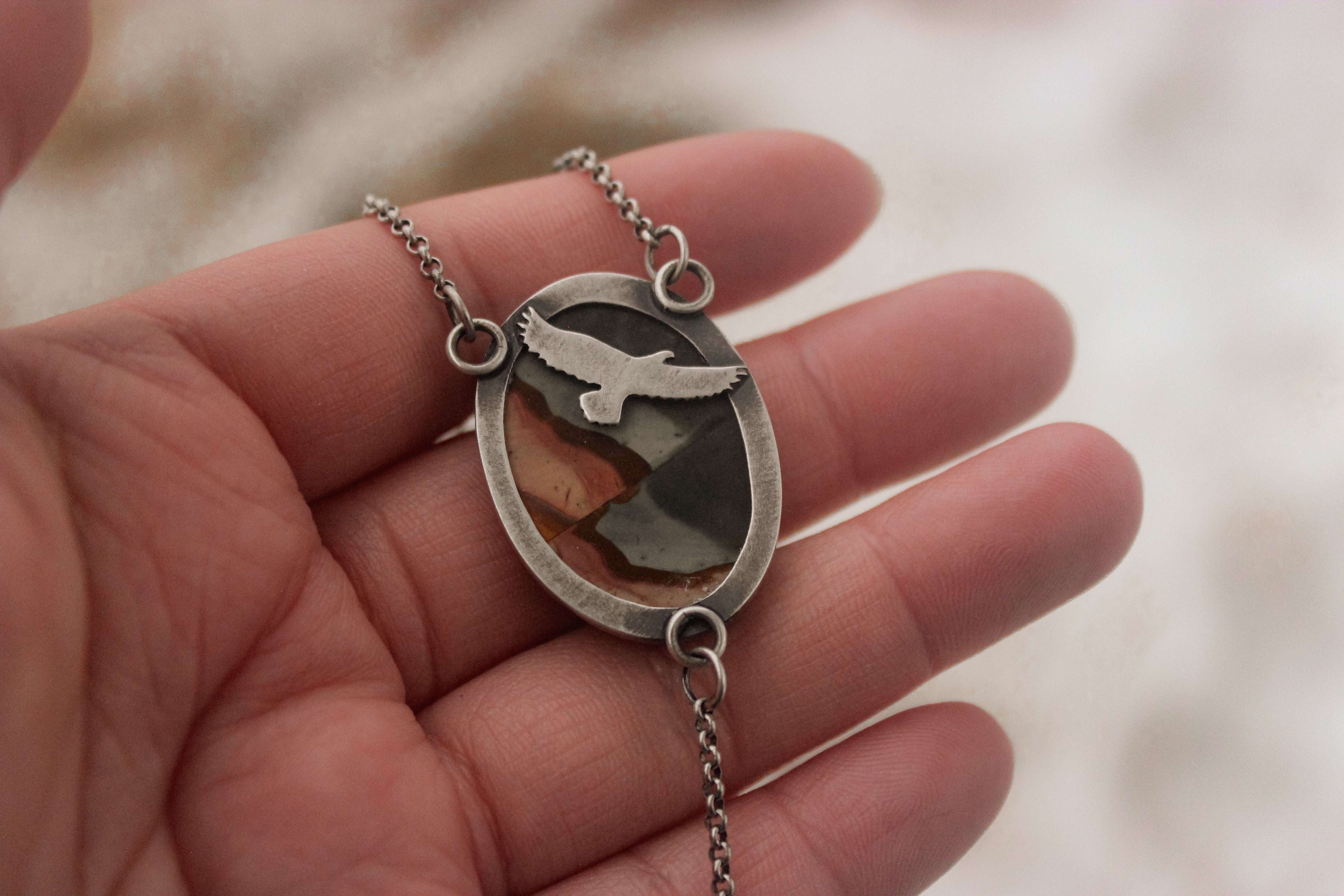 The line cutting across this stone is reminiscent of a fault line cutting through layers of rock, a clear divide where there is offset between the two sides. Rusty red earth contrasts beautifully against cool grey skies- dusk in the desert. A long eagle soars above the ground, scanning for prey along a barren landscape.