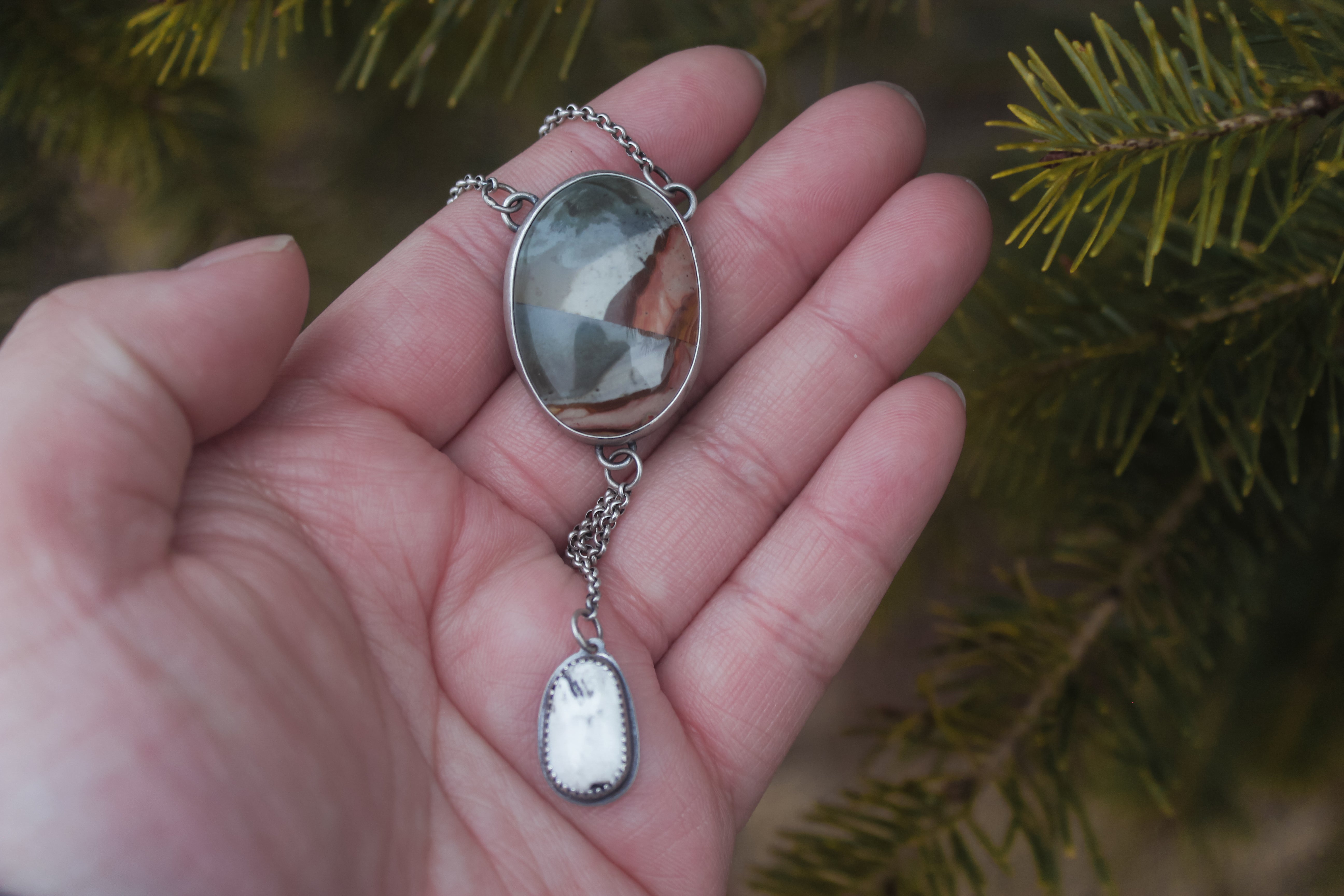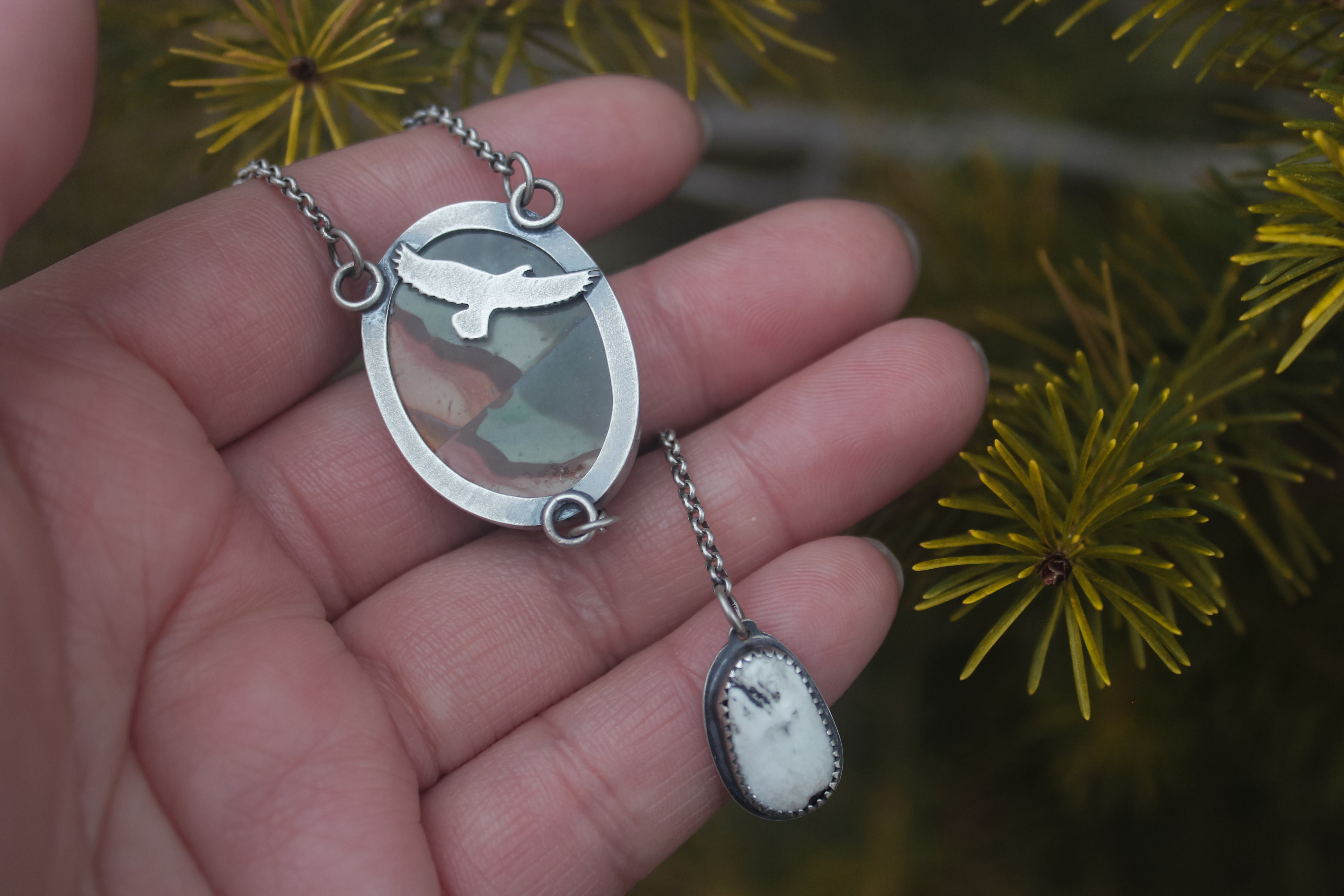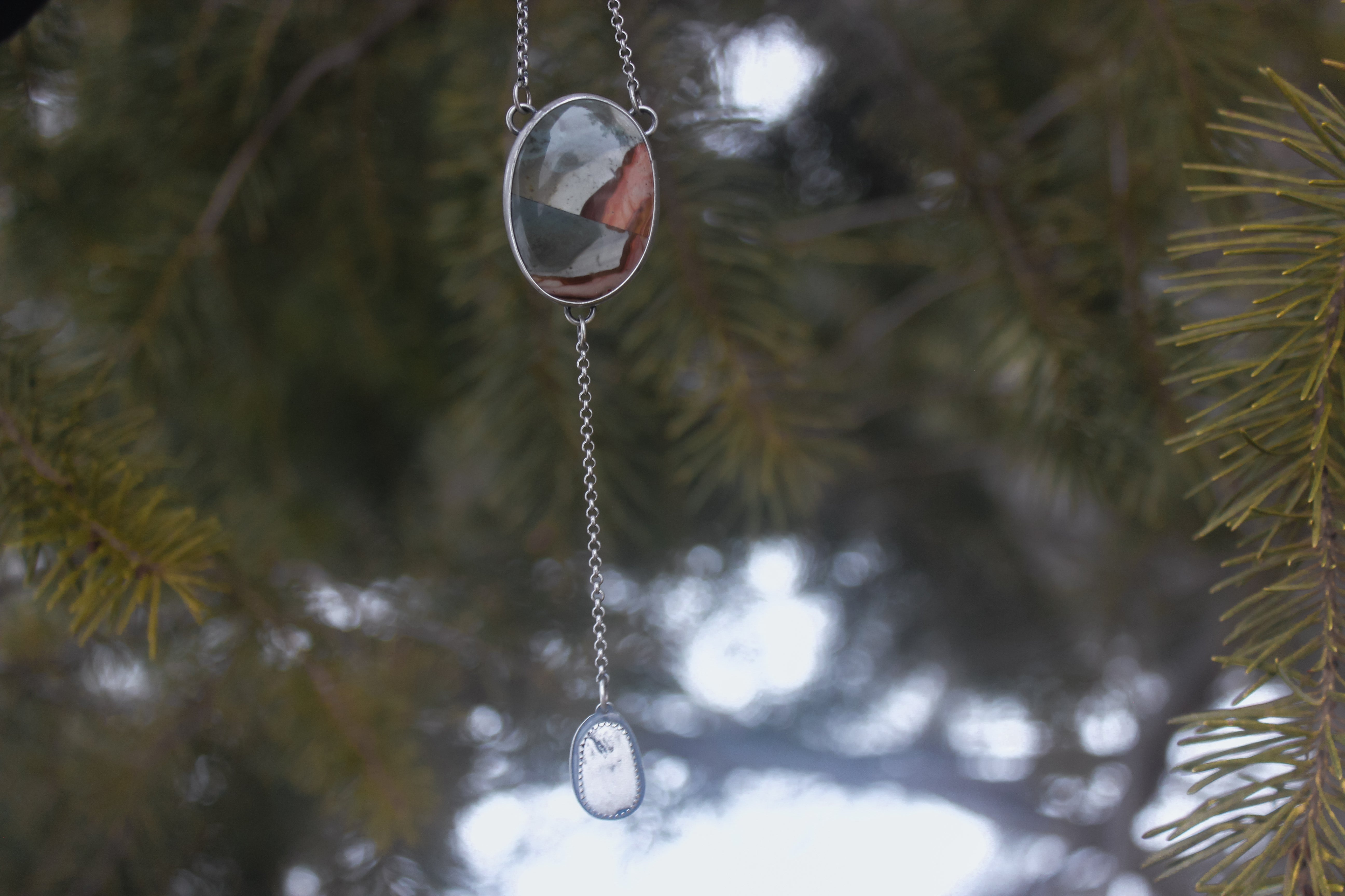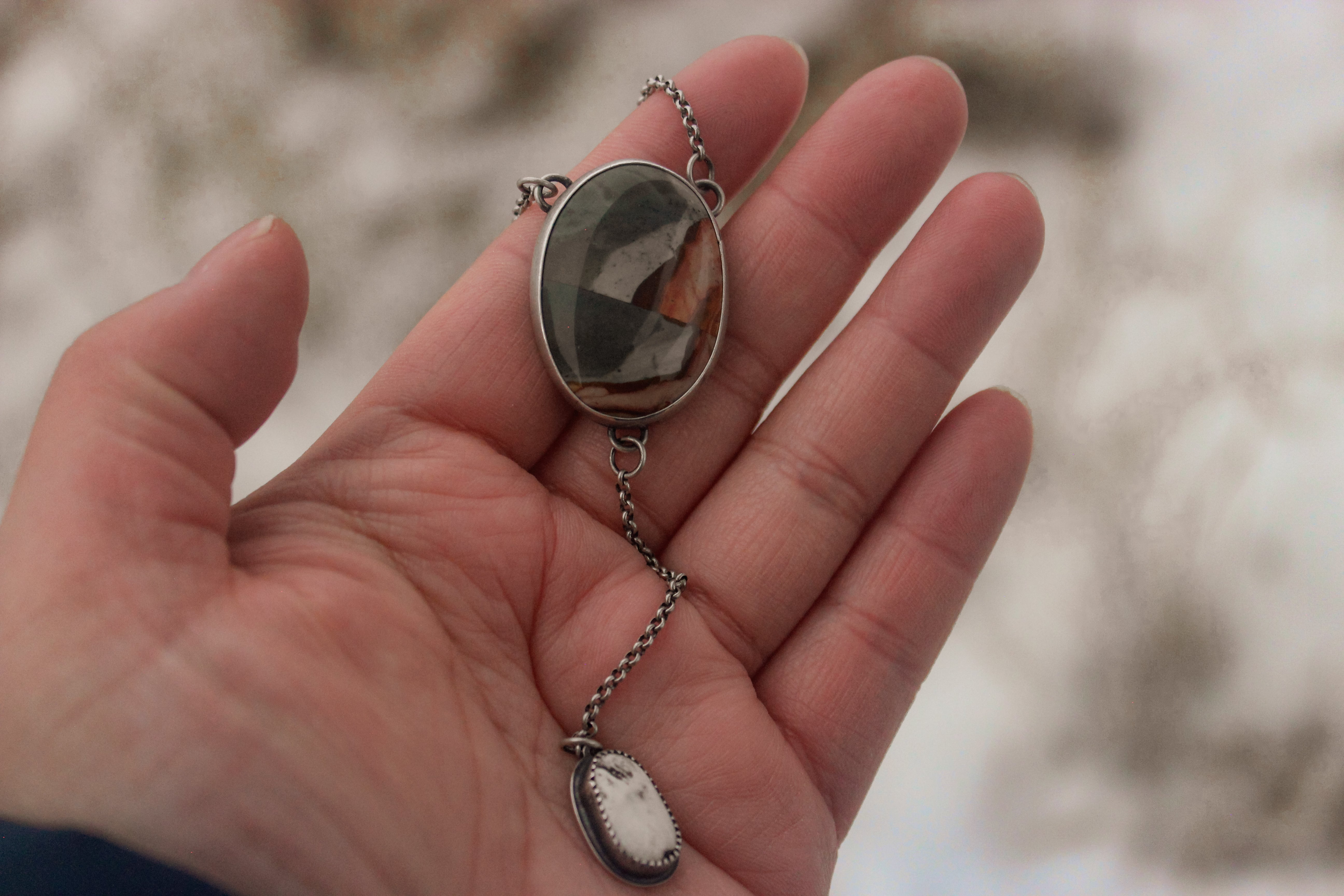 The line cutting across this stone is reminiscent of a fault line cutting through layers of rock, a clear divide where there is offset between the two sides. Rusty red earth contrasts beautifully against cool grey skies- dusk in the desert. A long eagle soars above the ground, scanning for prey along a barren landscape.