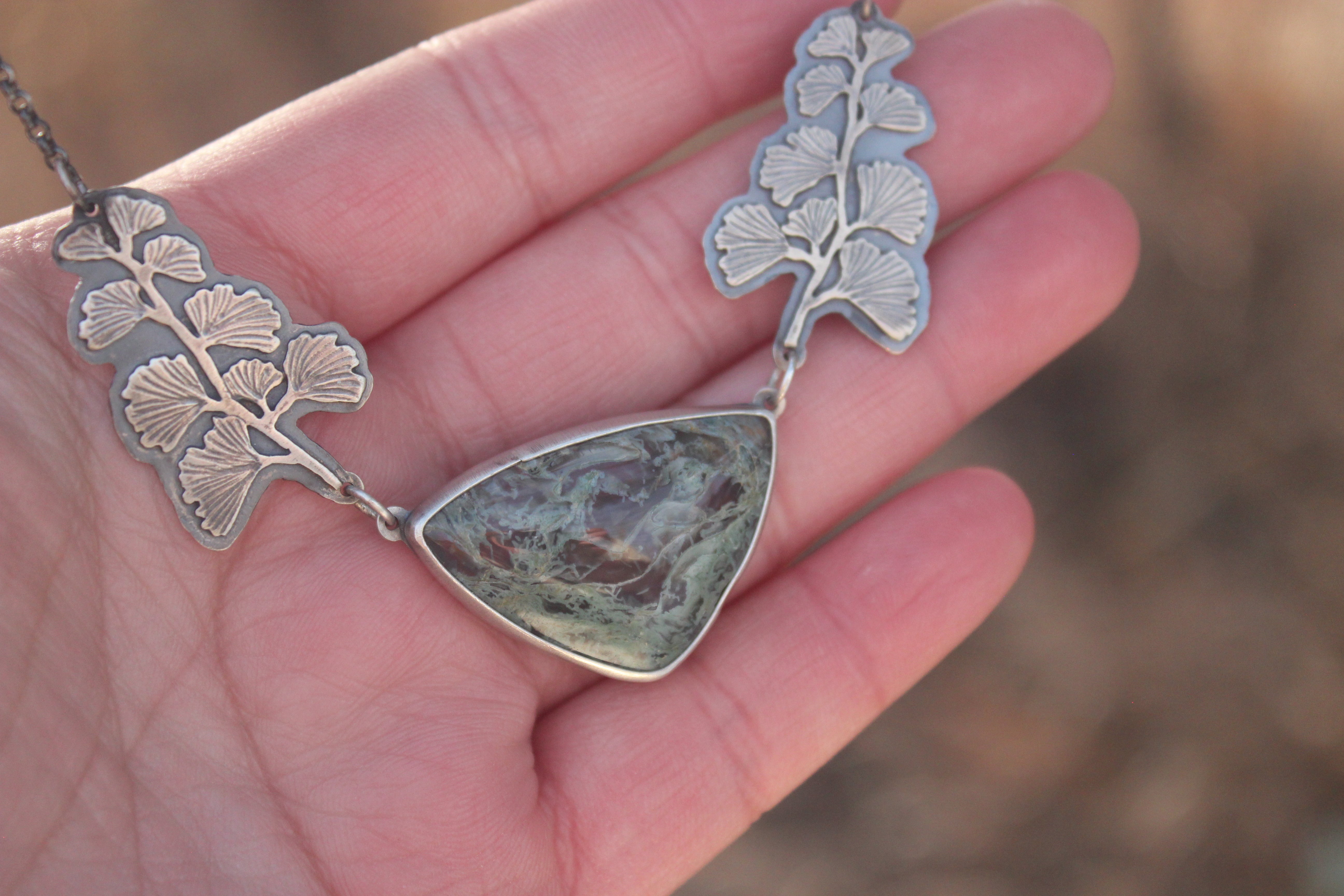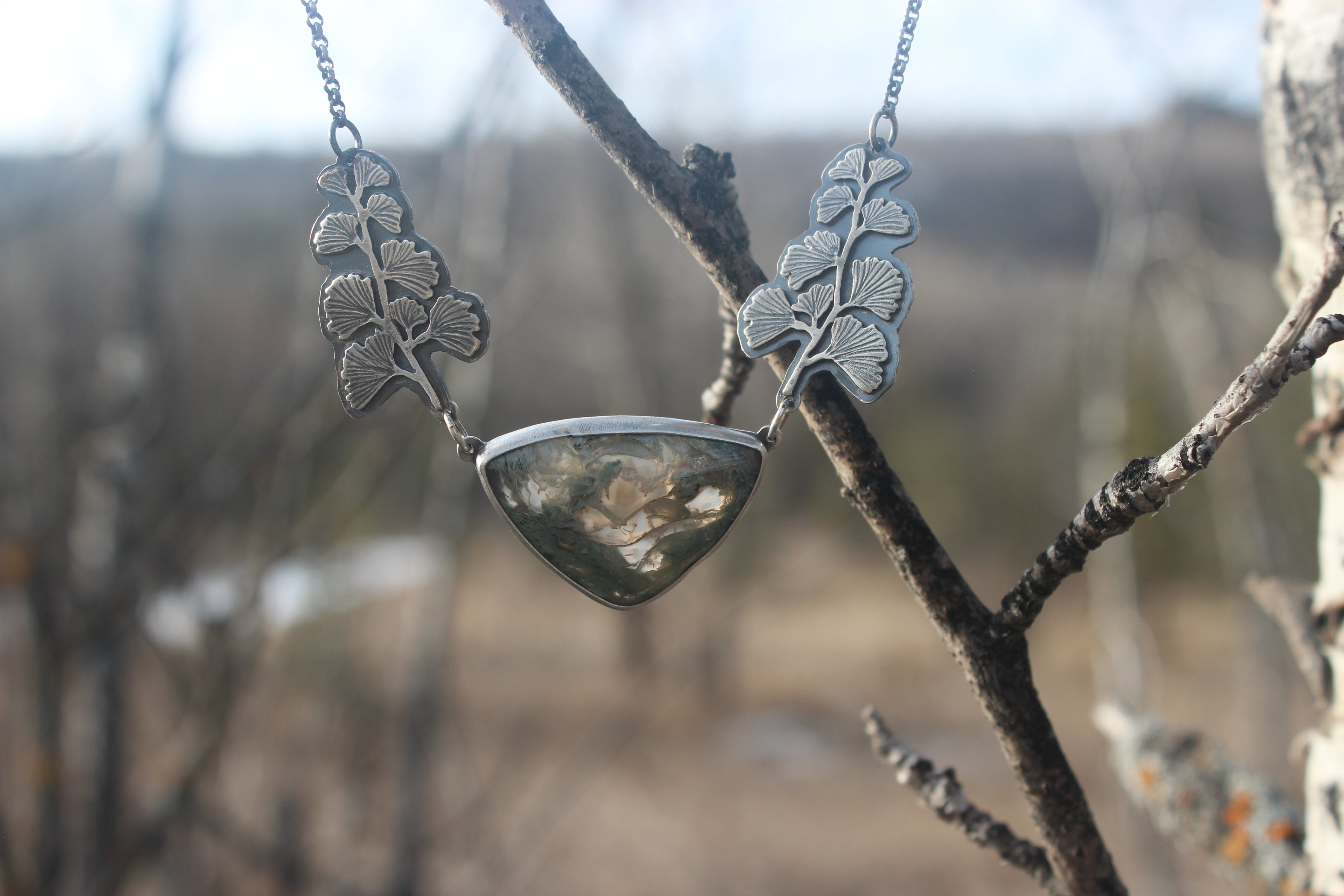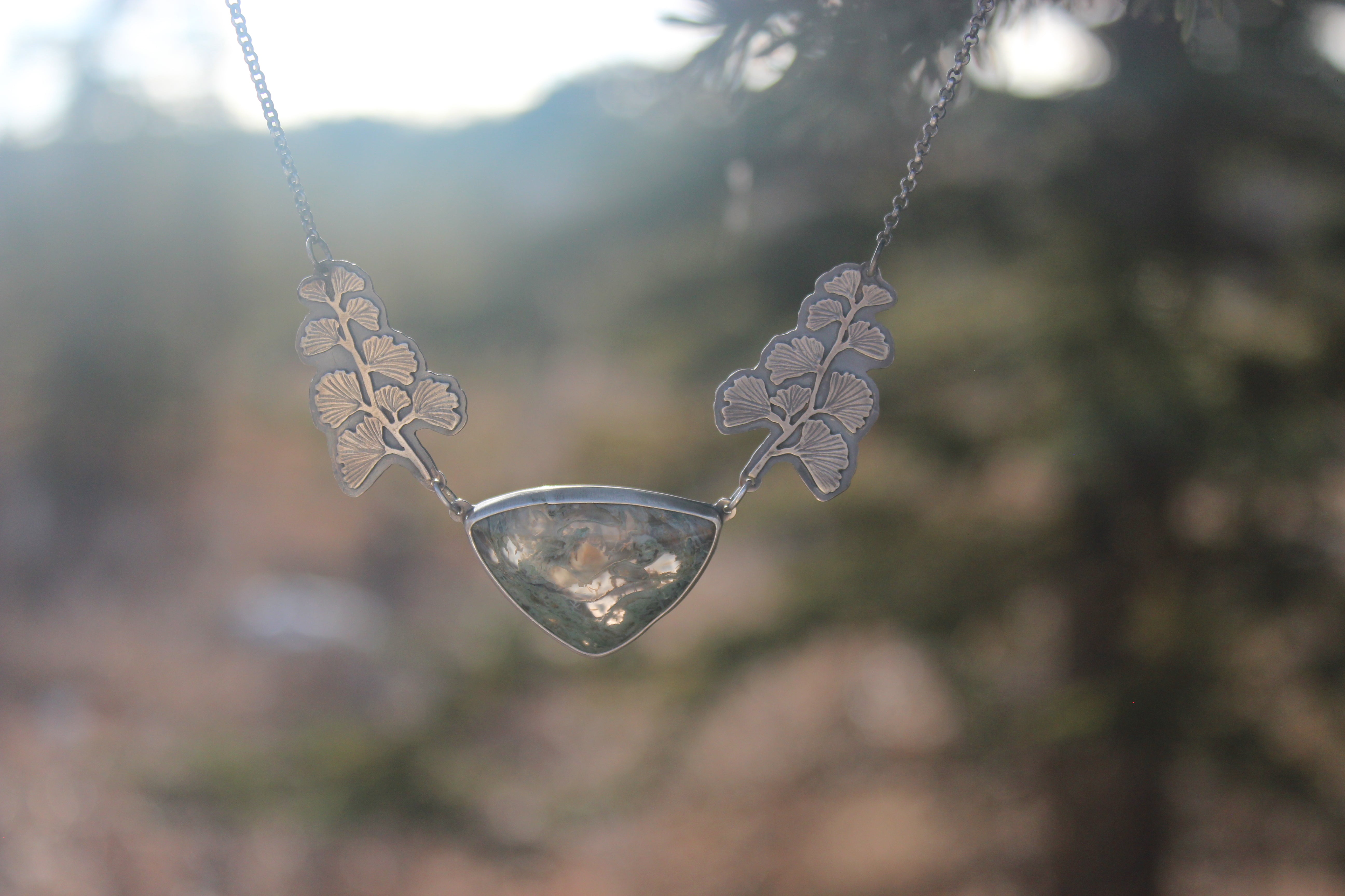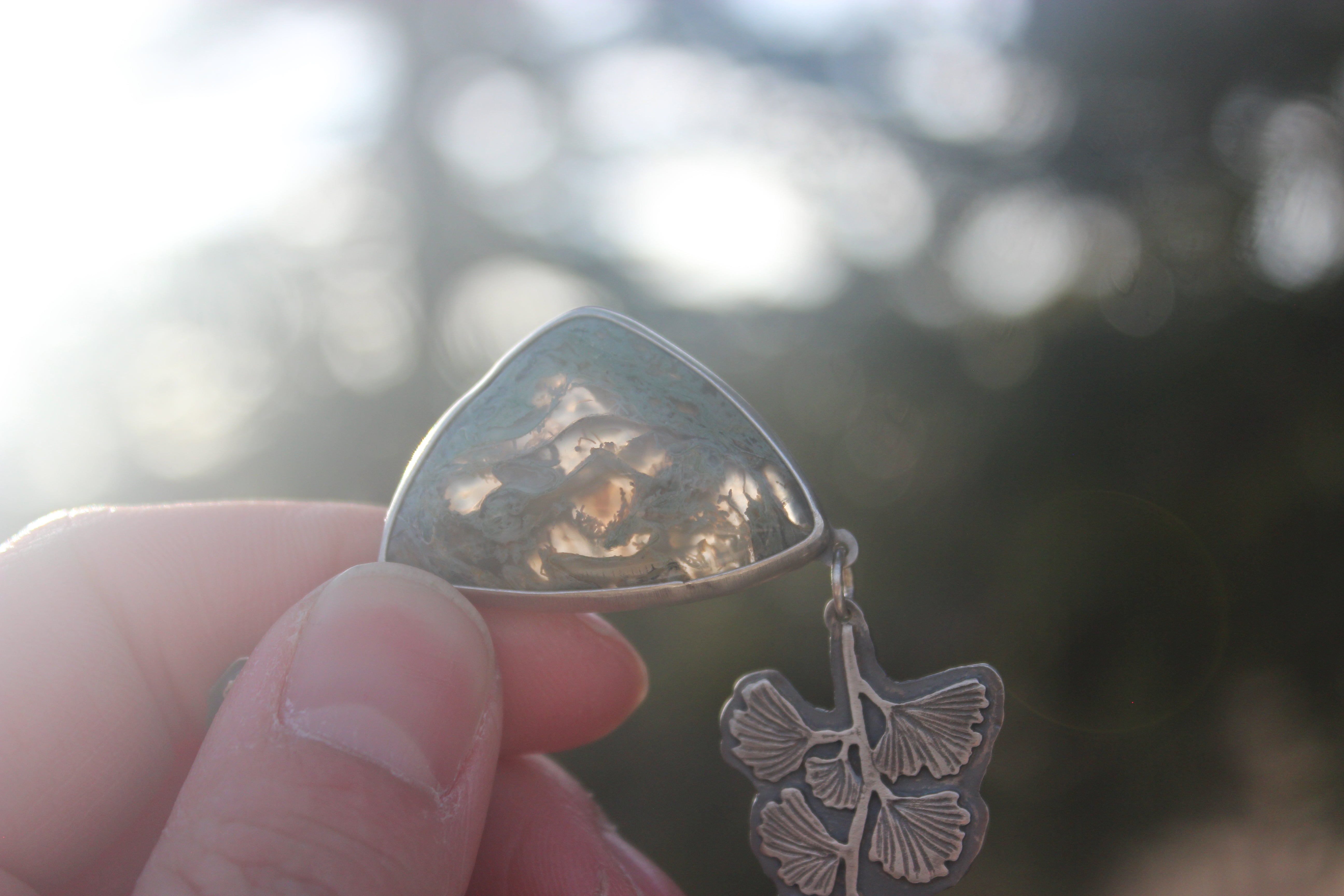 A stunning moss agate stone harnesses swirls of mossy inclusions, as if they were plucked from the forest floor and placed within a watery matrix forevermore. Maidenhair ferns flank both sides of the stone while leaf print adorns the backside. The light passing through the mossy stone is reminiscent of light passing through the leaves in a forest canopy, filtered yet warm.
