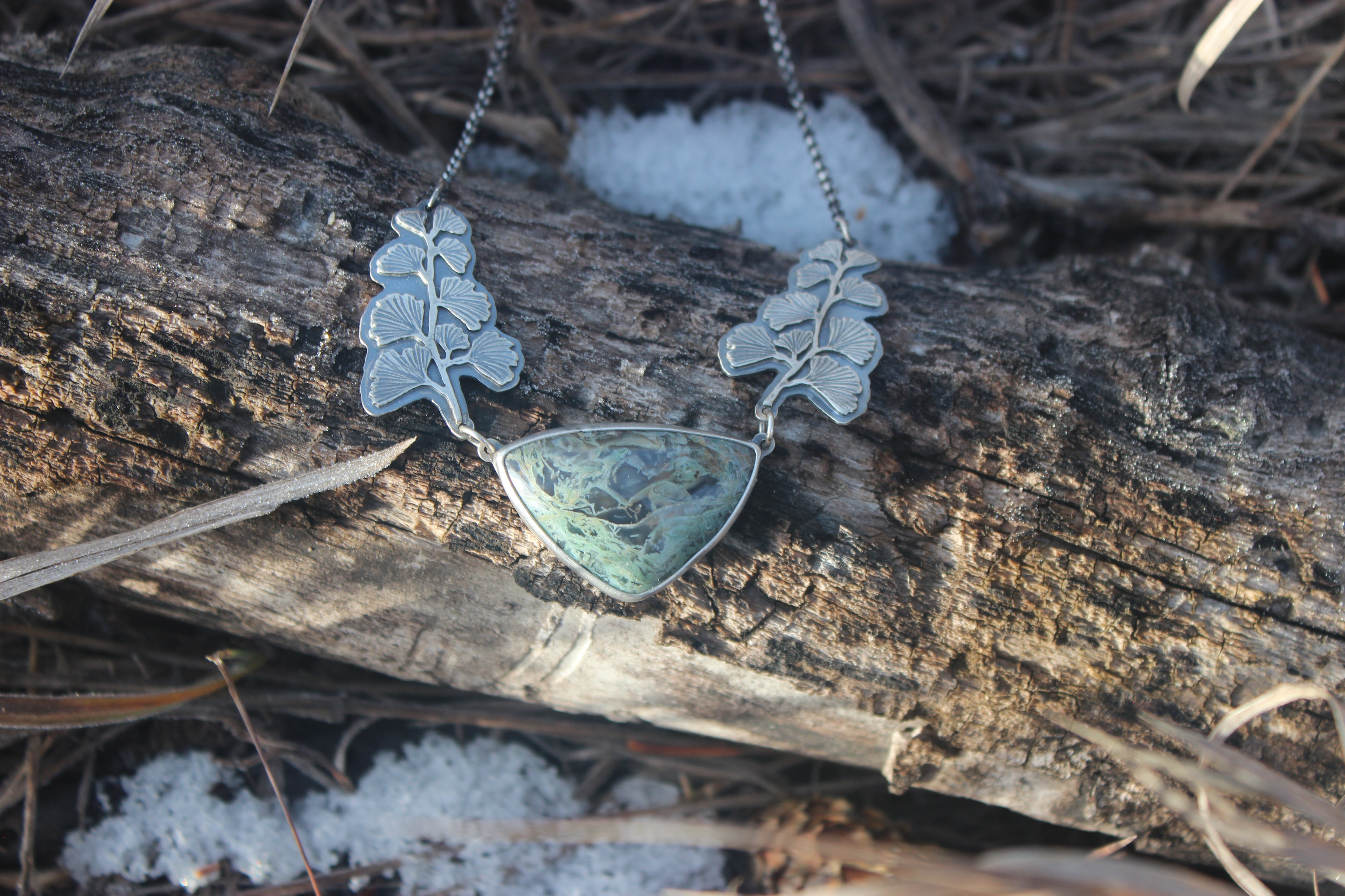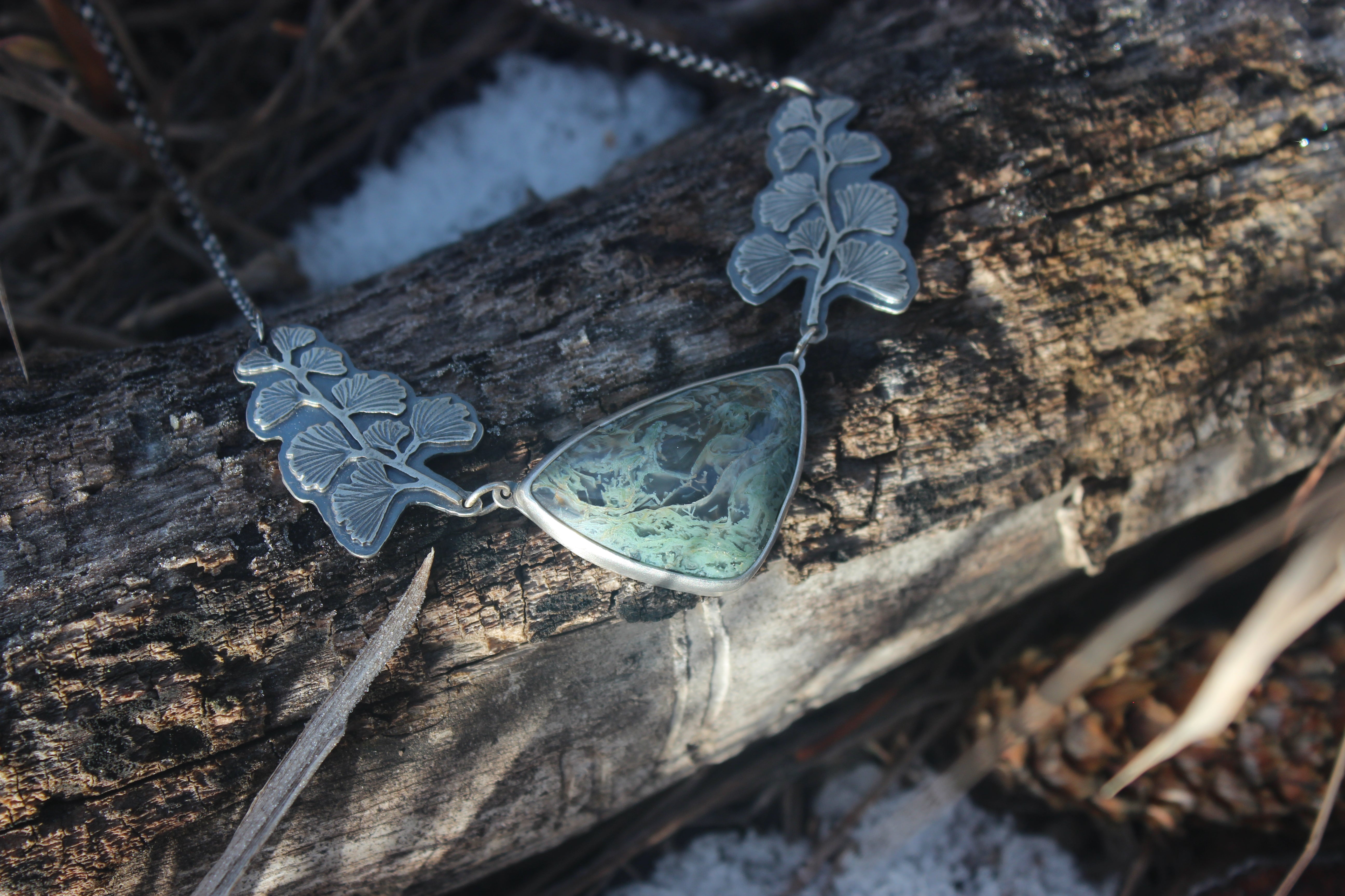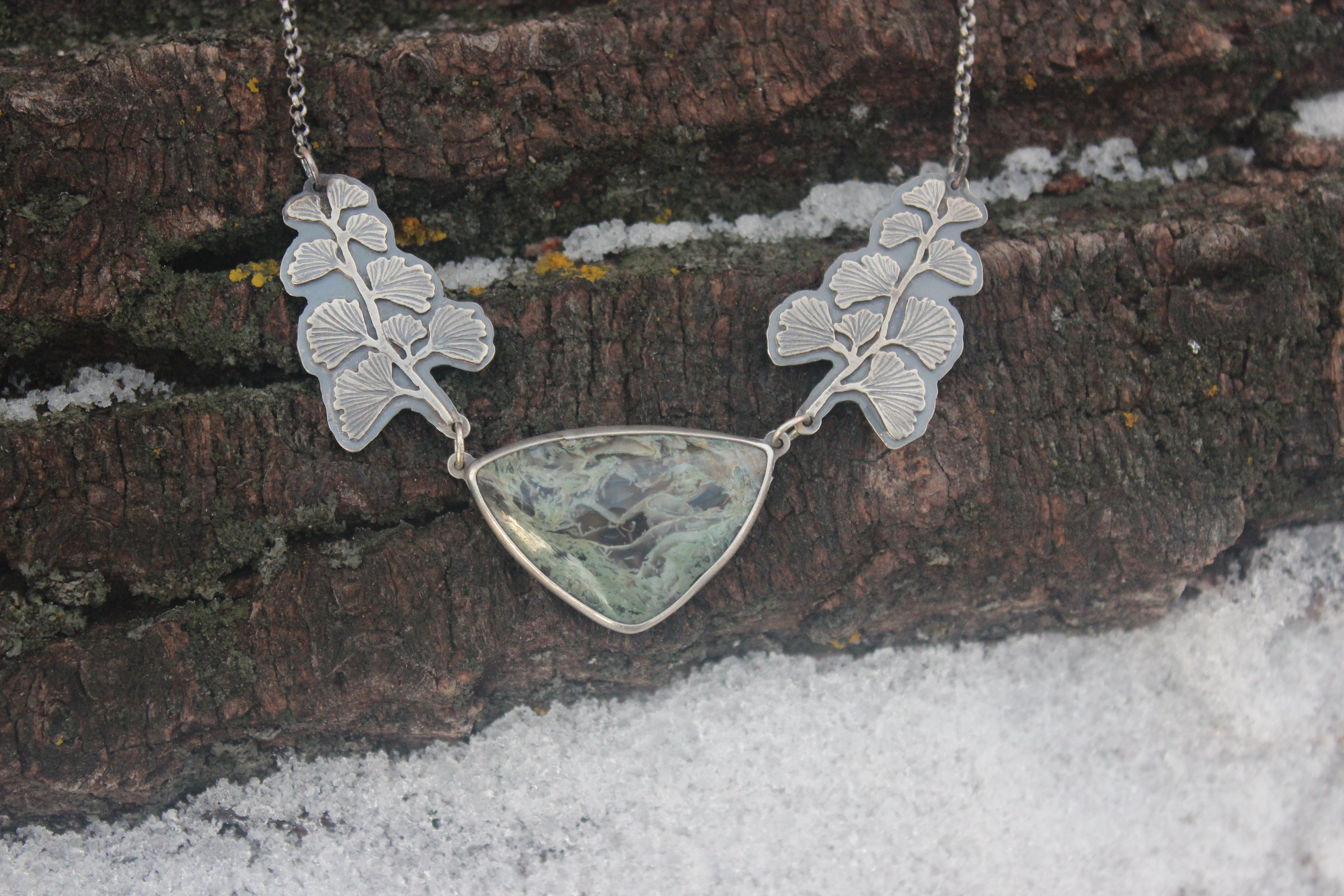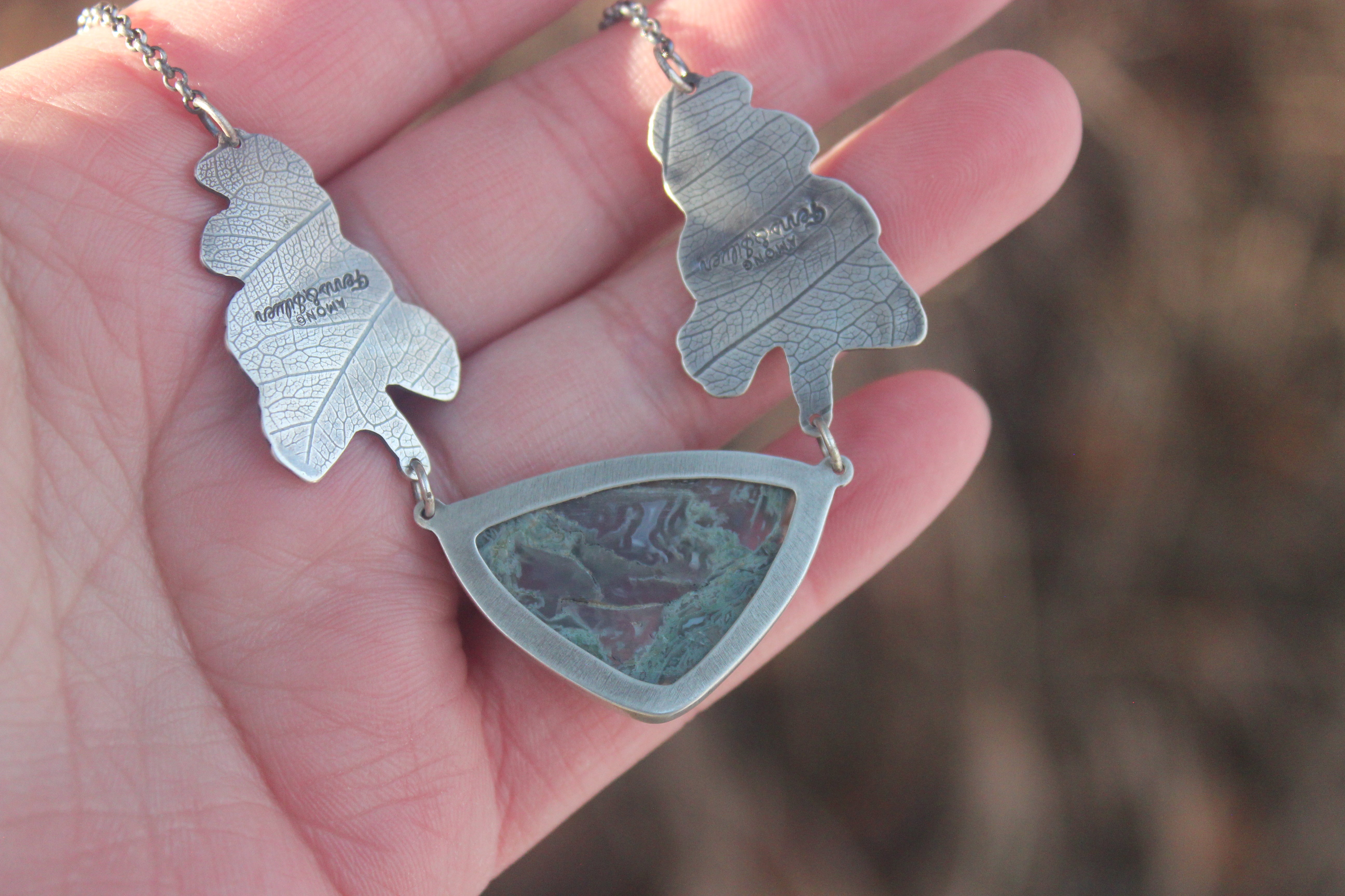 A stunning moss agate stone harnesses swirls of mossy inclusions, as if they were plucked from the forest floor and placed within a watery matrix forevermore. Maidenhair ferns flank both sides of the stone while leaf print adorns the backside. The light passing through the mossy stone is reminiscent of light passing through the leaves in a forest canopy, filtered yet warm.