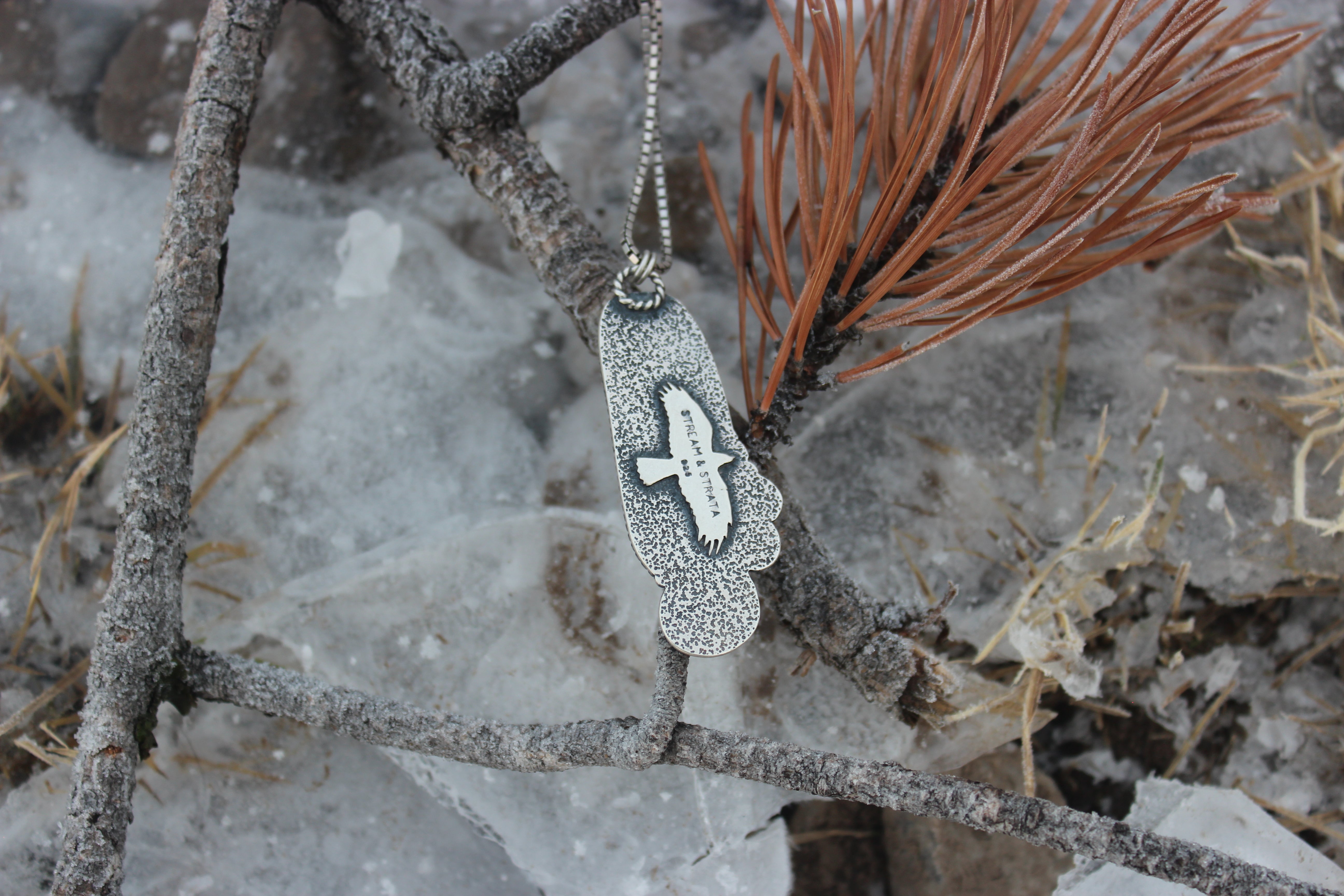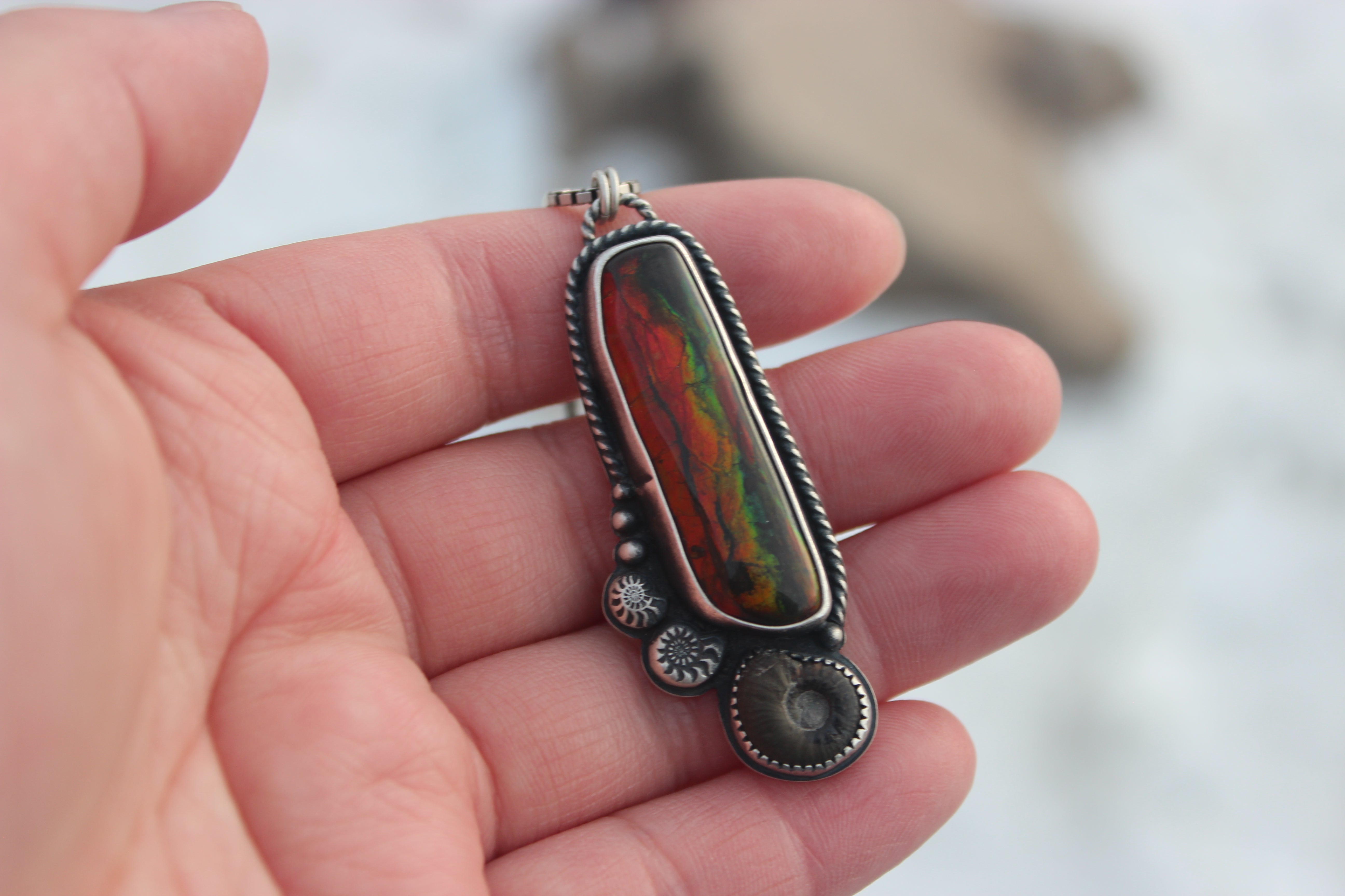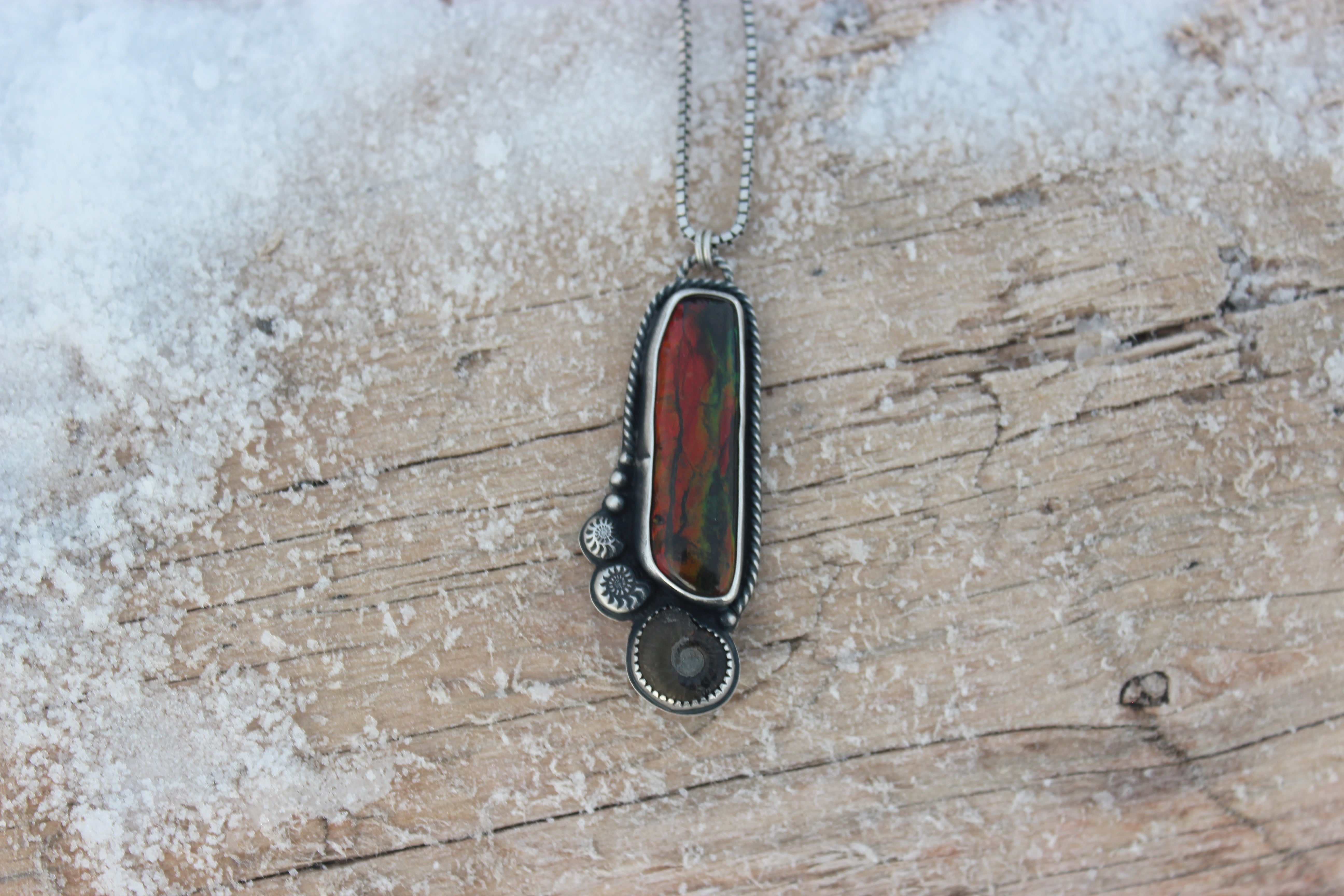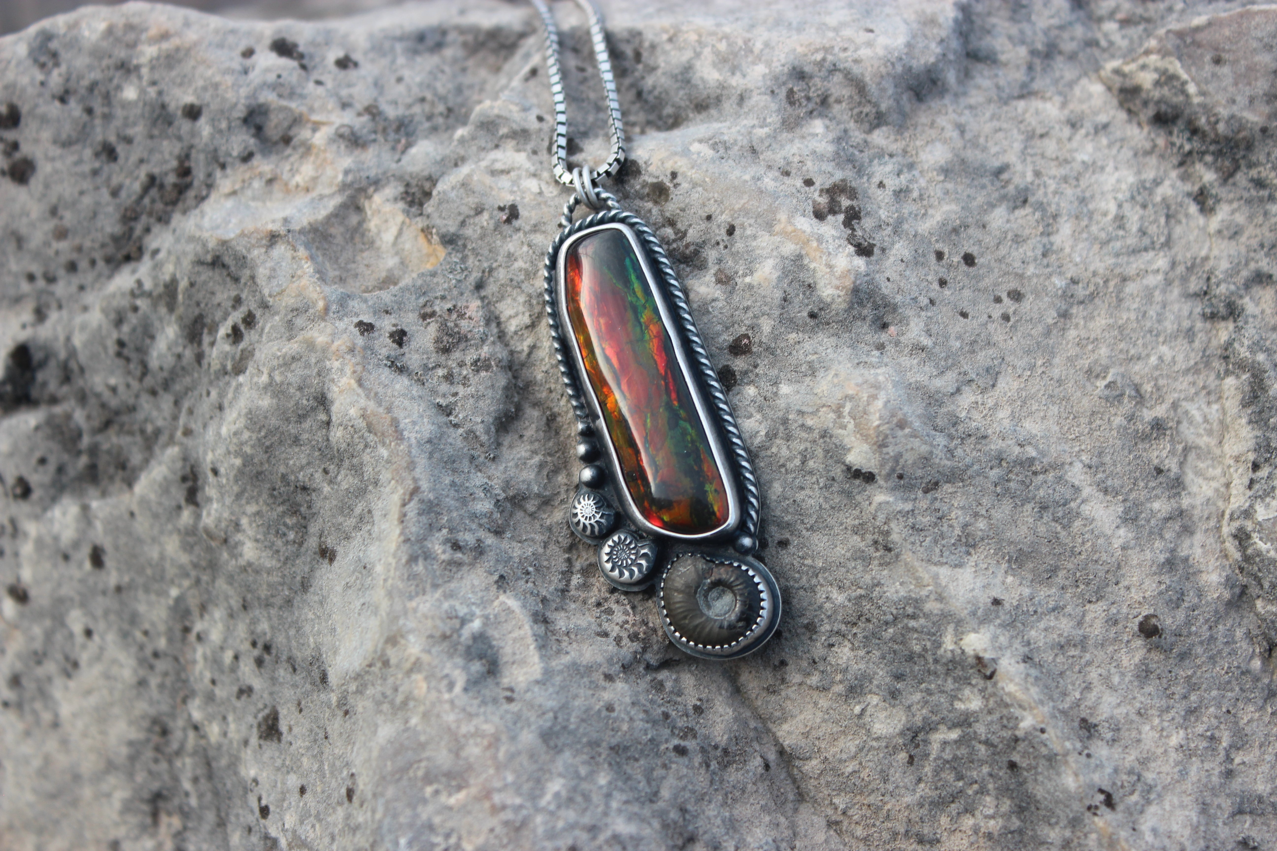 An absolutely stunning ammolite stone has been set within a bed of sterling silver, nestled in next to a real ammonite fossil, as well as some carved silver ammonites. The flash in this piece is incredible, some of the most colorful and bright angles flashes that I've ever seen!