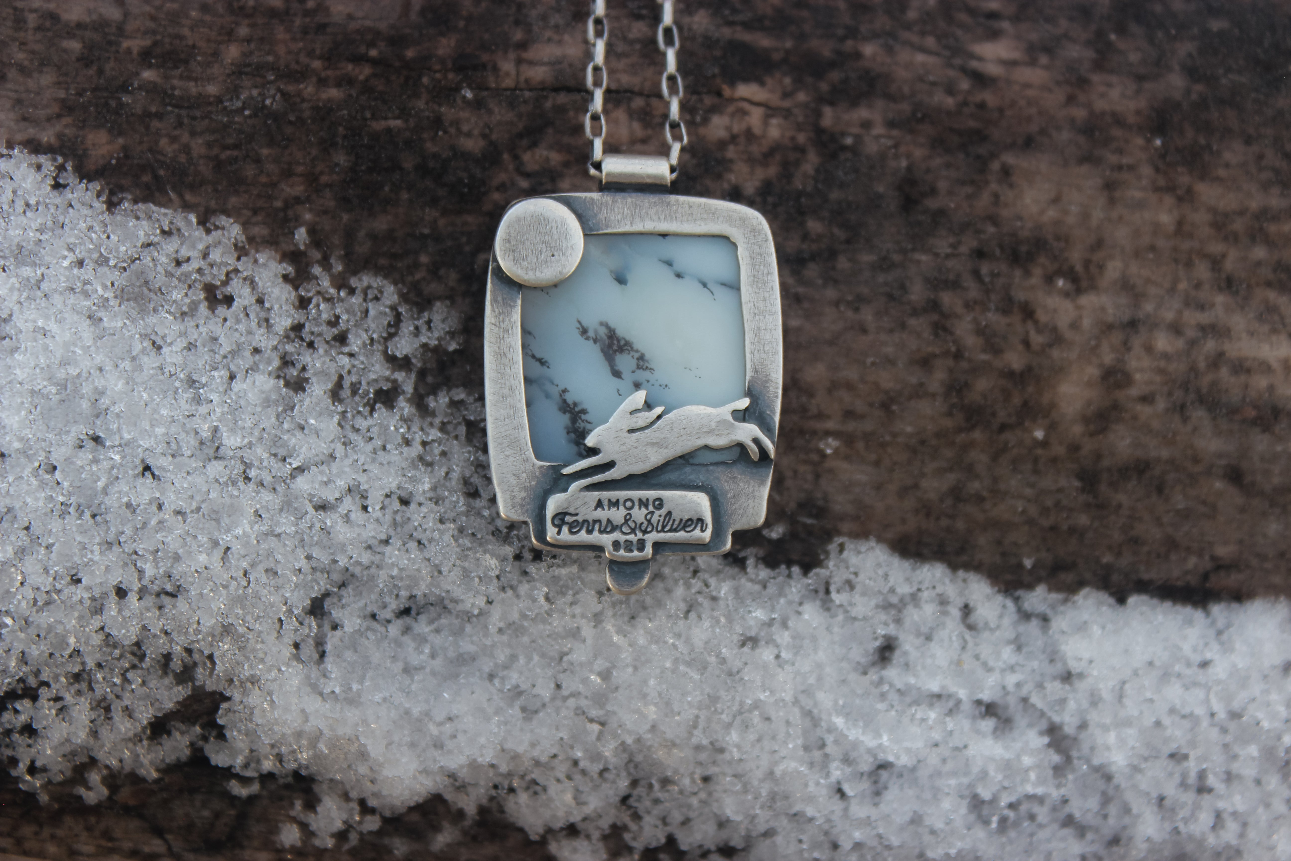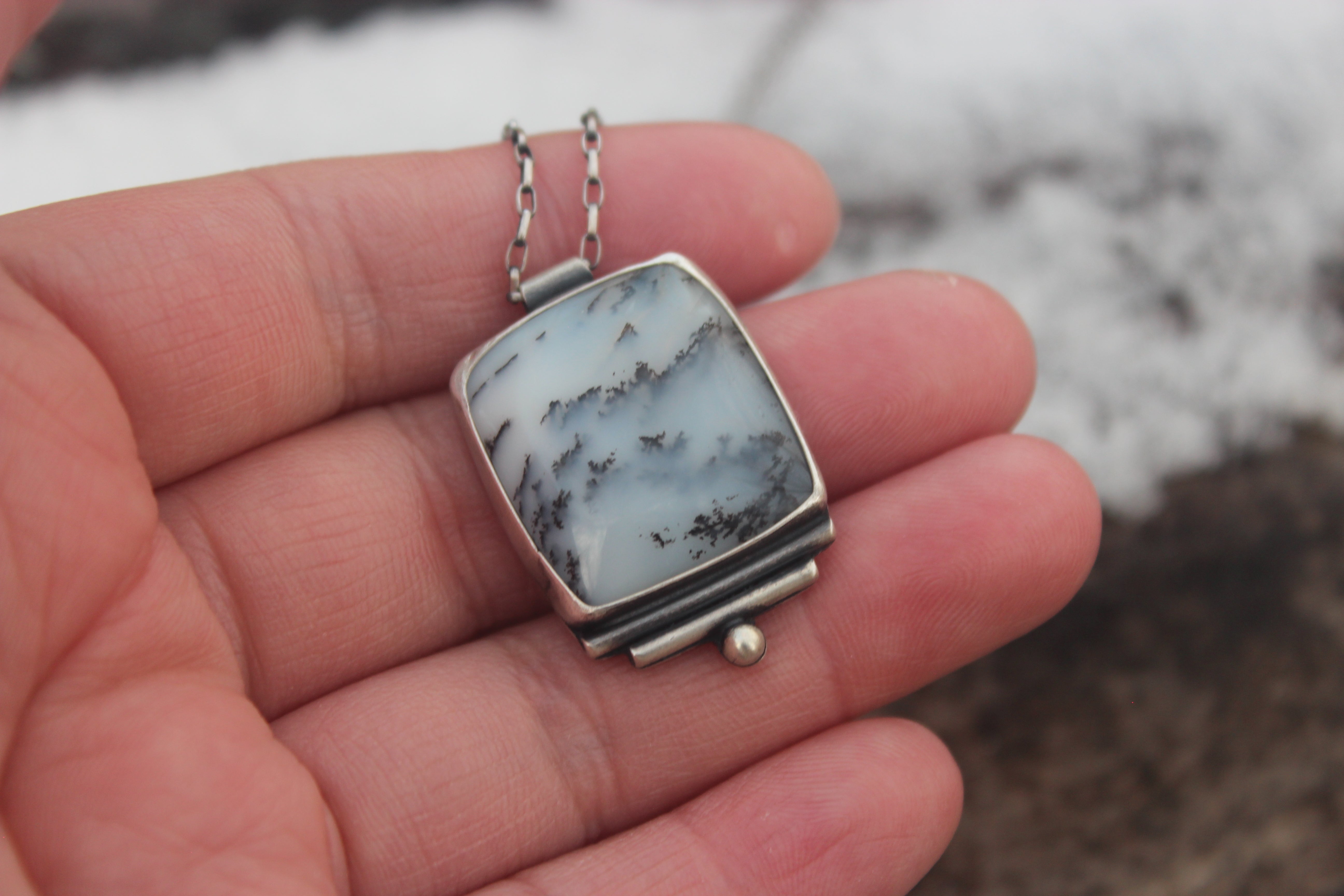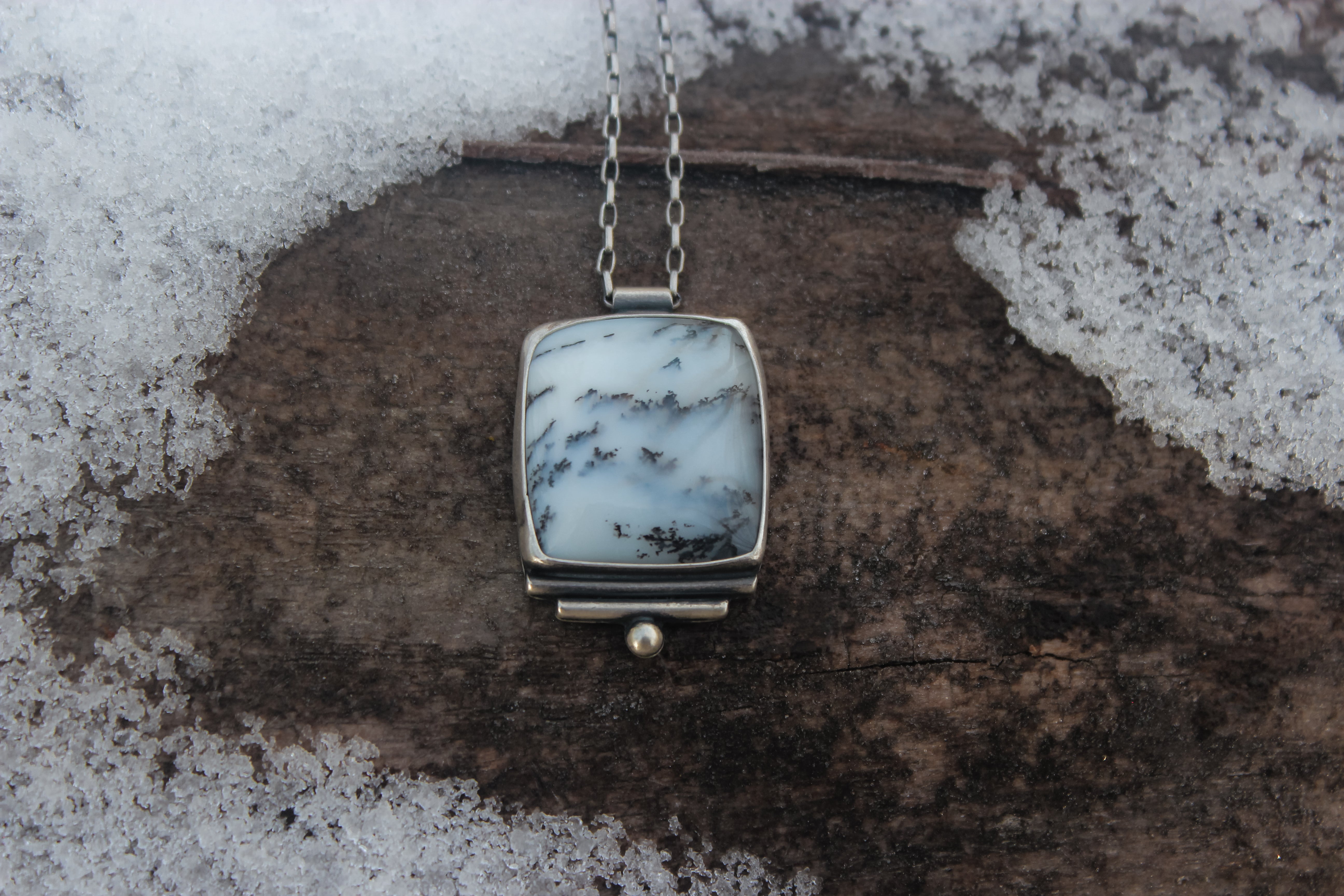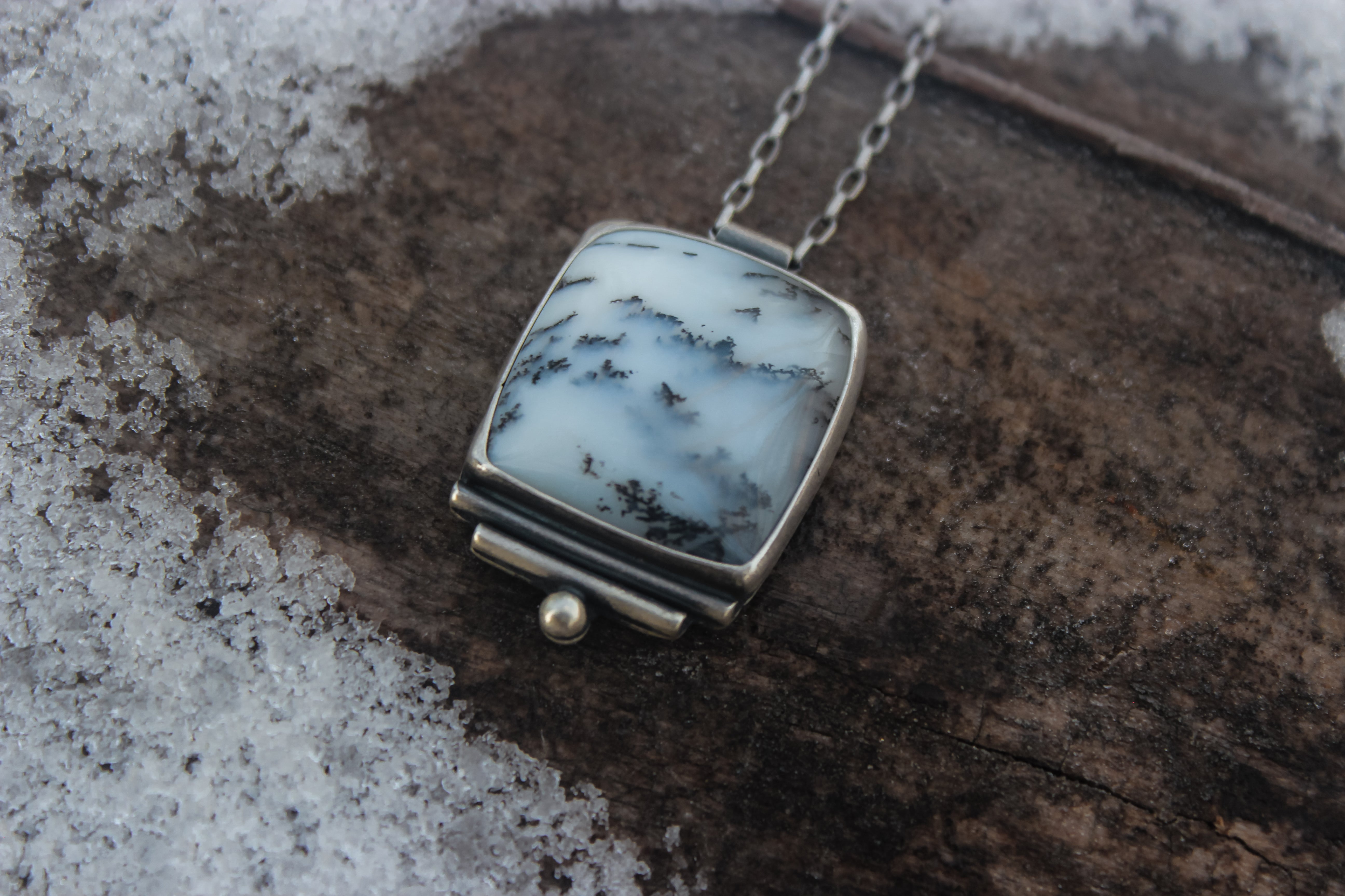 Inspired by the first snowfall of the year where the snowflakes dancing around in the wind feels surreal. The crystals swirl and flutter, floating through the crisp air until they settle upon bare branches and fallen logs. The dendritic opals capture this scenery as it touches the forest with a whisper soft embrace.