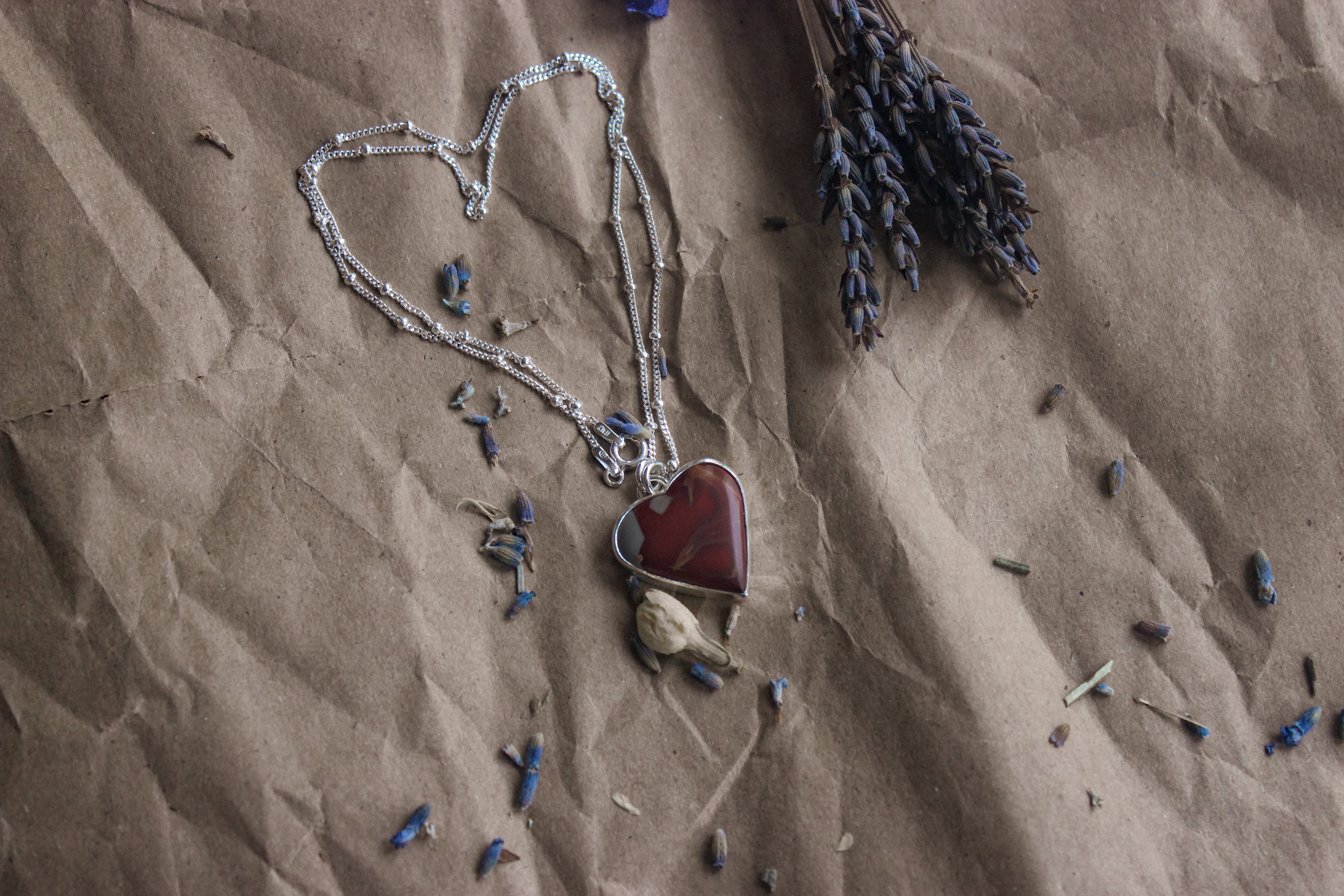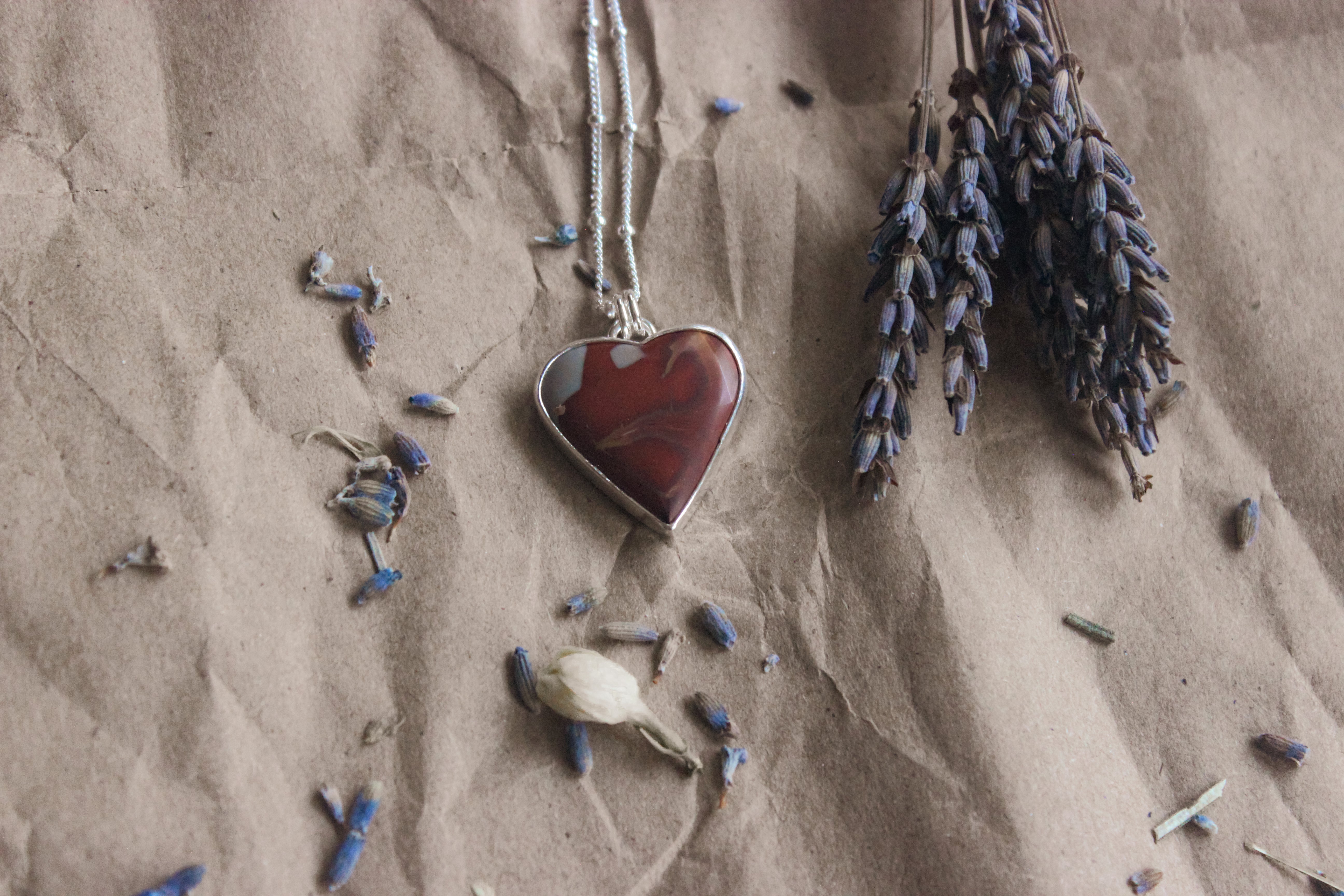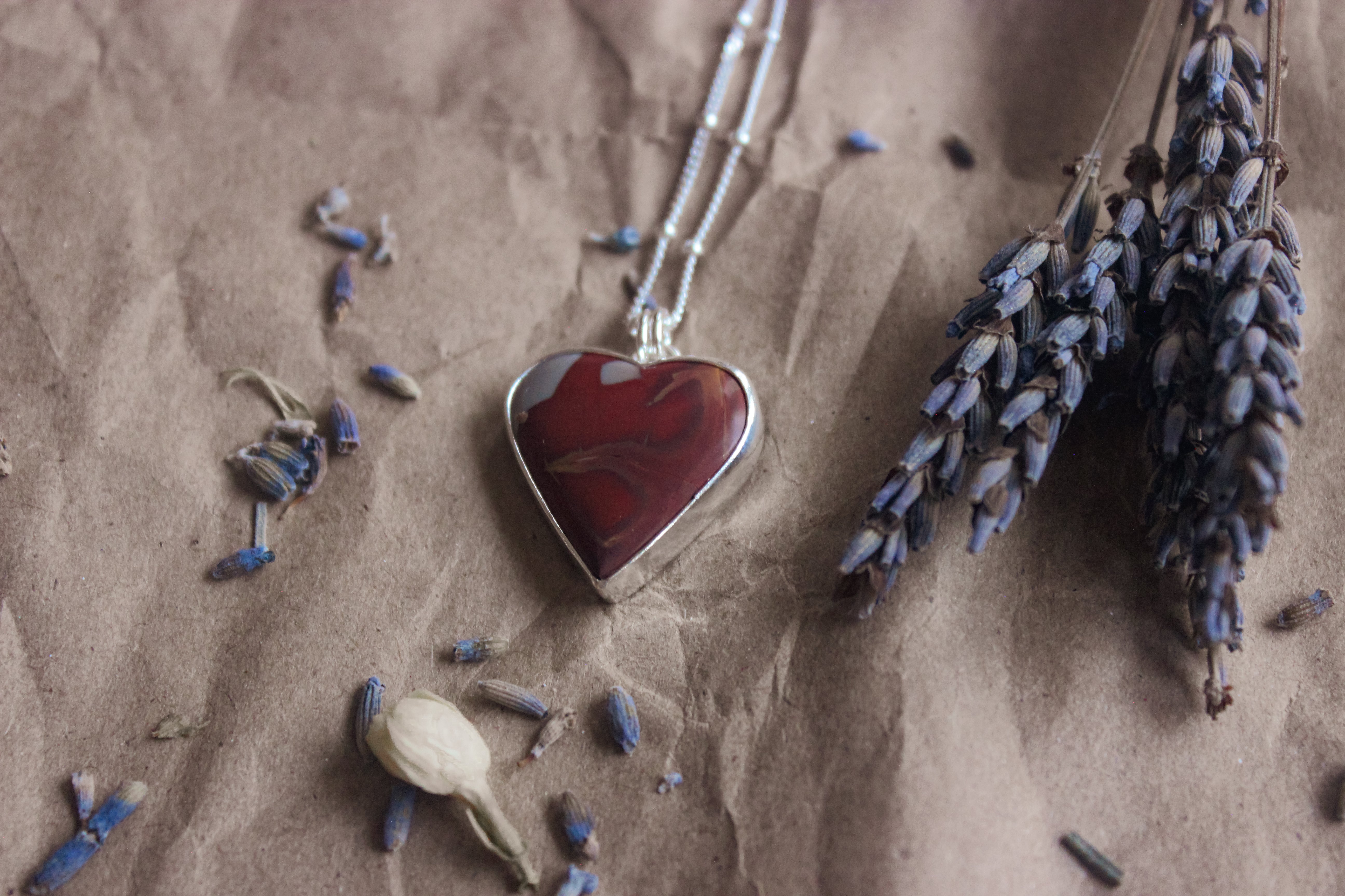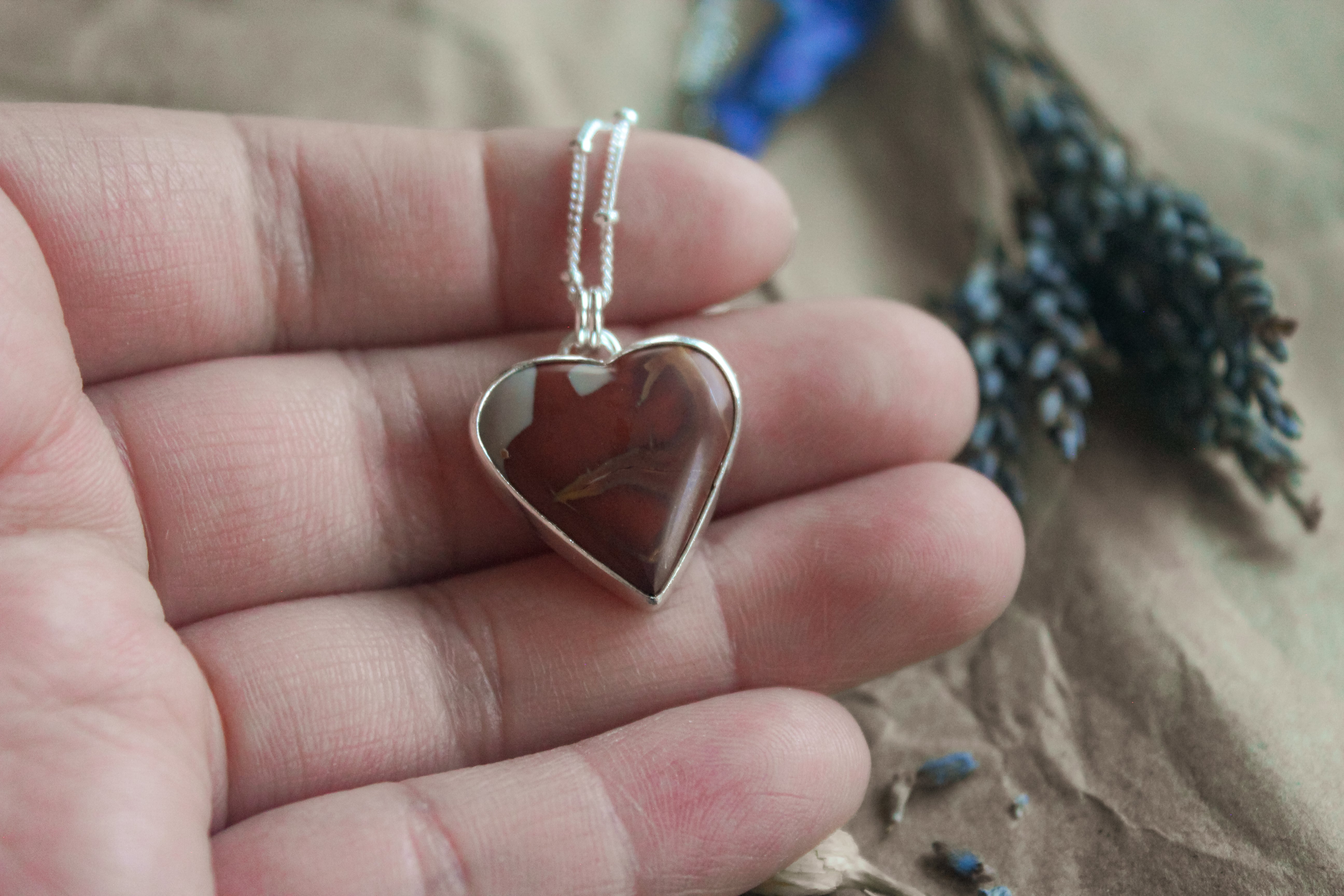 The pattern in this heart look like flames are engulfing the stone, orange and red flicker across the deep red heart.