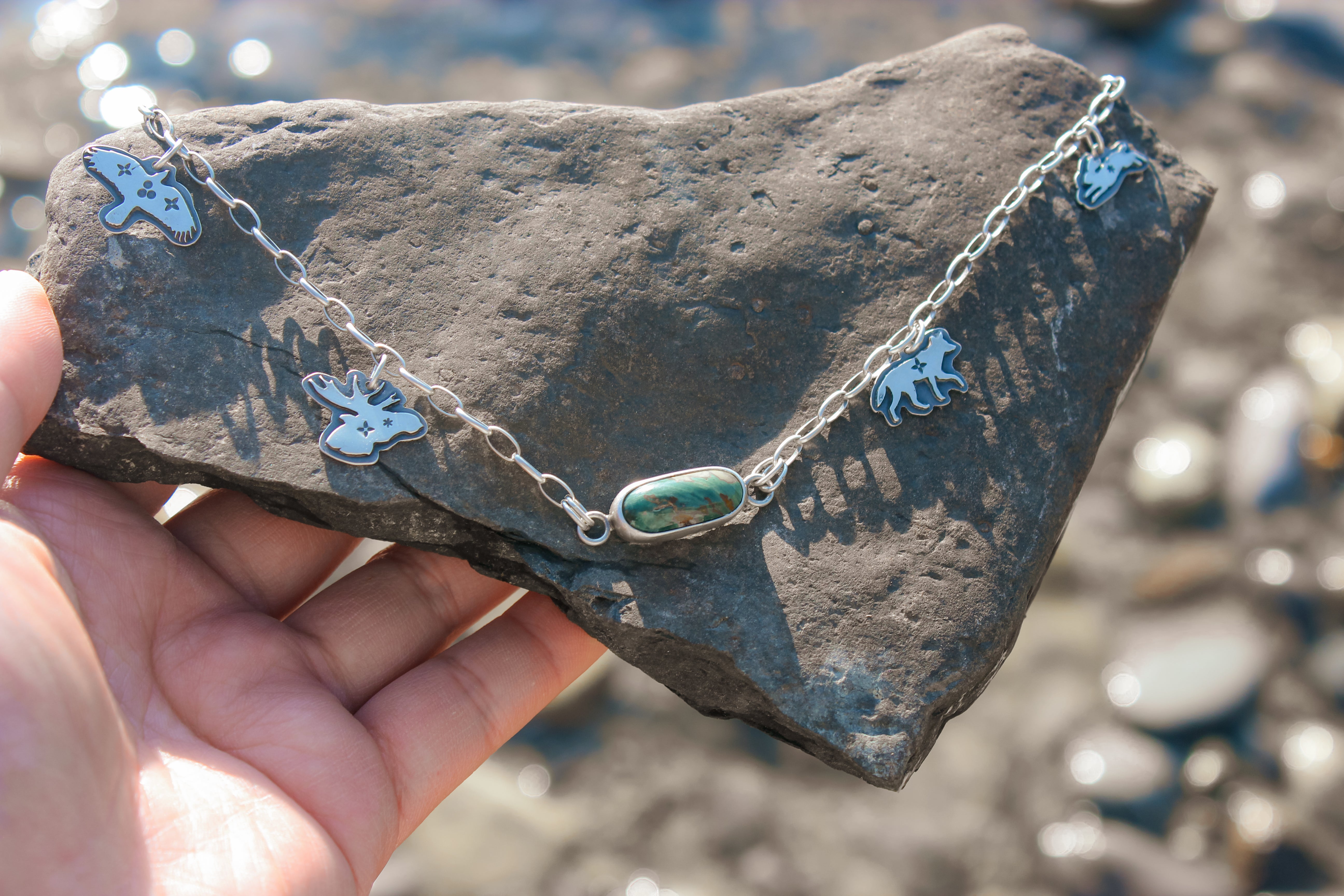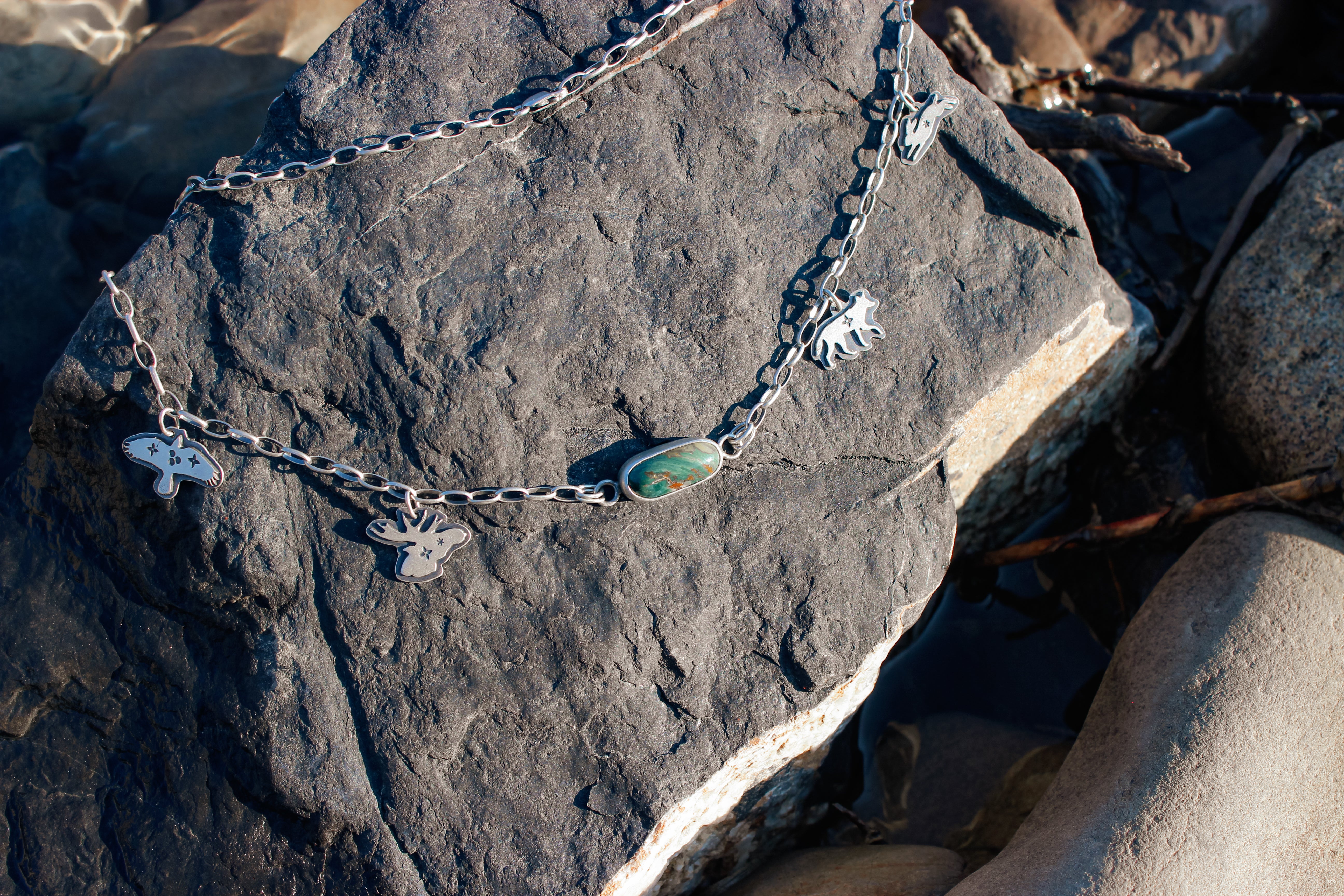 A rabbit, coyote, moose, and raven adorn the chain of this choker style necklace, animal armour if you will. Each critter of the forest has a purpose, a spot in the cycle of life and the breath of the forest. A stunning piece of Gary Green jasper, a type of petrified bog wood, sits at the base of your collarbones, a piece of old forest growth to carry with you wherever you go.