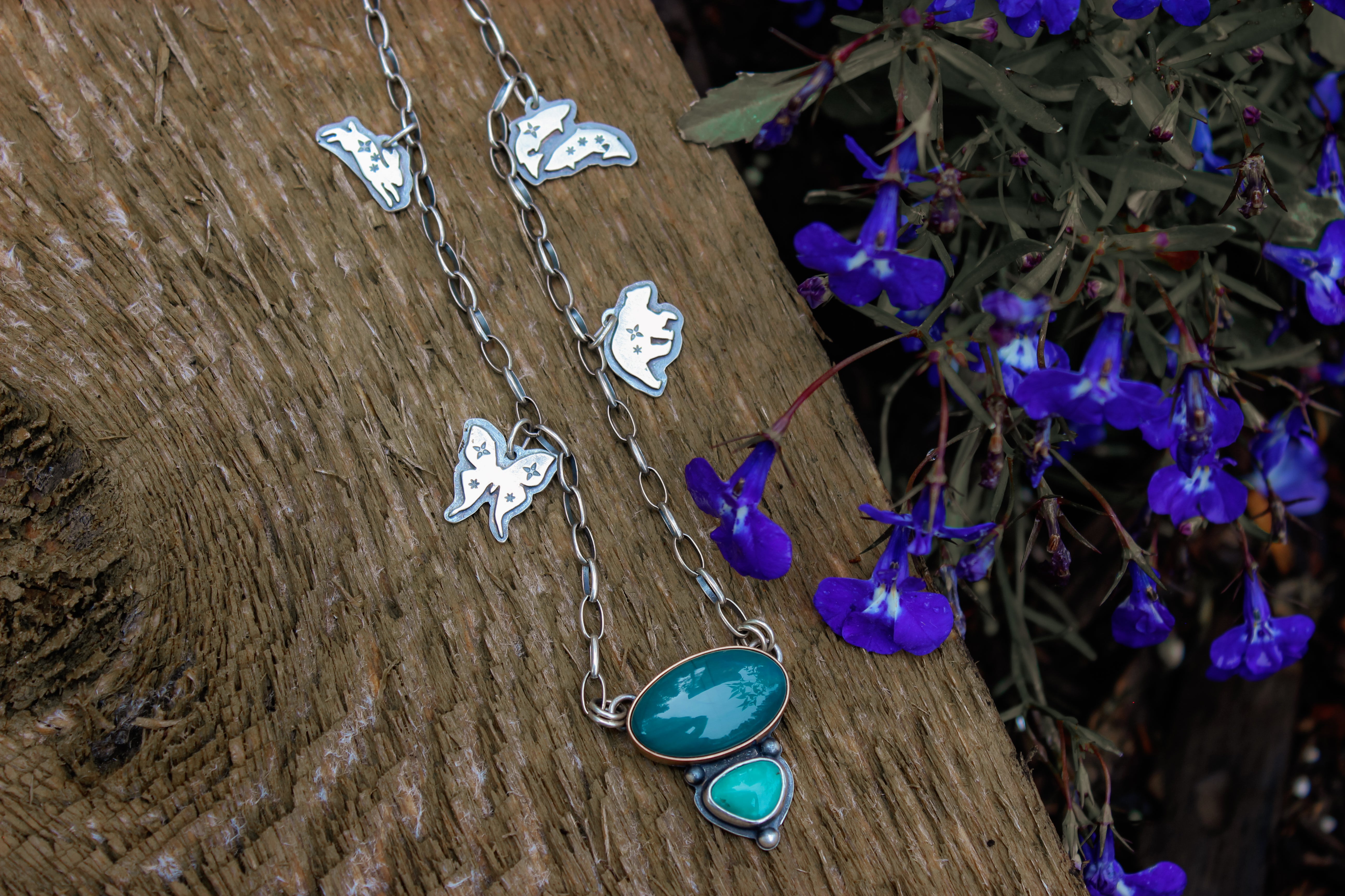 A rabbit, bear, two salmon, and a luna moth adorn the chain of this choker style necklace, animal armour if you will. Each critter of the forest has a purpose, a spot in the cycle of life and the breath of the forest. A stunning piece of Skaggs jasper sits along your neck, alongside a stunning piece of green turquoise. The colors of the waterways join you on your journey.