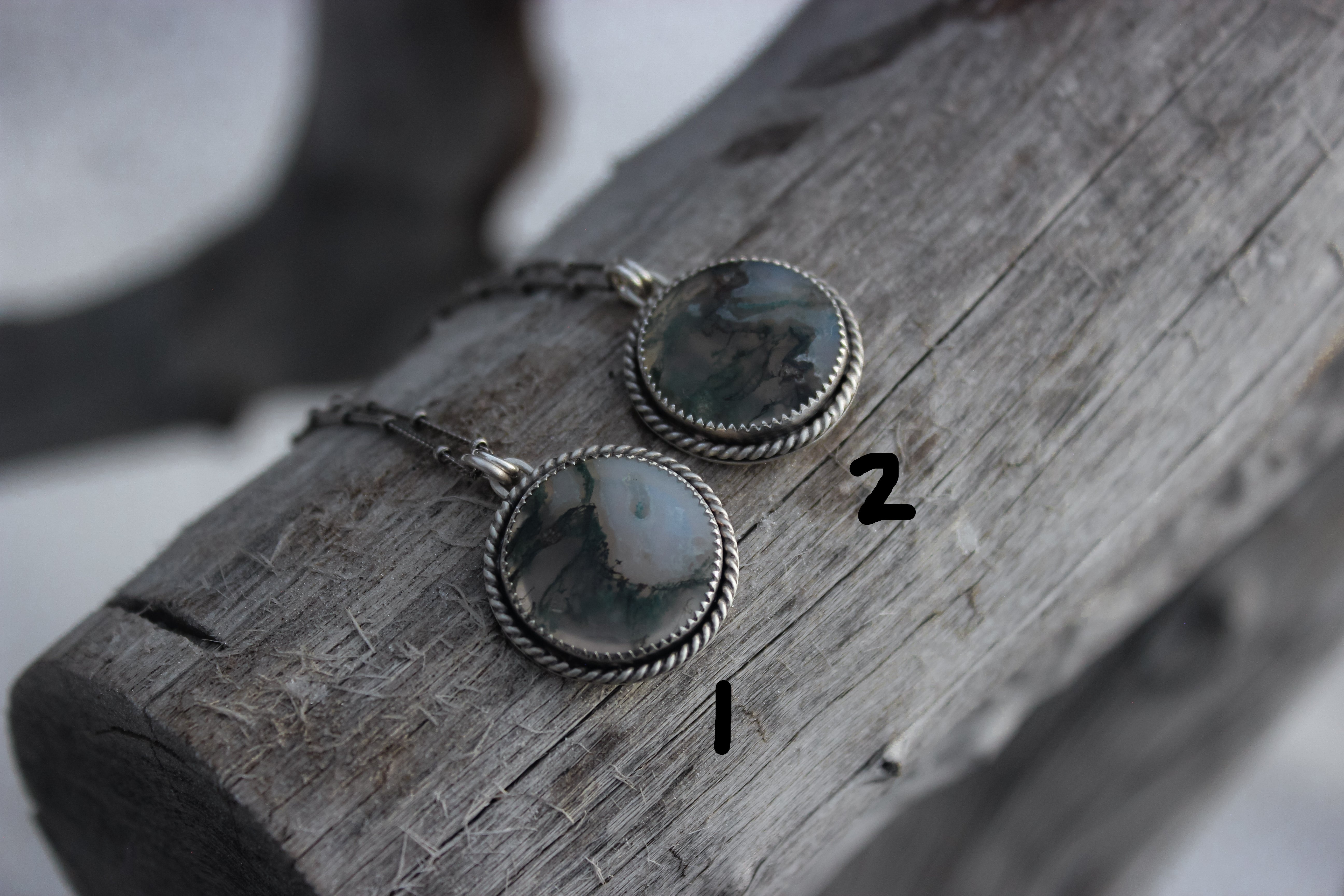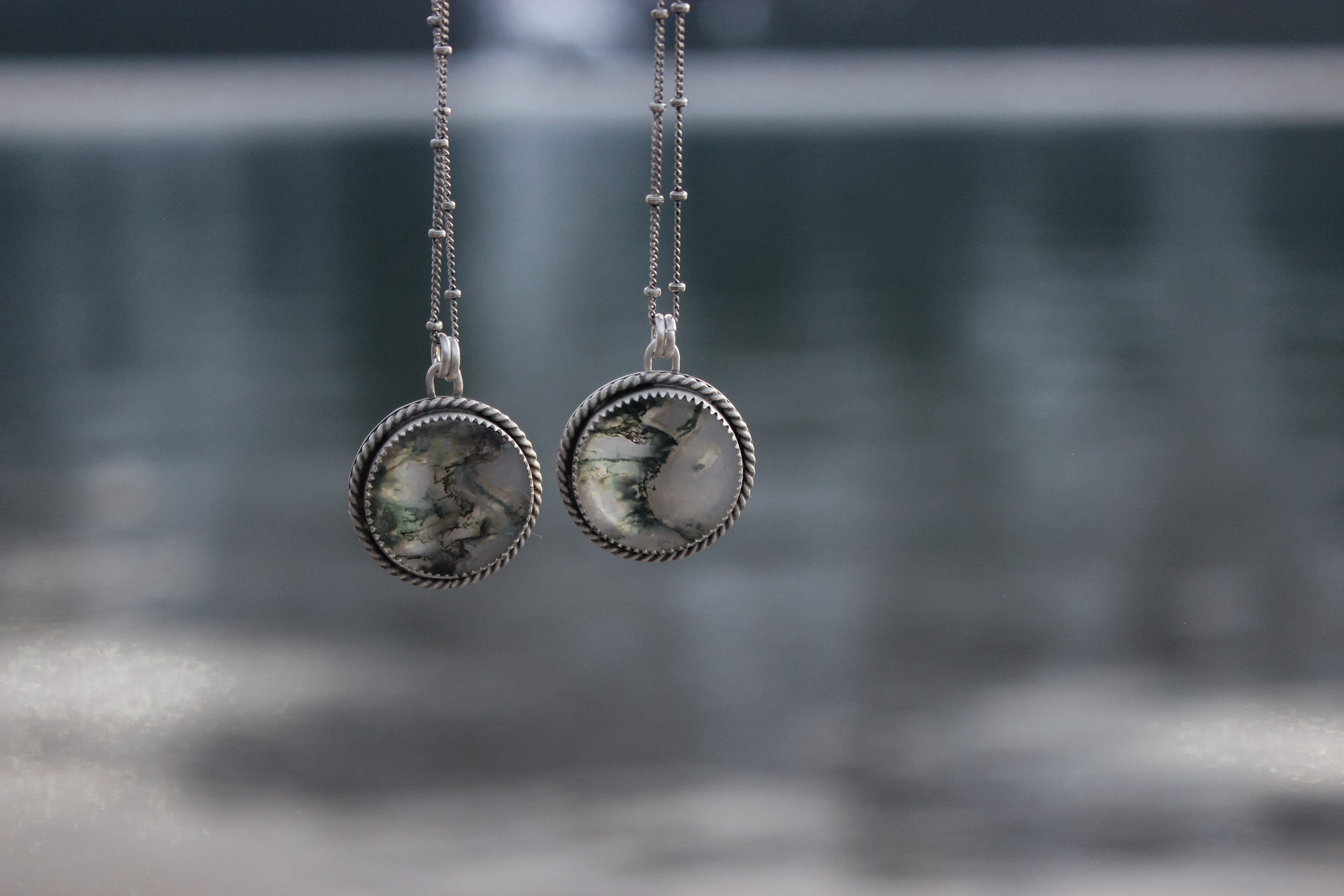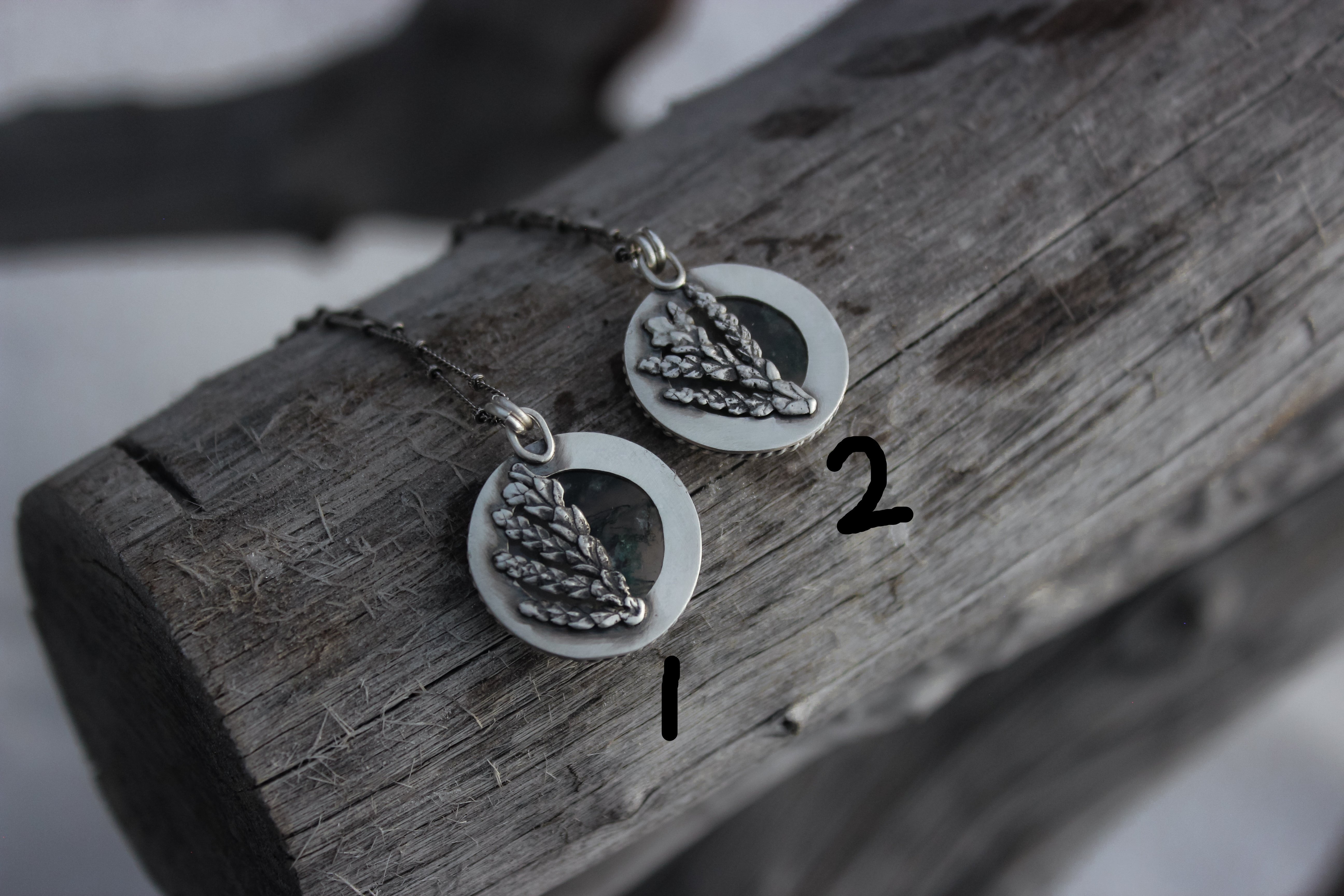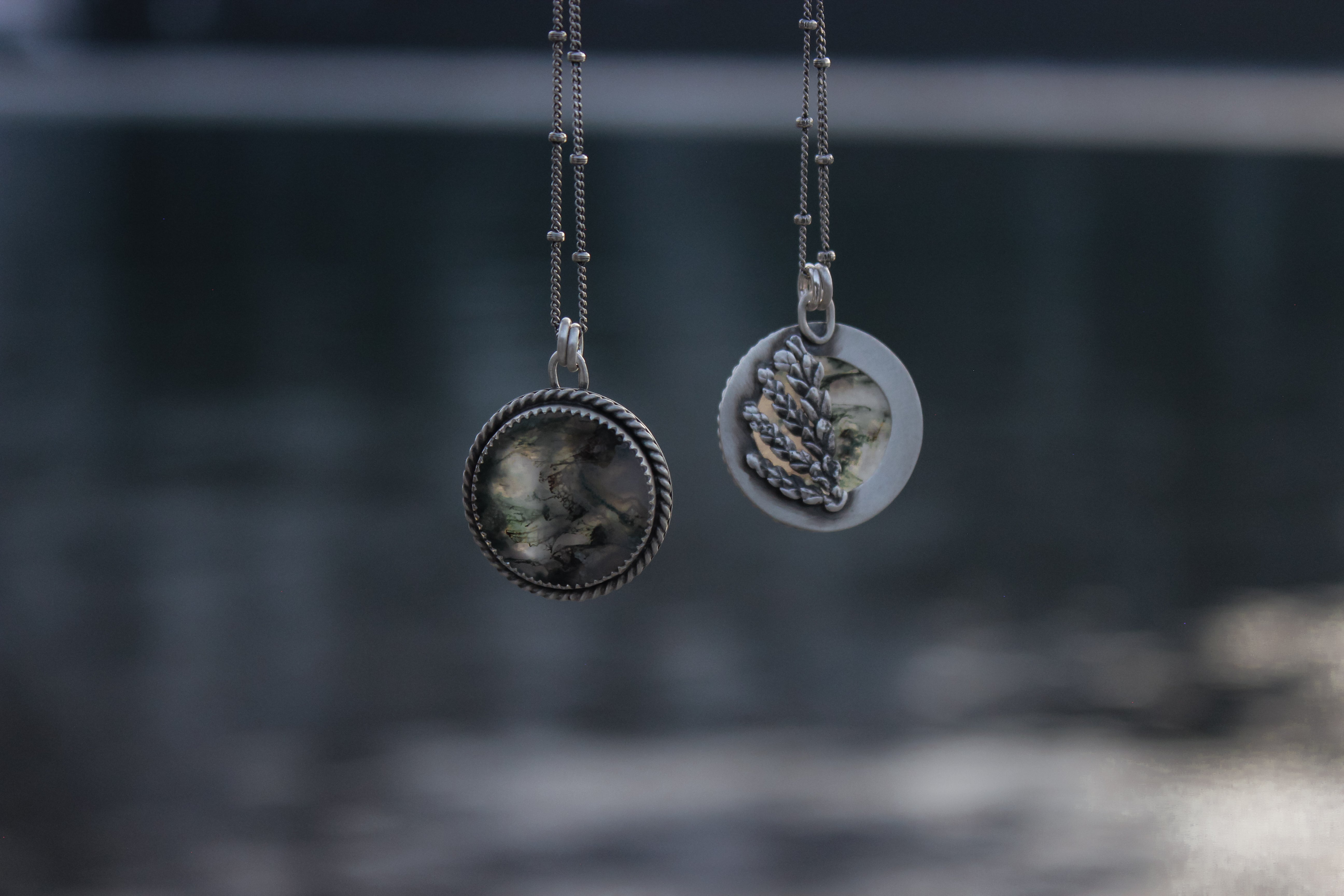 Airy moss agate stones illuminate in the sunlight, the crystalline agate glowing warmly as the light filters through mossy green tendrils. Real cast cedar branches adorn the backside, their subtle texture carrying the beauty of the forest. Simple yet meaningful, perfect for the forest dweller and she who wanders through the trees.