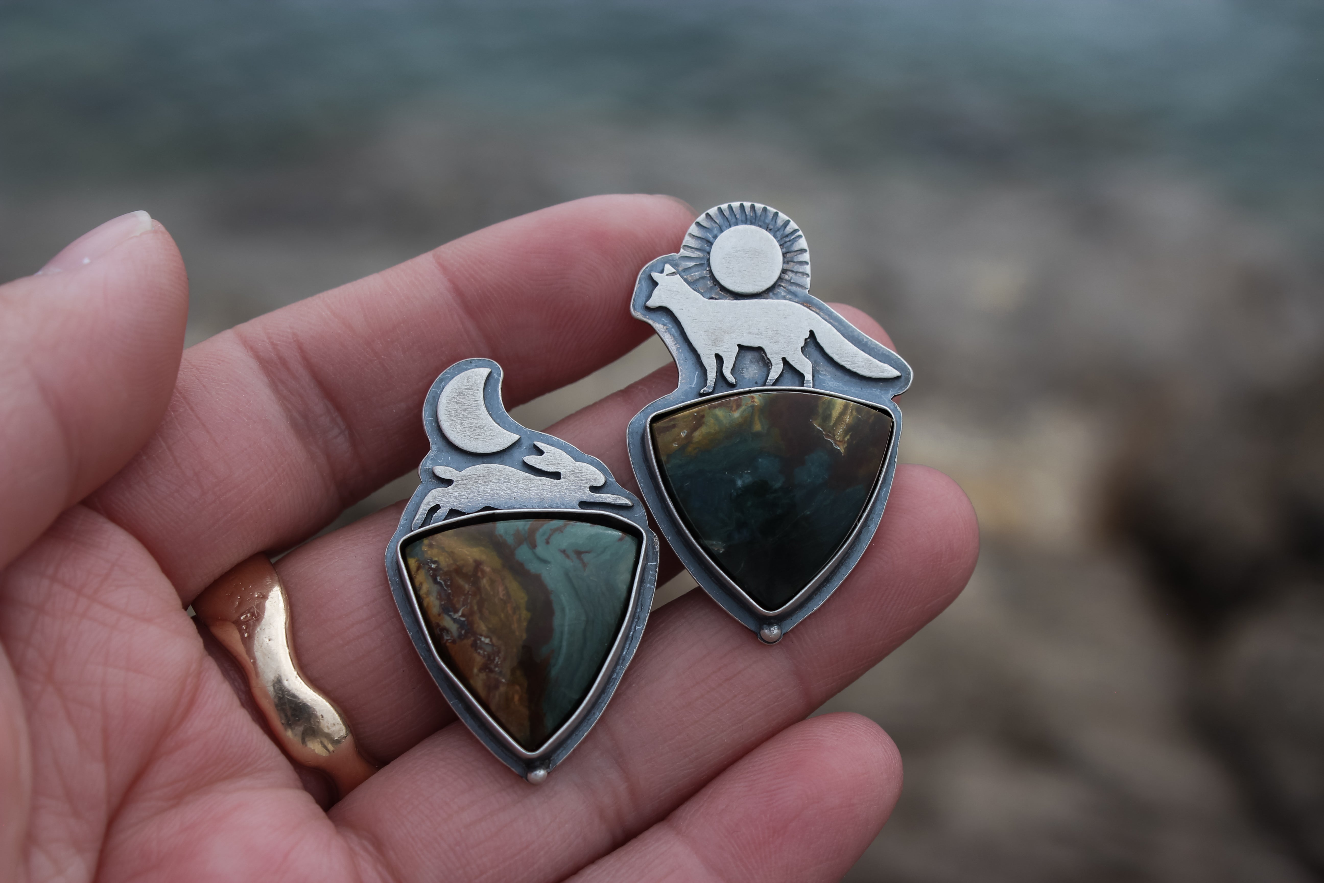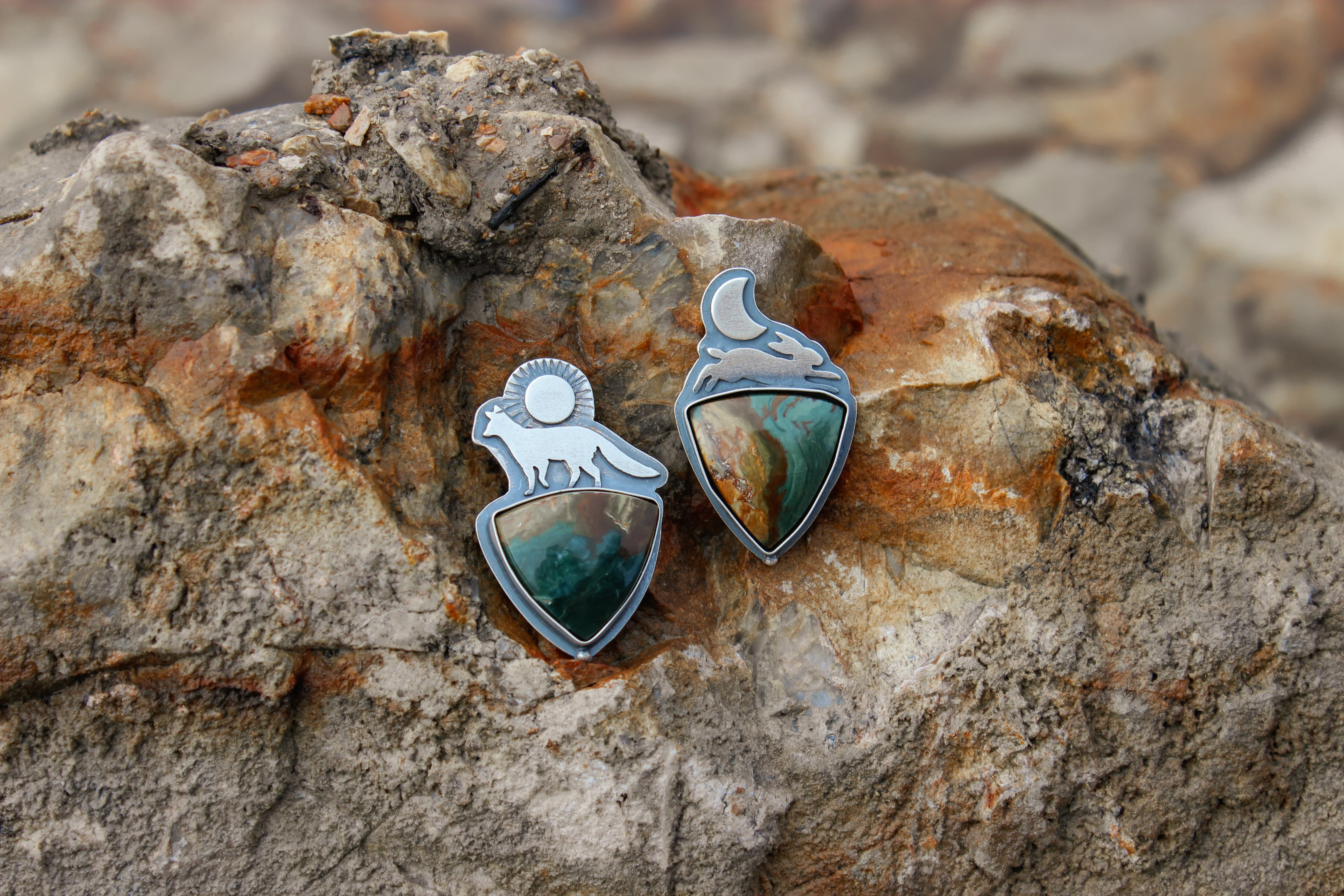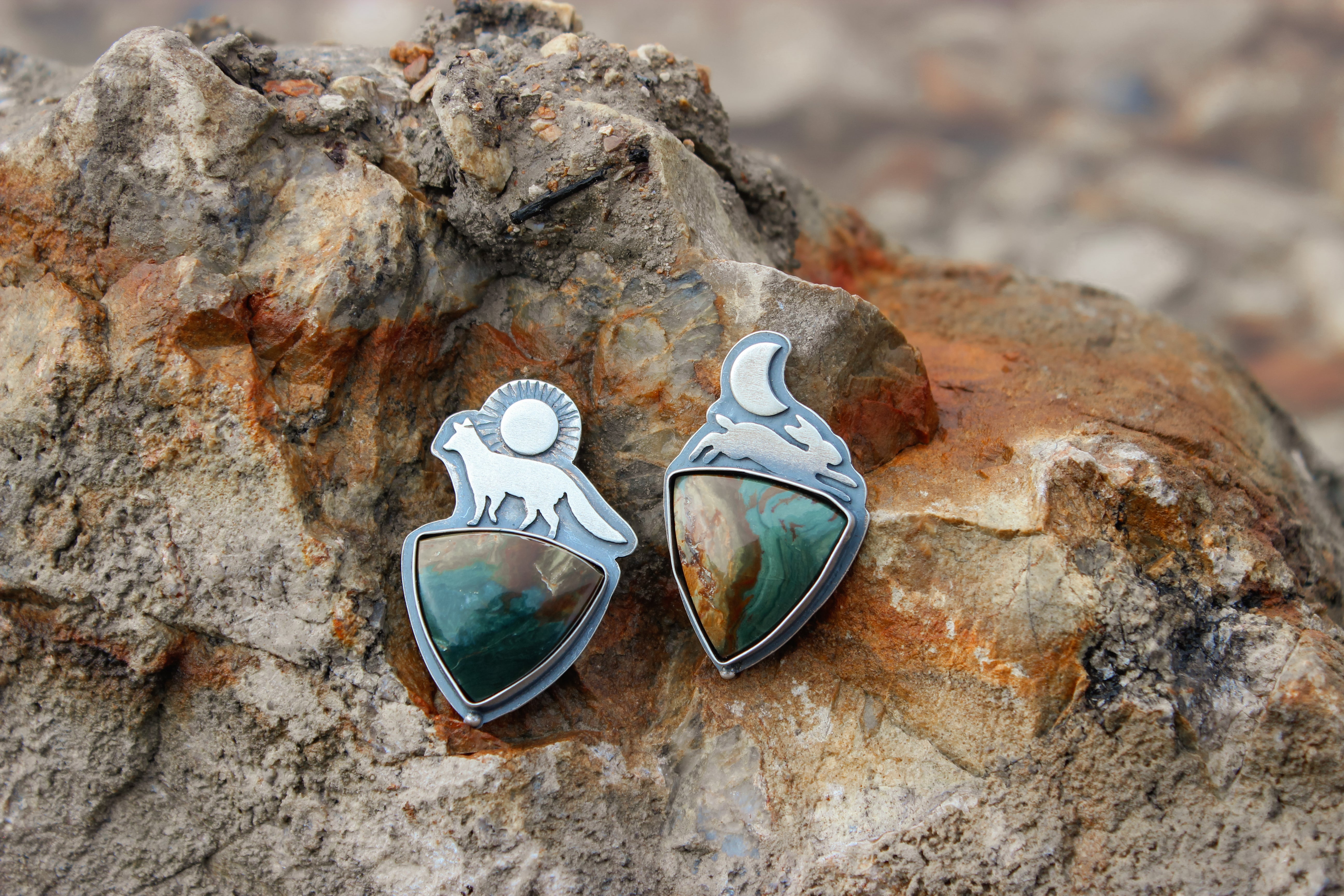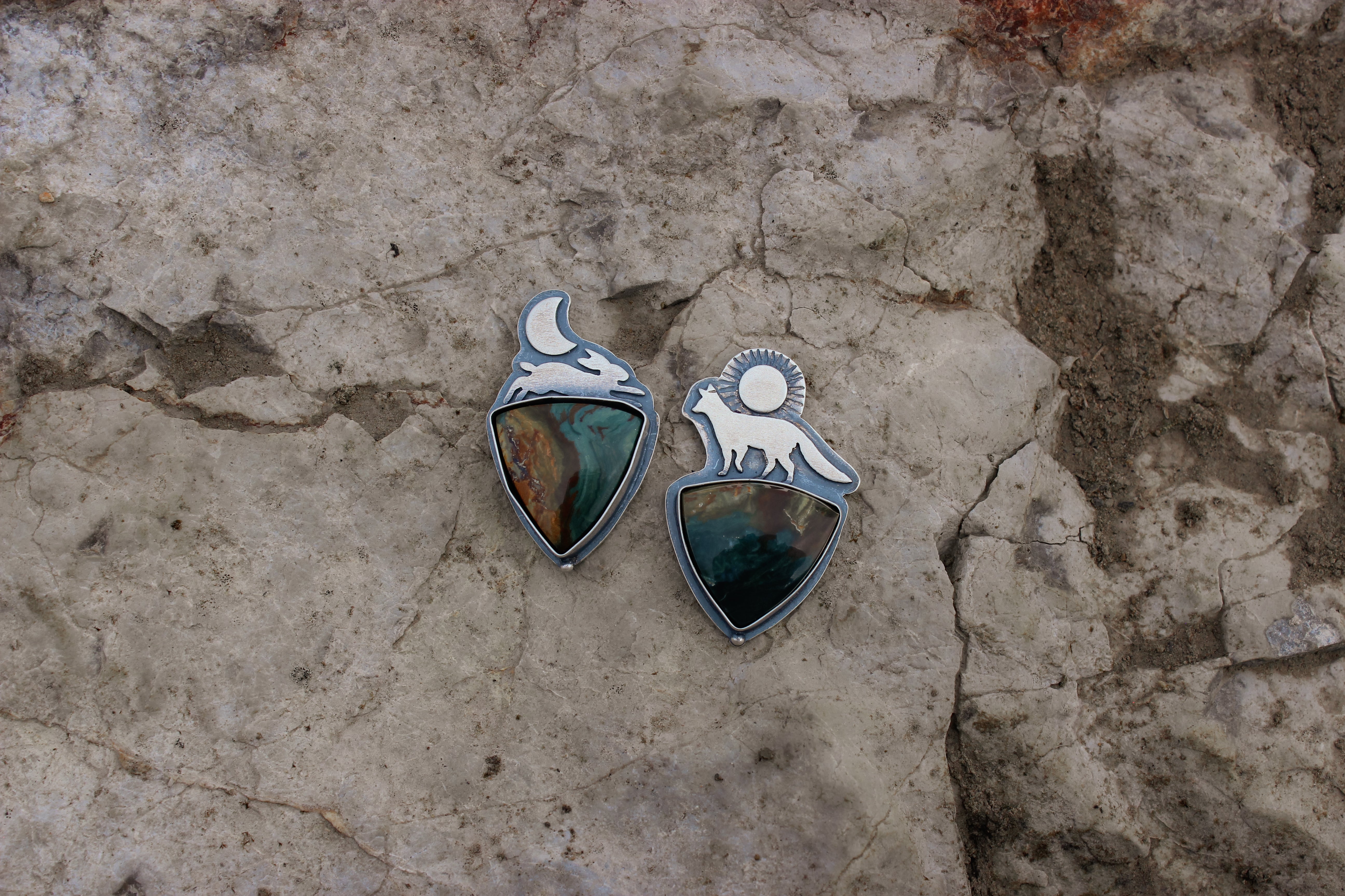 Choose your own adventure! These two pieces can be finished as a pair of earrings (fox & hare), or on their own as a ring or necklace! They each feature a stunning slice of Gary Green jasper- the hare has a stunning red ribbon dividing ochre and teal hues, while the fox has a stormy array of midnight blue with lush greens and browns.