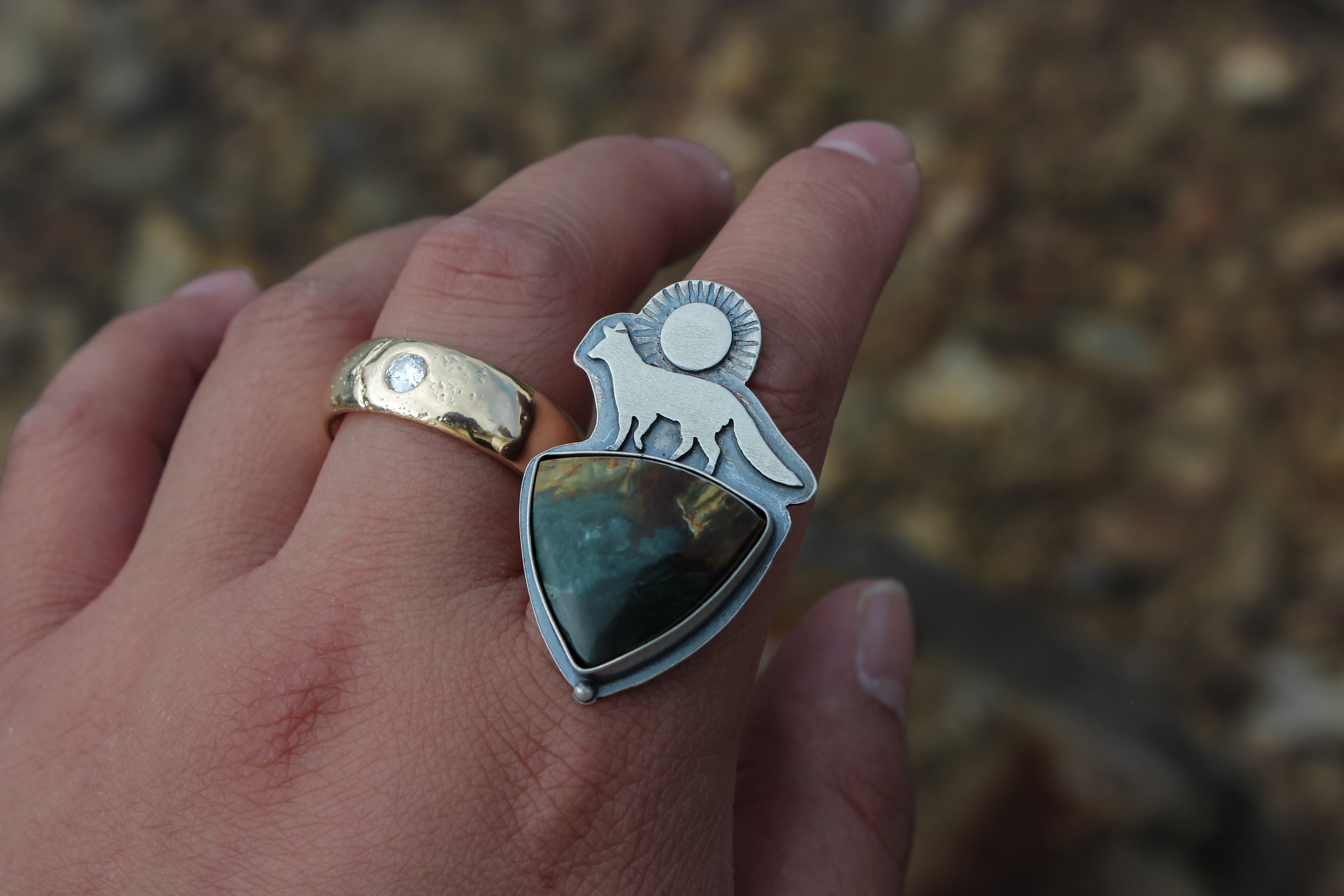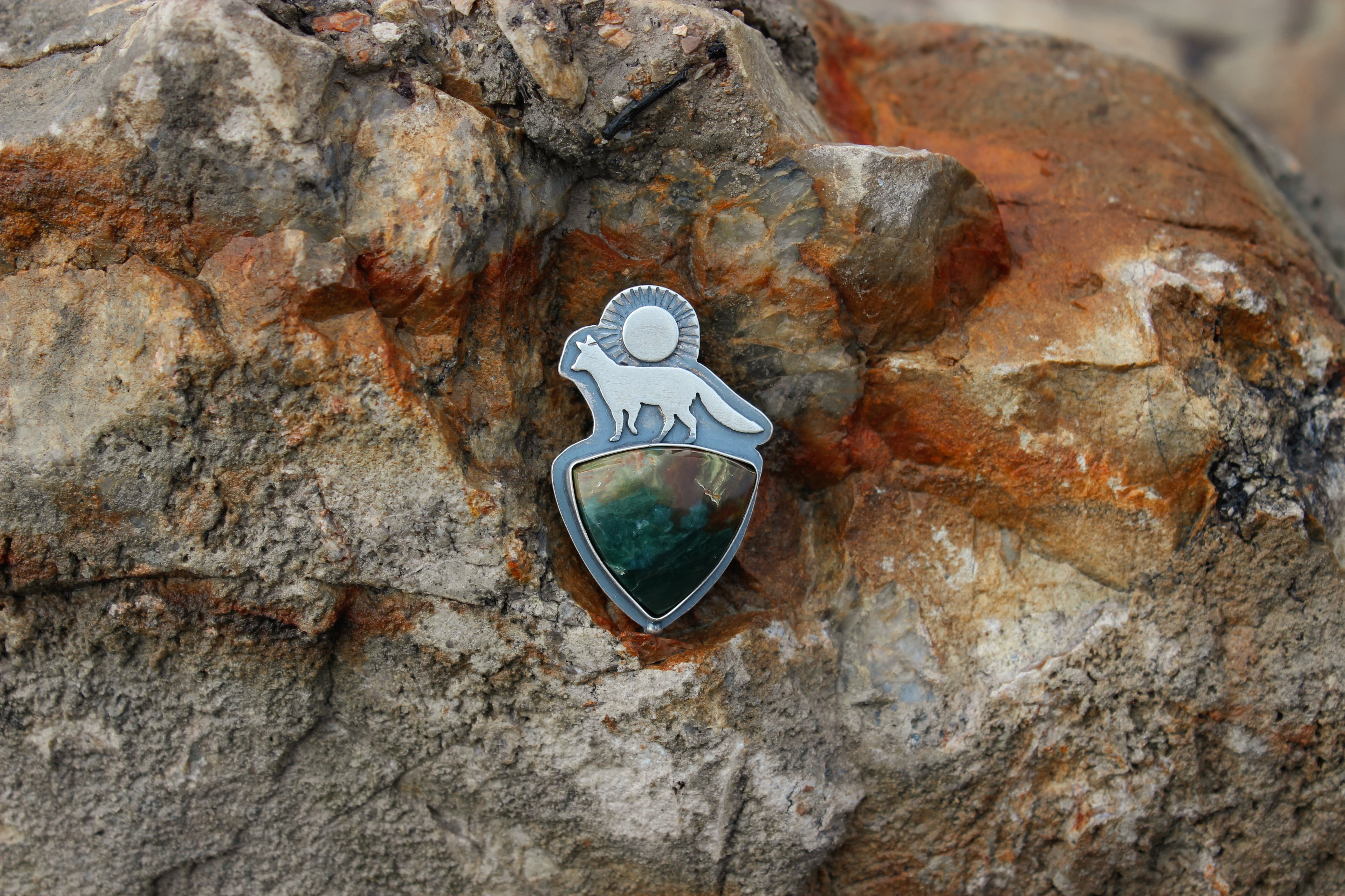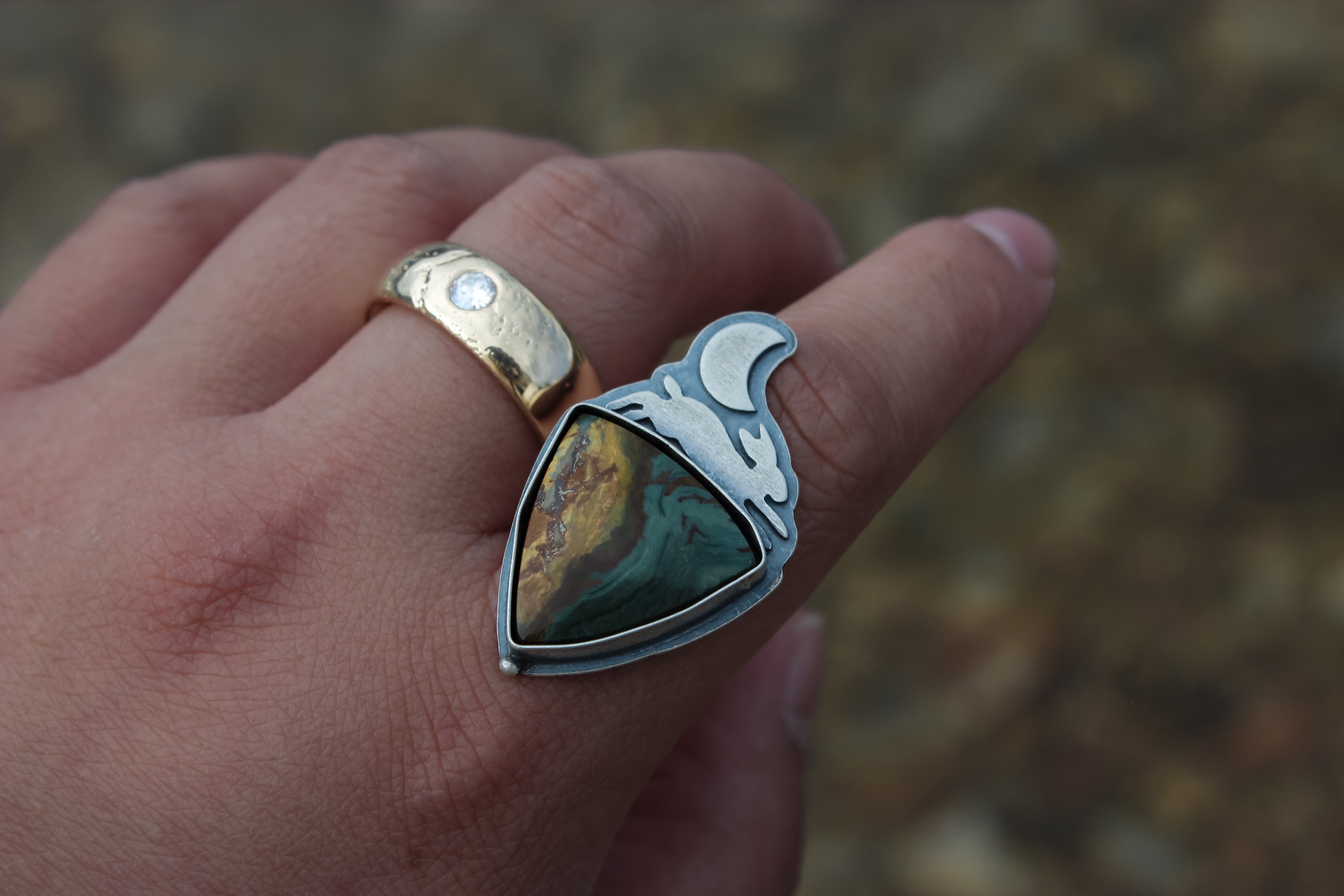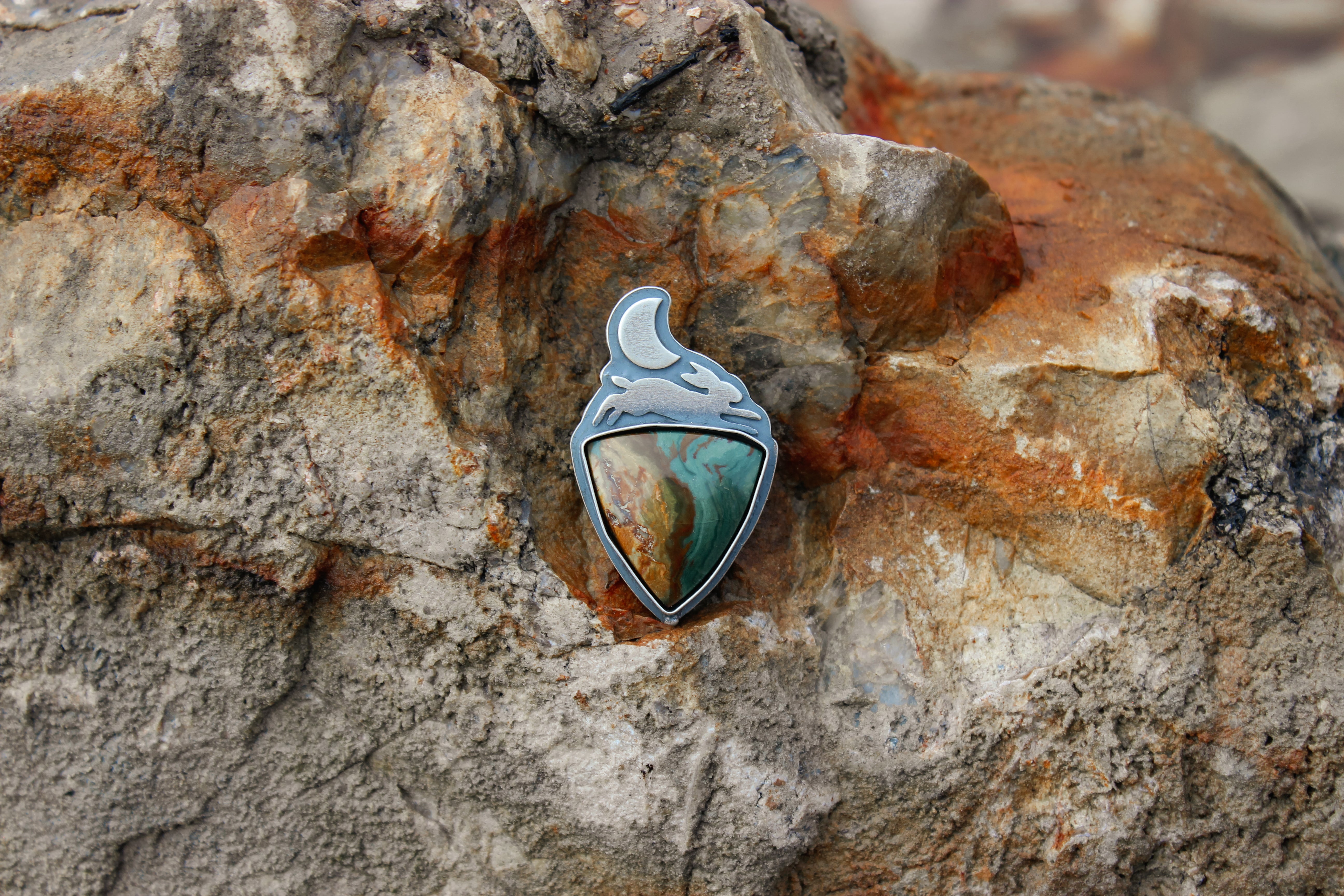 Choose your own adventure! These two pieces can be finished as a pair of earrings (fox & hare), or on their own as a ring or necklace! They each feature a stunning slice of Gary Green jasper- the hare has a stunning red ribbon dividing ochre and teal hues, while the fox has a stormy array of midnight blue with lush greens and browns.