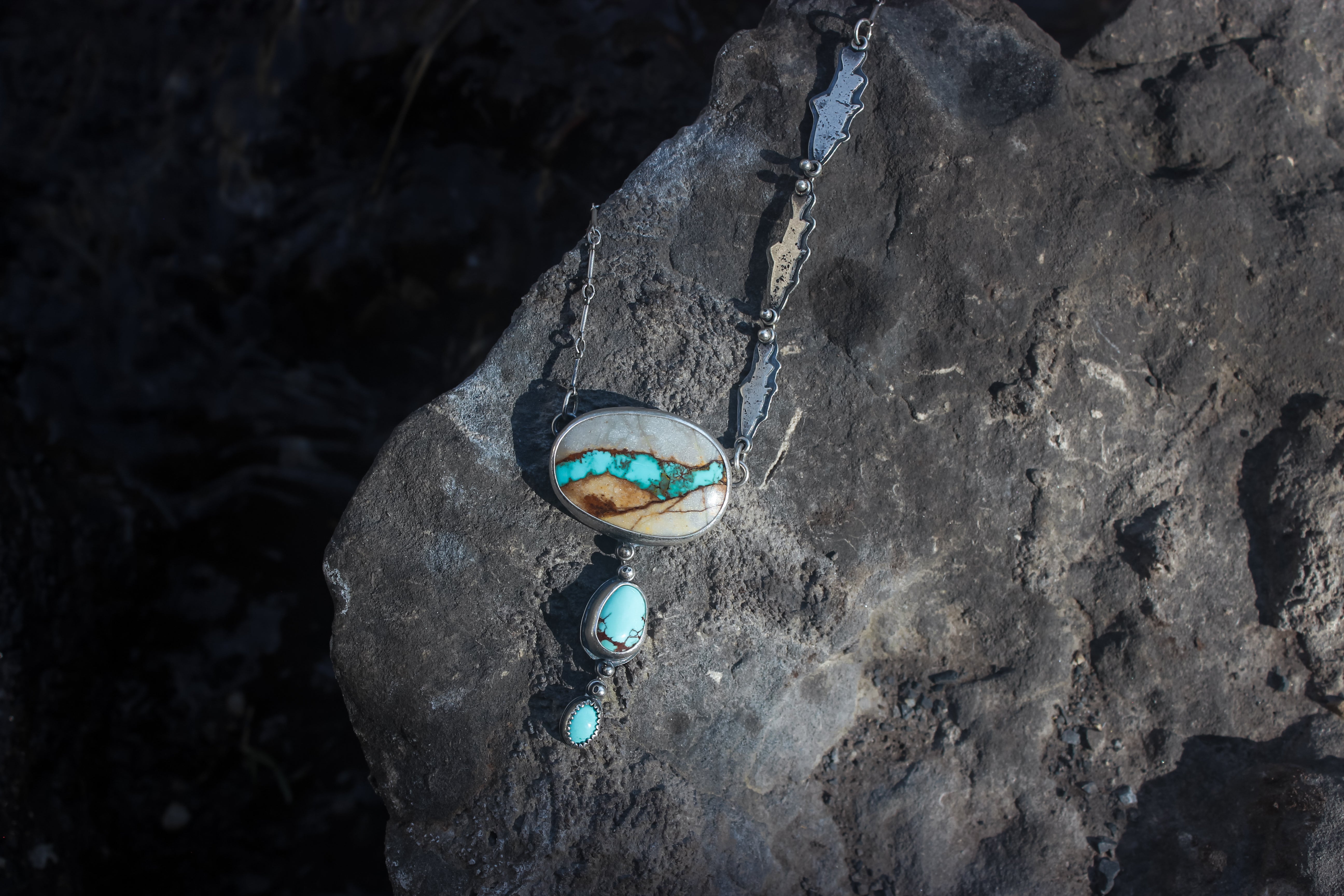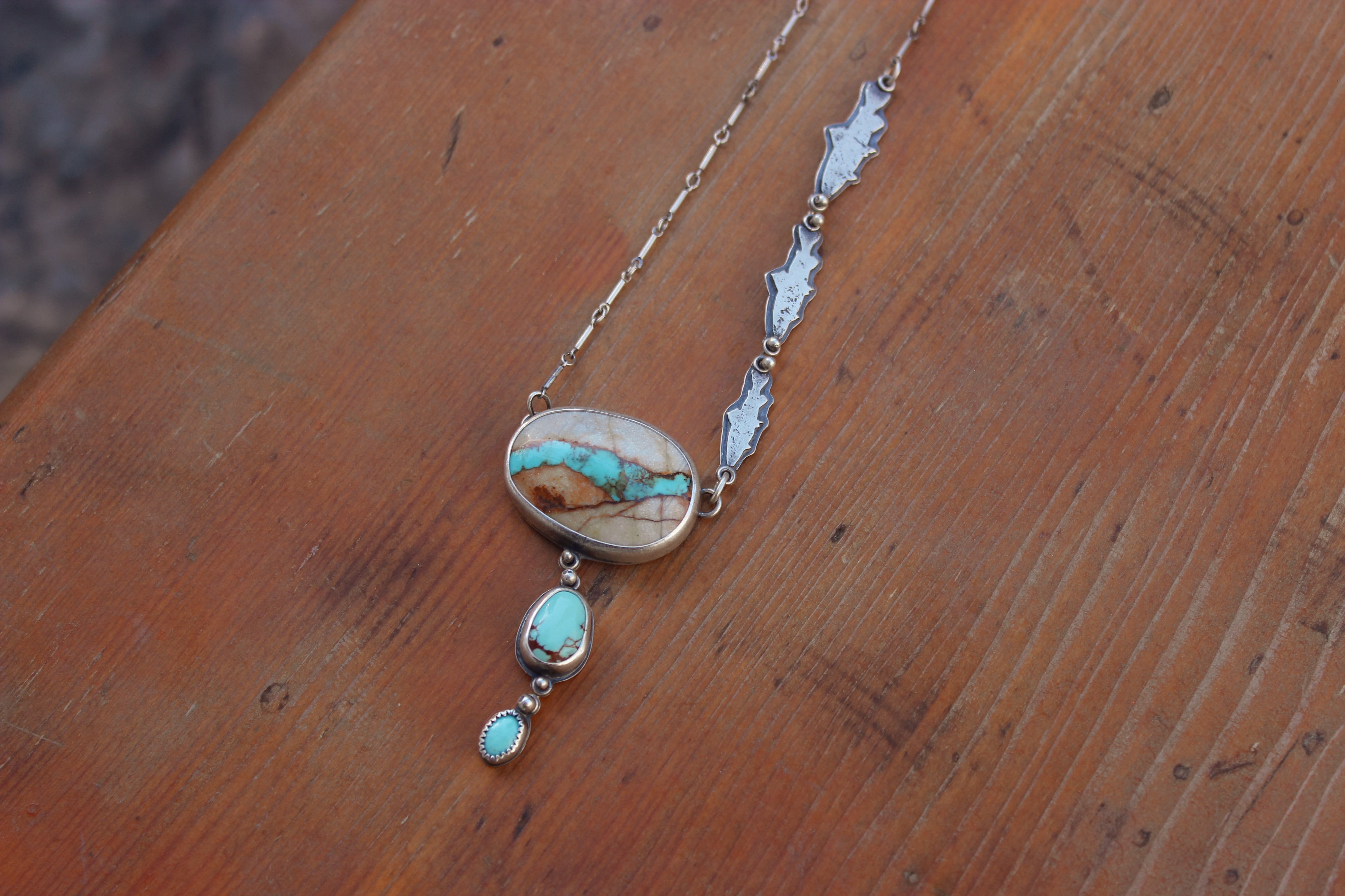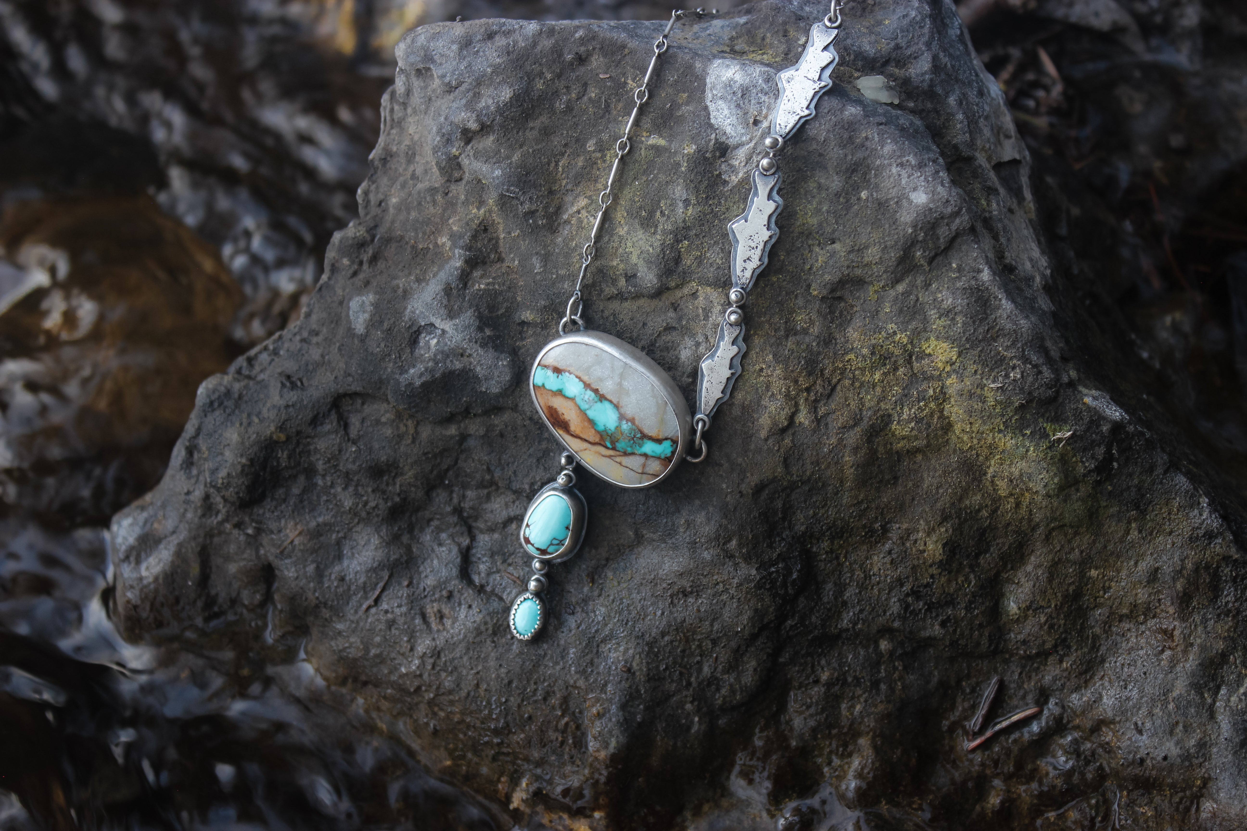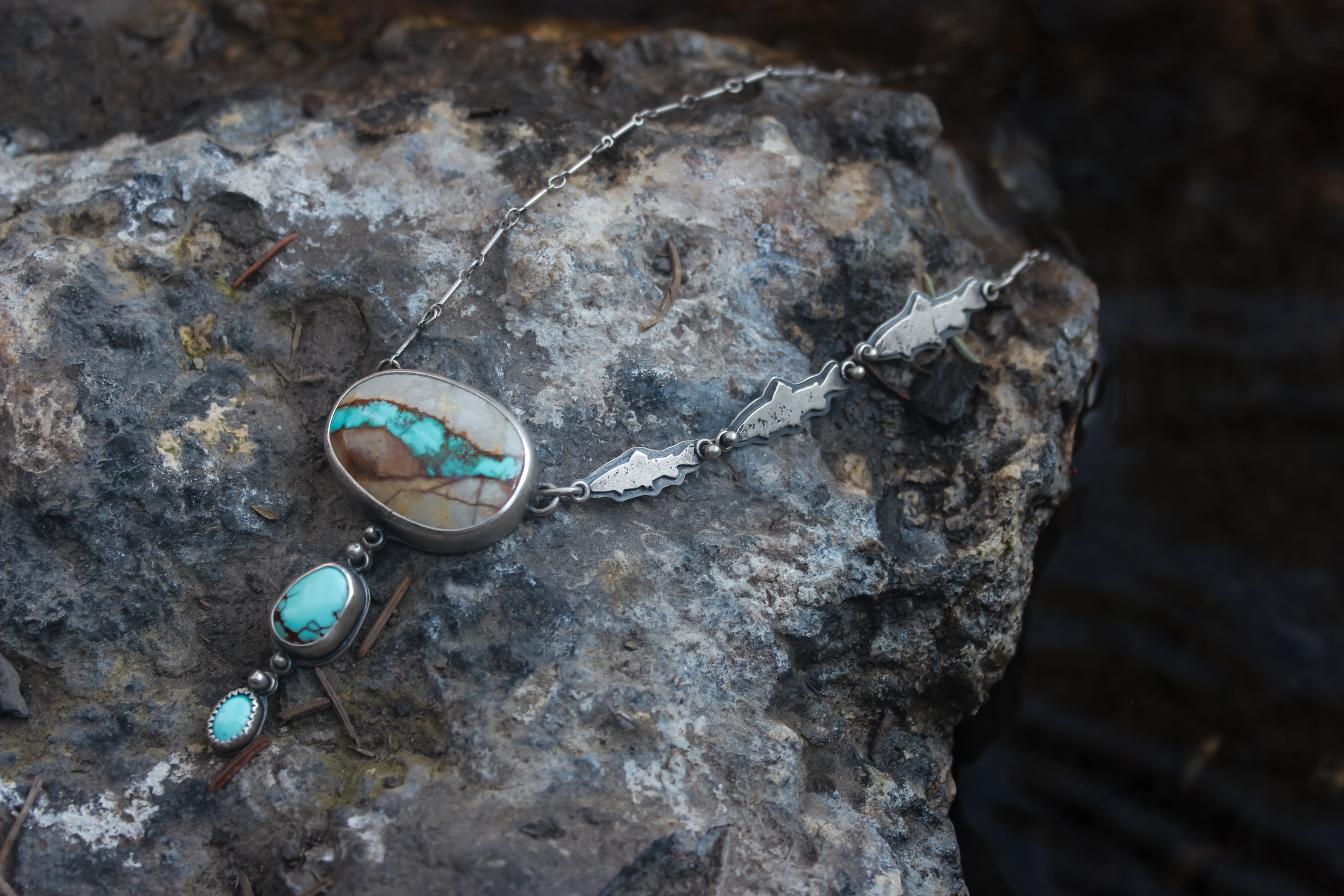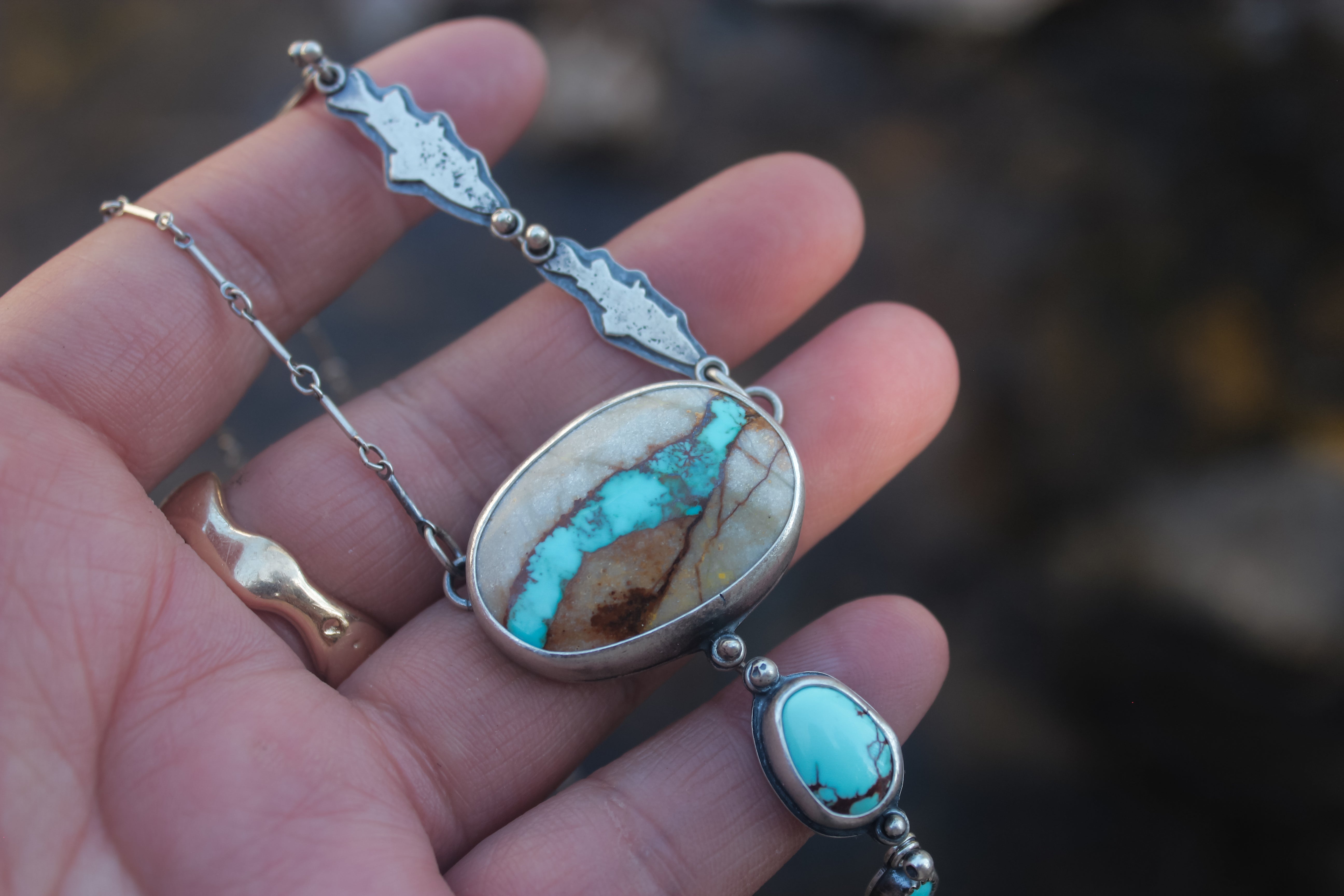 The big stone is natural superb Royston Ribbon turquoise, the little one is Sleeping Beauty turquoise, and the middle is American mined turquoise of unknown type