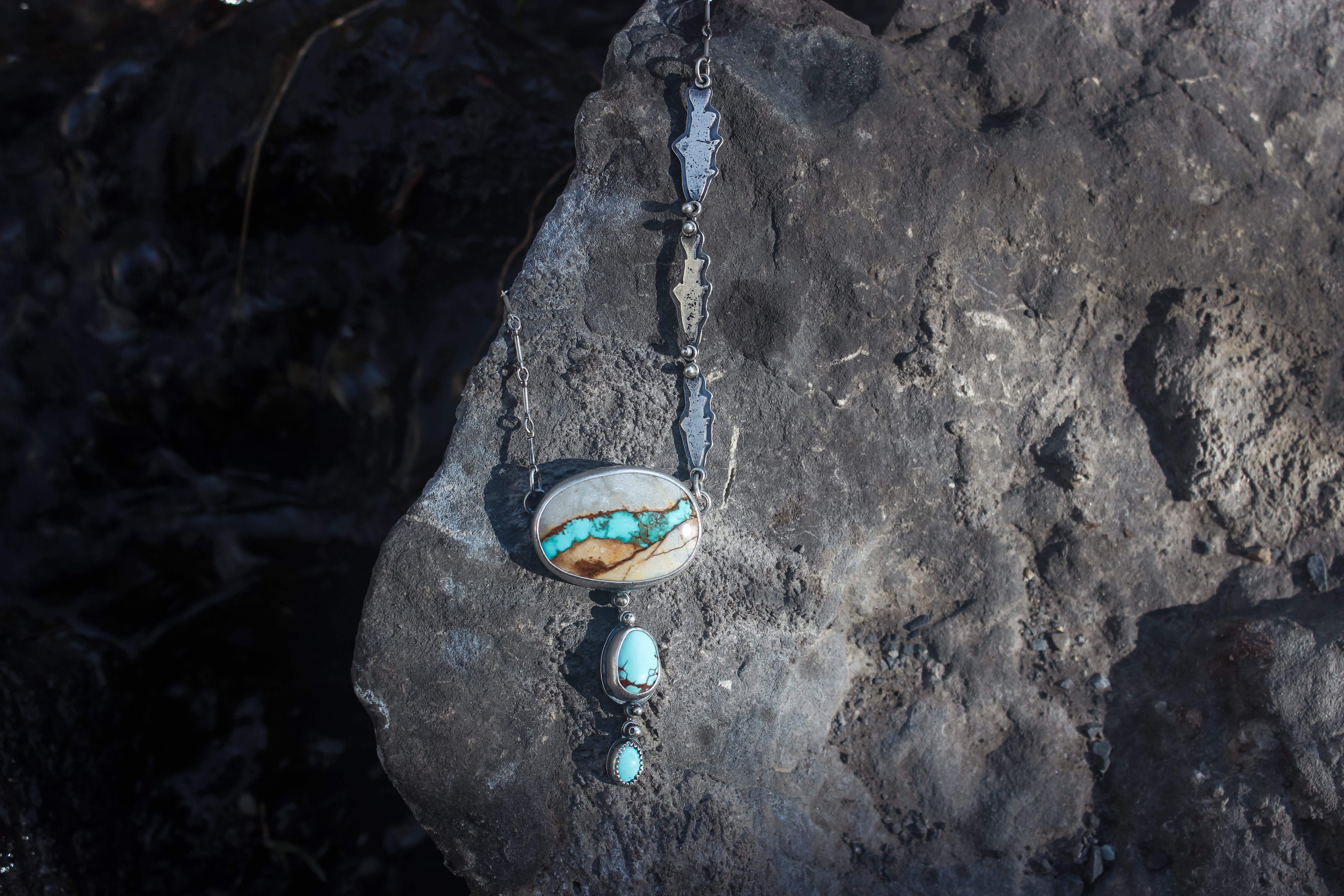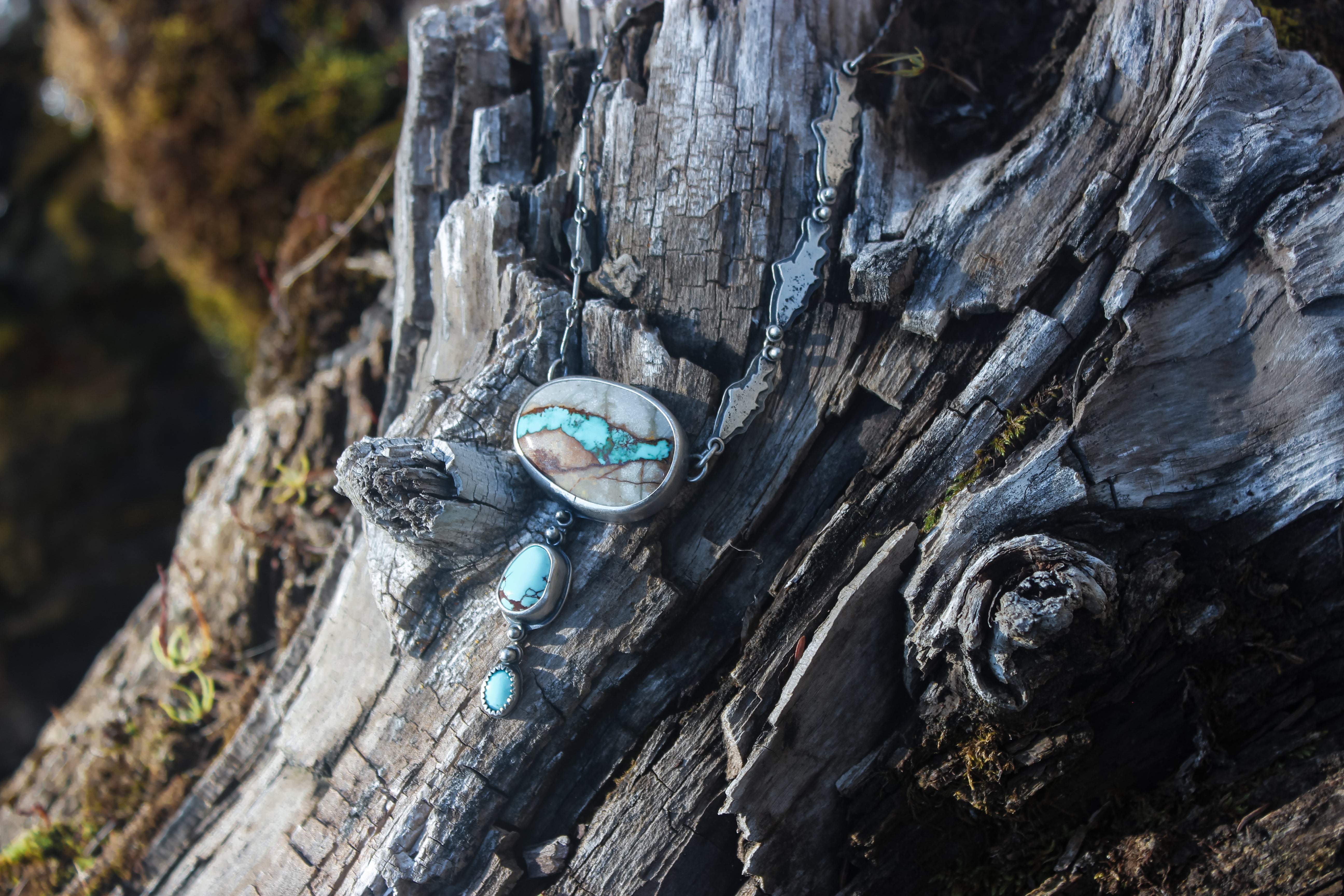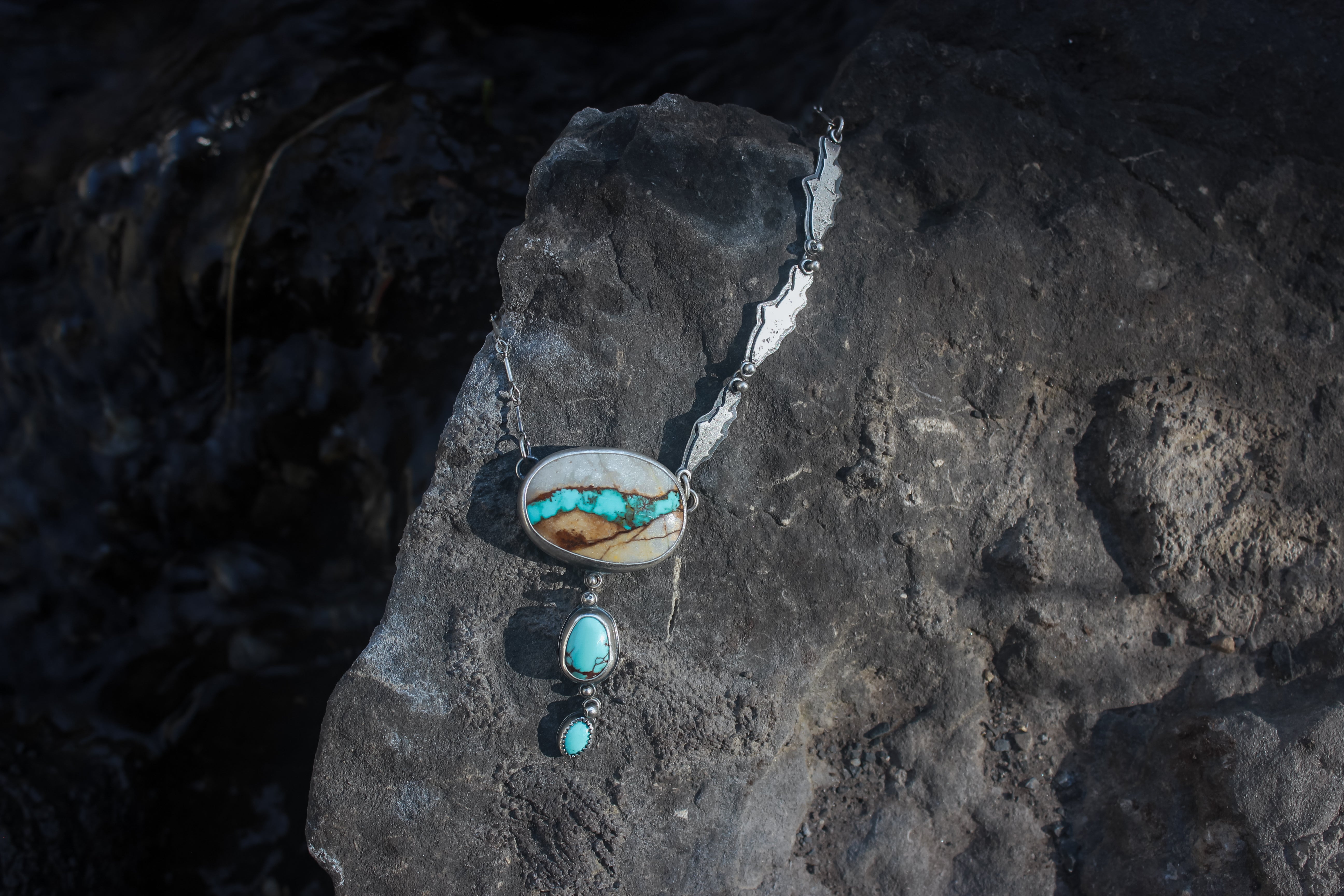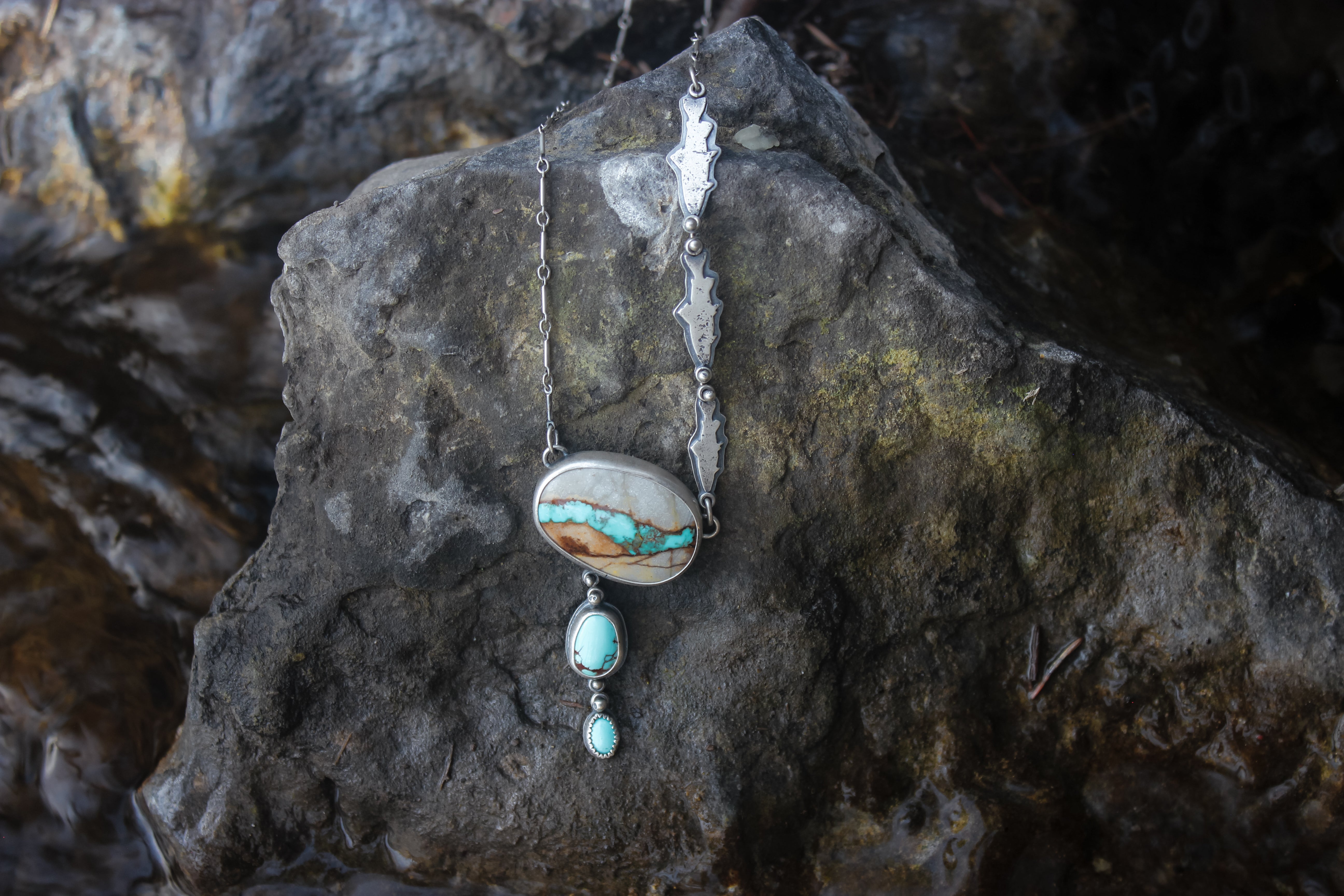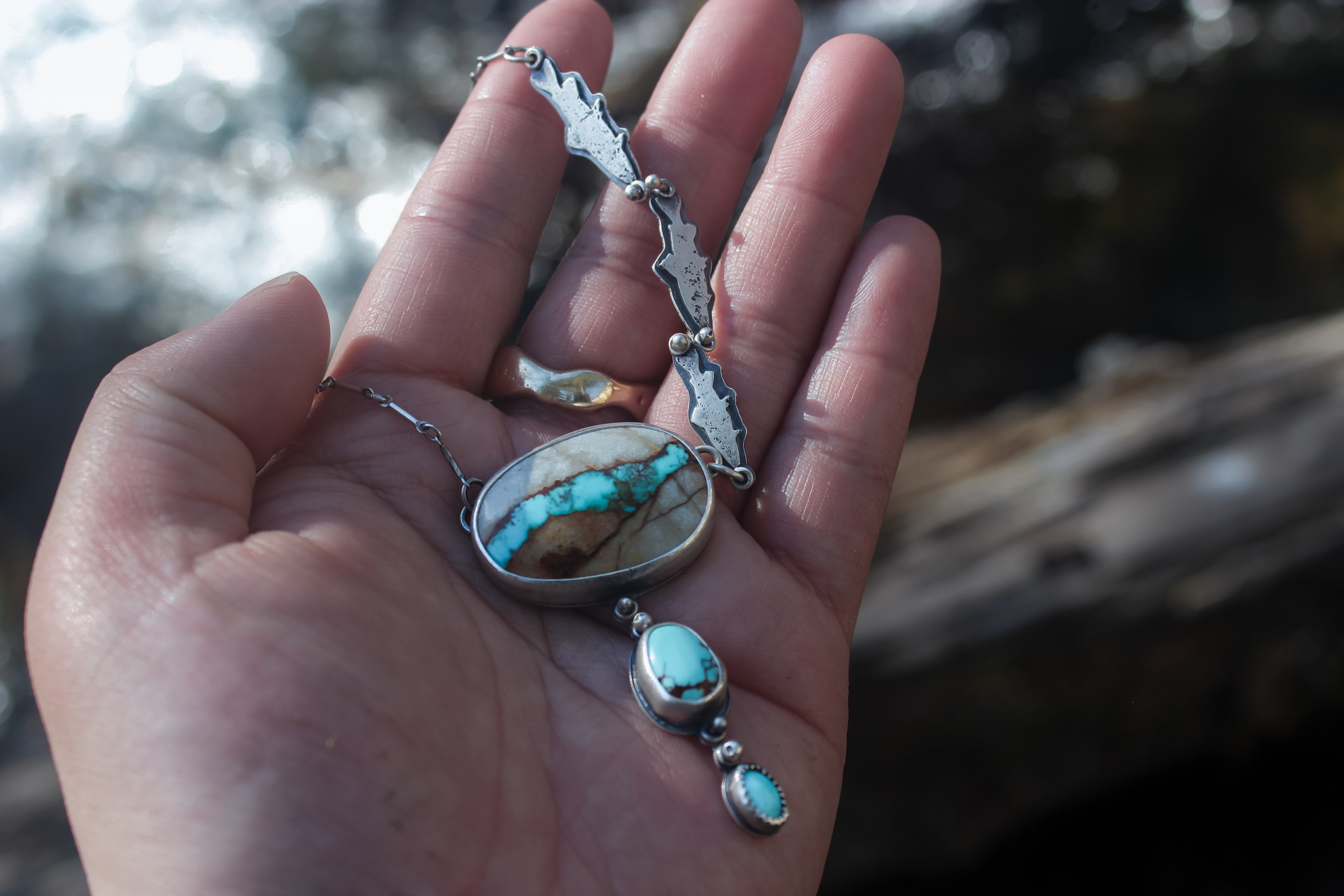 The big stone is natural superb Royston Ribbon turquoise, the little one is Sleeping Beauty turquoise, and the middle is American mined turquoise of unknown type