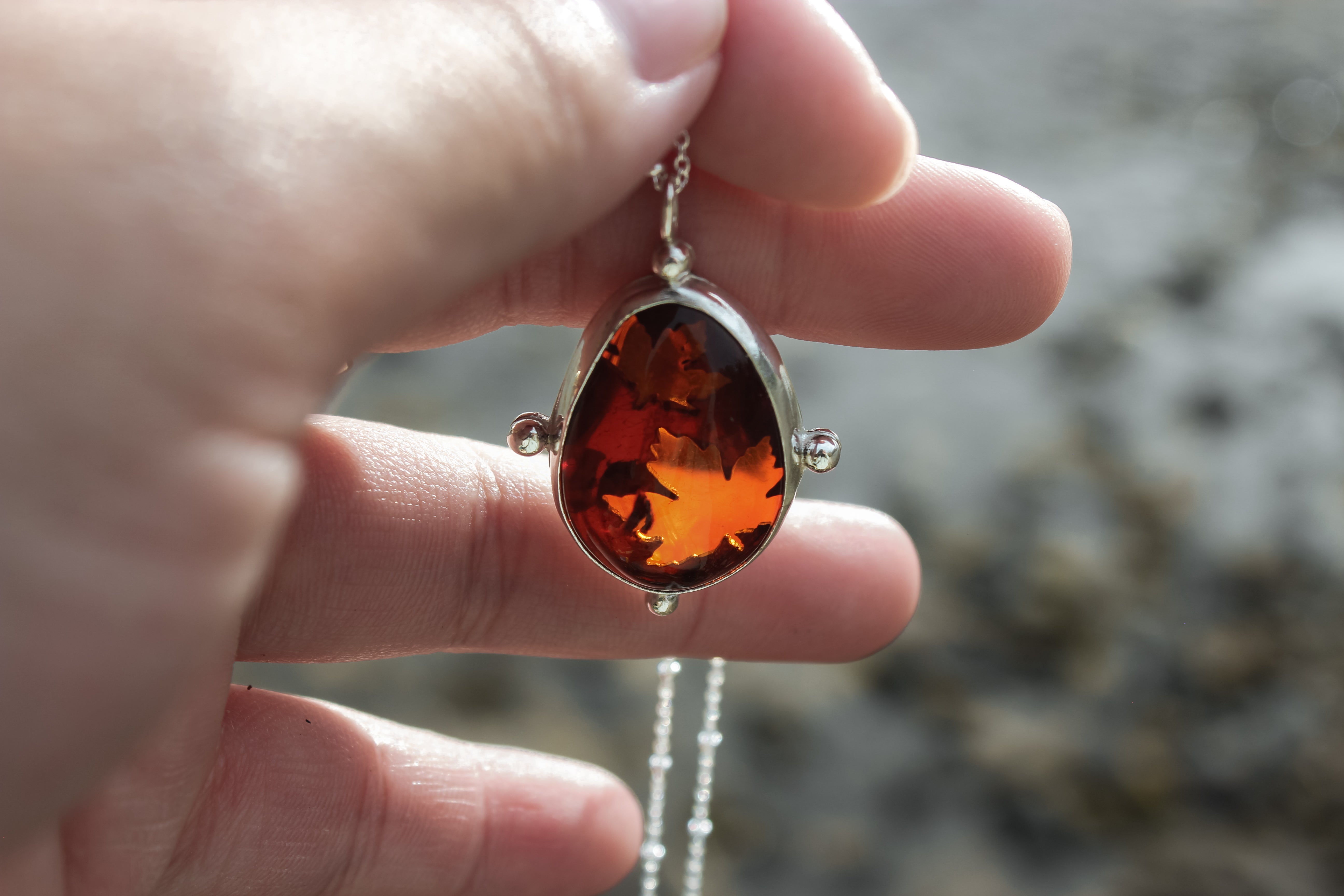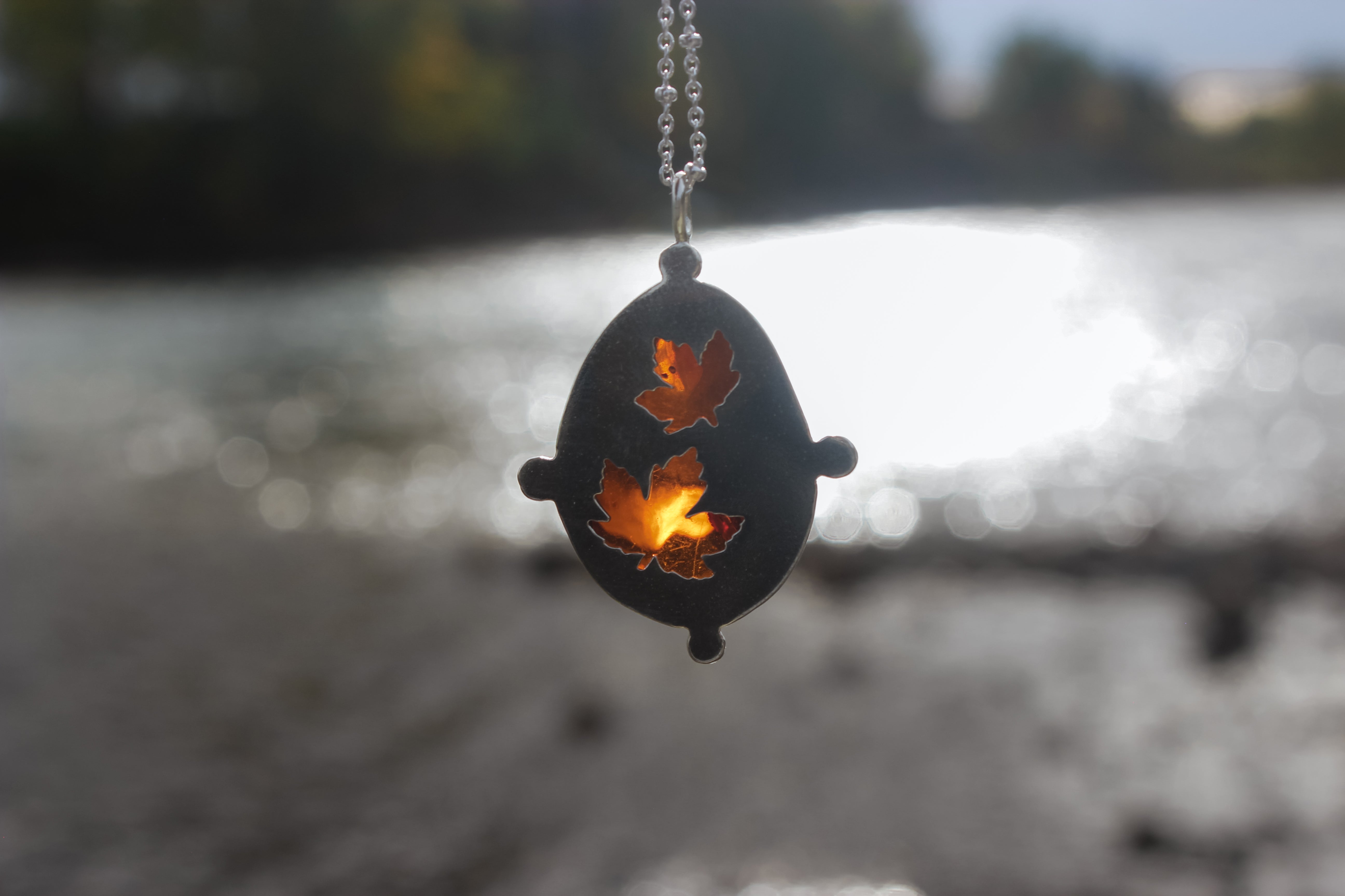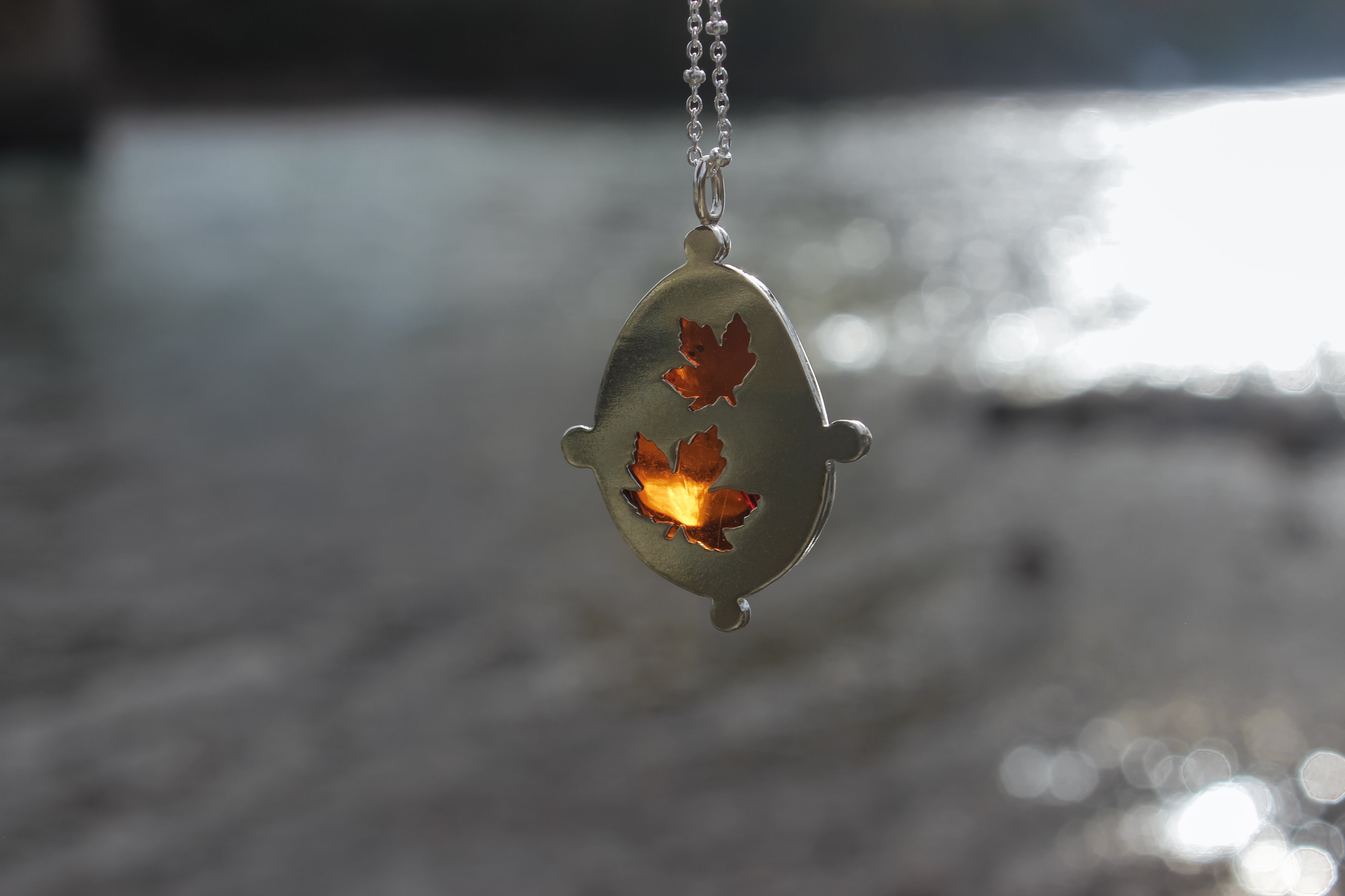 Maple leaf cutouts glow brightly through warm, gooey amber. The golden hue of the amber looks like maple syrup spilling over the edge, pure and glowing straight from the tree. The perfect talisman to carry with you through the fall, to keep the light with you throughout the darker months.