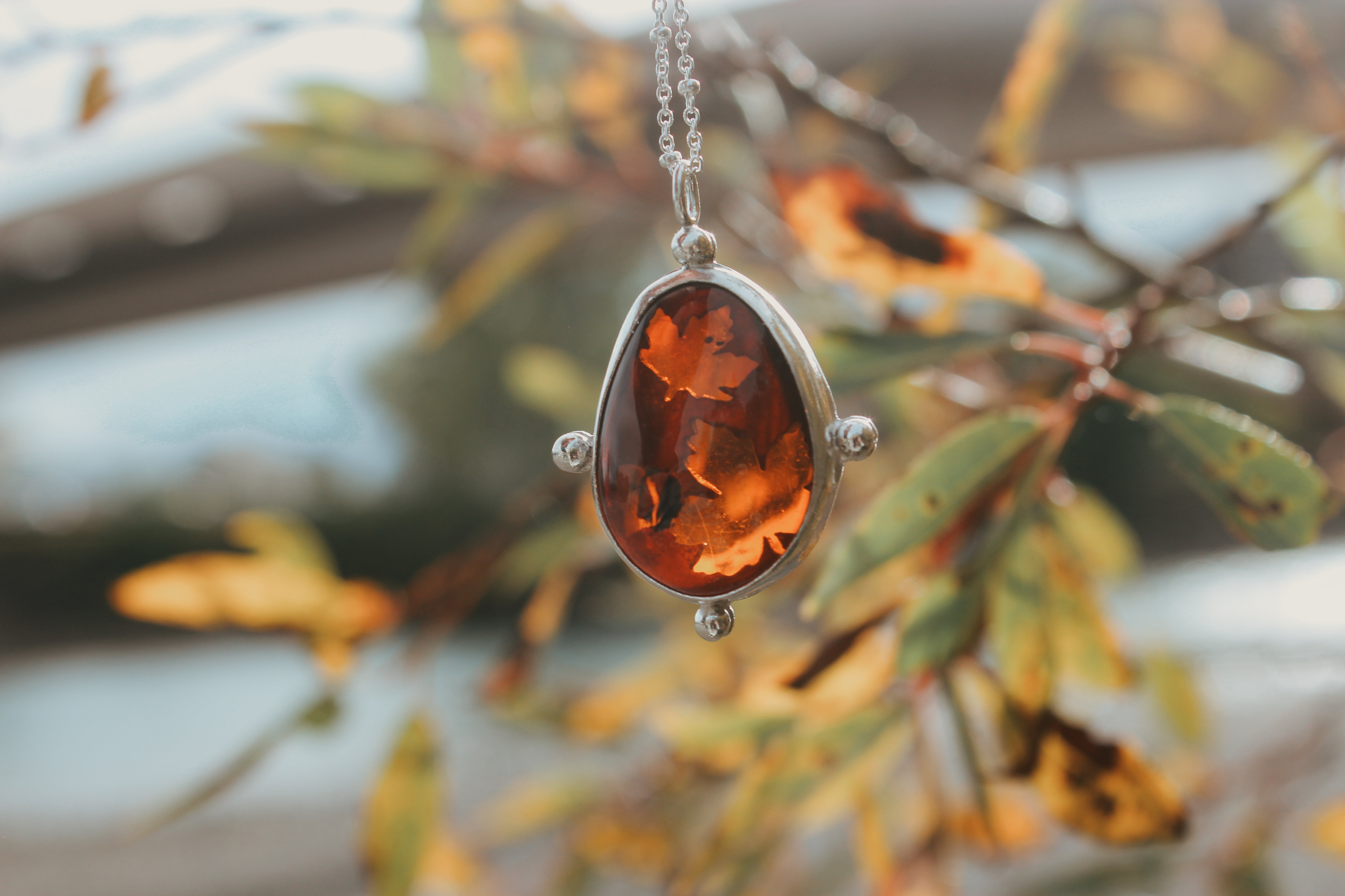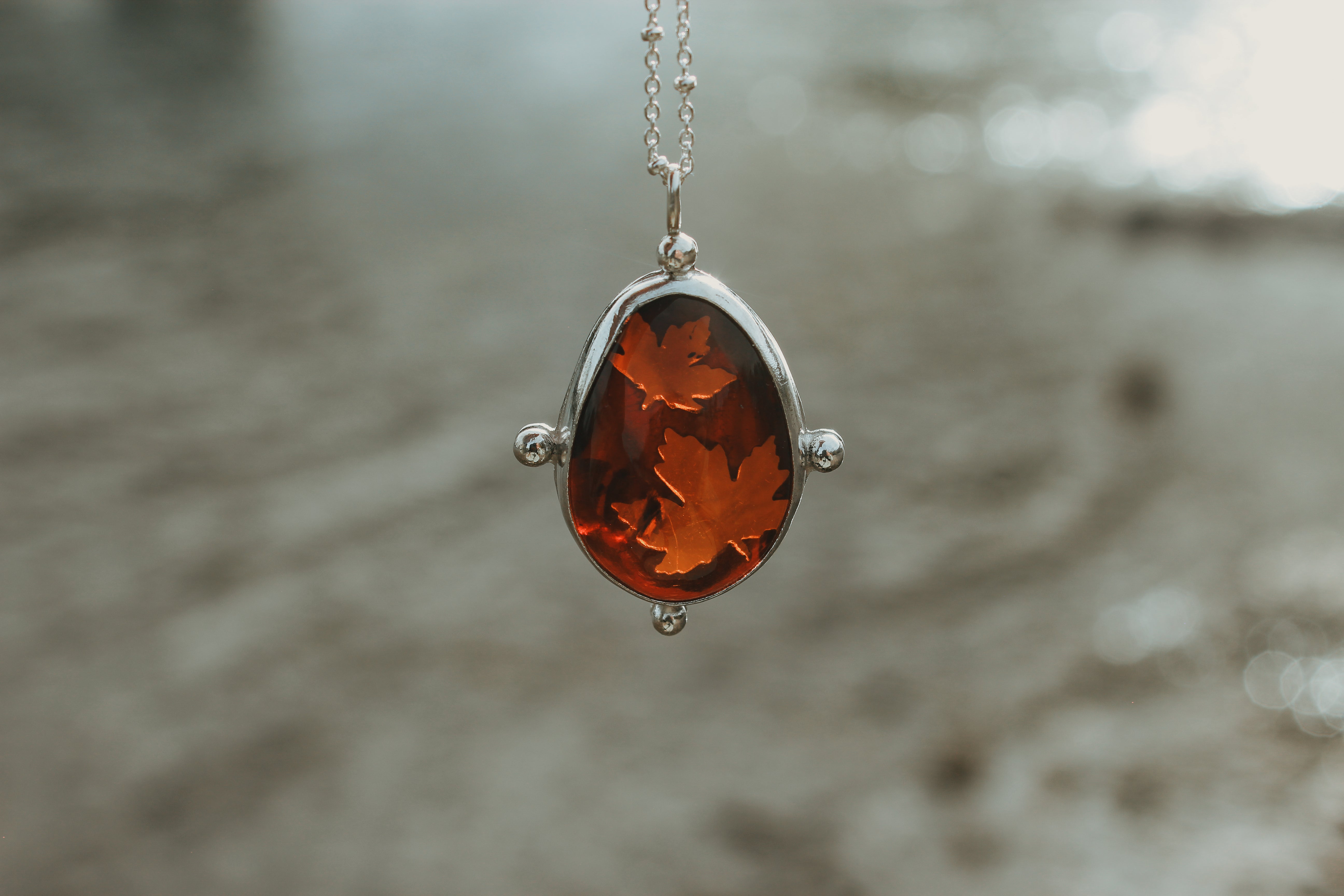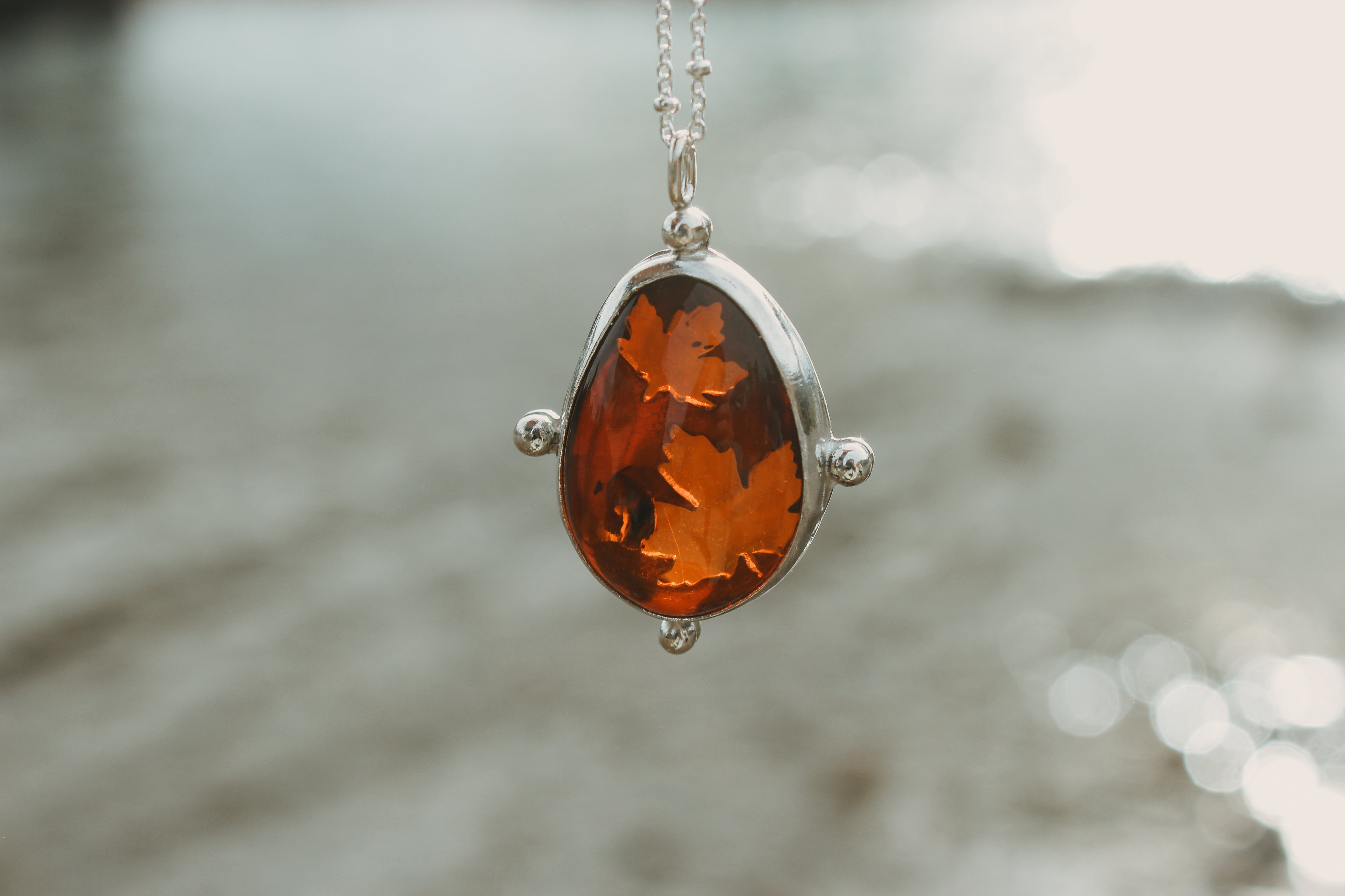 Maple leaf cutouts glow brightly through warm, gooey amber. The golden hue of the amber looks like maple syrup spilling over the edge, pure and glowing straight from the tree. The perfect talisman to carry with you through the fall, to keep the light with you throughout the darker months.