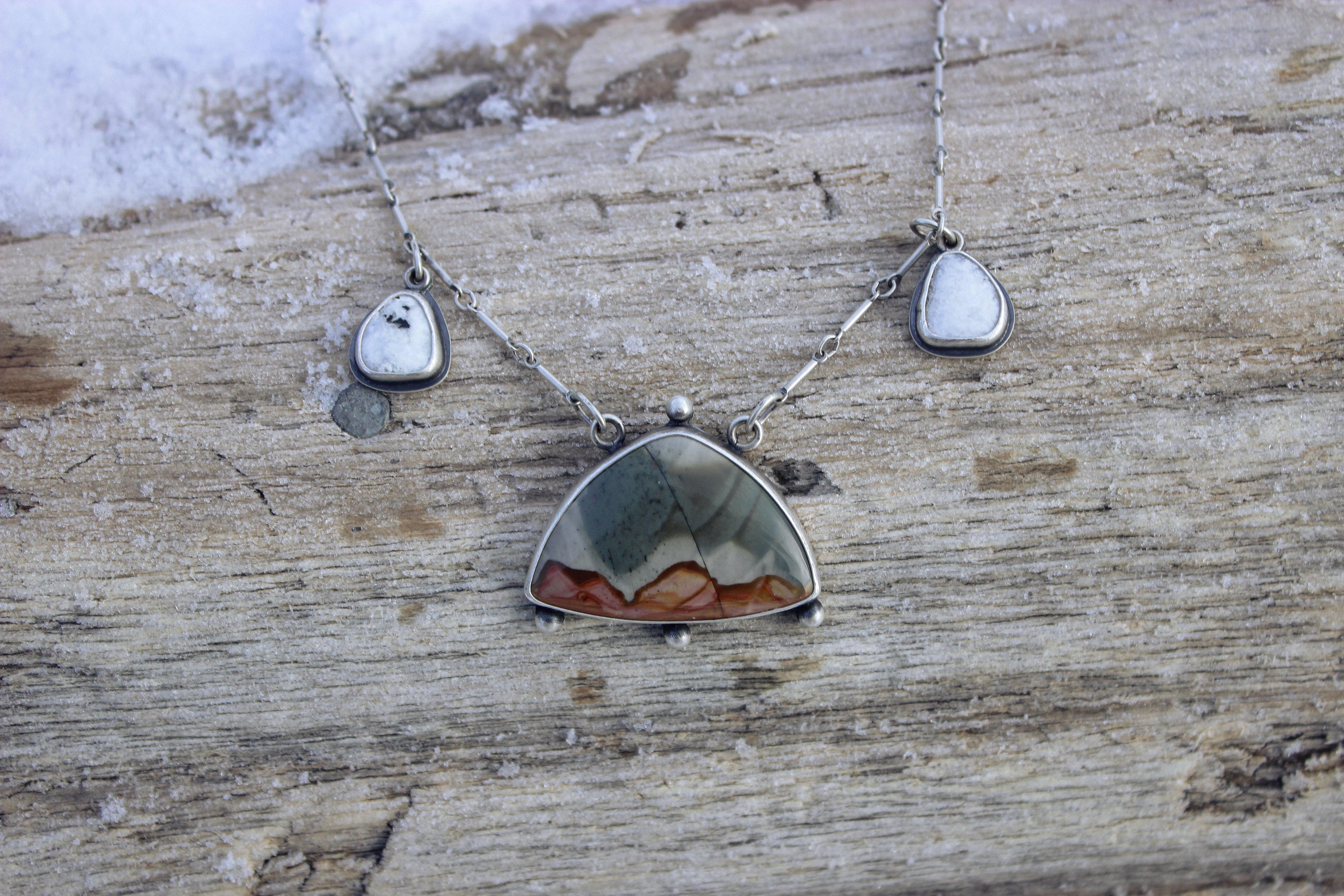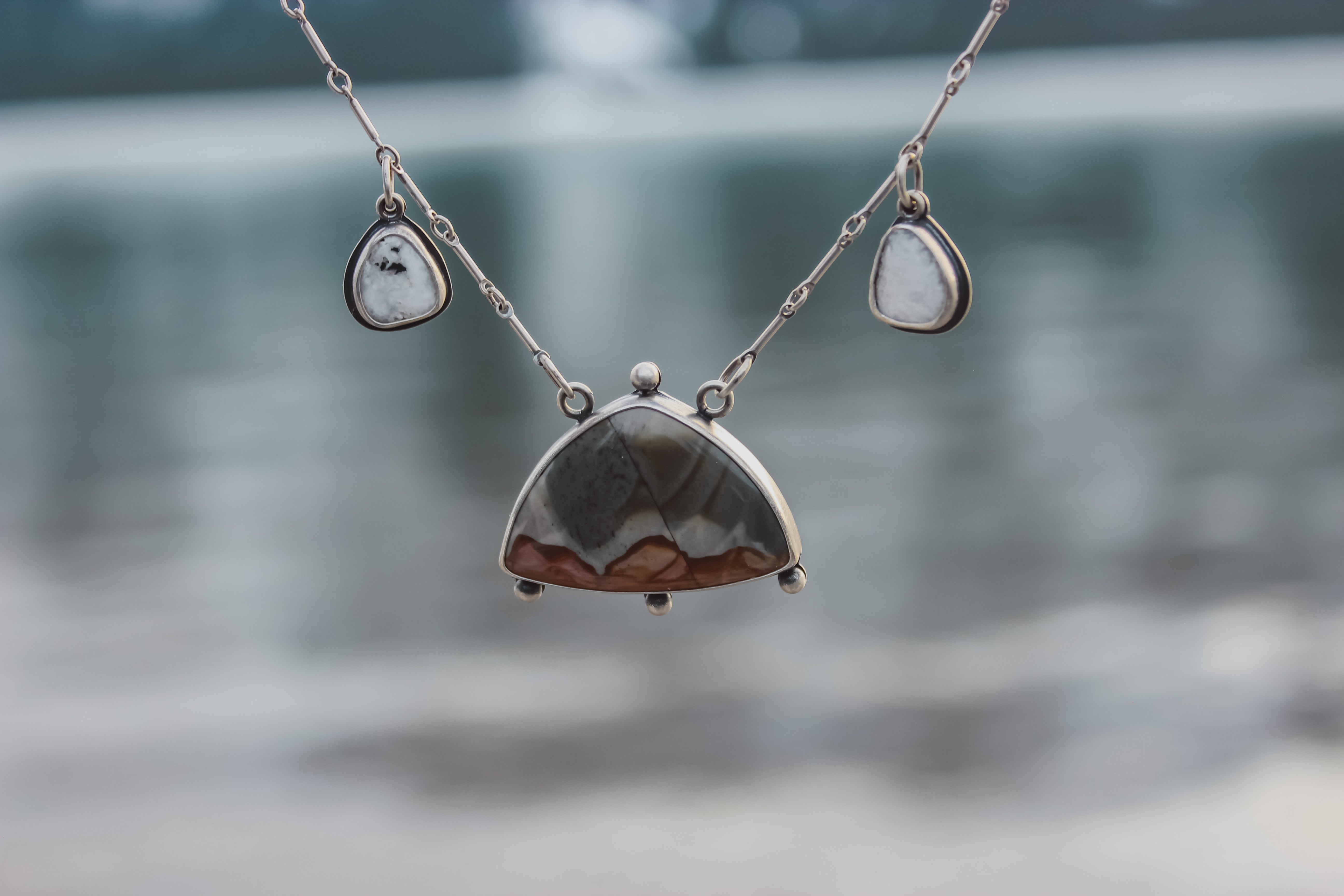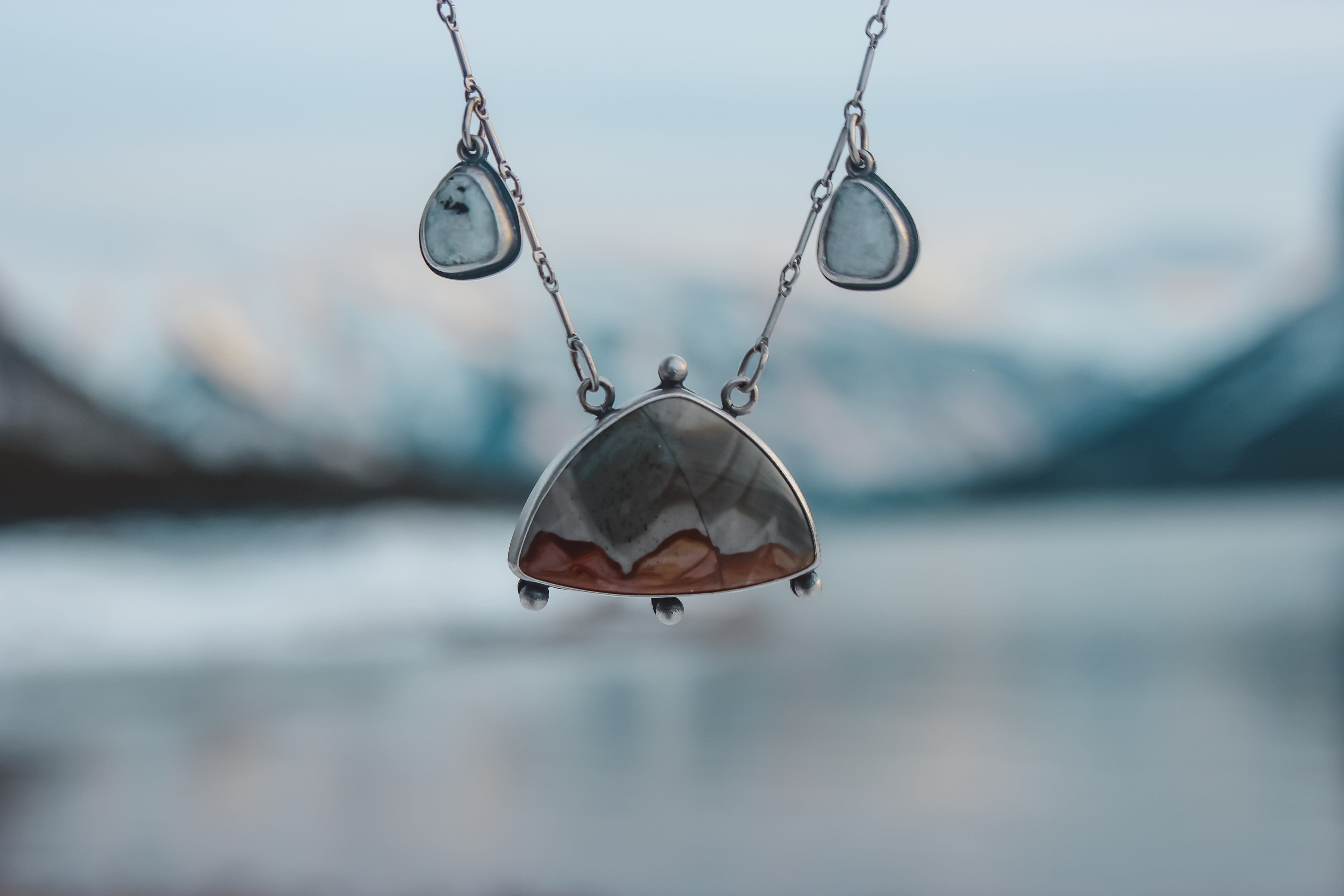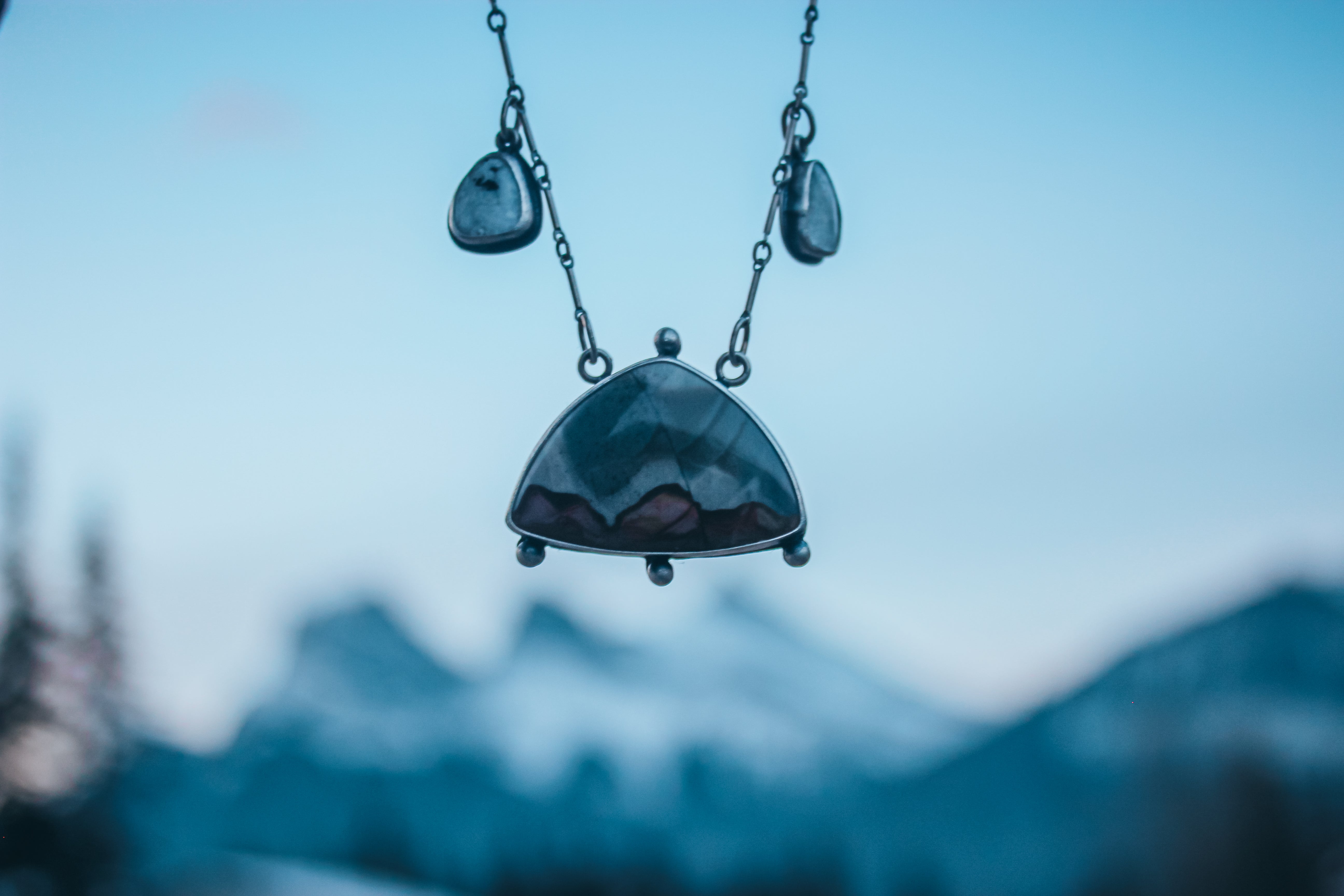 A mama bear and her cub have settled into their den for the winter, high atop a mountain where they will lay for the next several months. The mountain range in the stone is reminiscent of the Three Sisters mountain range in Canmore Alberta, and even made it's way there for a photoshoot. The magic of the mountains infused into a piece of art to wear around the neck. A favorite of mine from this collection.
