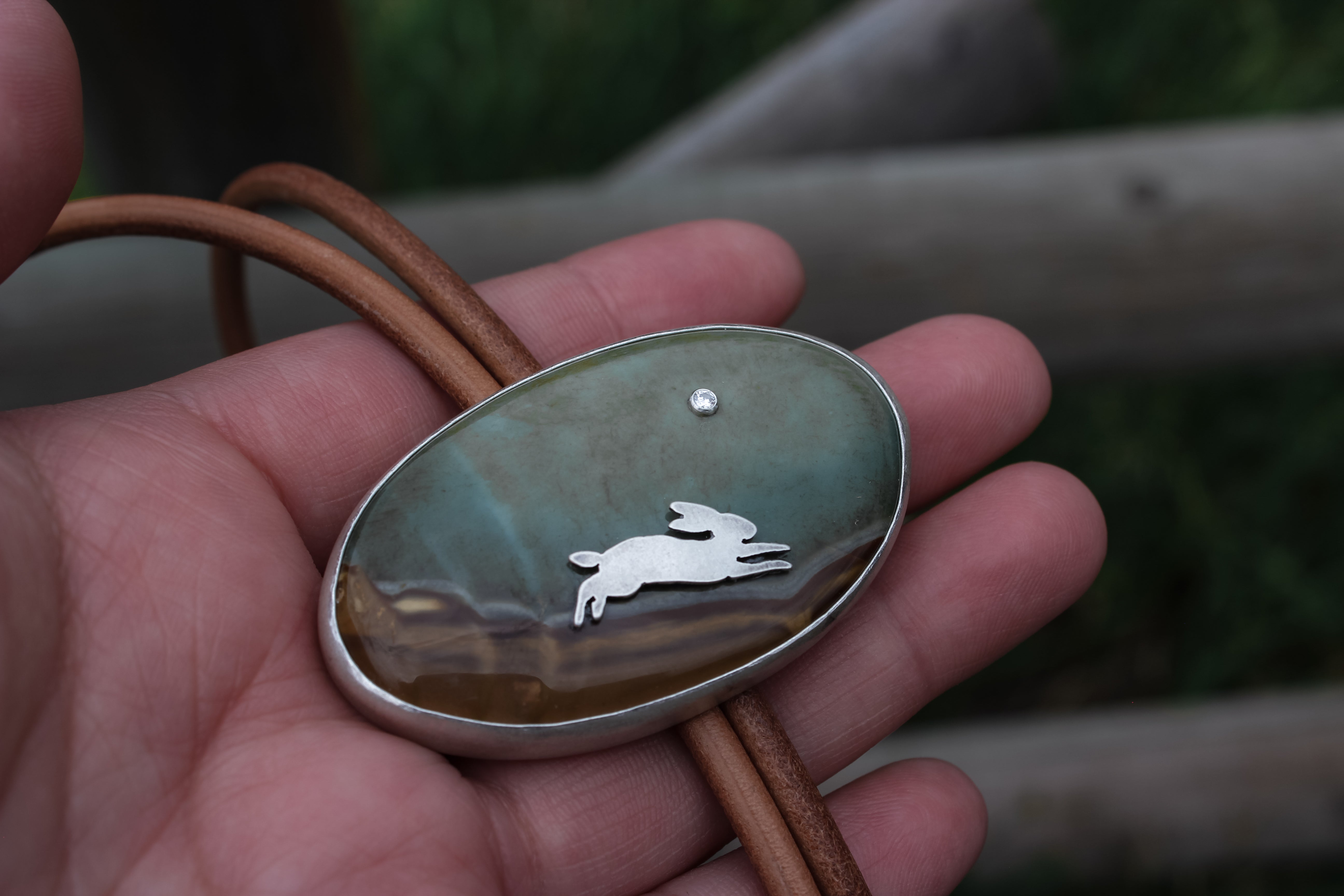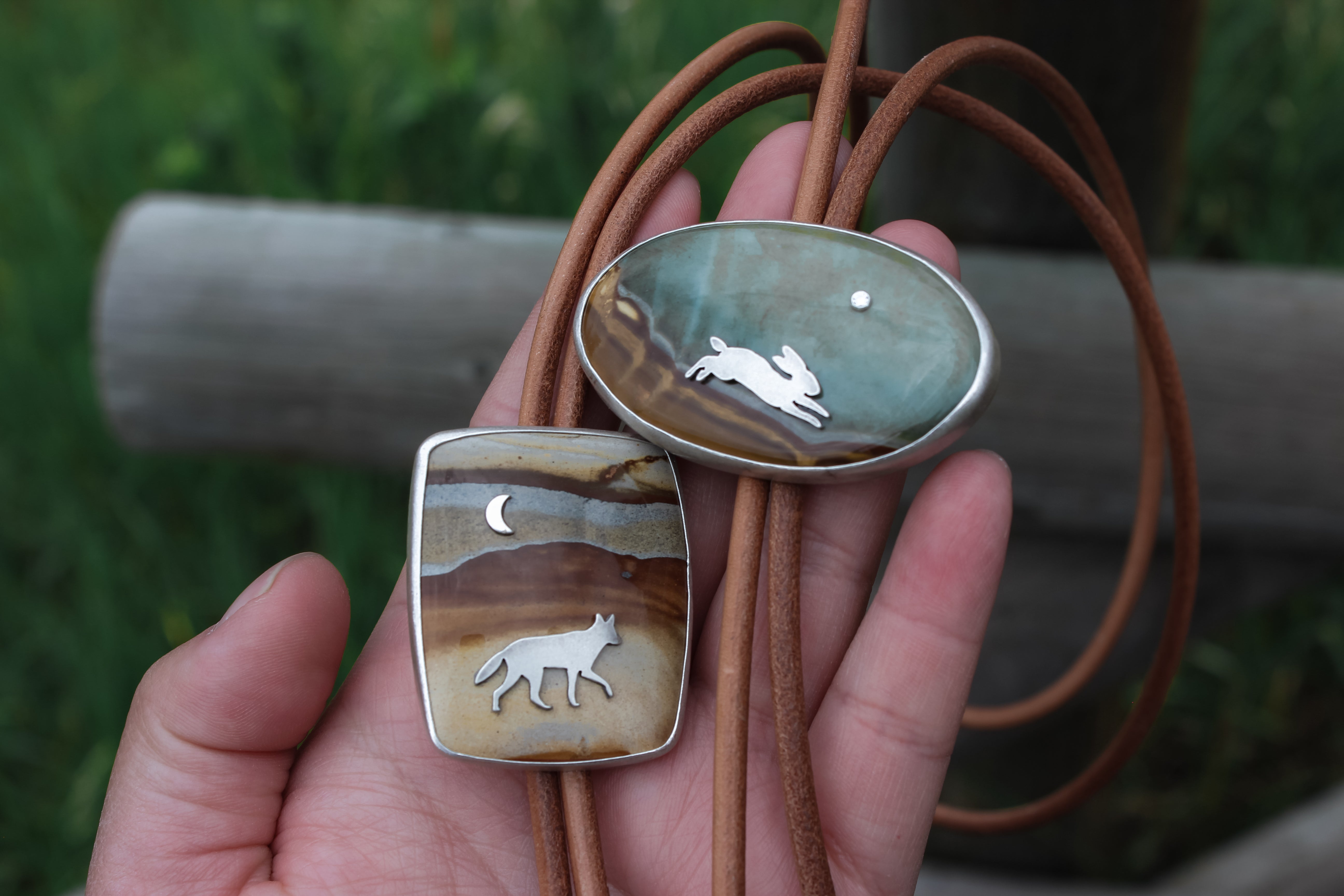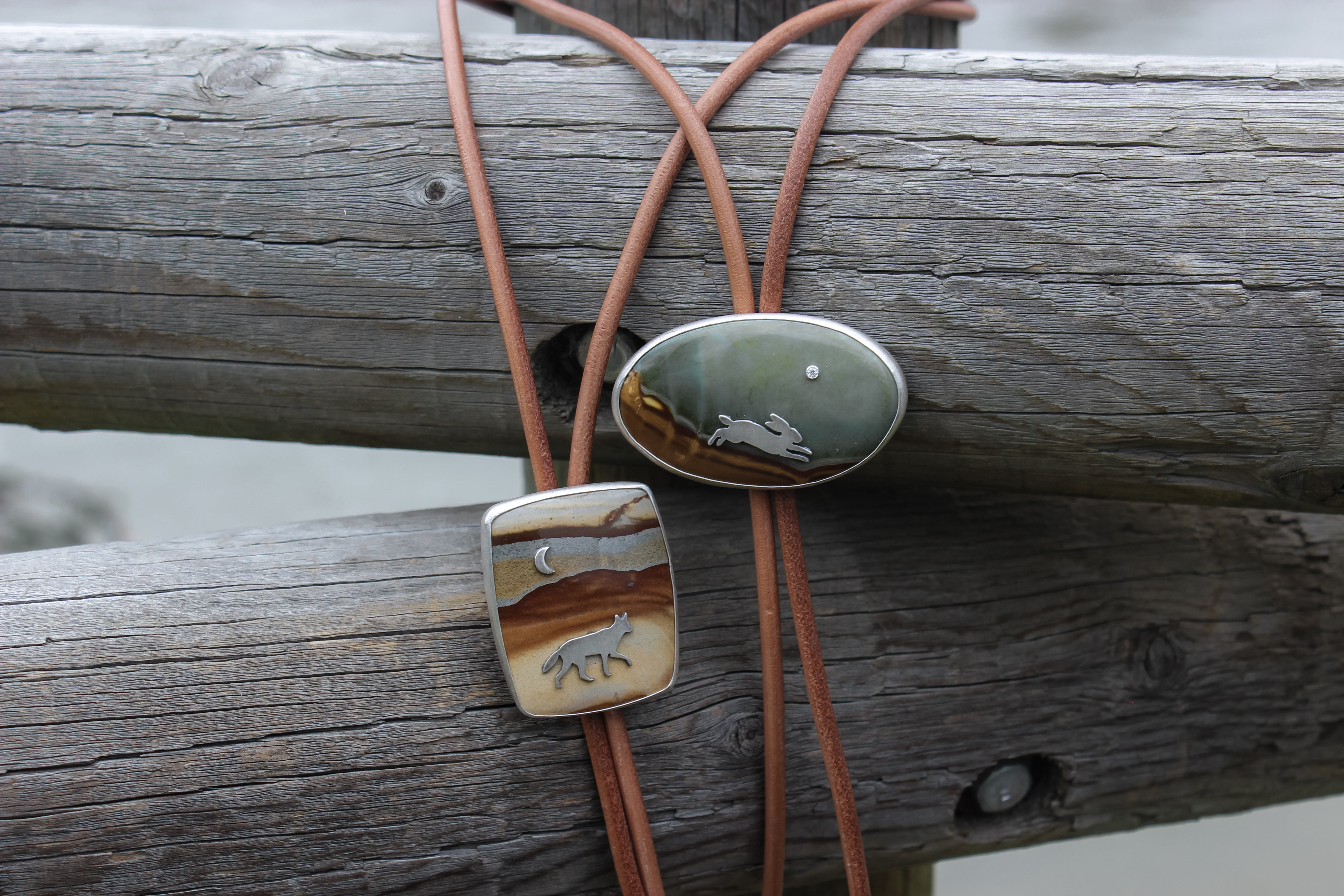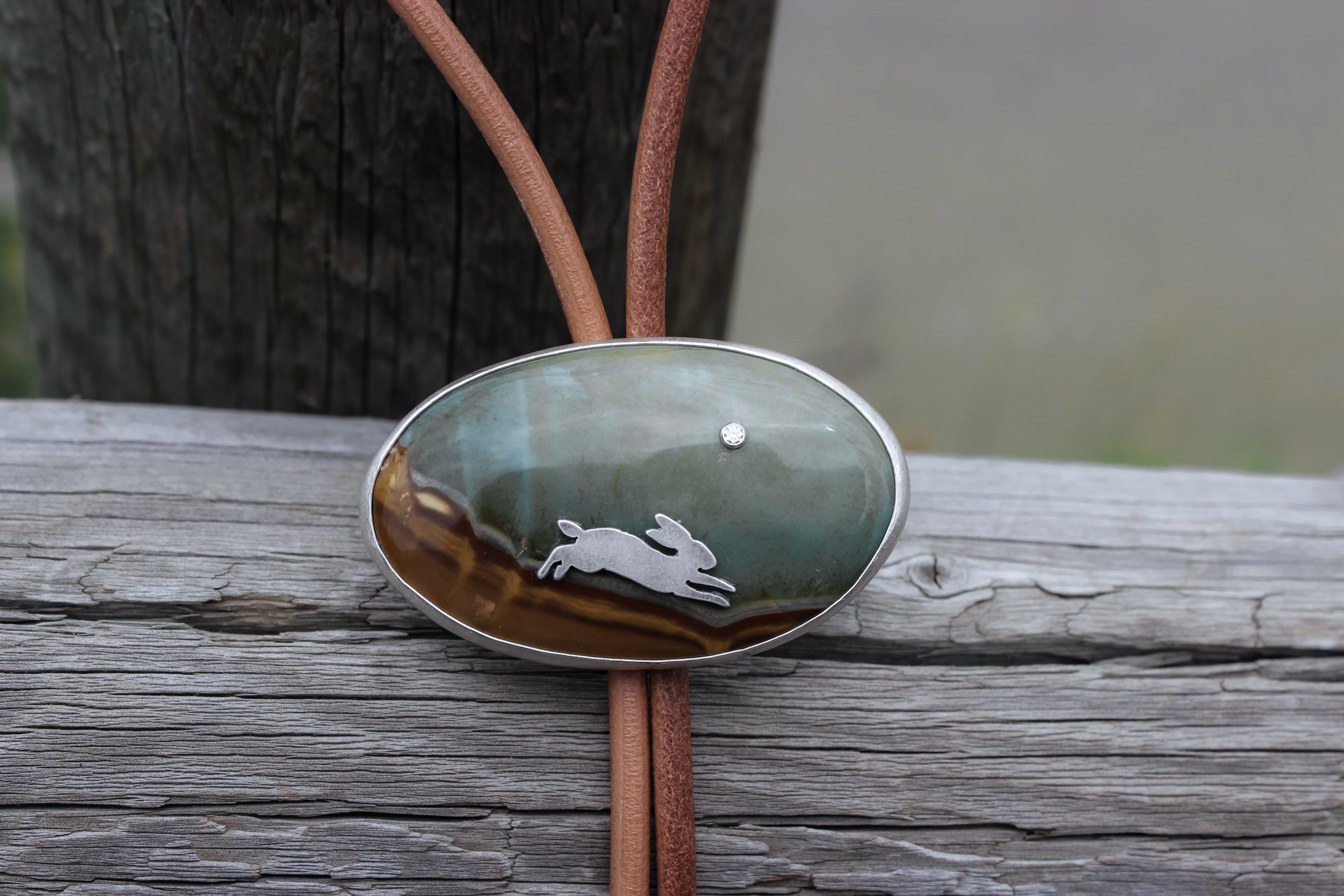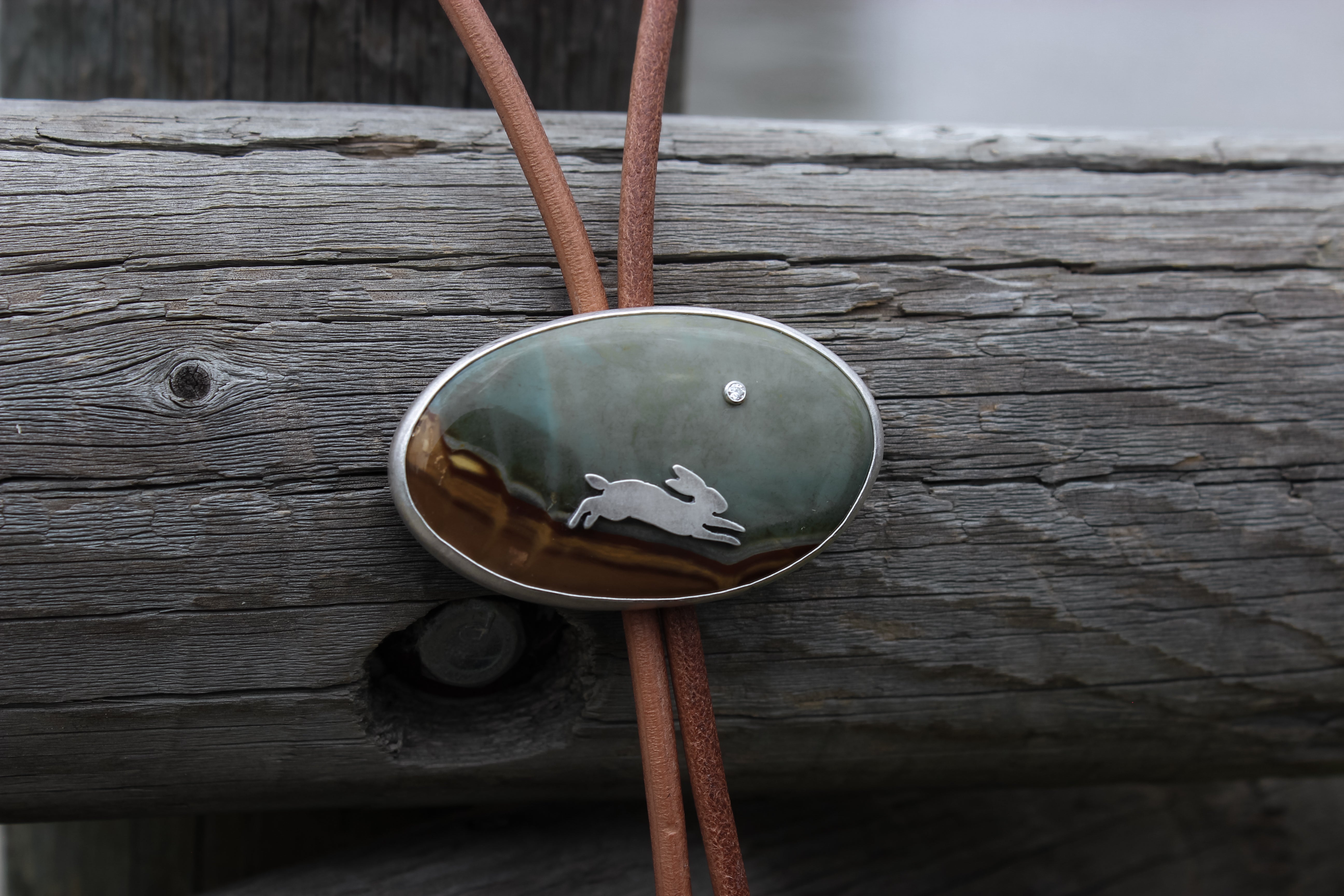 A rabbit hops along a dusty path headed for her burrow, the bright moon shining above as dusk sets in. The hazy sky suggests a cool night ahead, a fleeting crisp breeze tickling her nose. Perfect for adding a statement to your best rodeo outfits, this bolo is easy to dress up or down.