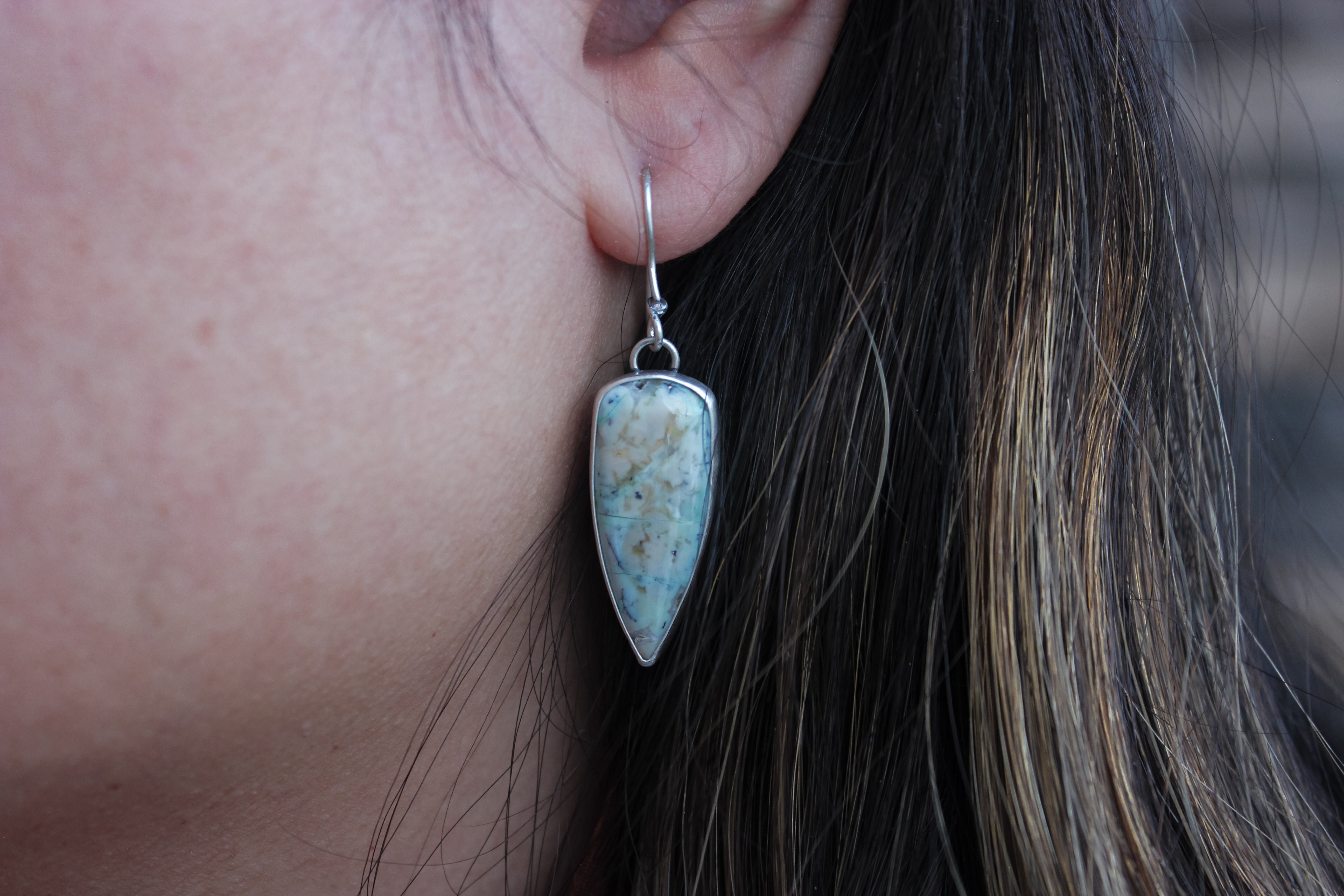 Minty, icy blue stones dangle like icicles from the rooftops, gentle spikes pointing to the earth . A scattering of stars adorns the backside of these dangles, a hint of interest to otherwise plain silver. Simple, lightweight and easy to wear everyday.