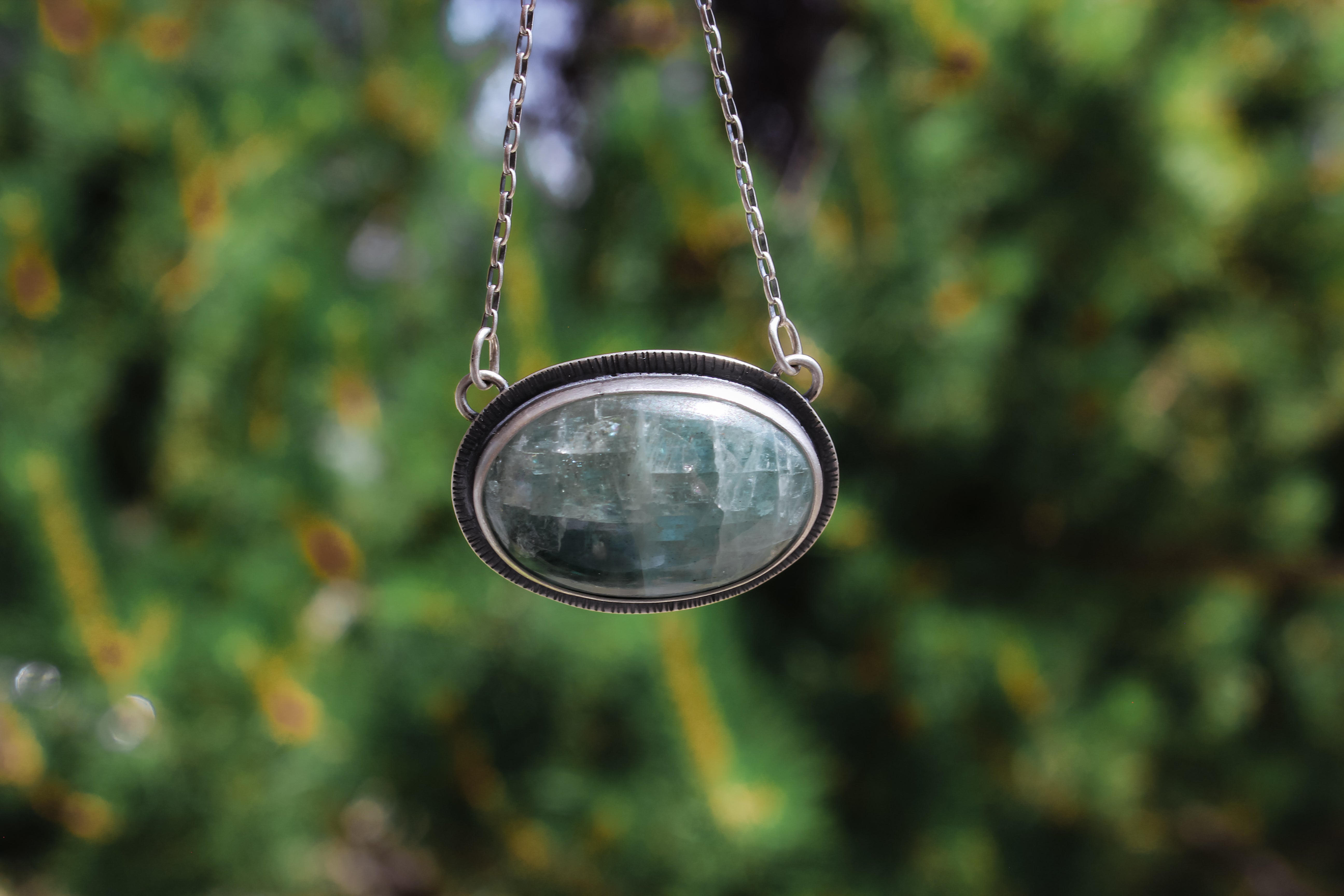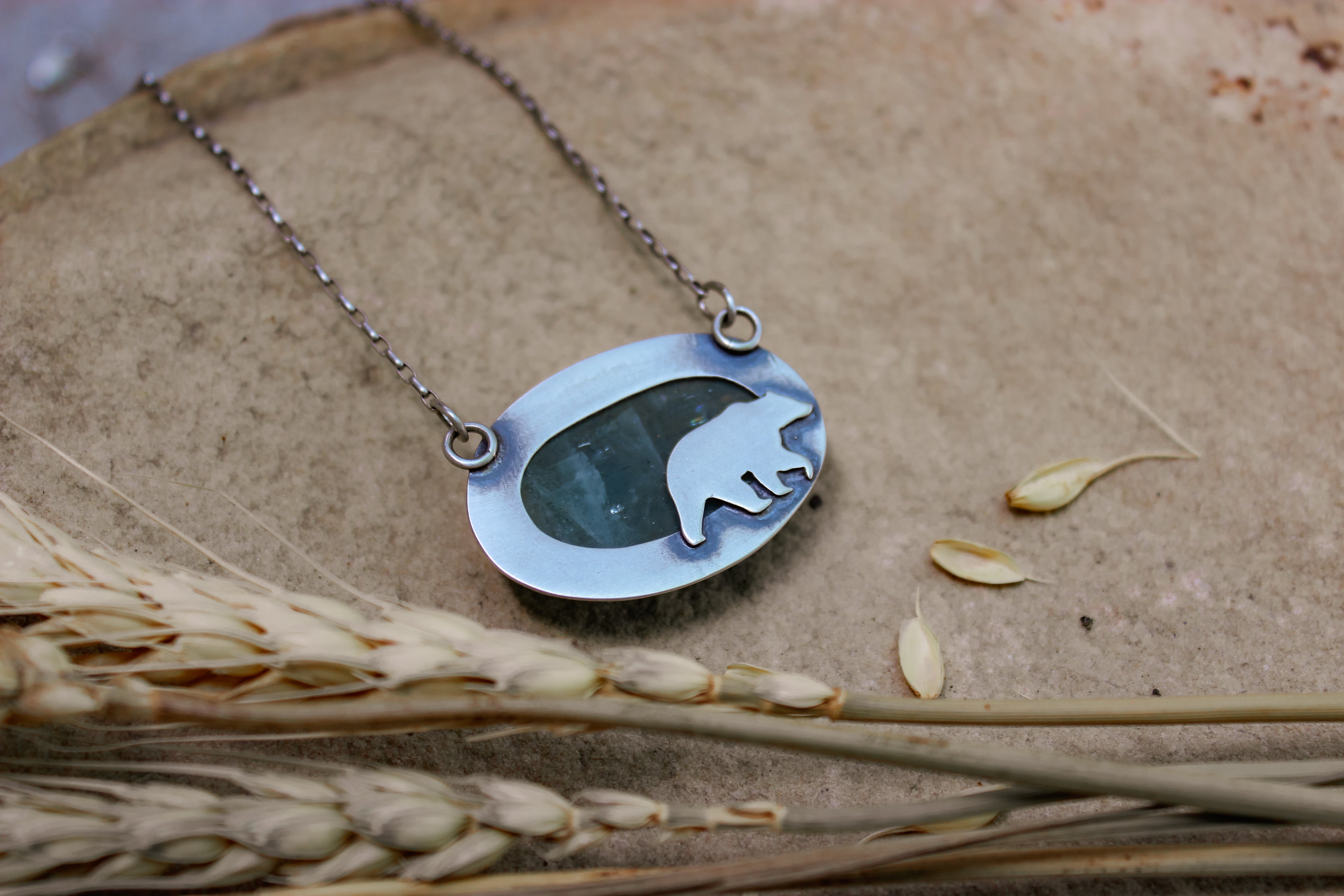 A deep, saturated aquamarine stone overflows its bezel cup, a pool of icy water filled with flecks of shimmering rainbows. This stone has many sides to it, it is a deep, dark mysterious color in dim light, and illuminates with a bright, icy blue in the sun. A very cool stone, set within a radiant sunburst setting, with a little bear on the backside who wanders among the glaciers.