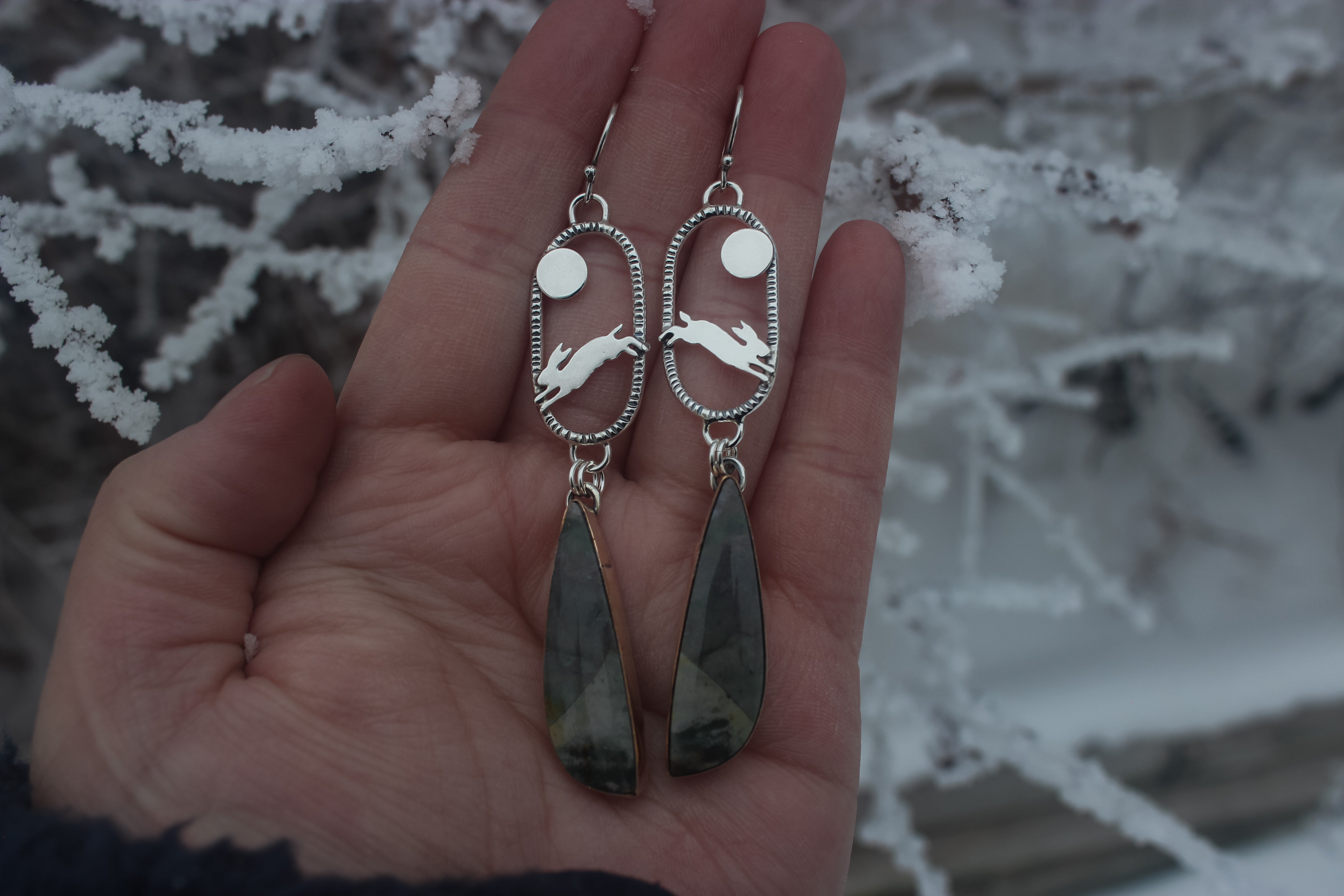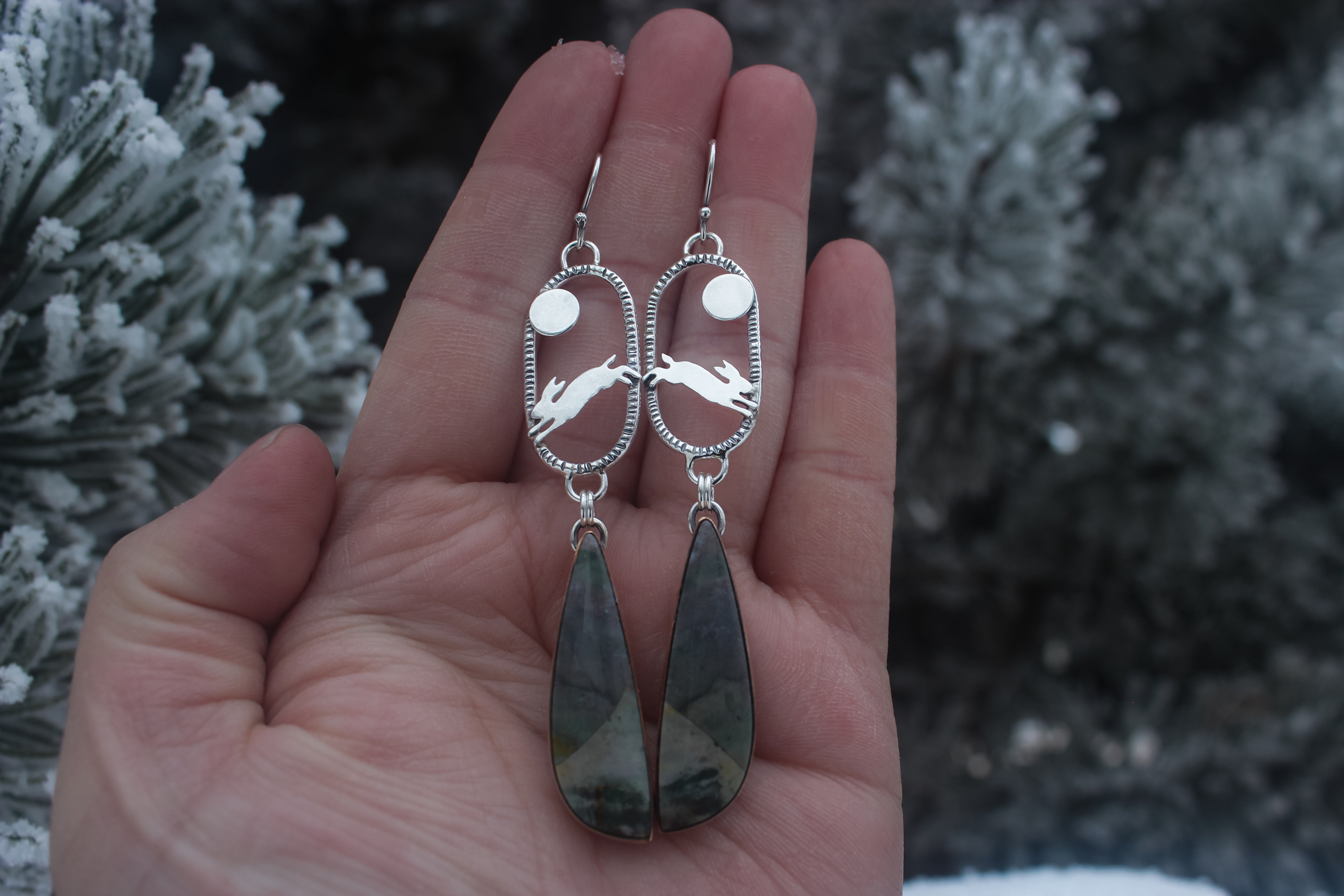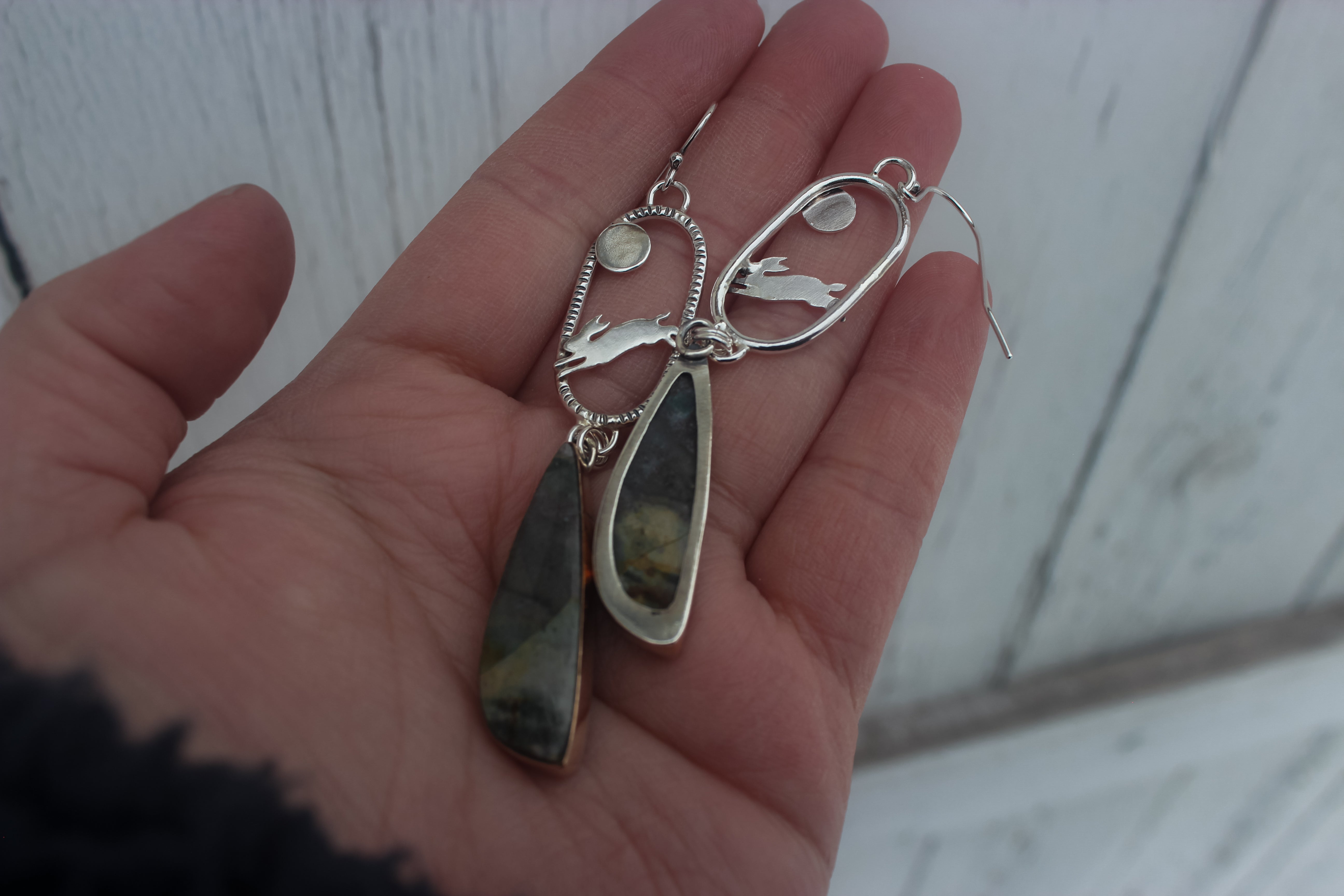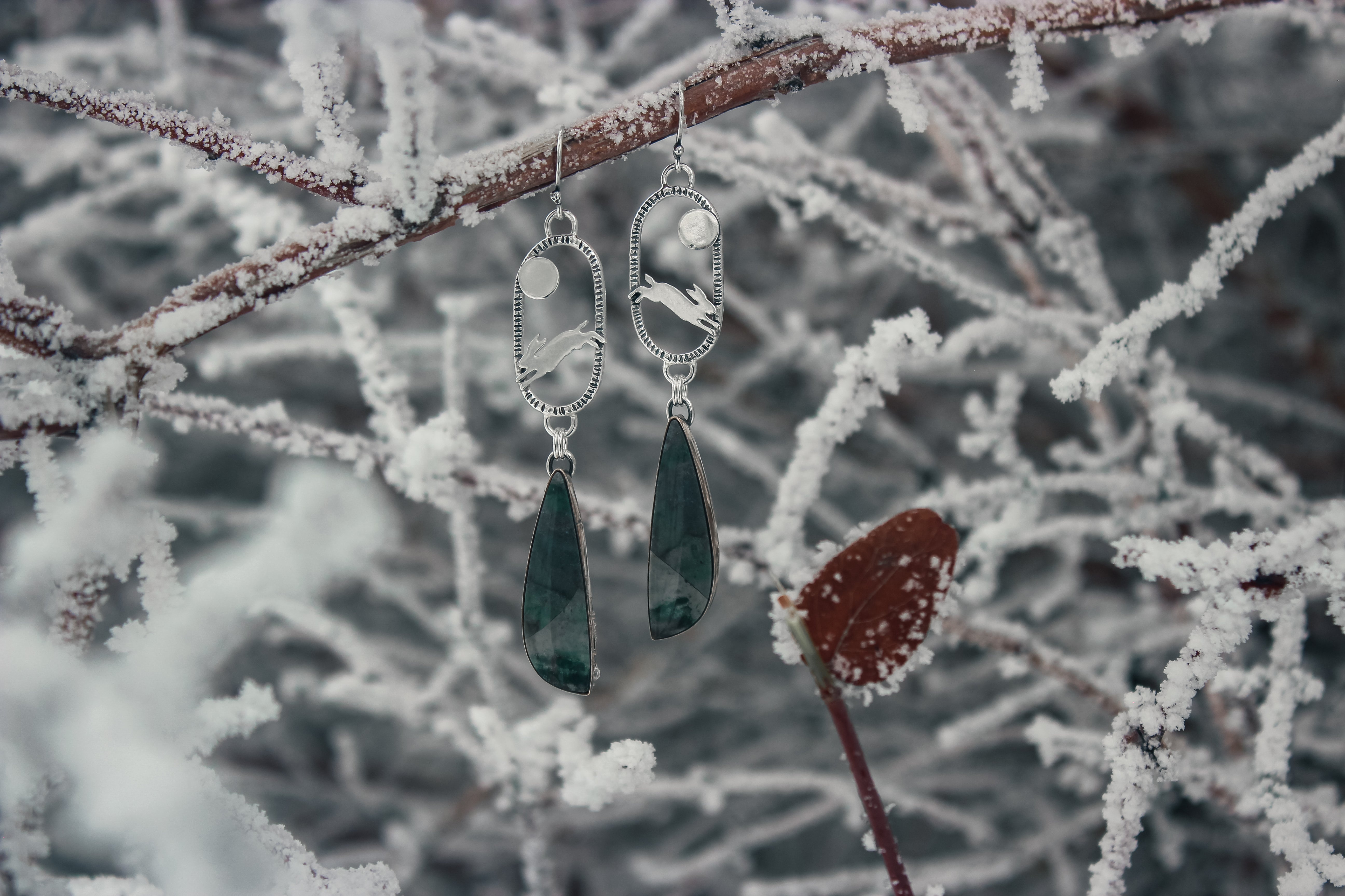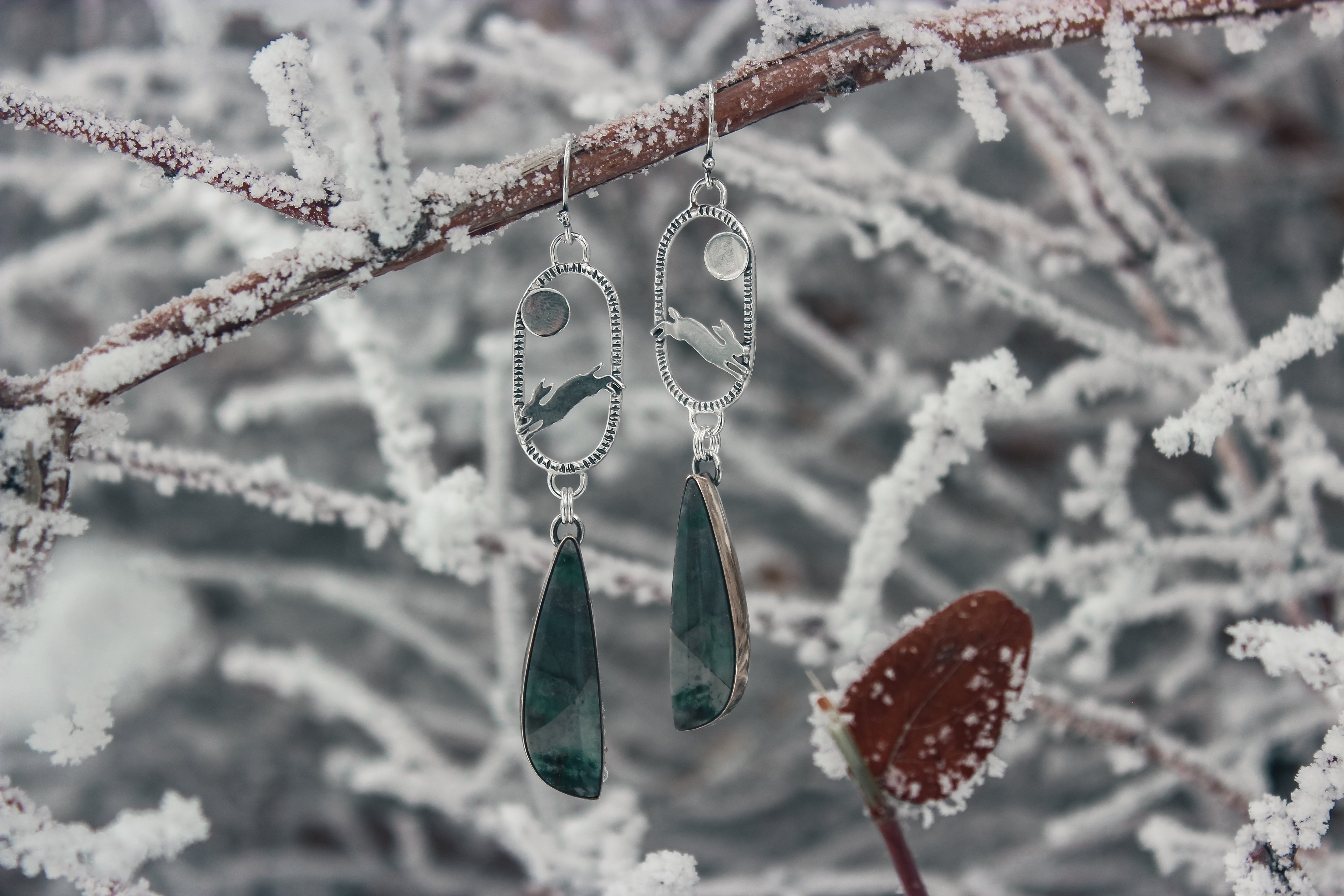 My latest purchase was a pair of earrings with silver rabbits leaping over dangling jasper stones. They are so cool, beautiful, and unique and could not have been made by anyone besides Emily! When I wear them ( and they have a nice “feel” to them ) I think of all the places those rabbits might go….