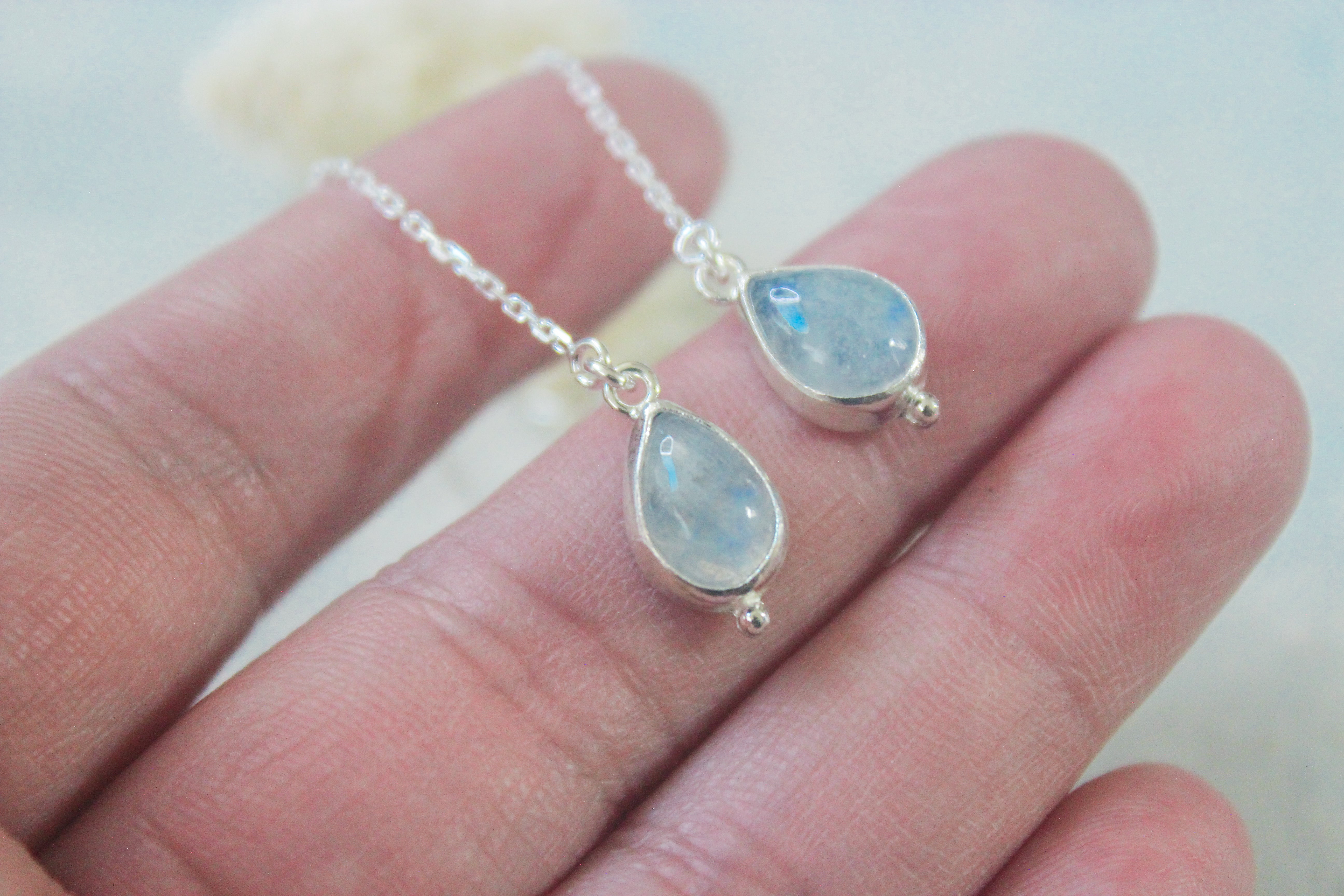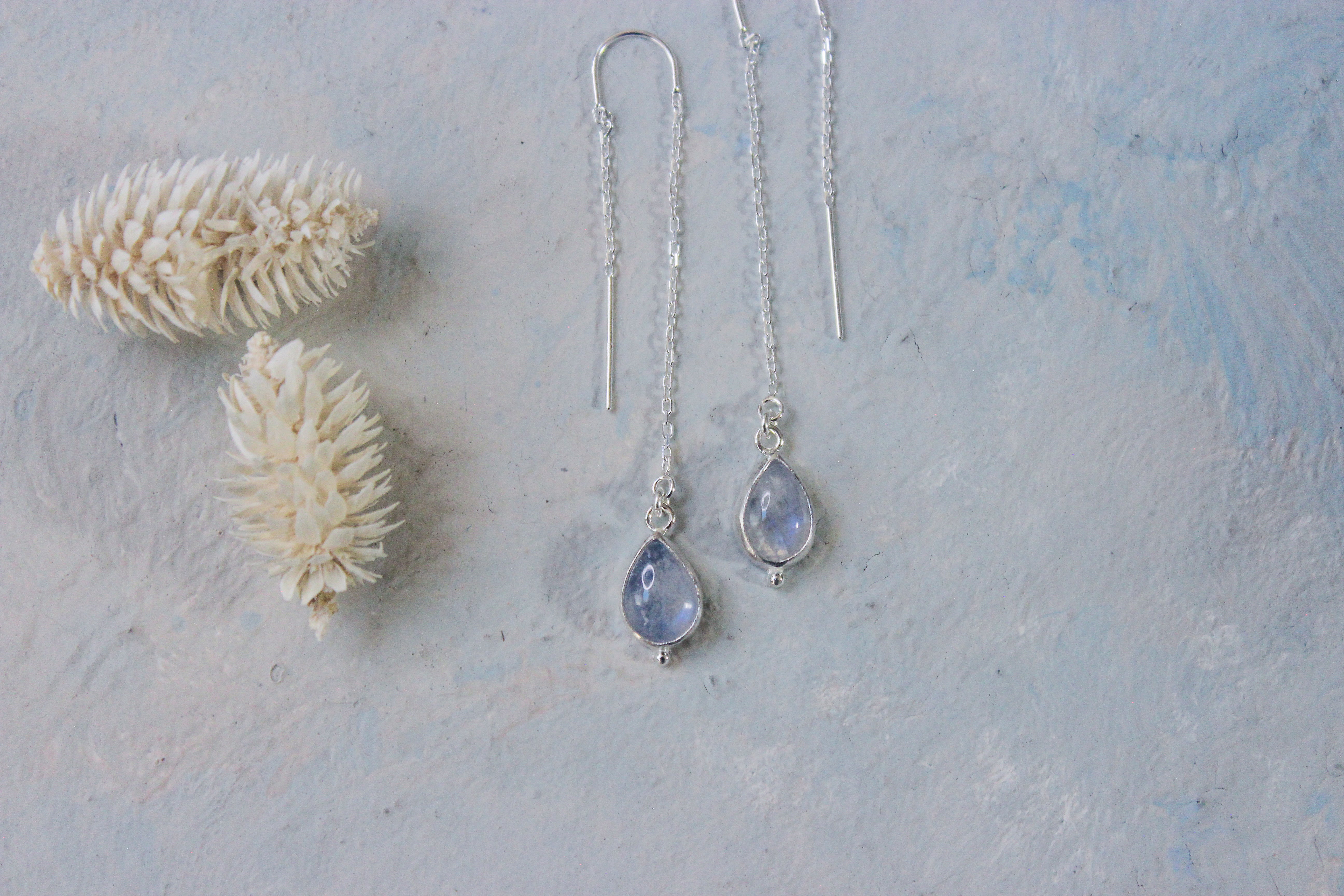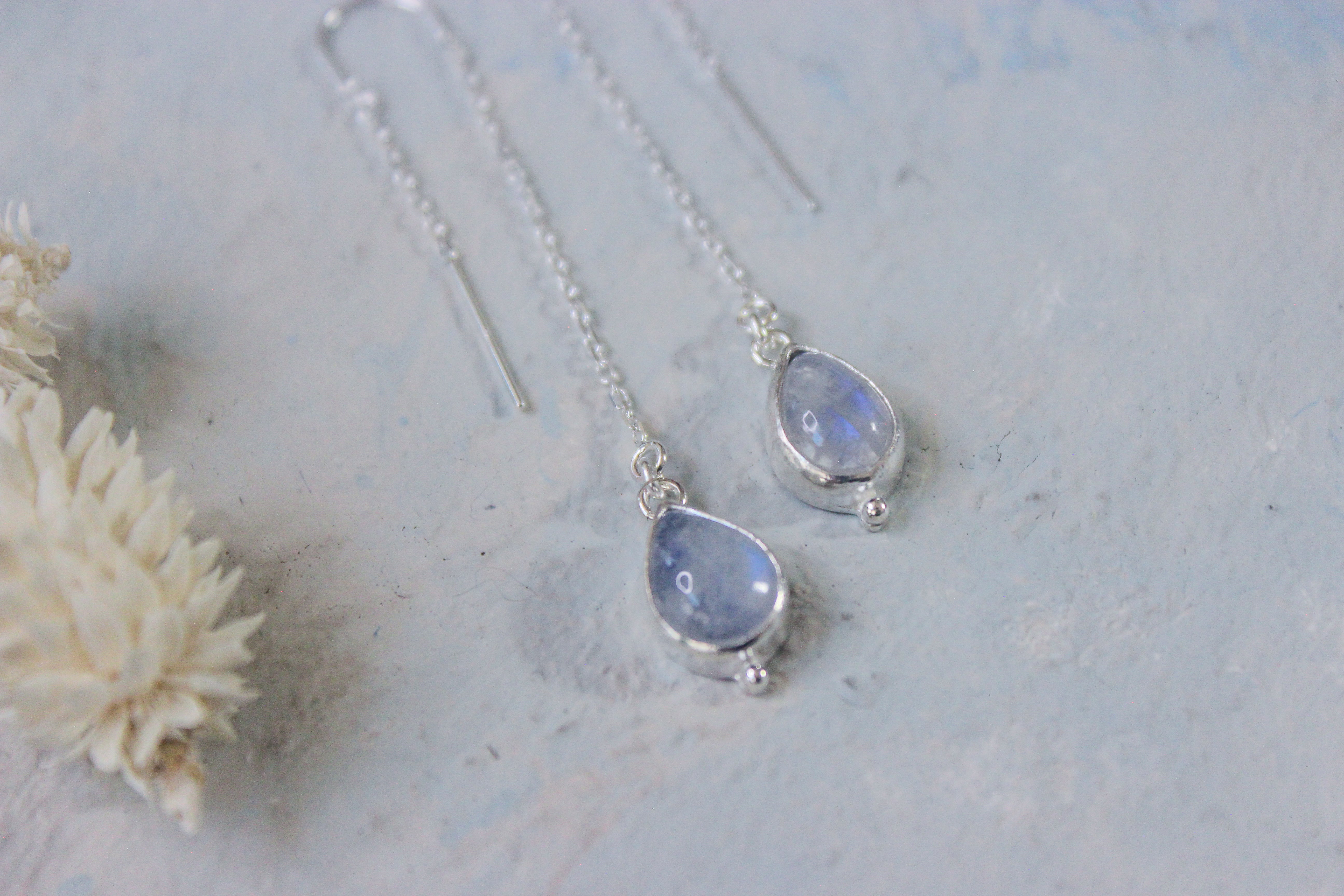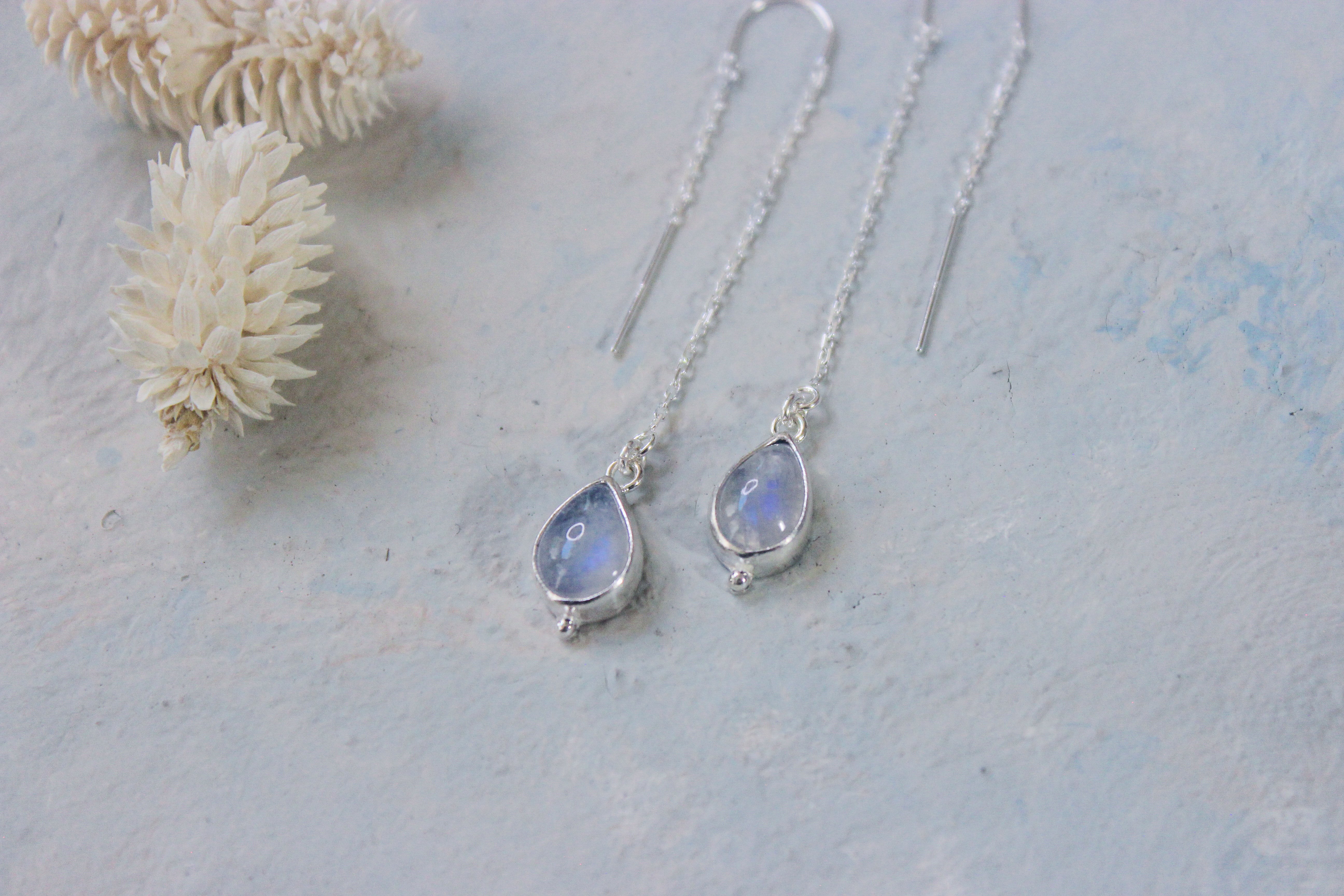Subtle blue flash moonstone catch the light perfectly as these threaders sway from your ears.
