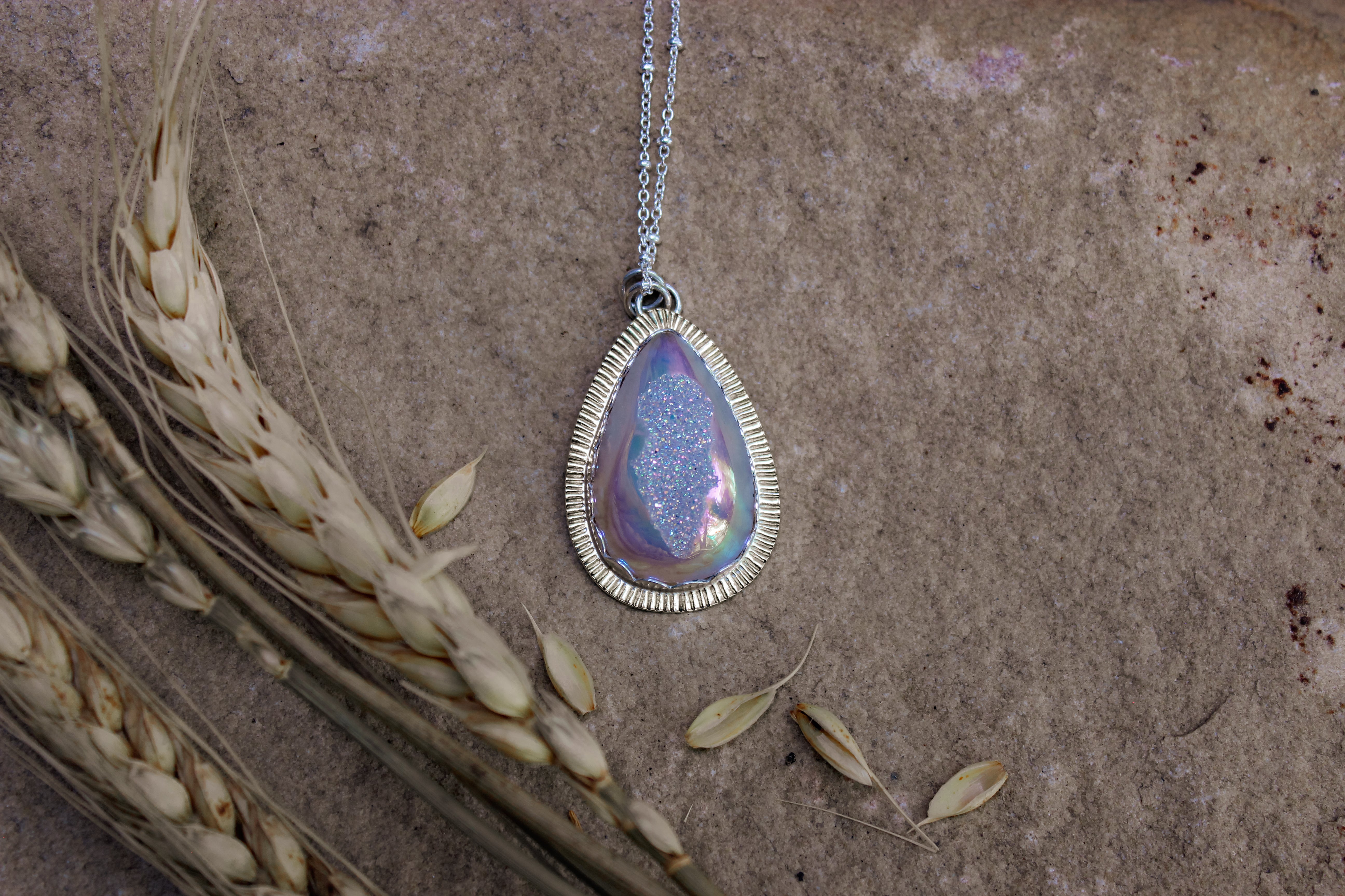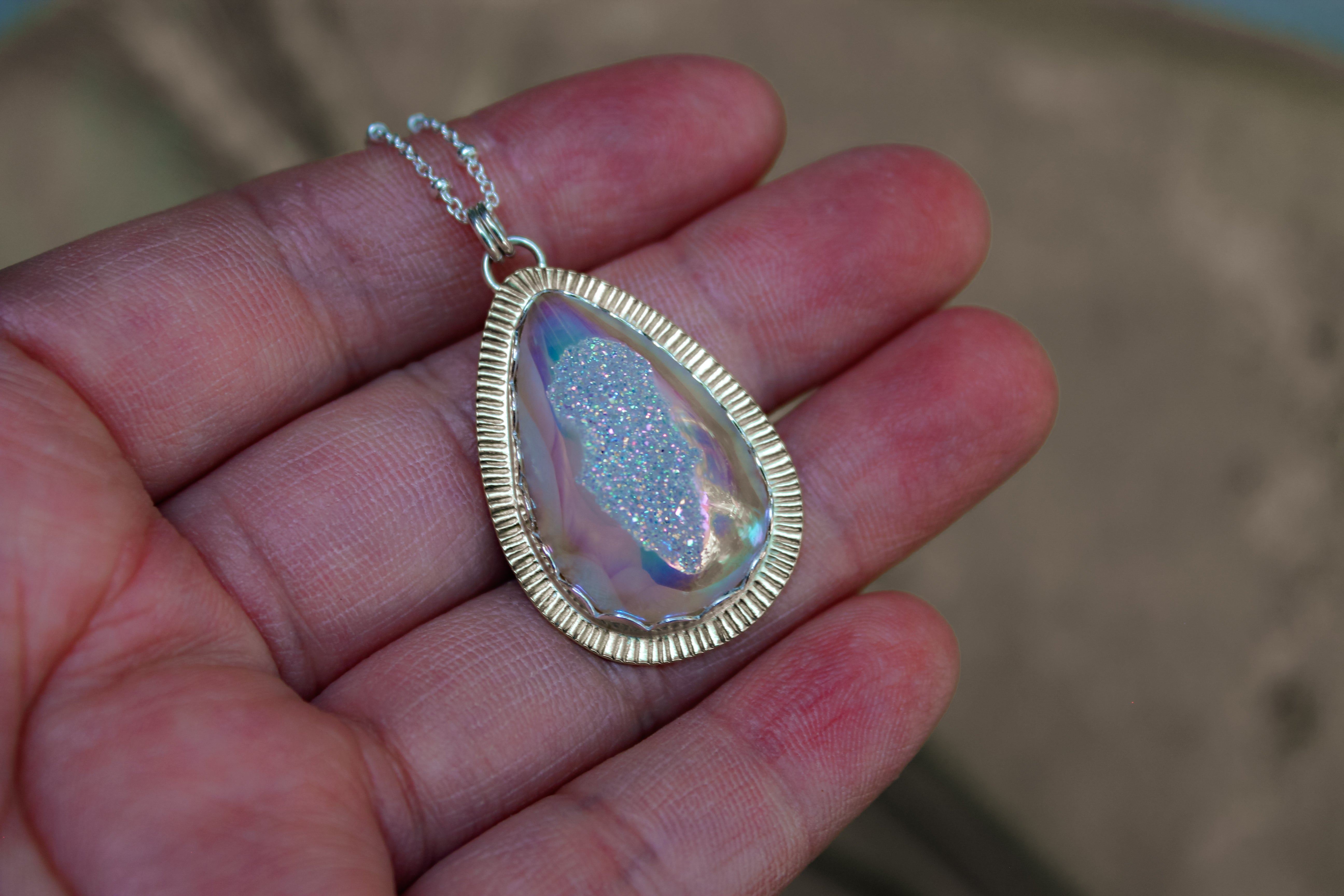 A stunning aura druzy agate has been set atop a radiant sunburst stamped backplate, shimmering from every angle like a scattering of stars across the sky. The stone reflects rainbows from every angle, catching the light even in the dark. A celestial stunner built for my moon goddesses.