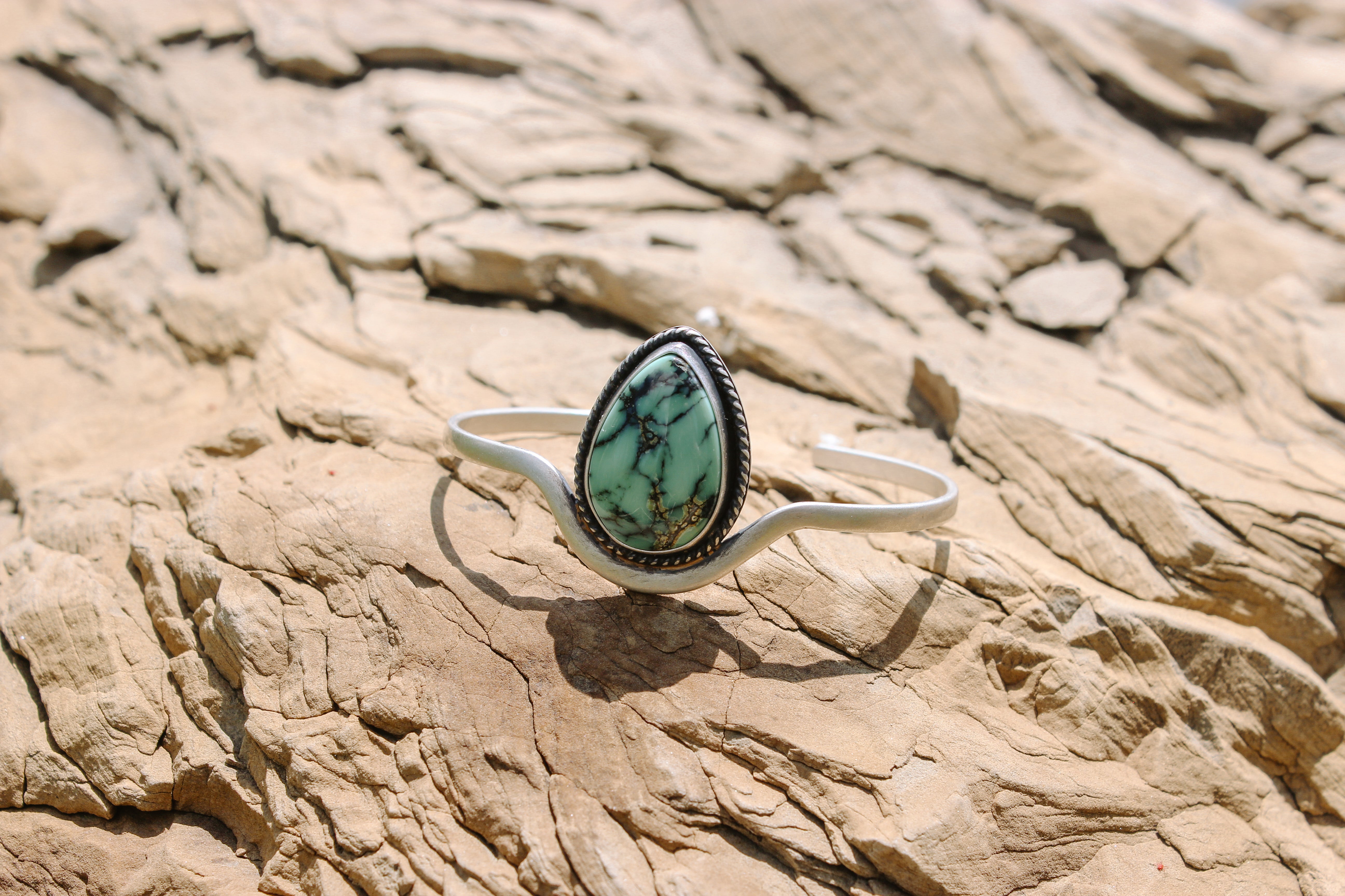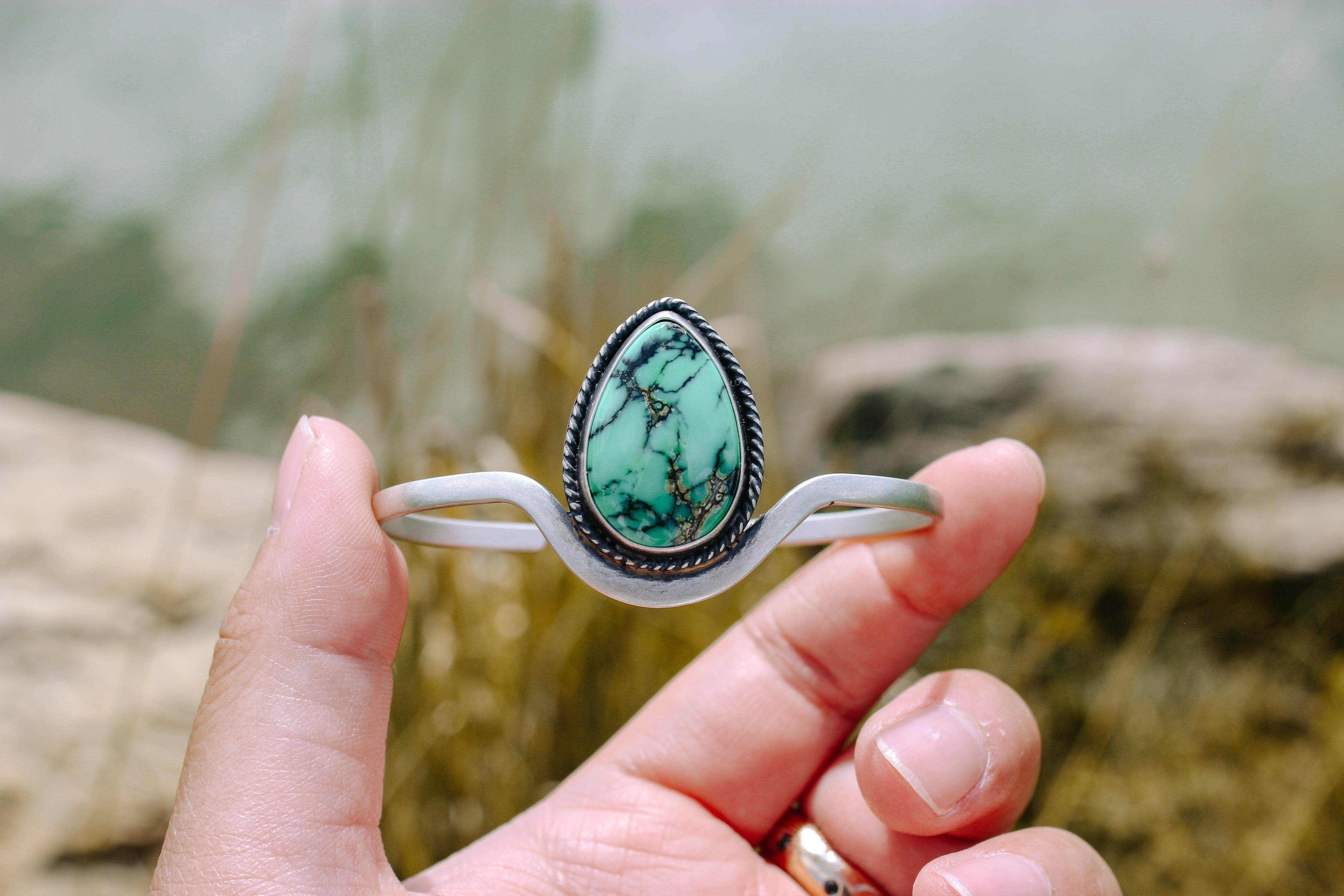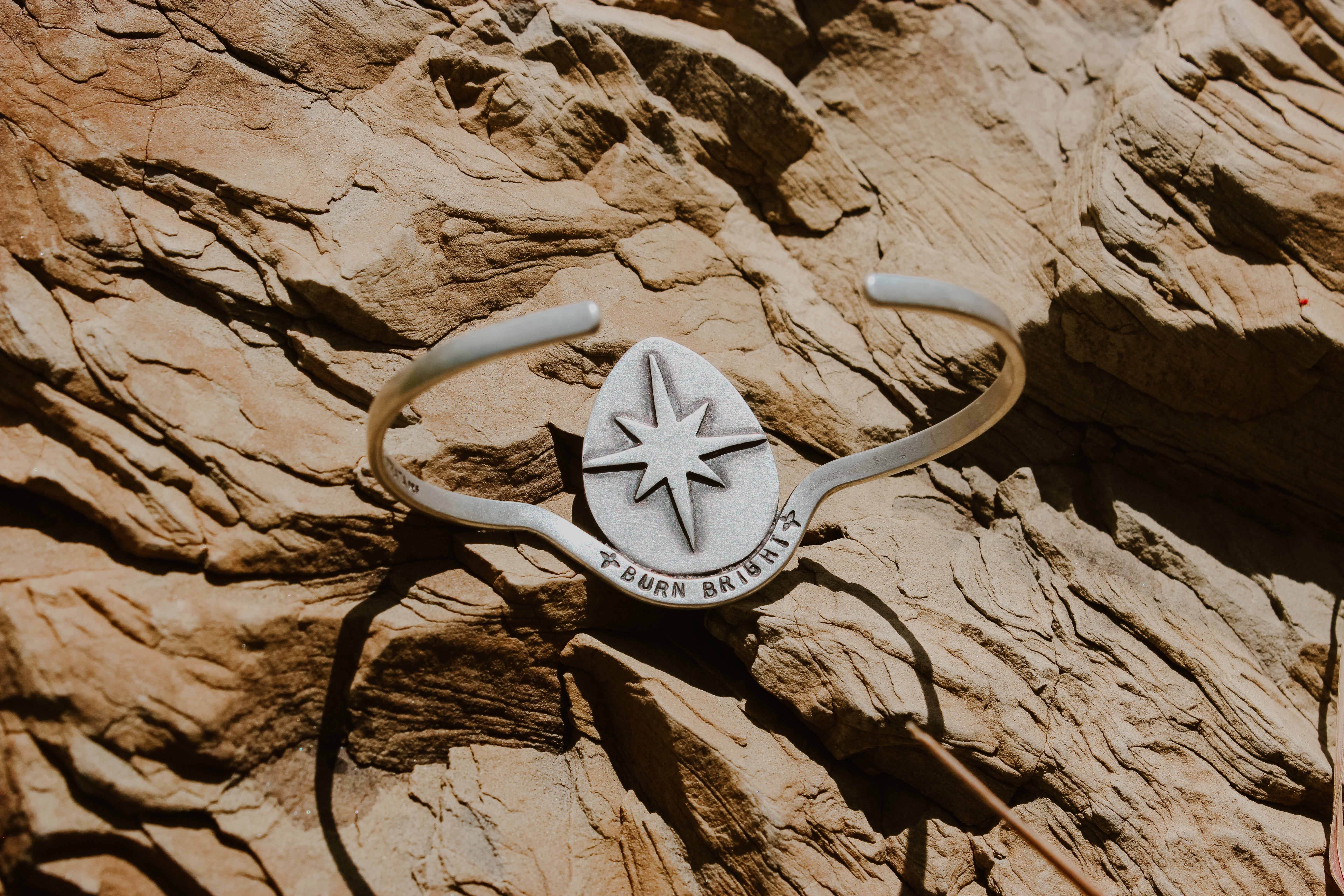 A reminder to shine bright in the dim light, to be the beacon of light in the darkest of times. A North Star sits on the backside of this minty variscite stone, the words "Burn Bright" stamped beneath. Simple, yet powerful, this cuff holds a message we all need to carry as we navigate our life paths.