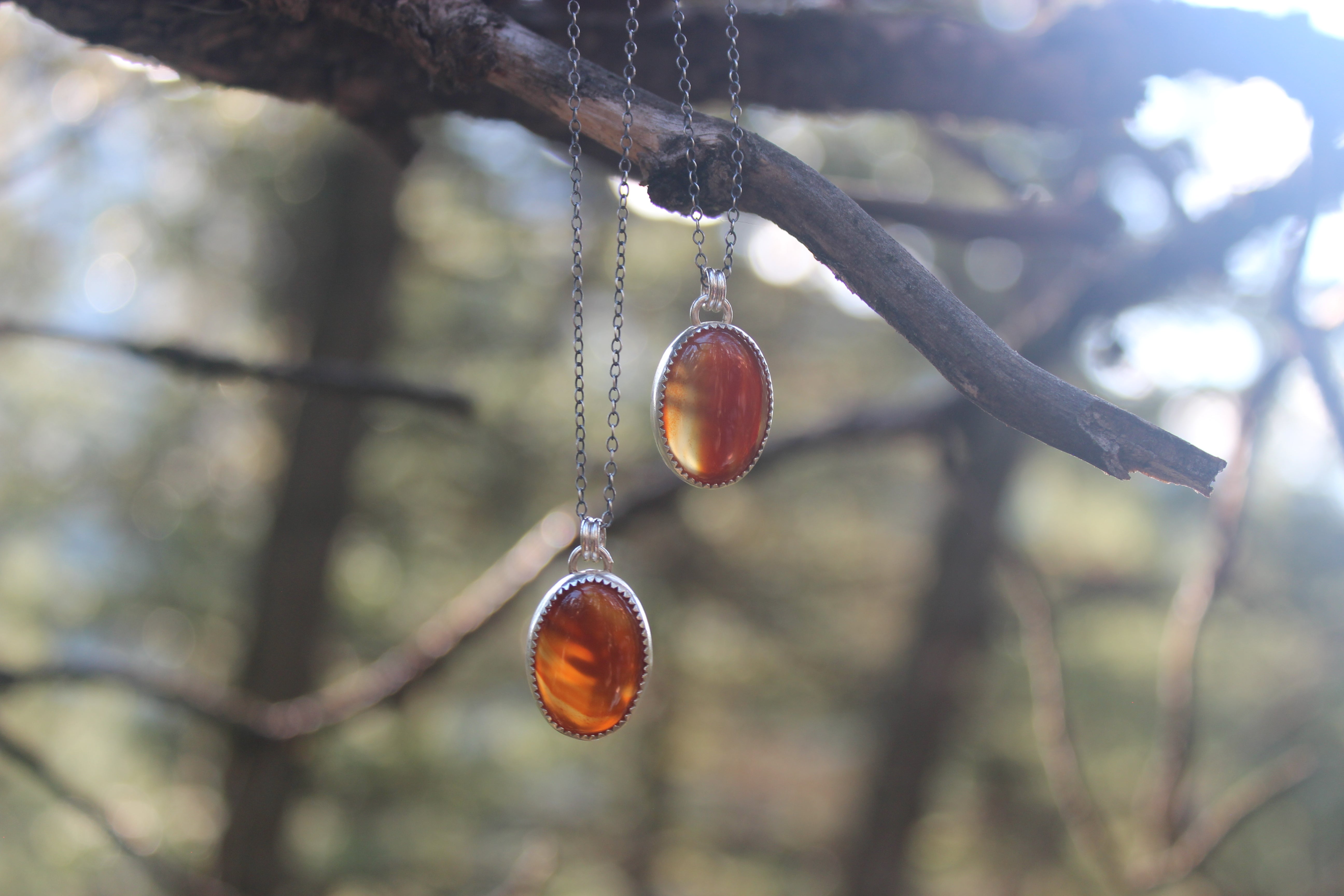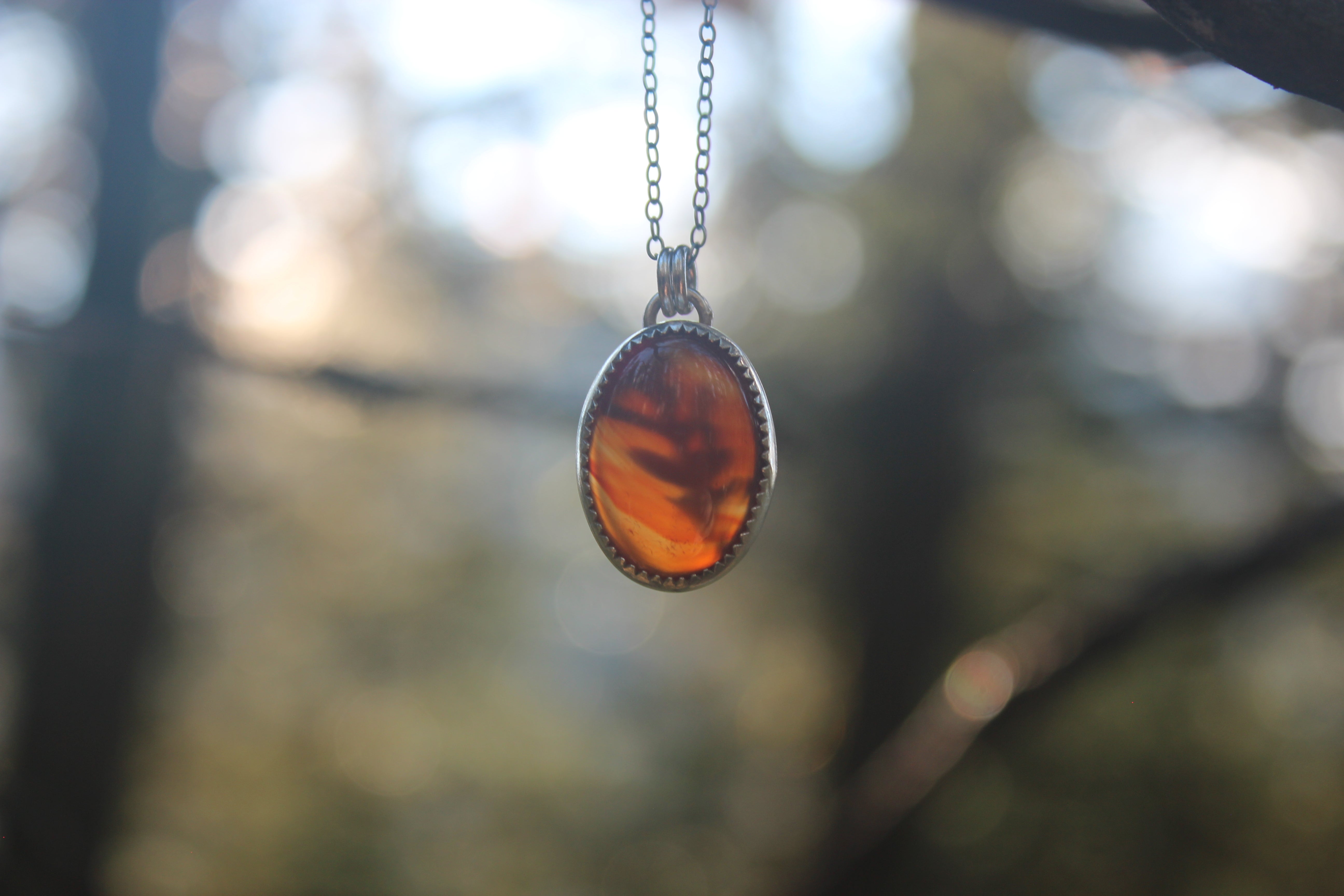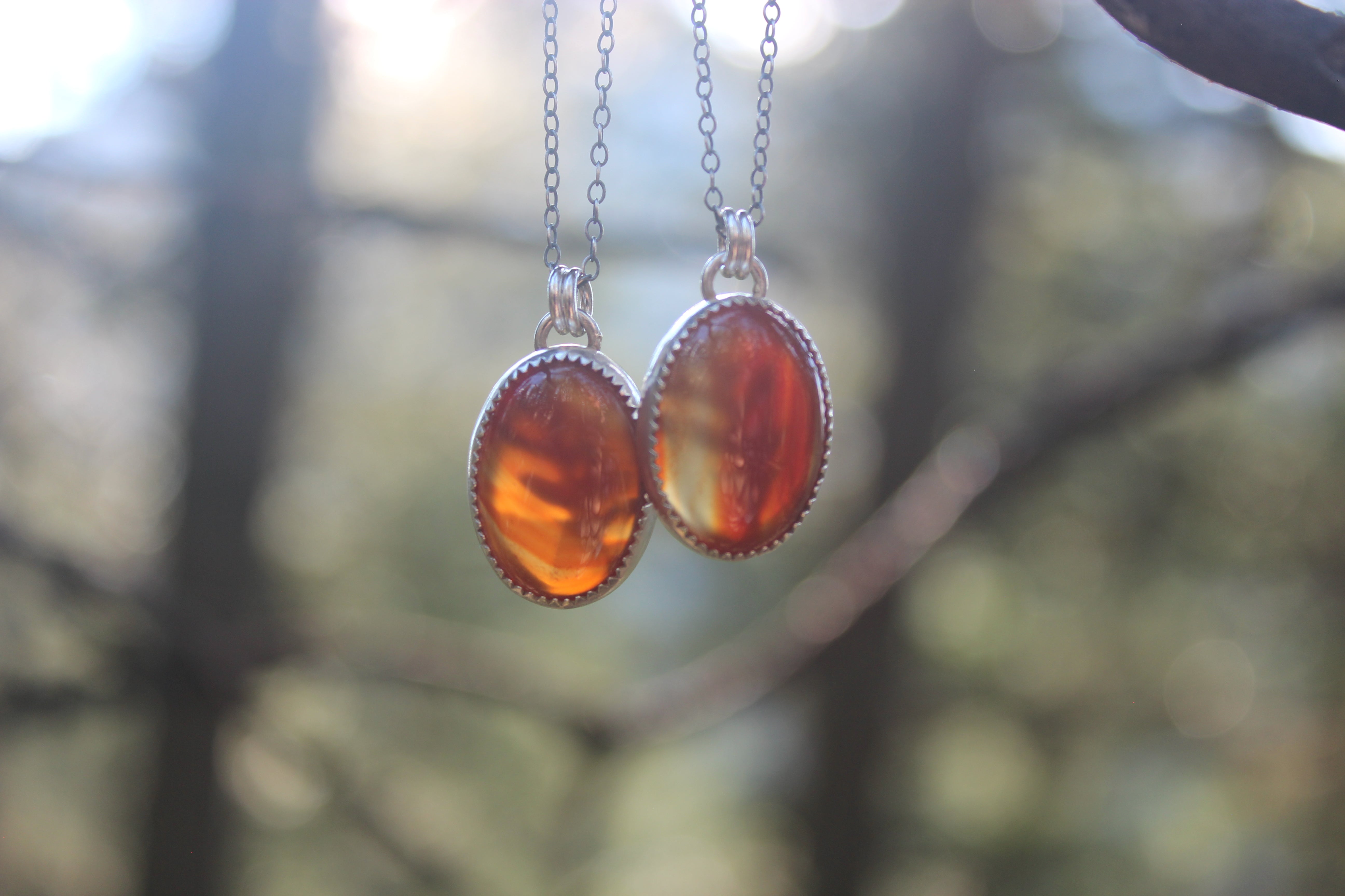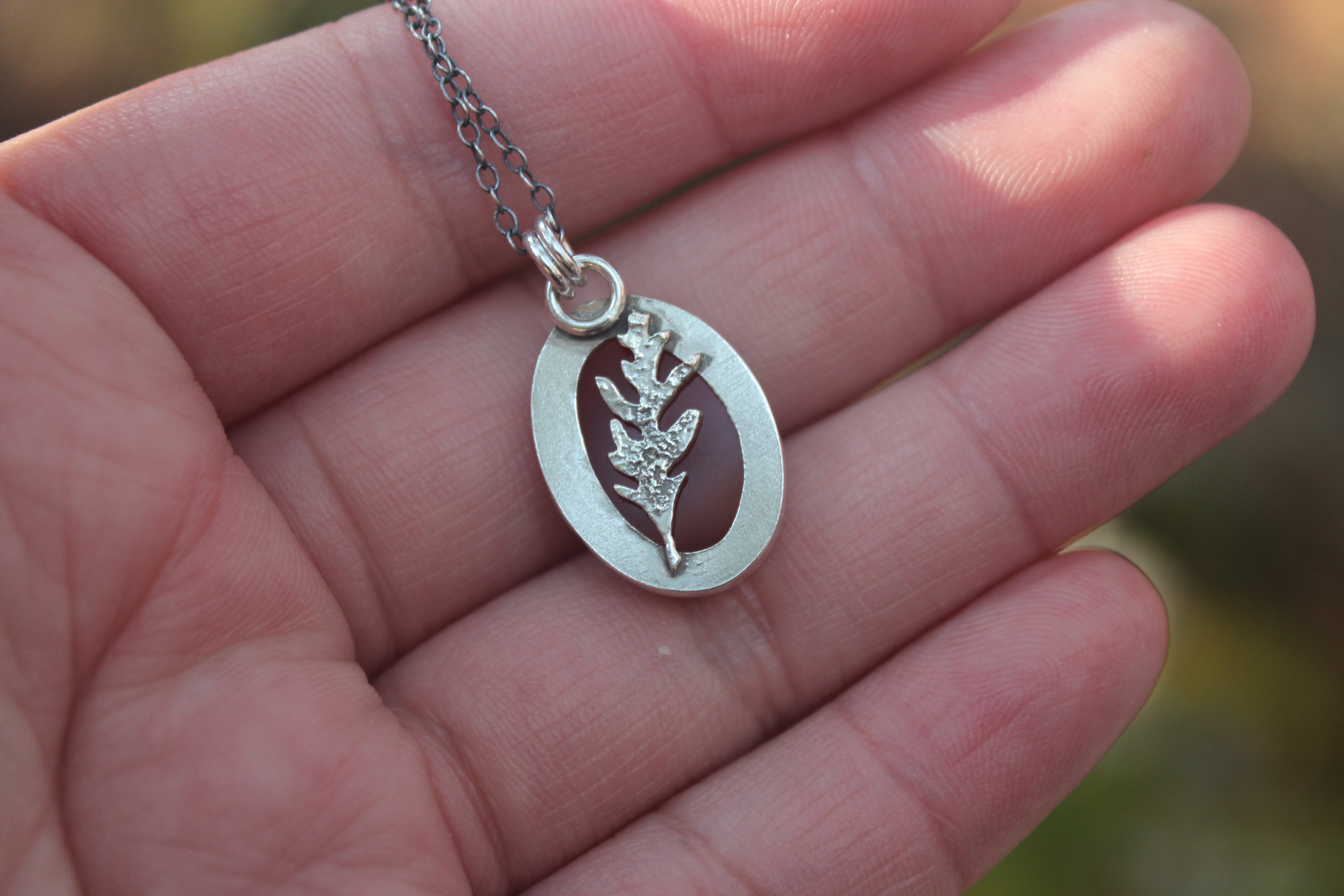 This adorable little pendant lets the stone shine! These stones GLOW with color, they are beautifully transparent and gemmy, with a little hint of the oak leaf peeking through from the back. On the back of the piece, a silver dusted oak leaf lays flat, and will illuminate beautifully in the sun. A sawtooth edge bezel cradles the stone, and a slight bit of patina brings out all the details.