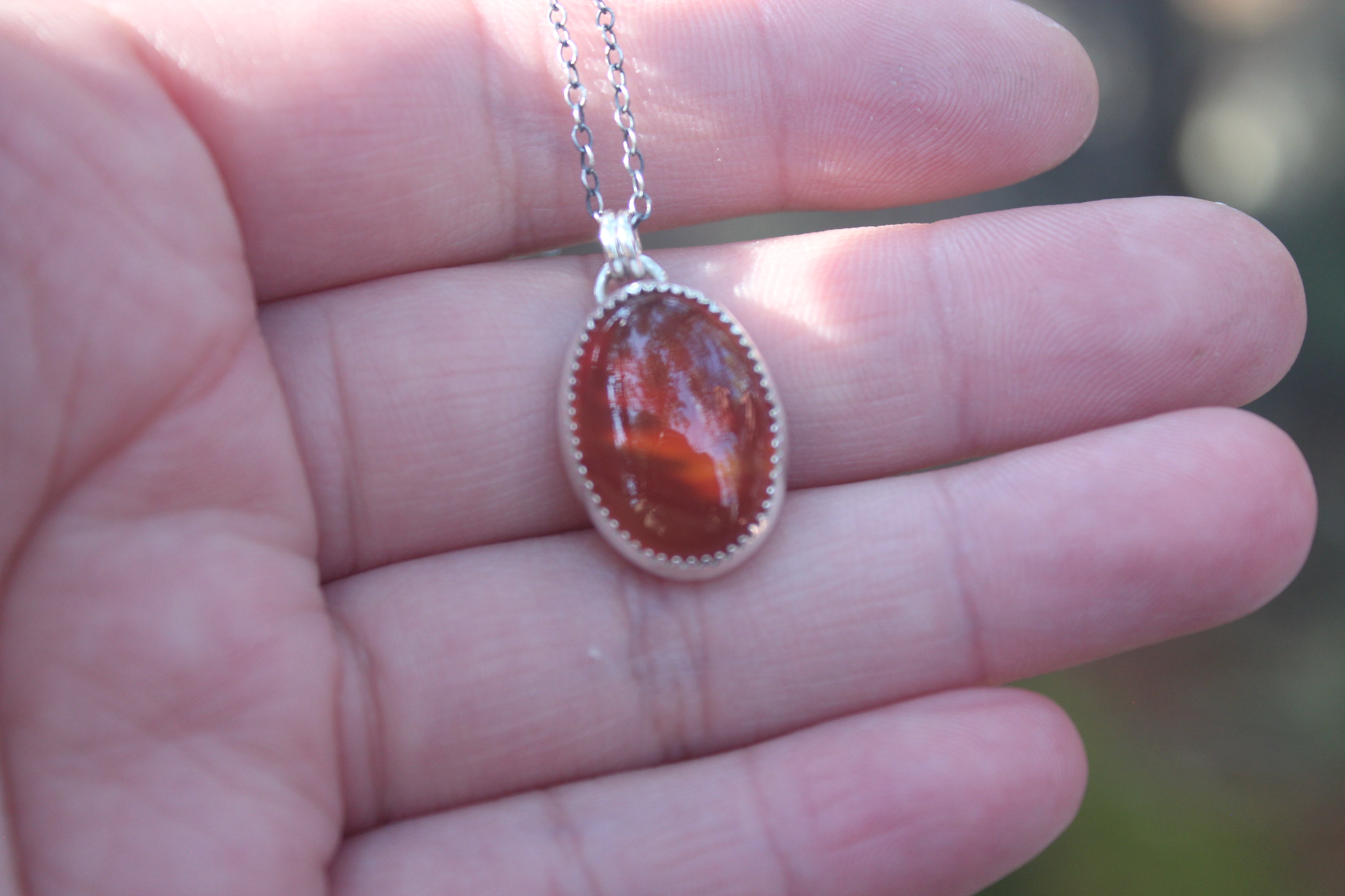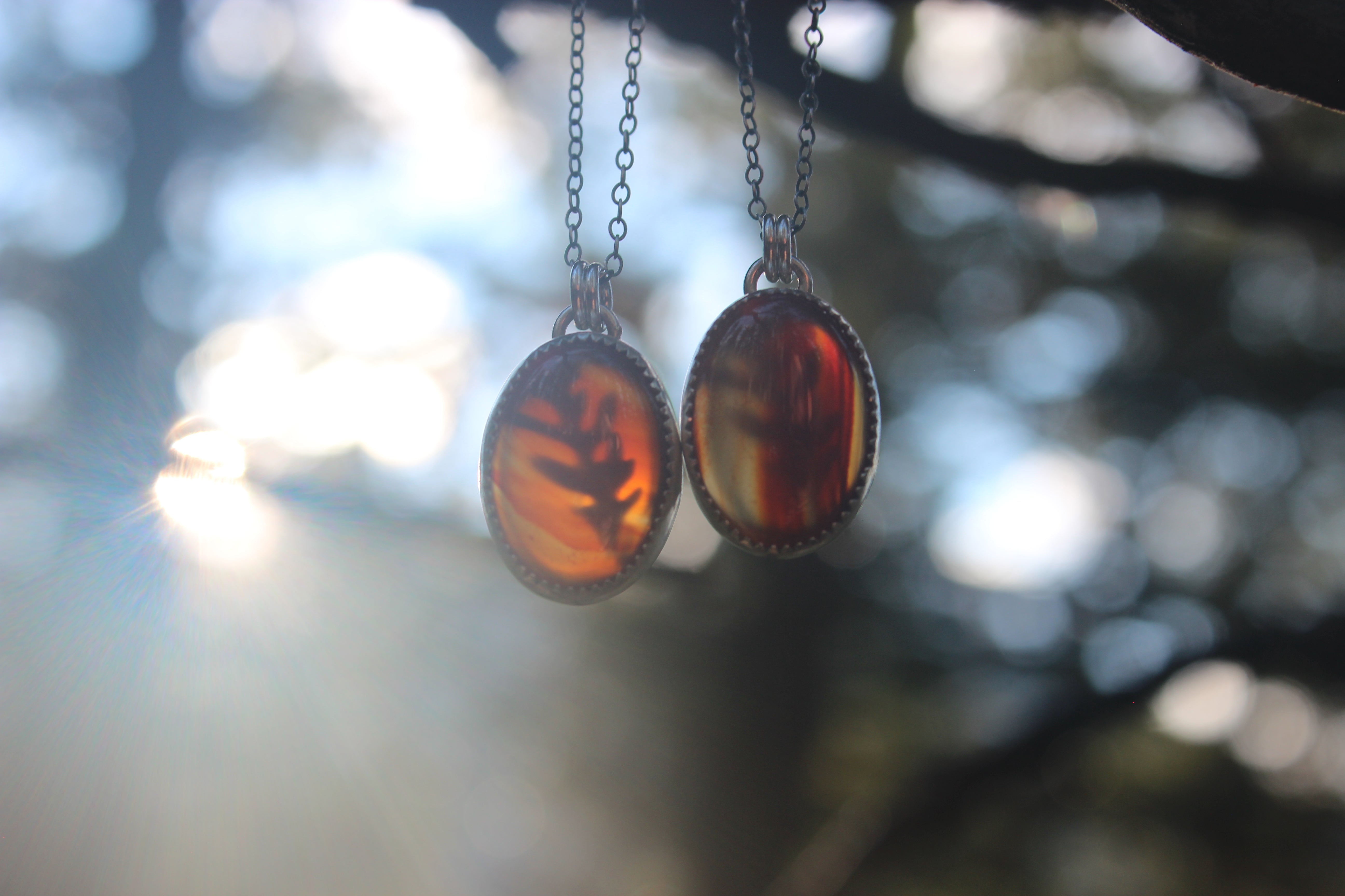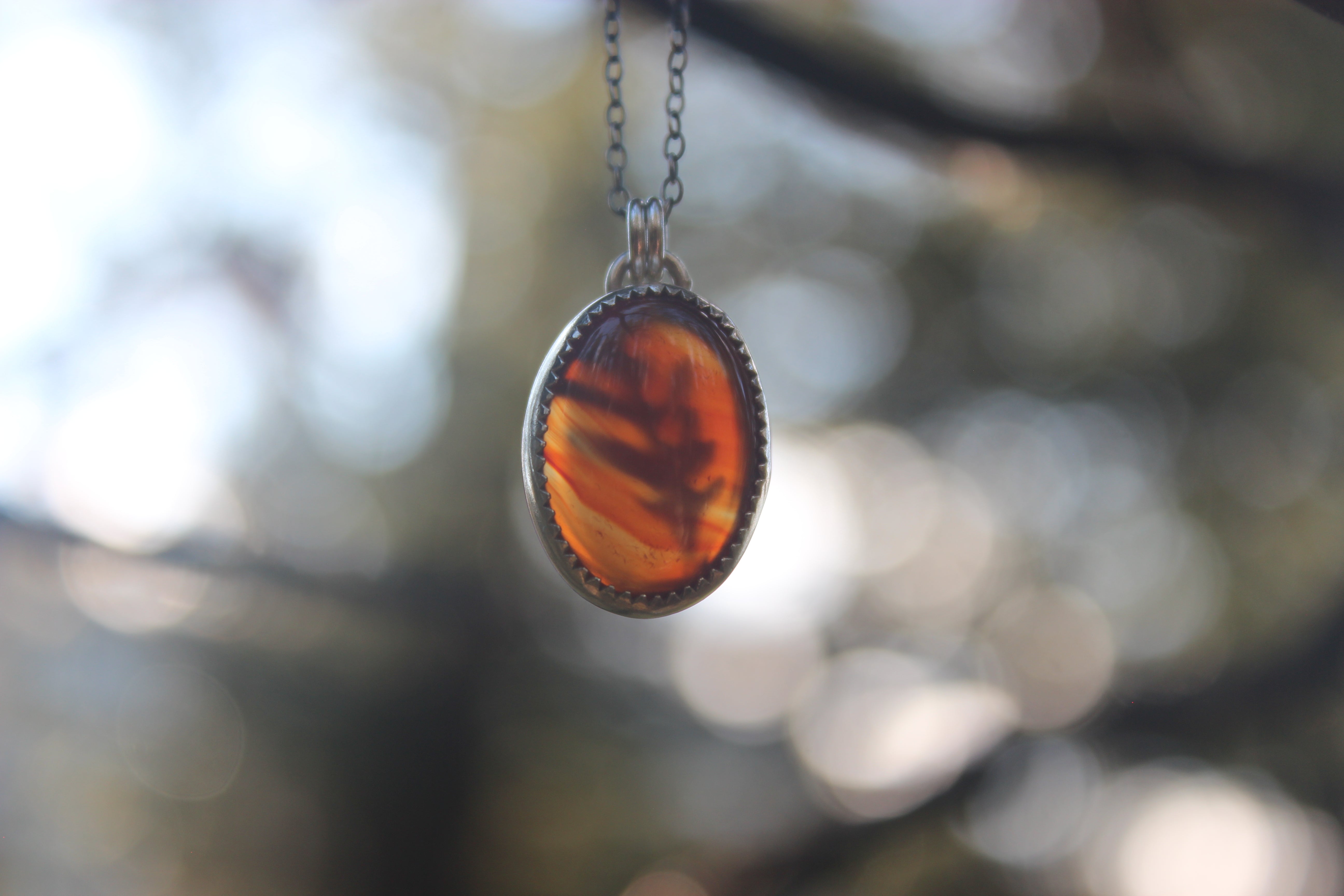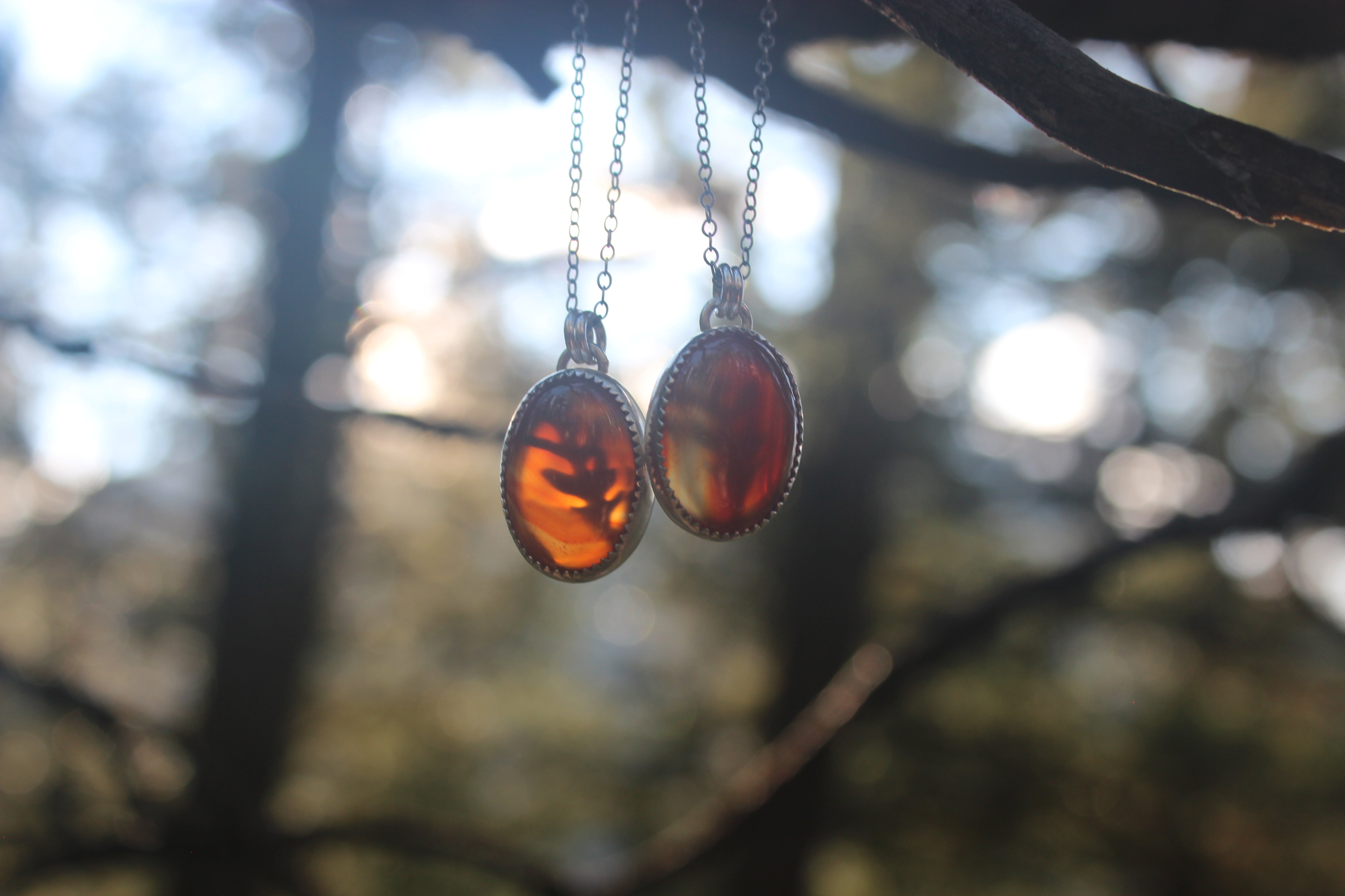 This adorable little pendant lets the stone shine! These stones GLOW with color, they are beautifully transparent and gemmy, with a little hint of the oak leaf peeking through from the back. On the back of the piece, a silver dusted oak leaf lays flat, and will illuminate beautifully in the sun. A sawtooth edge bezel cradles the stone, and a slight bit of patina brings out all the details.