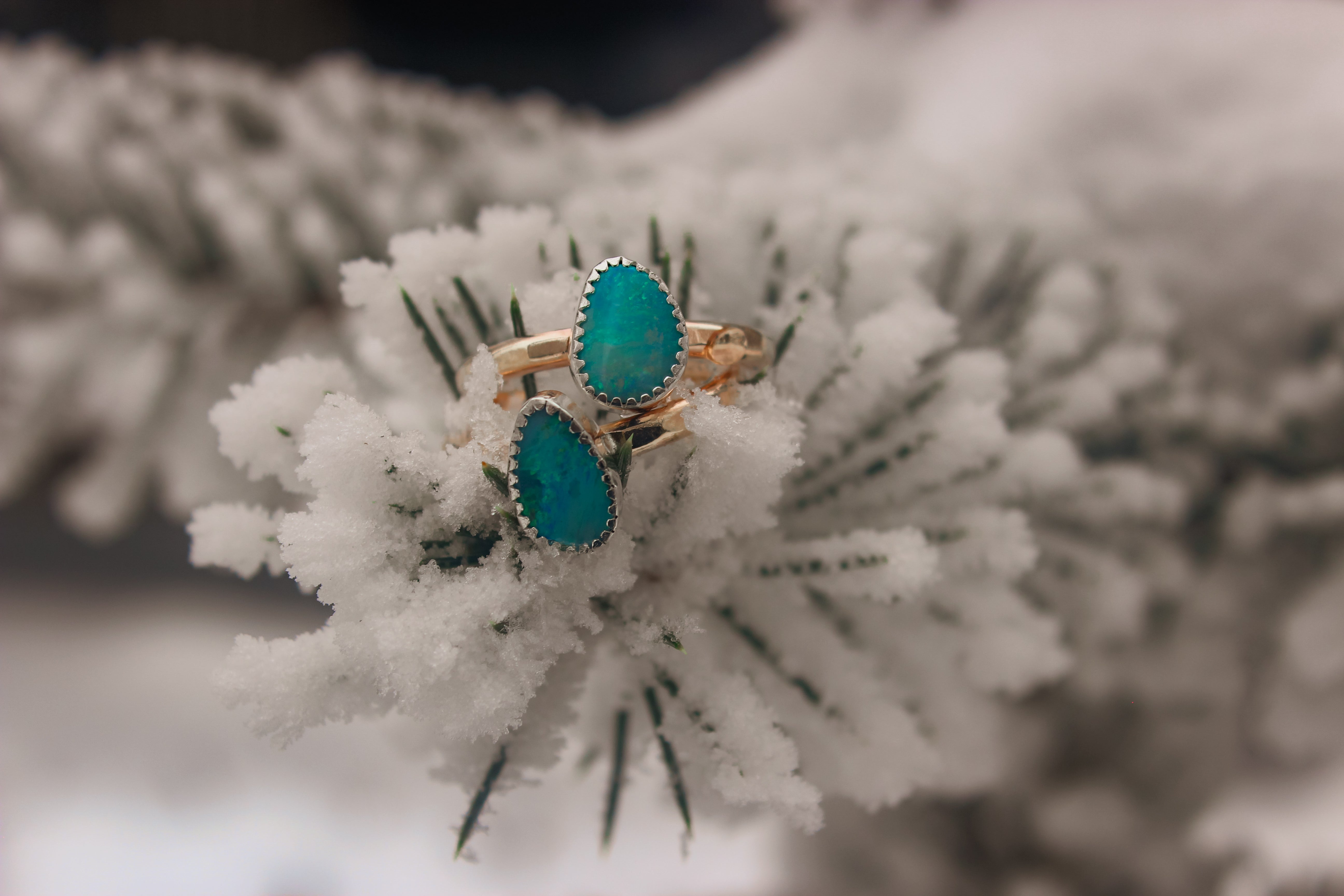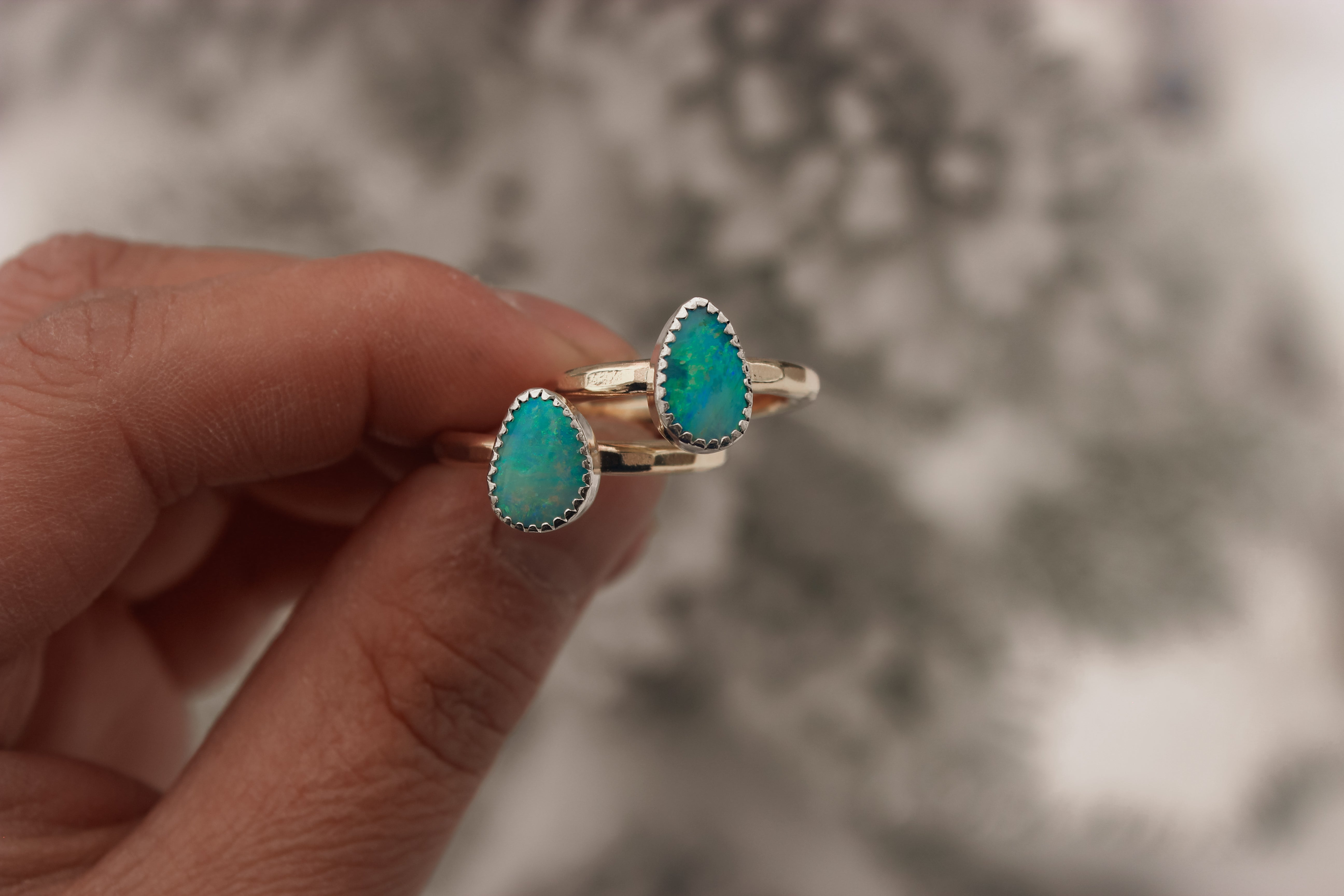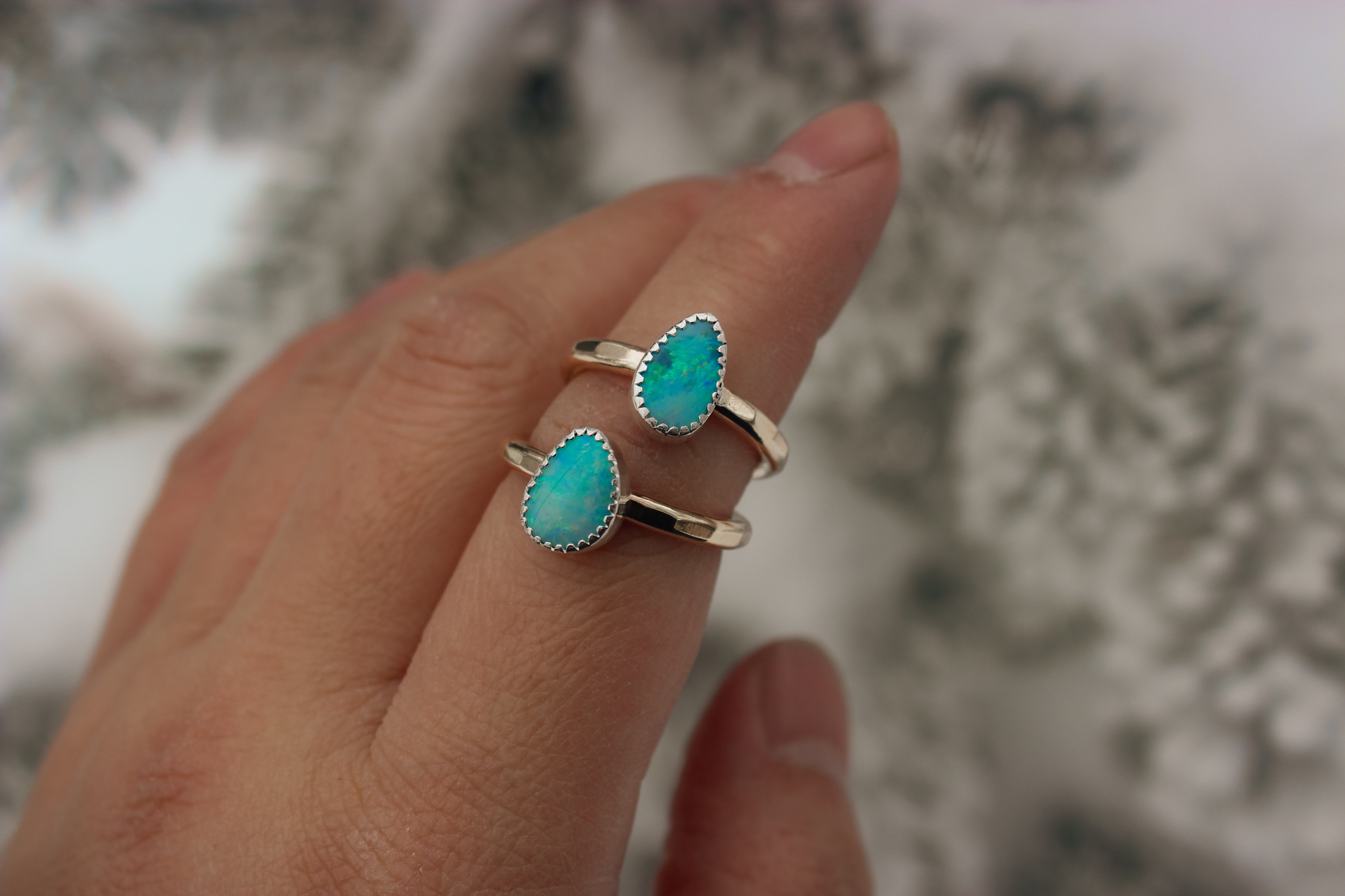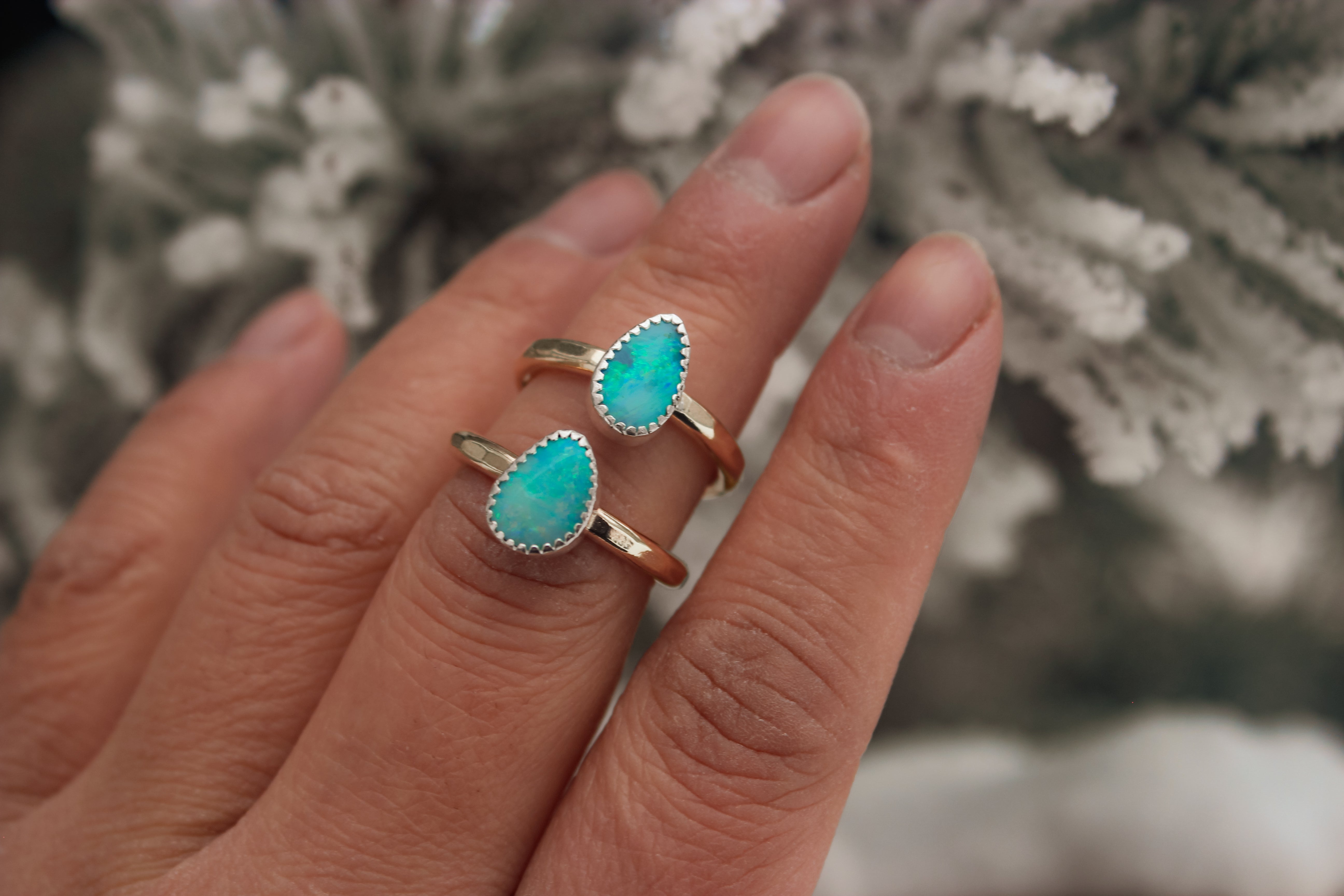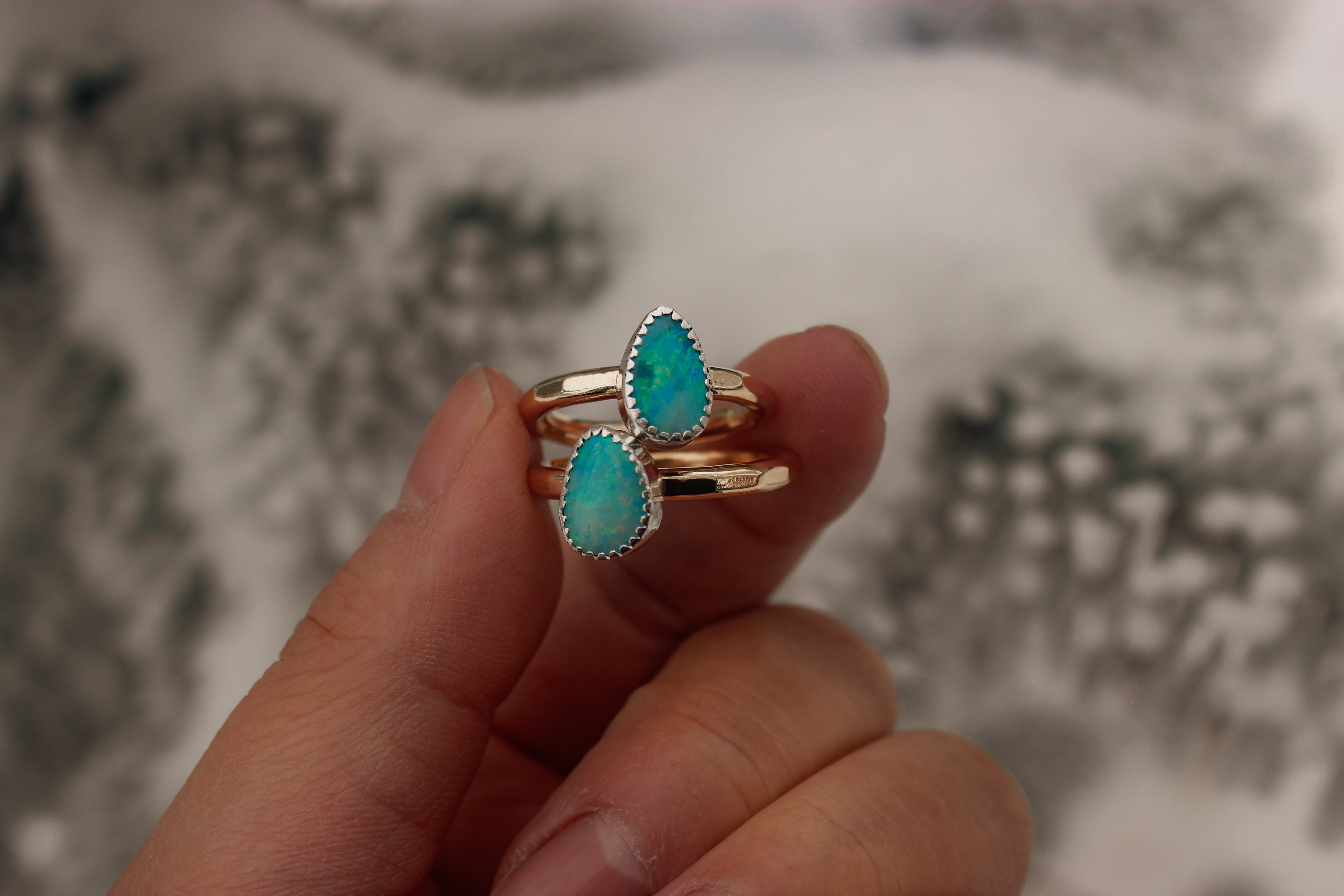 Sparkling blue hued opals contrast against warm gold bands, twinkling with hammered facets and a high polish finish.