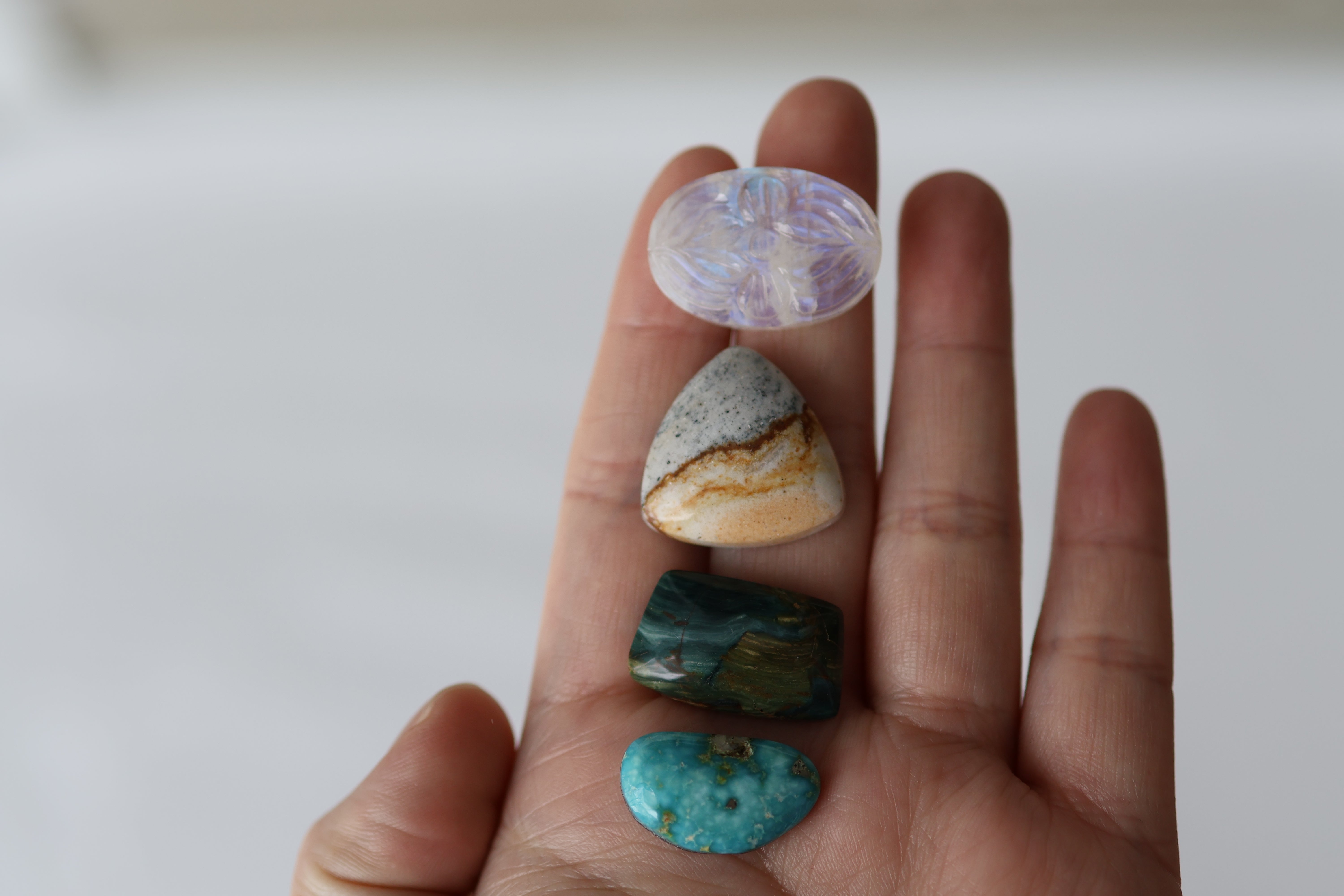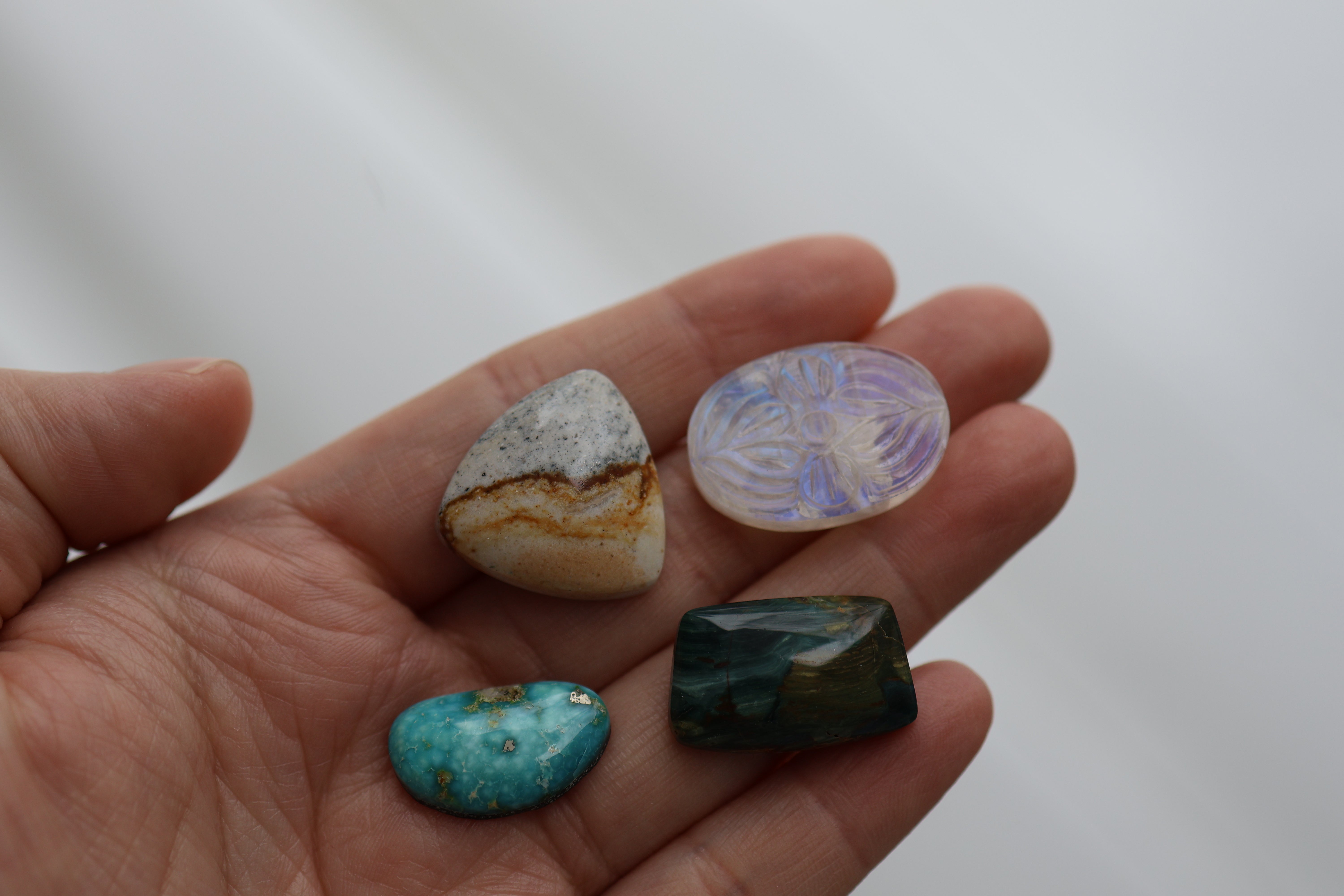 Choose from Rainbow Moonstone, Gary Green Jasper (much lighter in person), Chicken Track Jasper, Whitewater Turquoise
