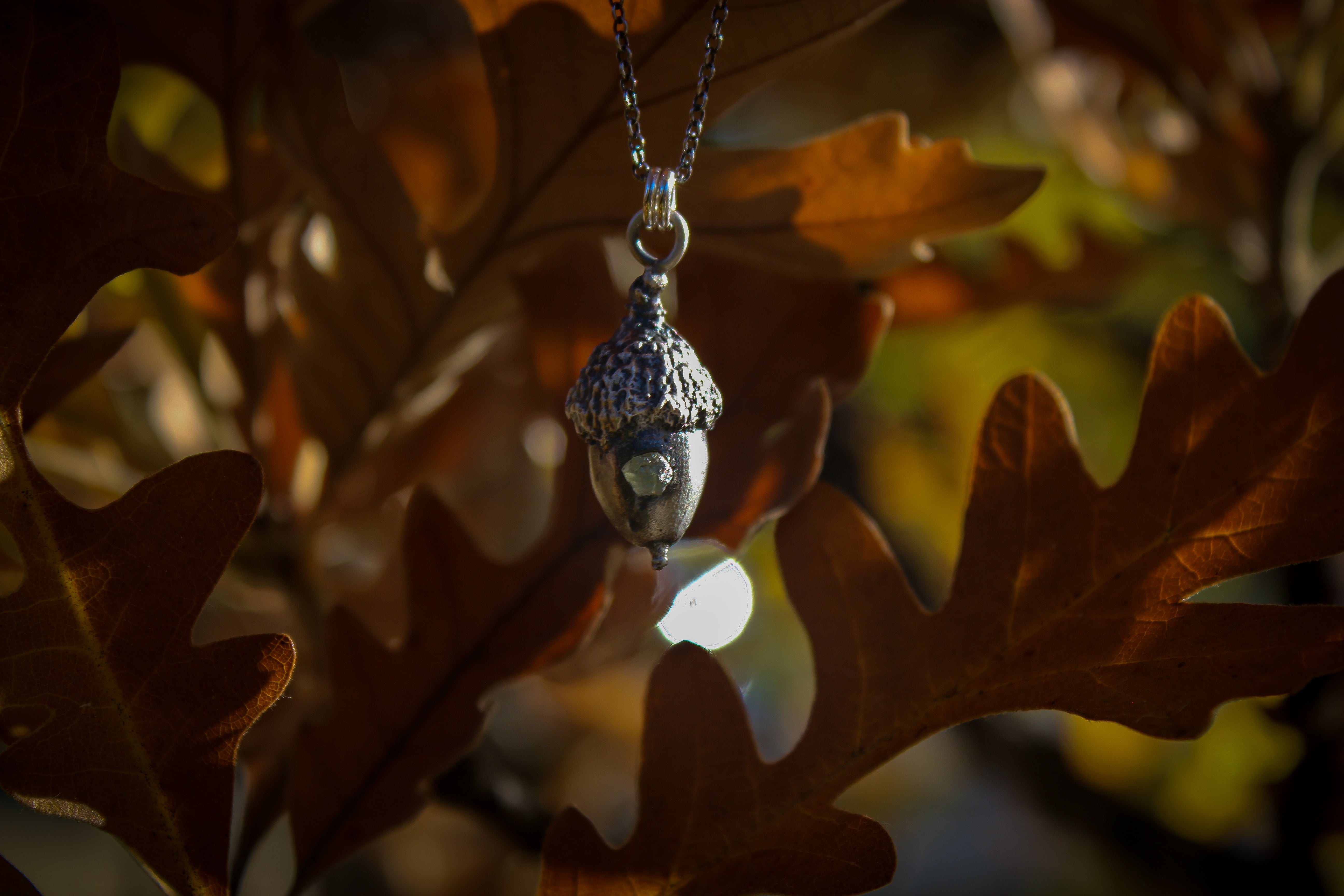 These little acorns have small raw Montana sapphires cast in place within their core, forever immortalized in cold silver. There aren't many stones that can handle the heat of the casting process, but these little ones were perfect for the job. During casting, in this case sand casting, the metal is heated up until it's a molten, glowing liquid which is then poured swiftly into the sand mold, resulting in the form you see here. The silver wraps itself around the stone, hugging it tightly and securely as it cools.