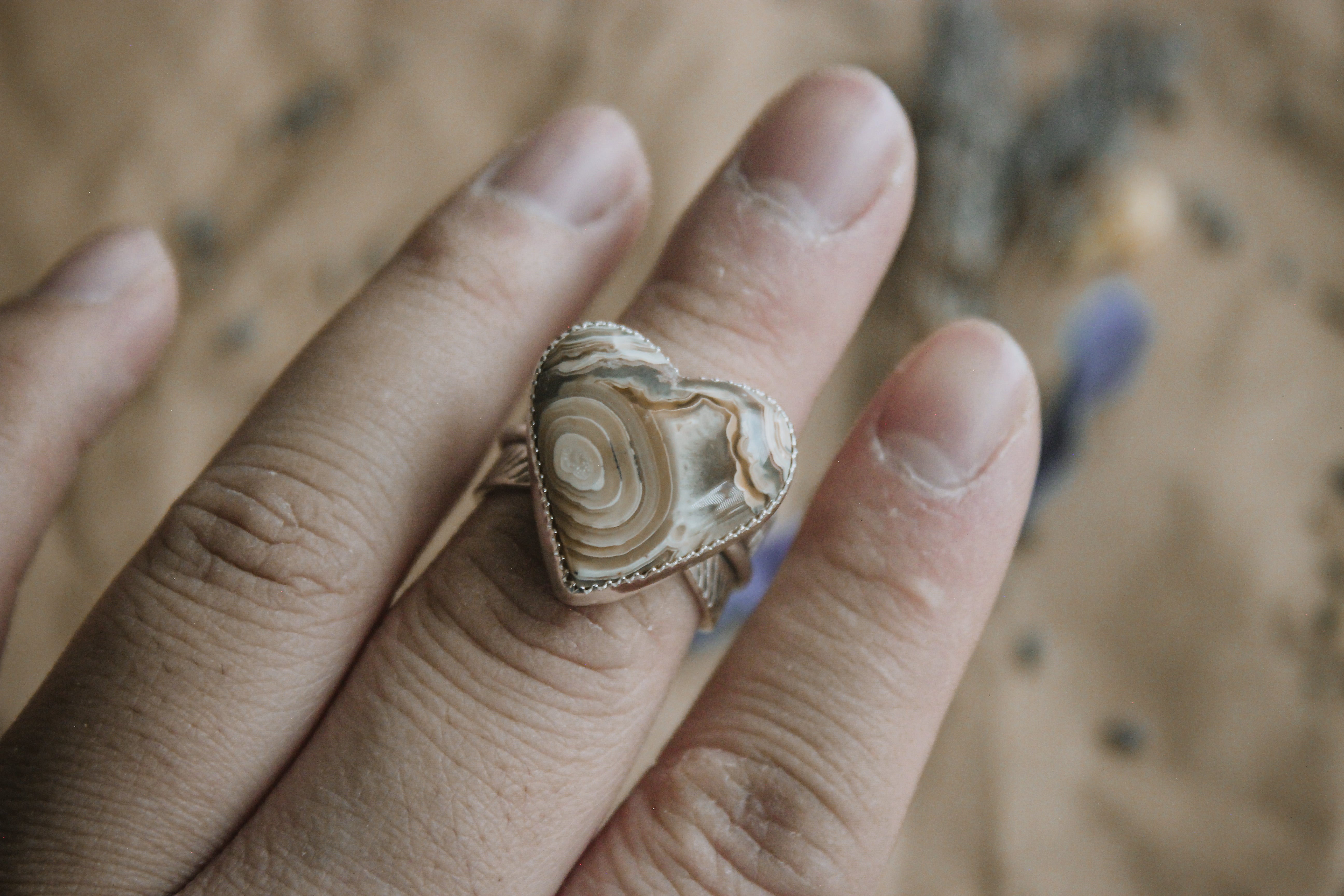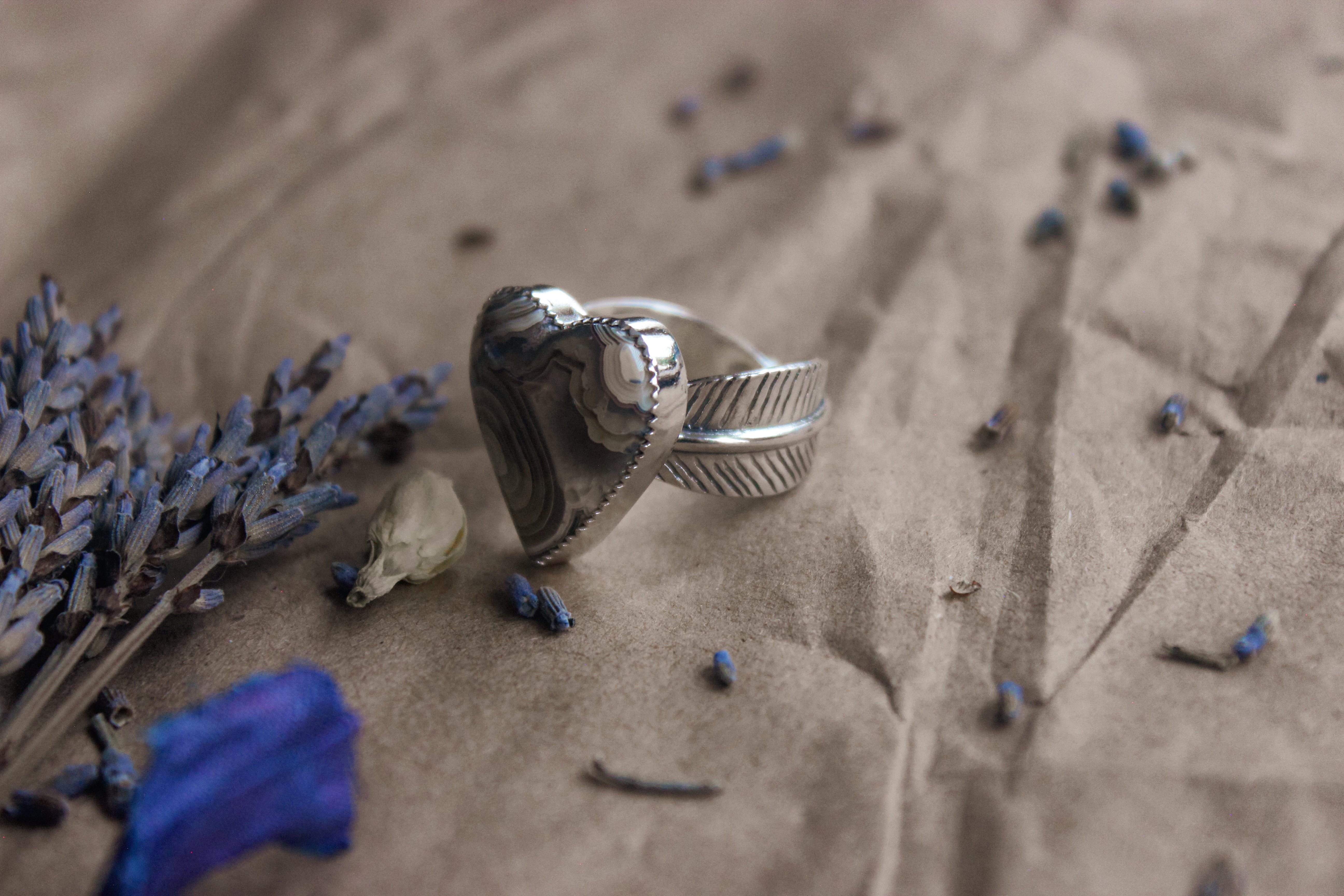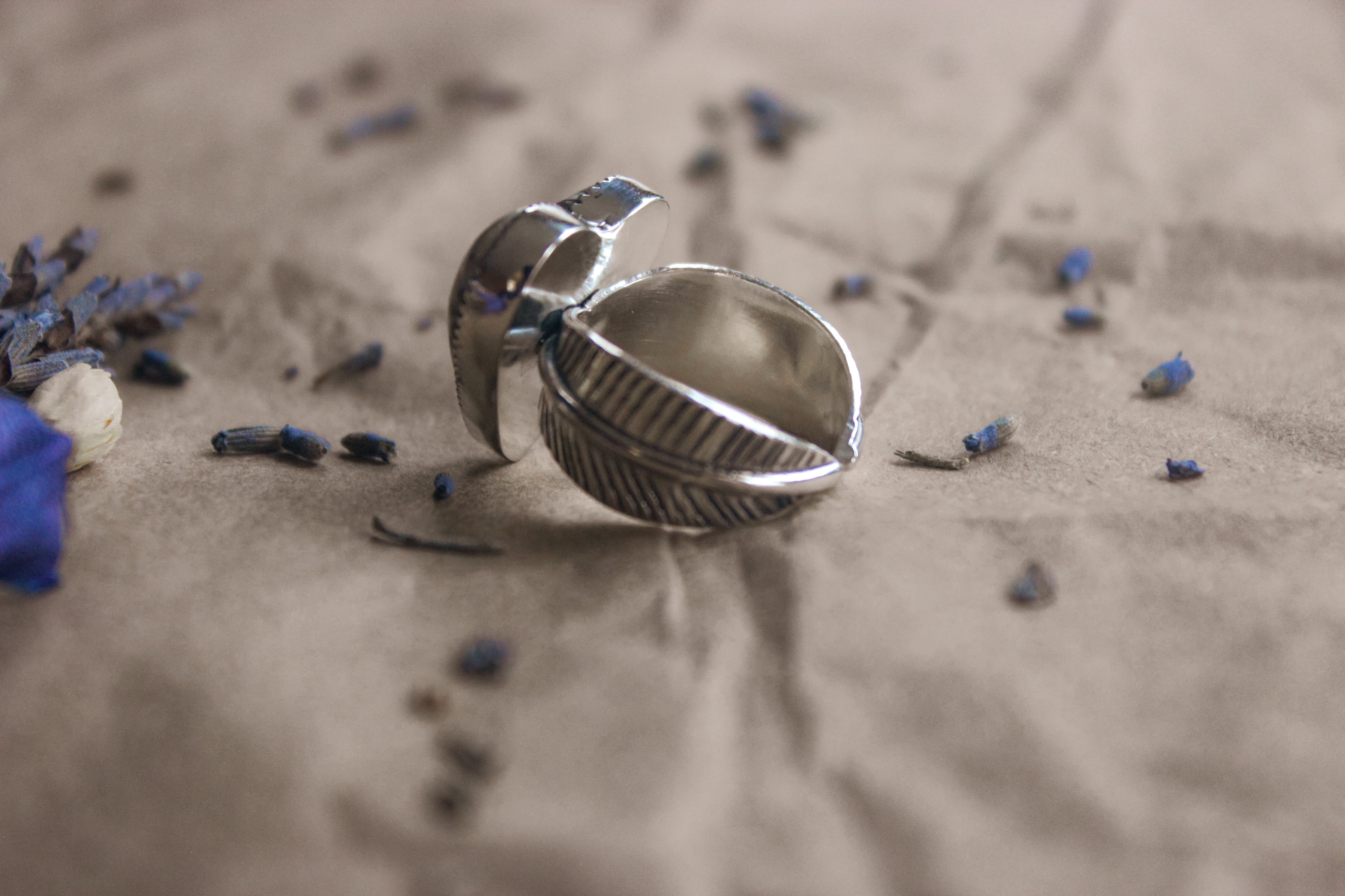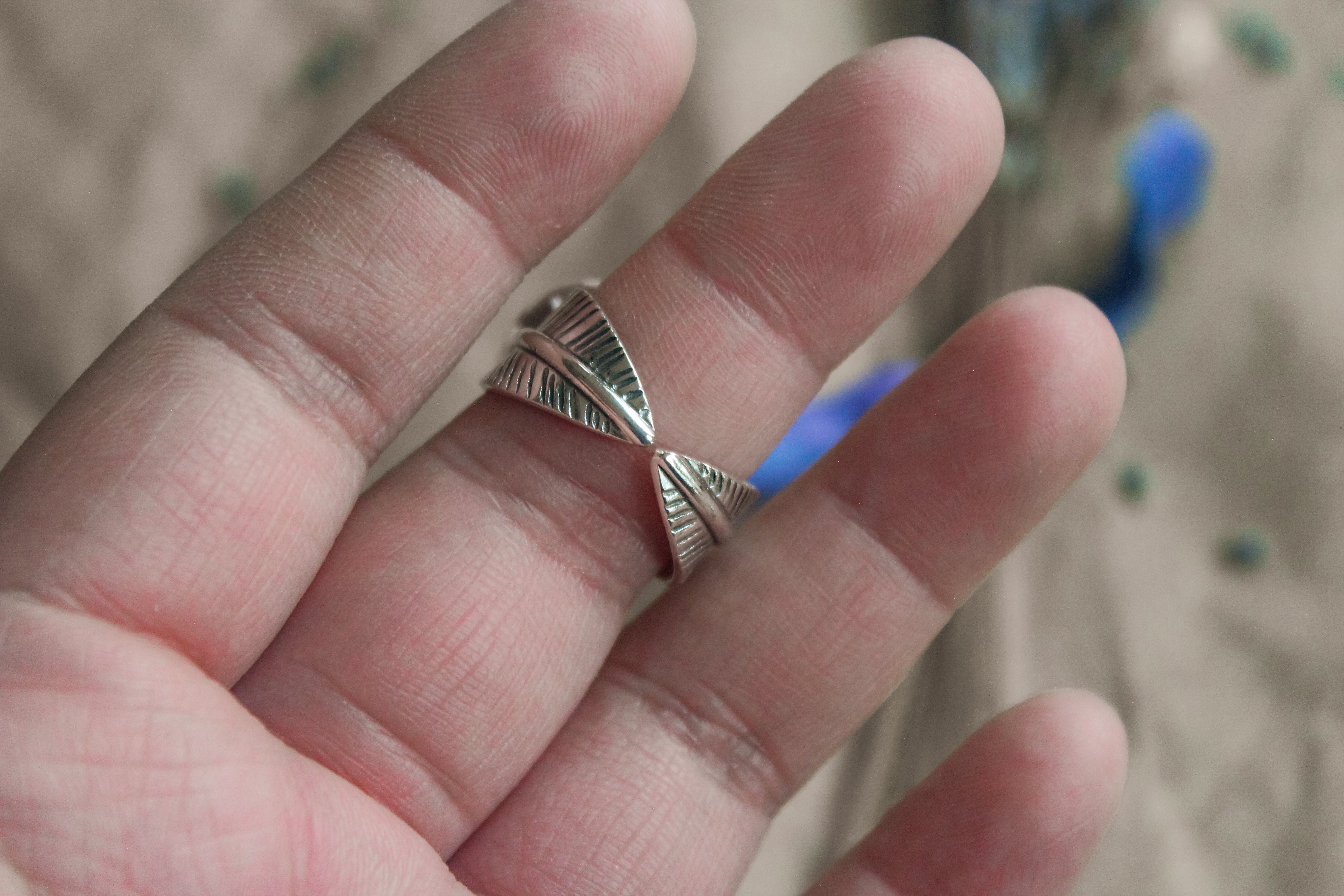 These rings are a play on the characteristic "winged hearts" we see all over around Valentine's day. The wings have been folded around into a ring that is semi-adjustable, little feathers wrapped around your finger.
