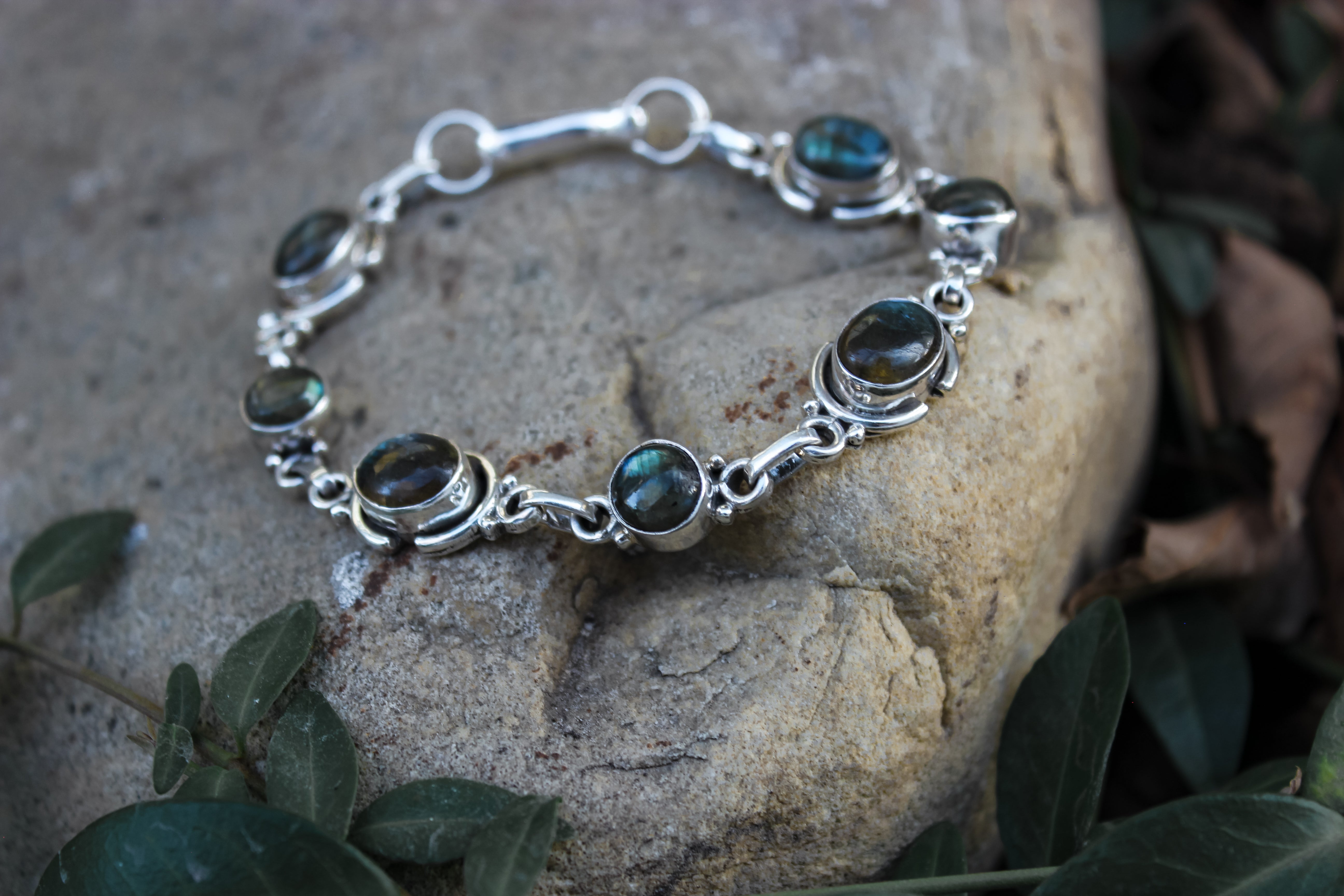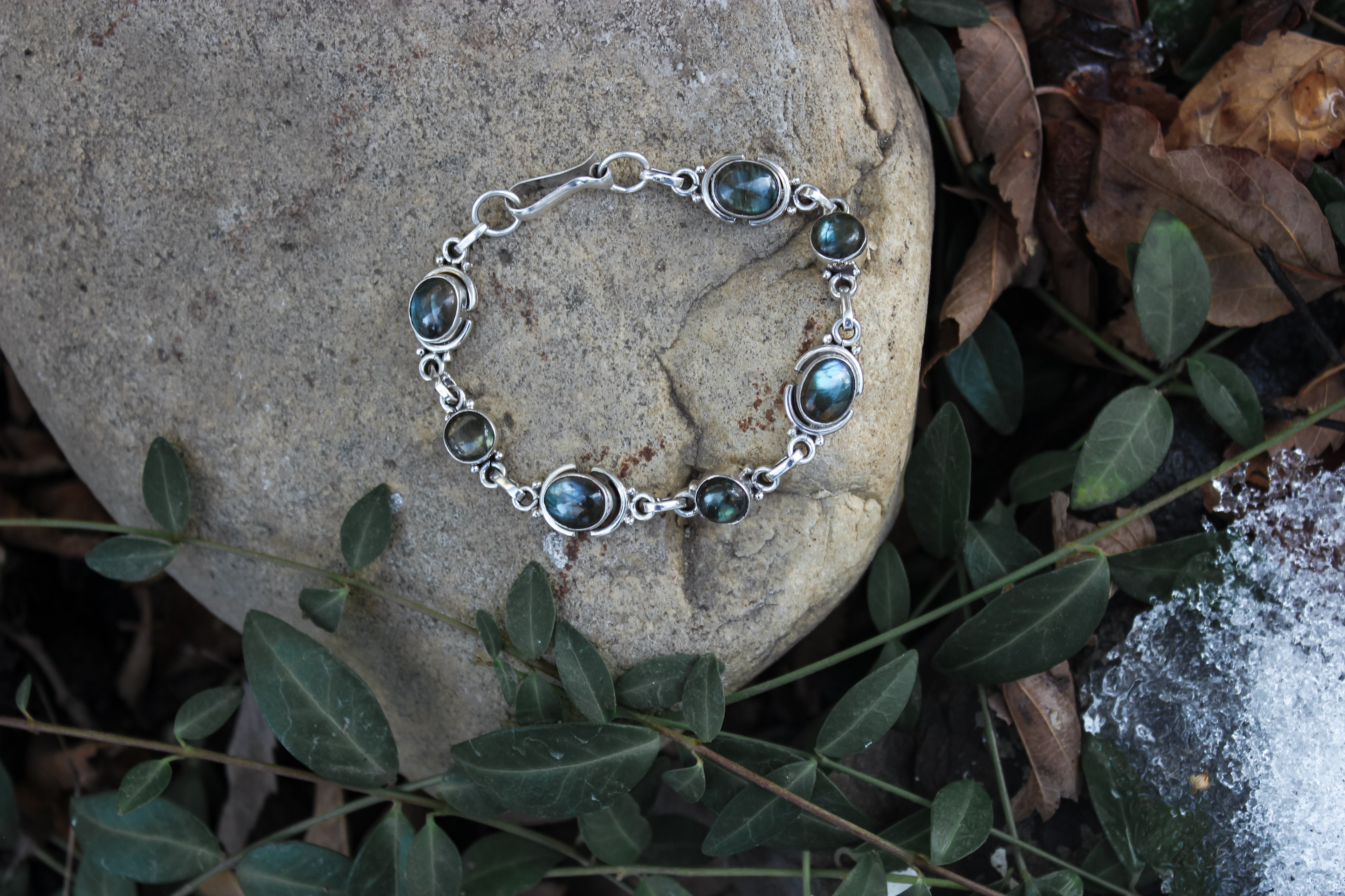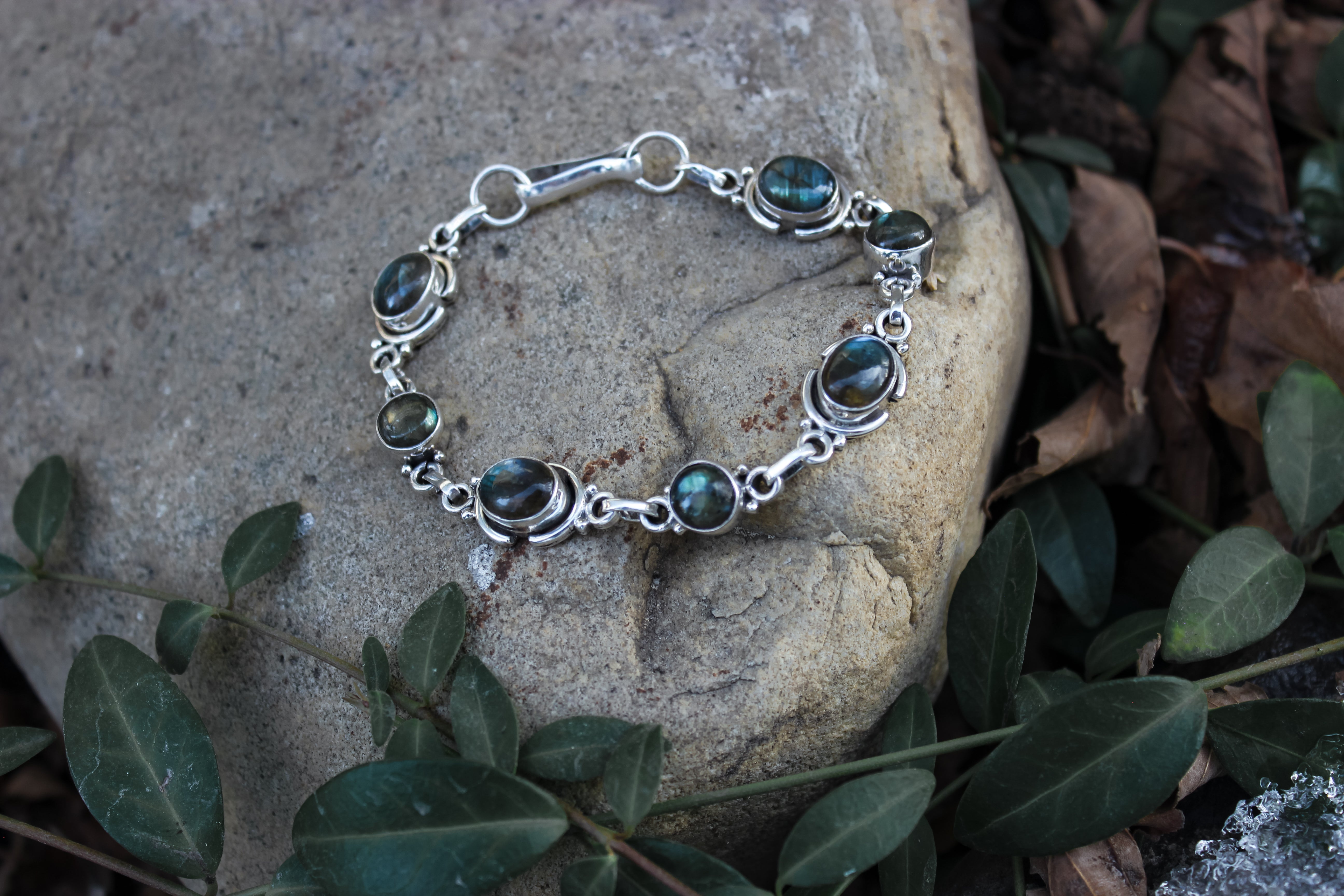 The labradorite in this bracelet harnesses the power of the auroras, flashing green, blue and gold with every turn. Selene is the goddess of the moon, and she felt fitting for a night sky inspired bracelet such as this. The beauty of the darkness with just a kiss of light.