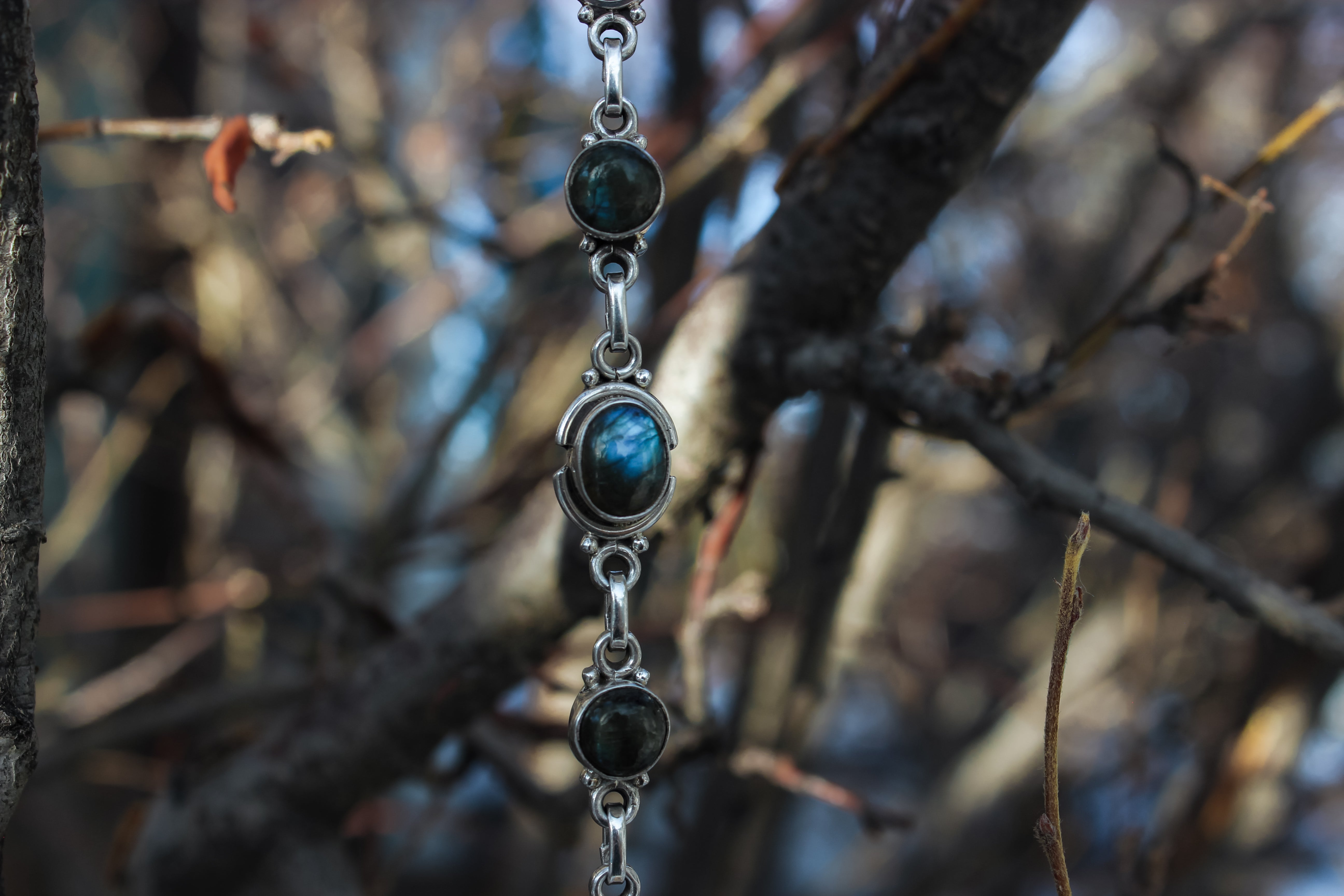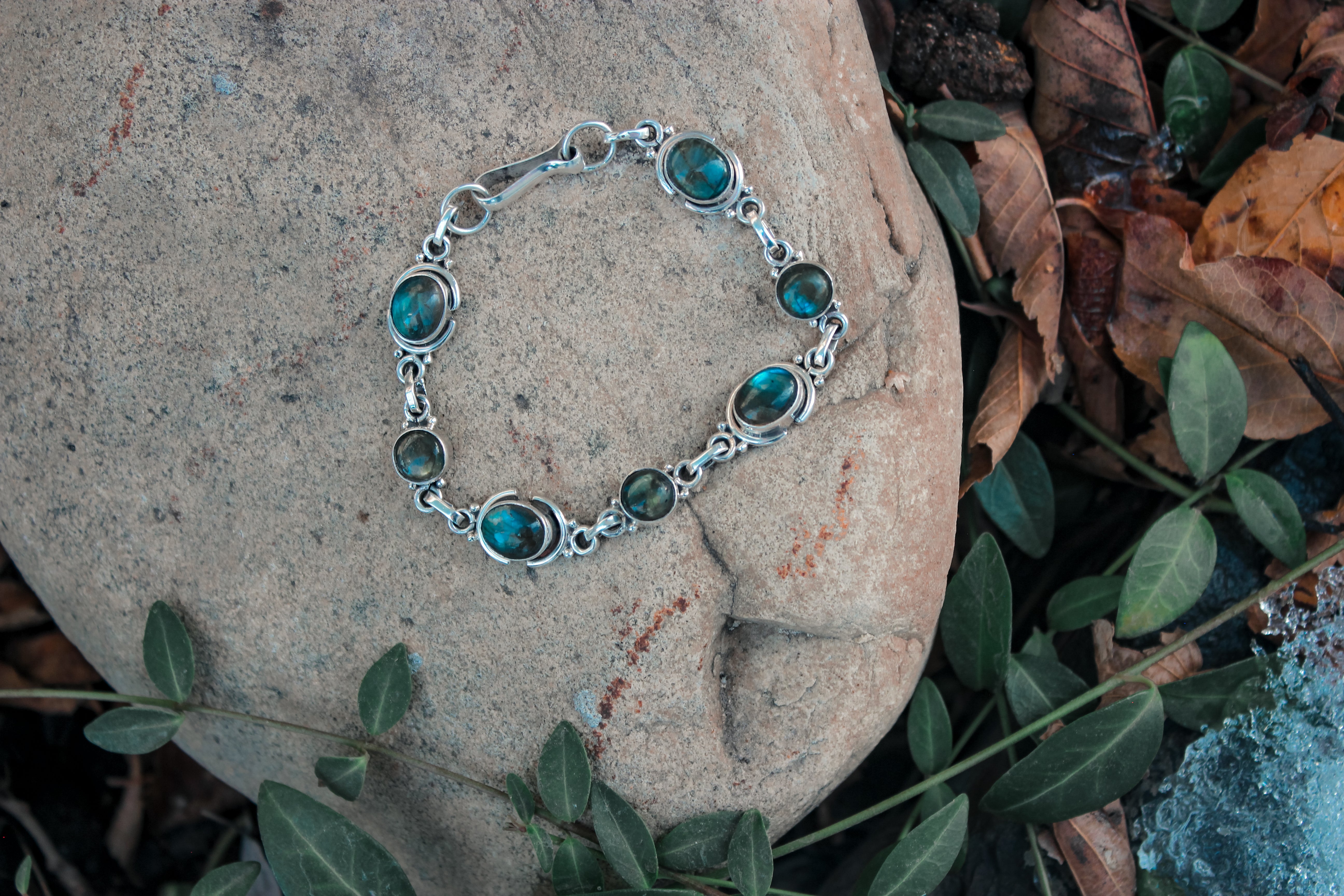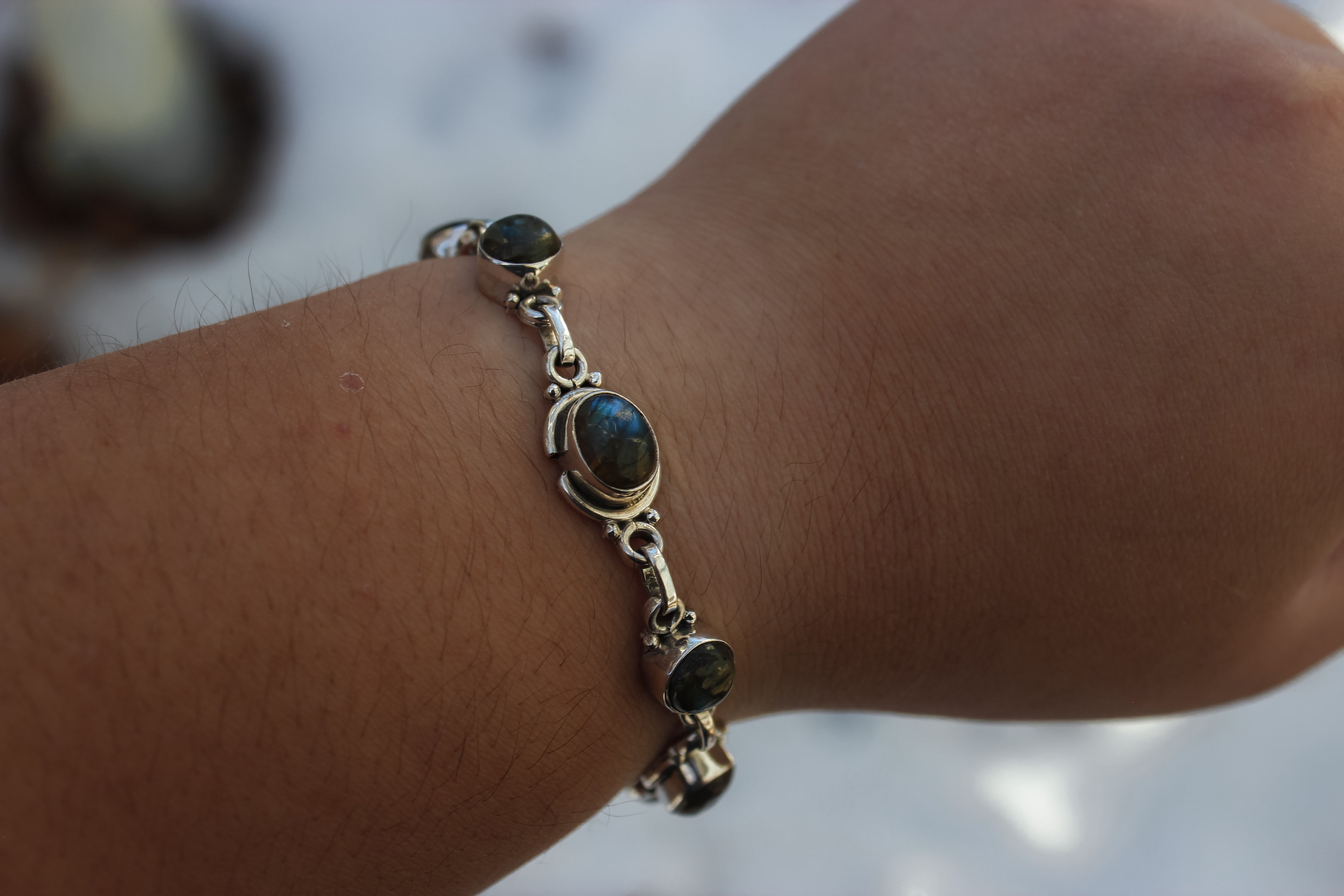 The labradorite in this bracelet harnesses the power of the auroras, flashing green, blue and gold with every turn. Selene is the goddess of the moon, and she felt fitting for a night sky inspired bracelet such as this. The beauty of the darkness with just a kiss of light.