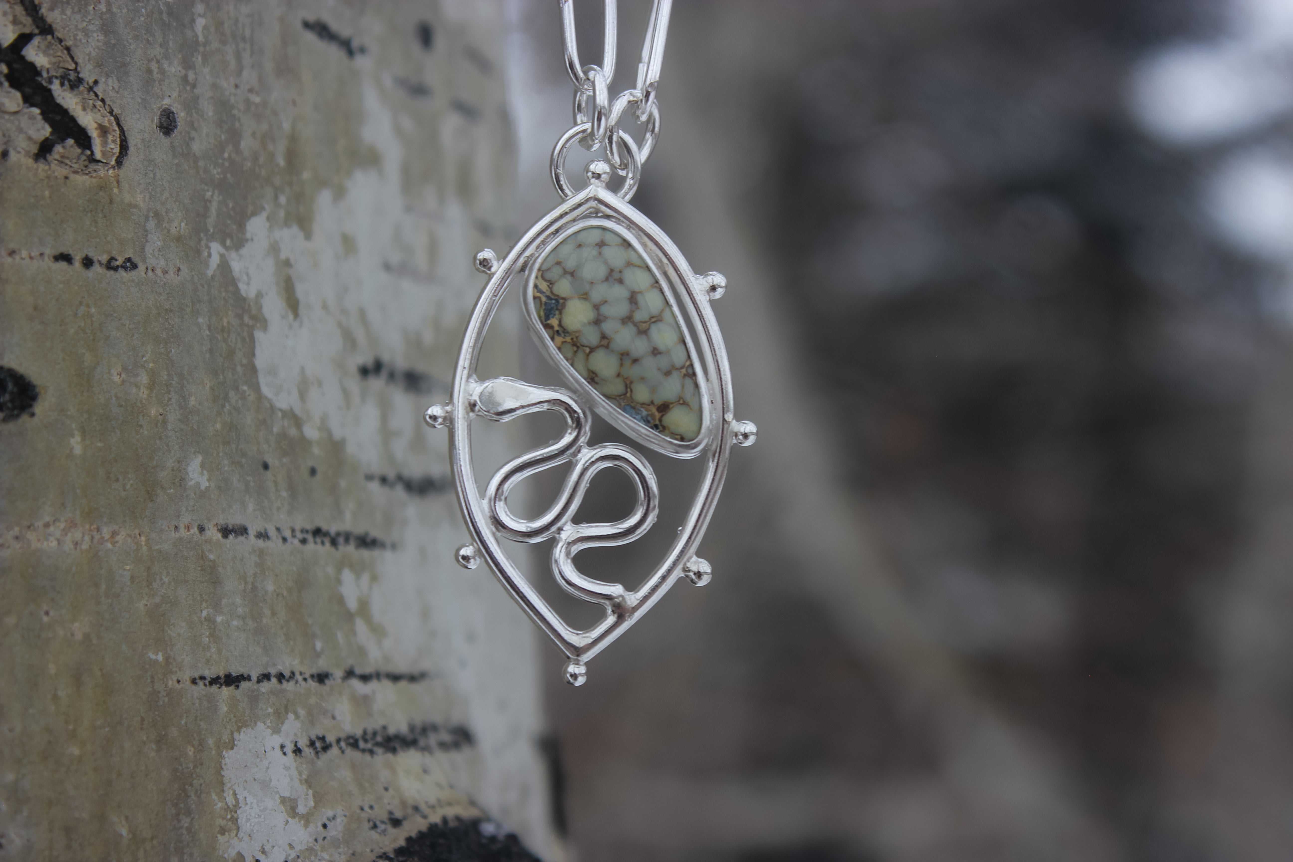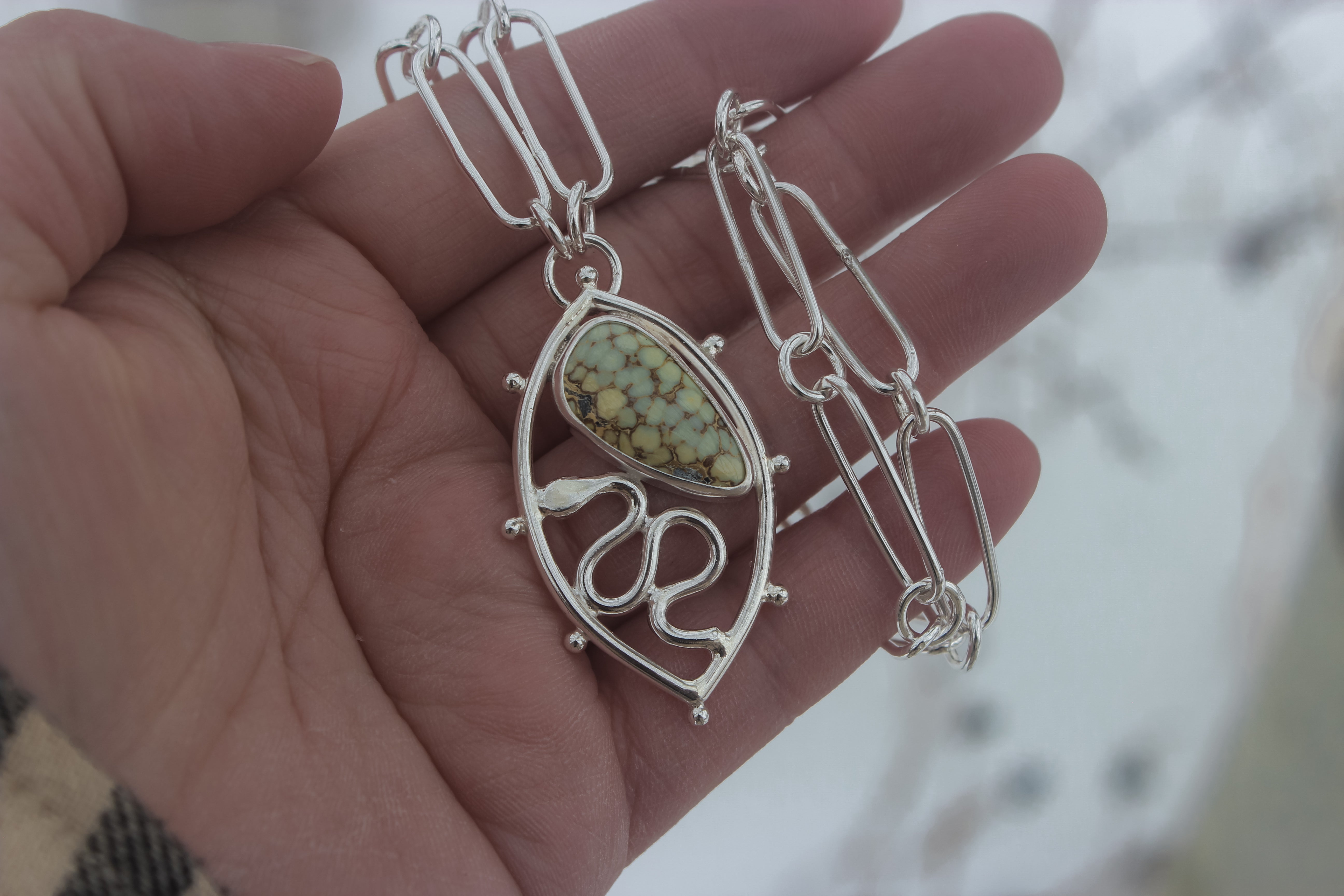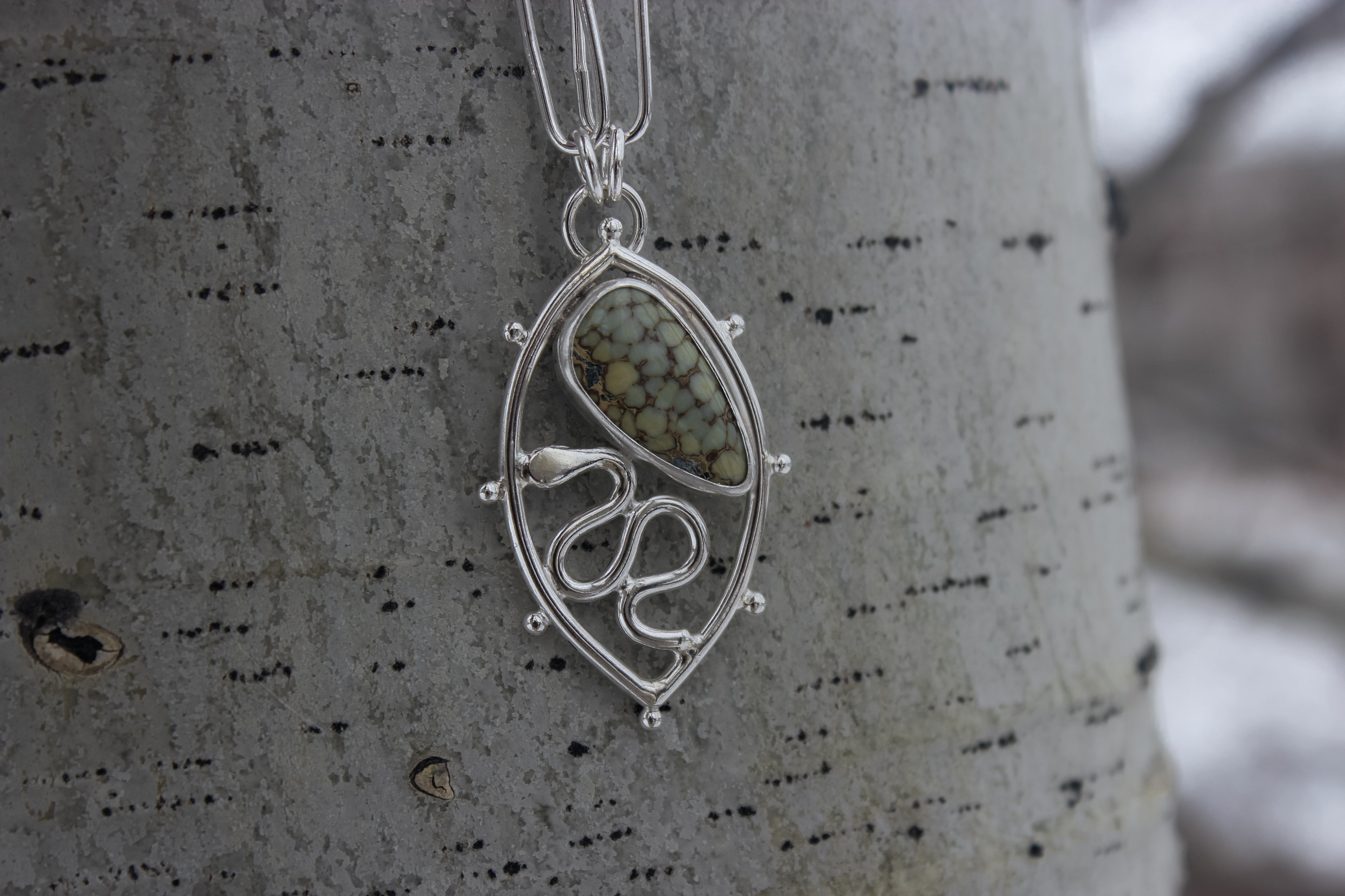 A slithering snake nestles in next to a beautiful Agua Oro variscite stone resembling a cool, earthy snake skin pattern. The chain has been made by hand, each link carefully soldered together to make a chunky, weighty piece.
