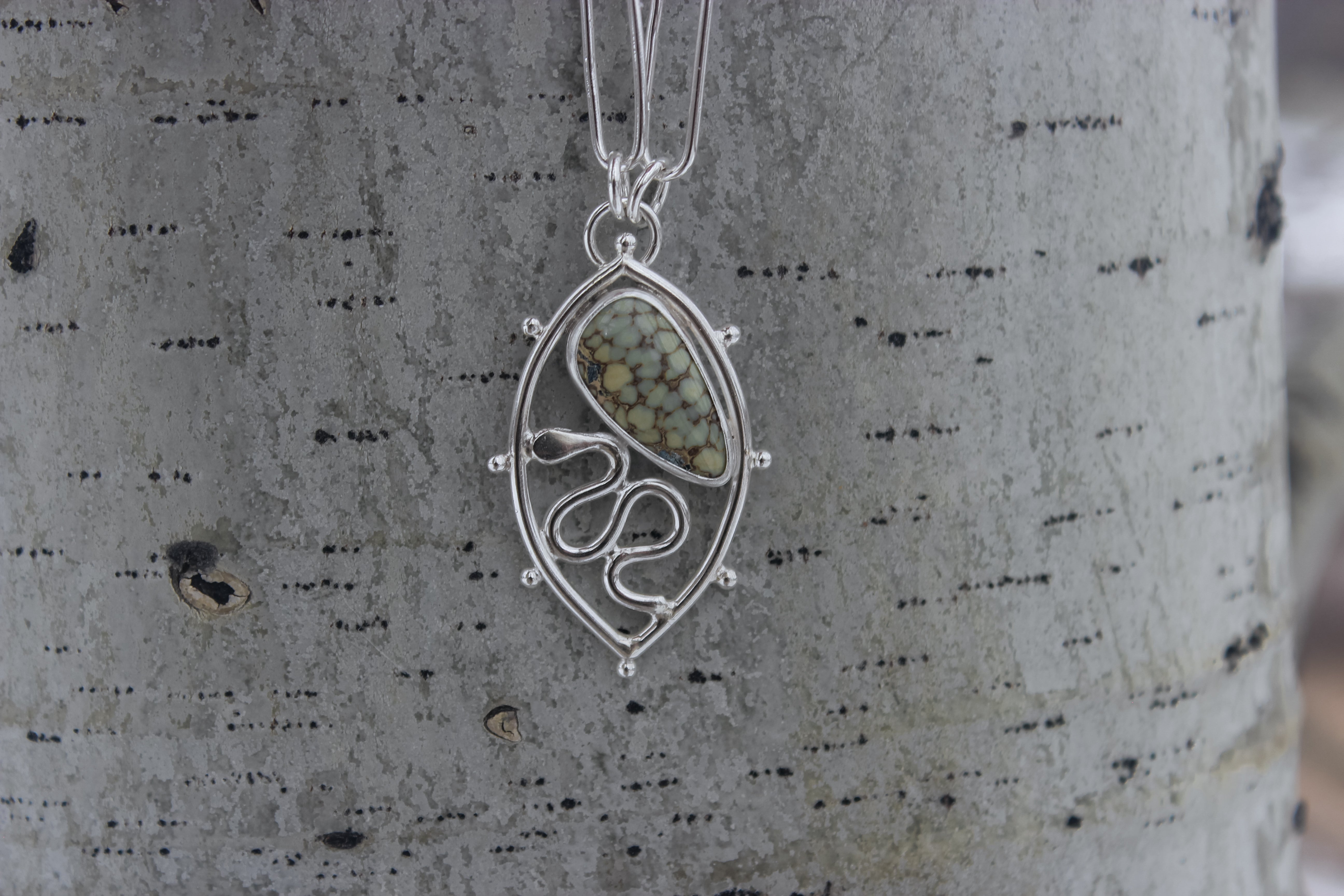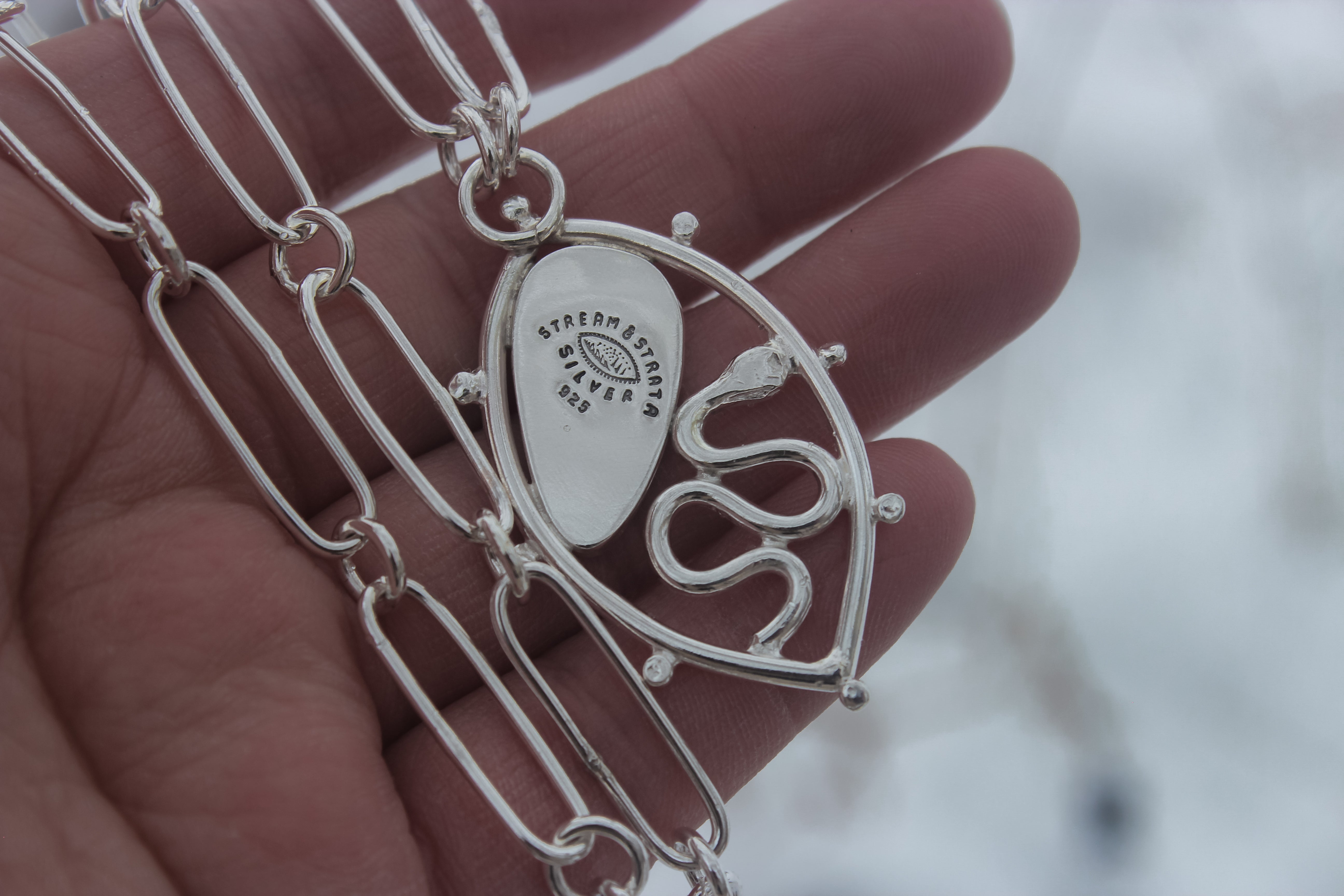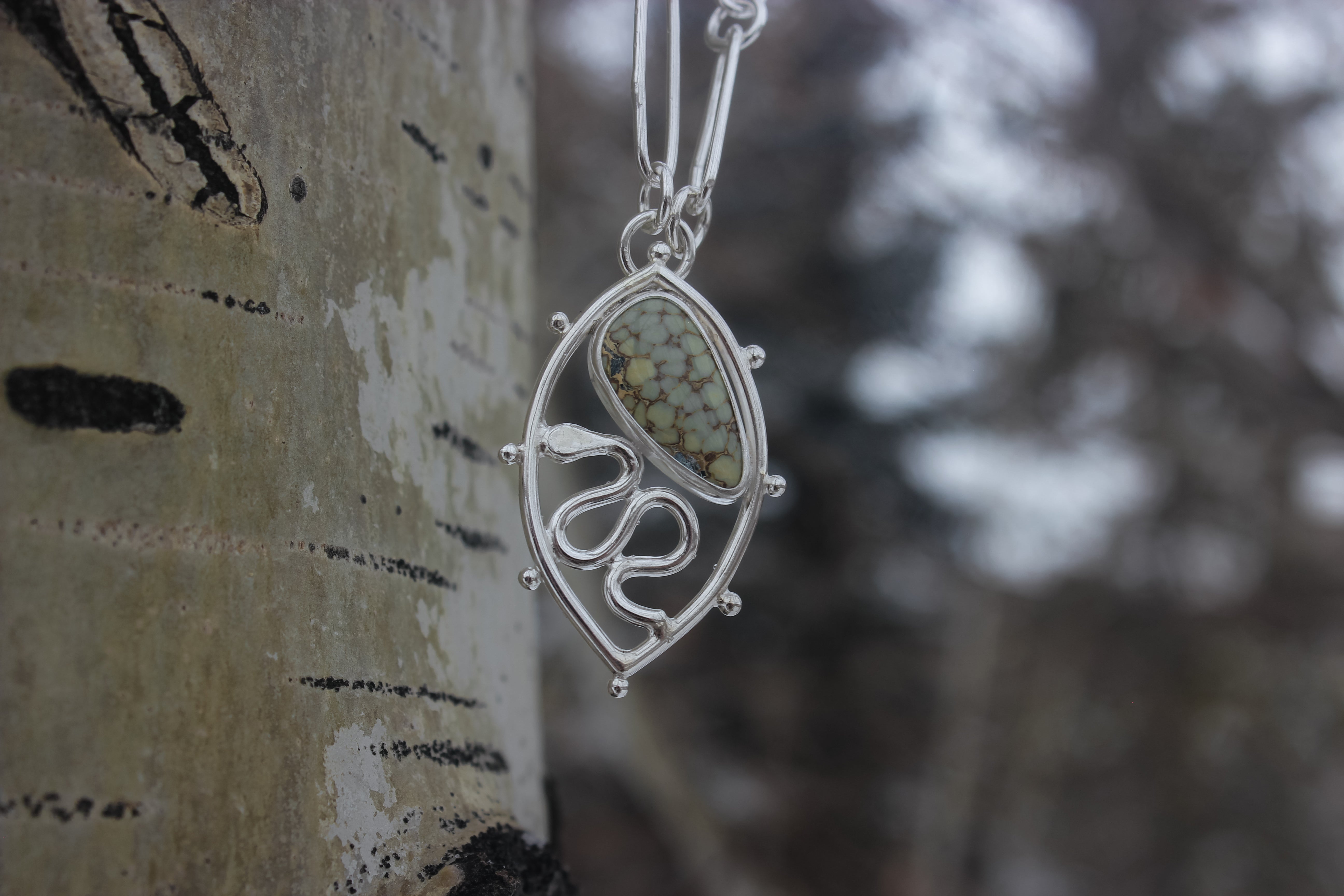 A slithering snake nestles in next to a beautiful Agua Oro variscite stone resembling a cool, earthy snake skin pattern. The chain has been made by hand, each link carefully soldered together to make a chunky, weighty piece.