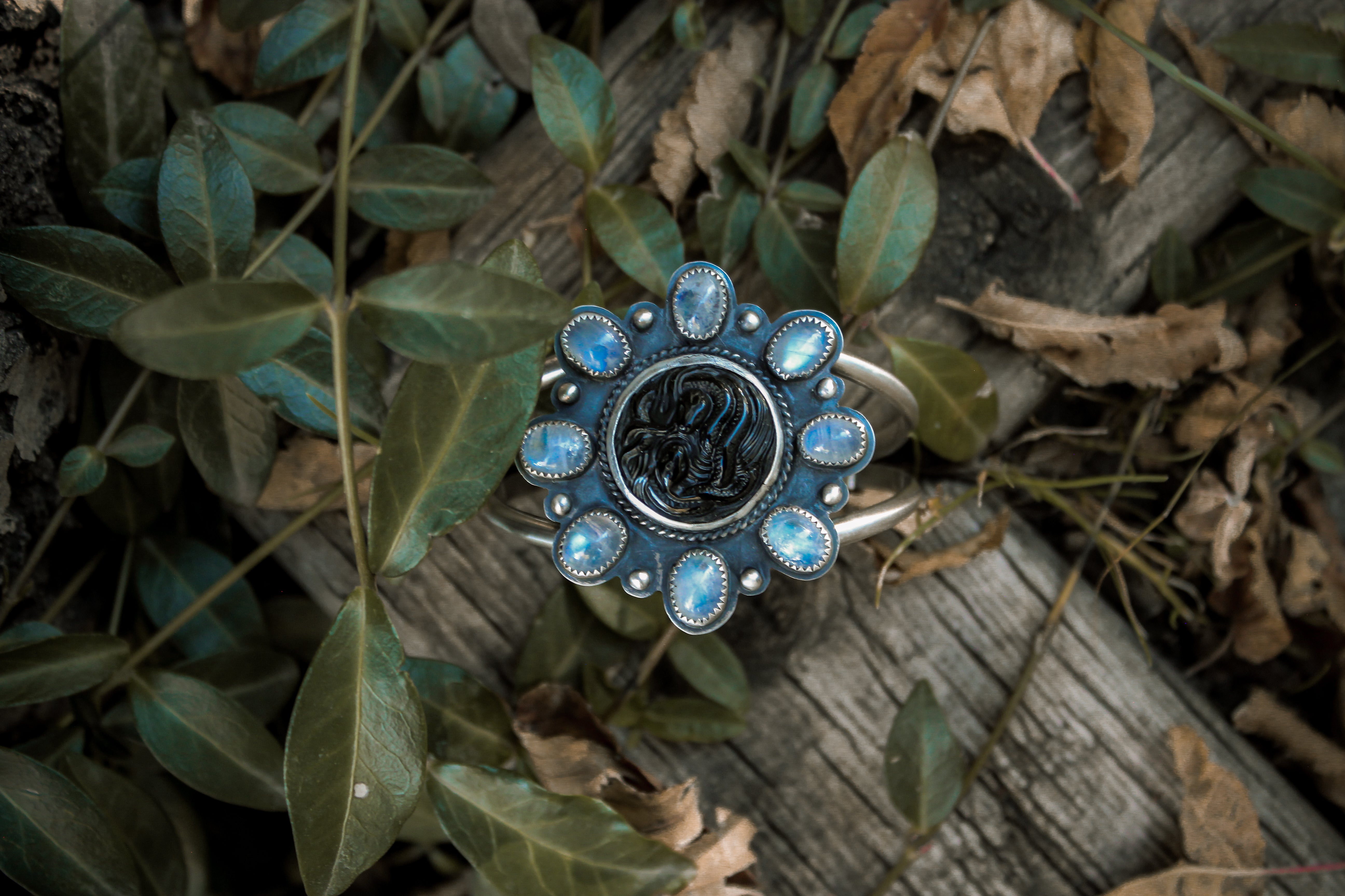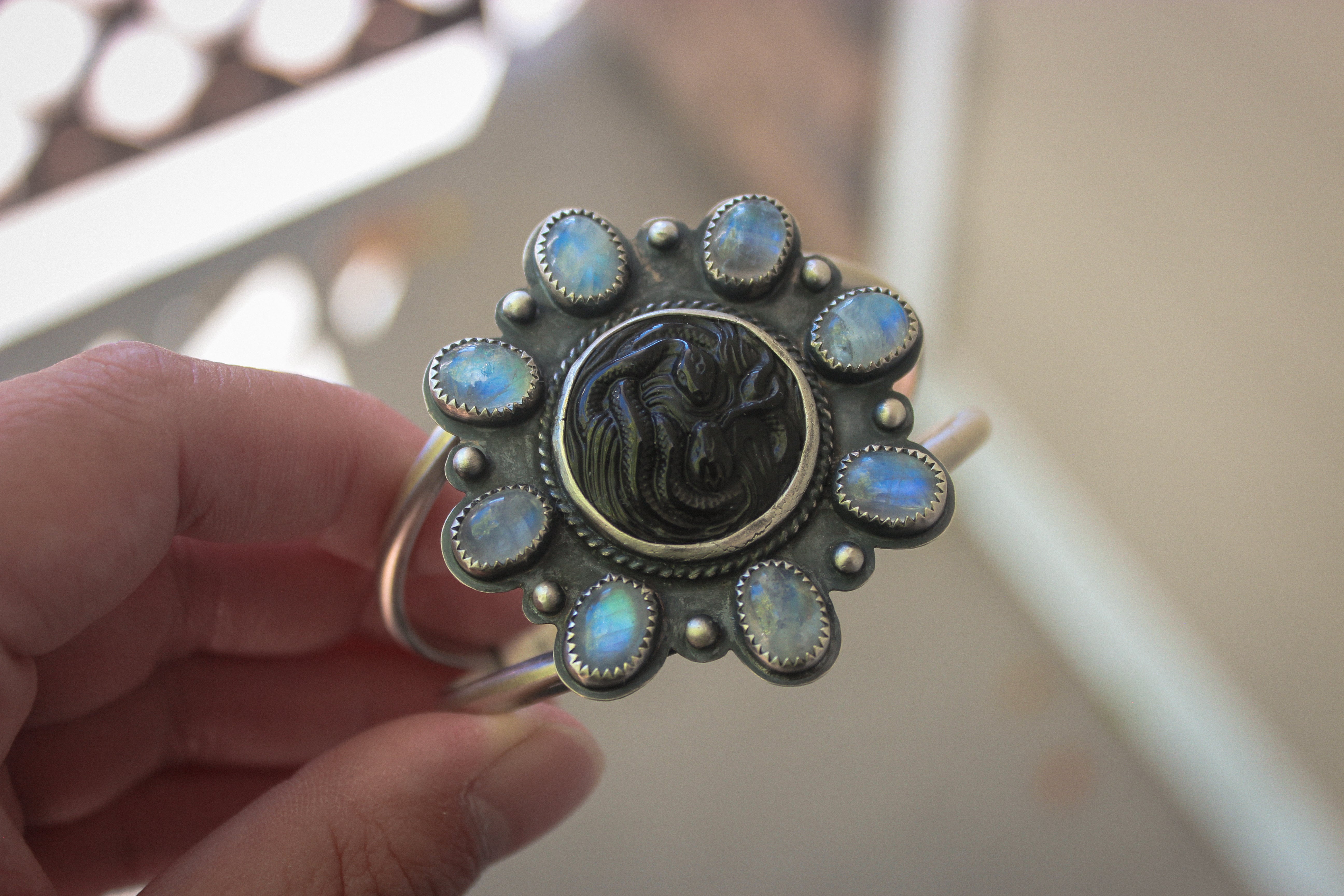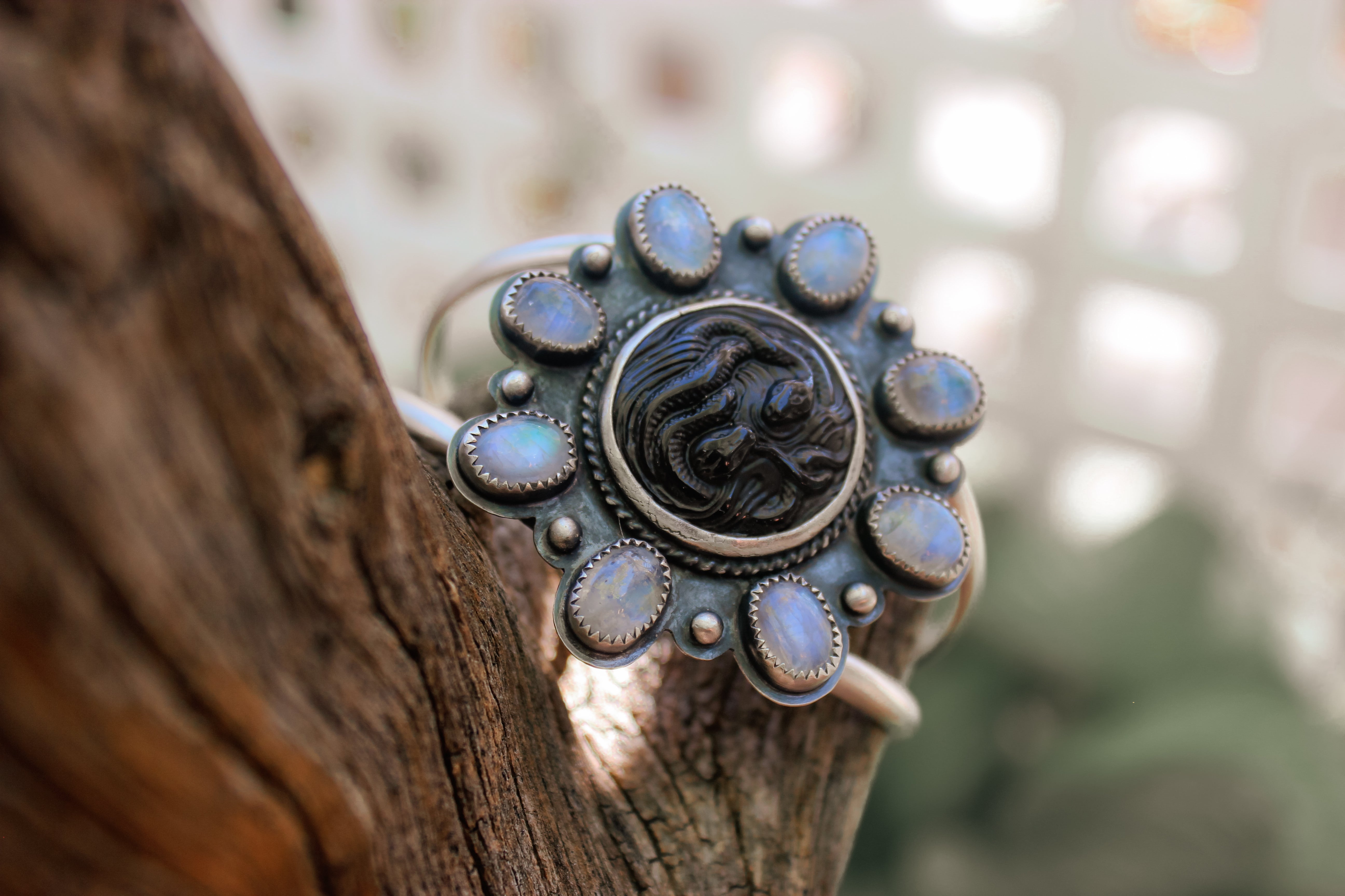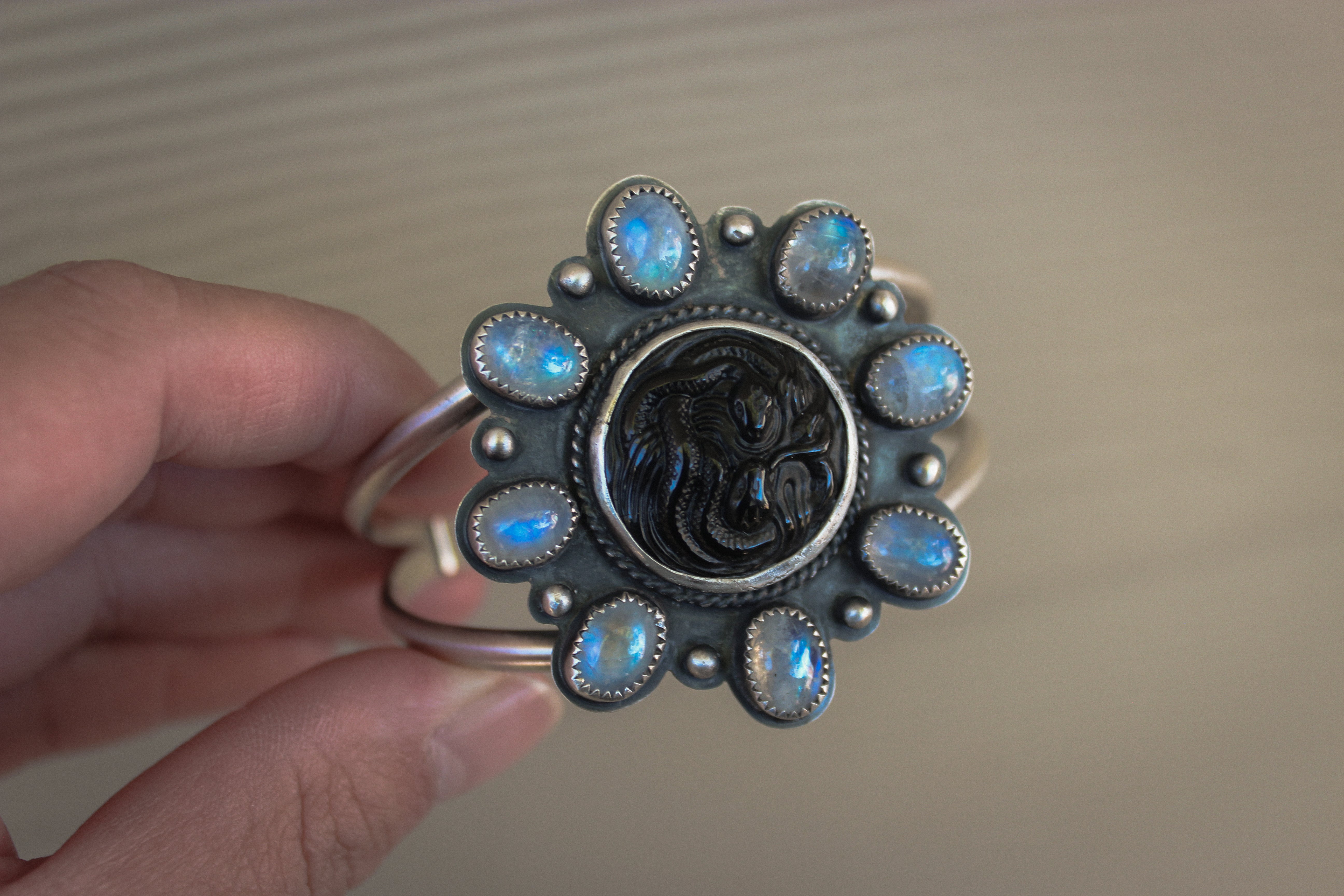 Twisted snakes slither within the center of this stunning statement cuff, carved out of deep black obsidian. A cluster of moonstones have been positioned around the snakes, shimmering lightly as the sun catches their blue flash. Snakes are often used to symbolize new beginnings after death, the cycle of life in its purest form, which is why I positioned everything into a uniform circle. A true statement piece, perfect for those who need a gentle reminder that good things will follow the bad, and they must exist together to form a balance.