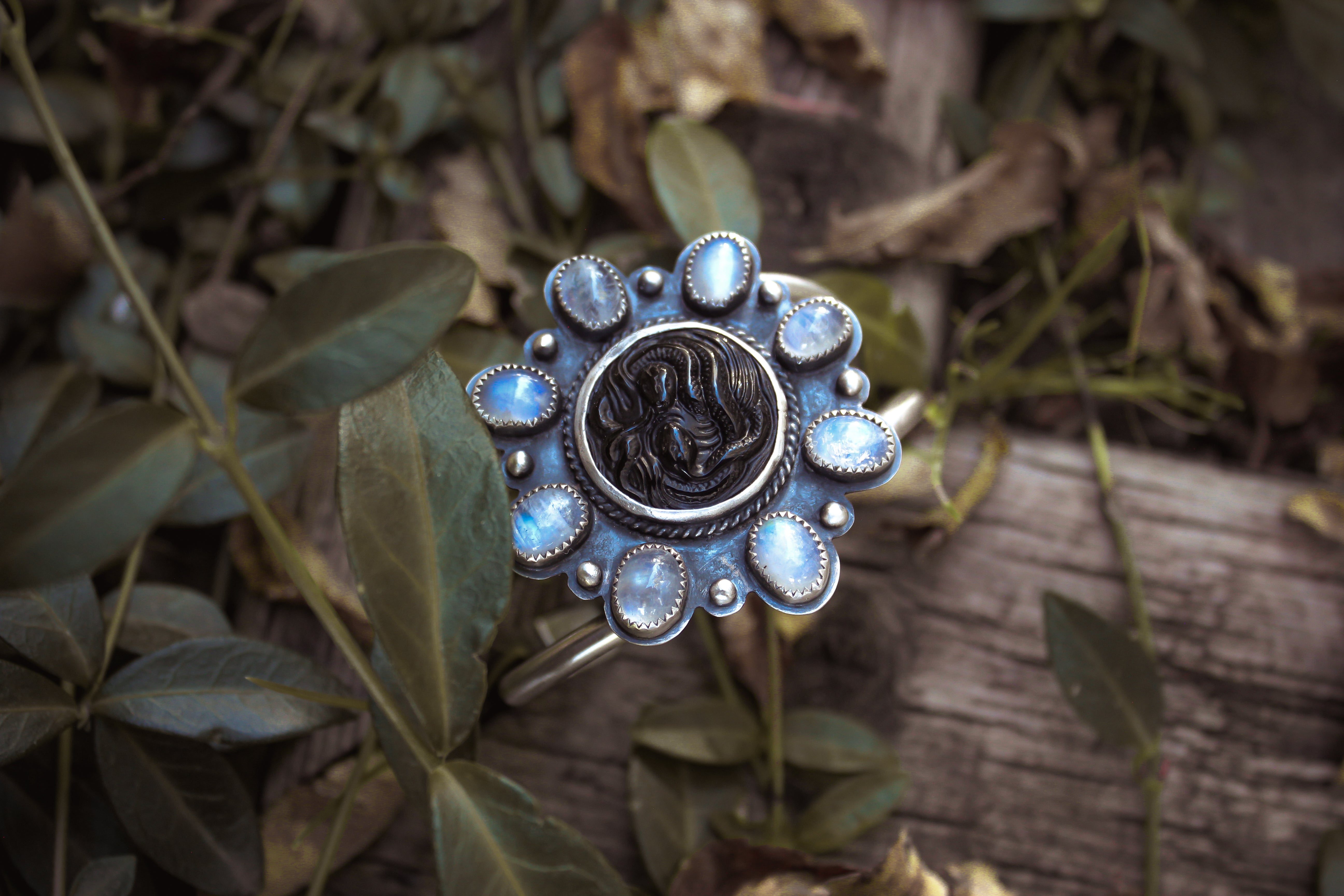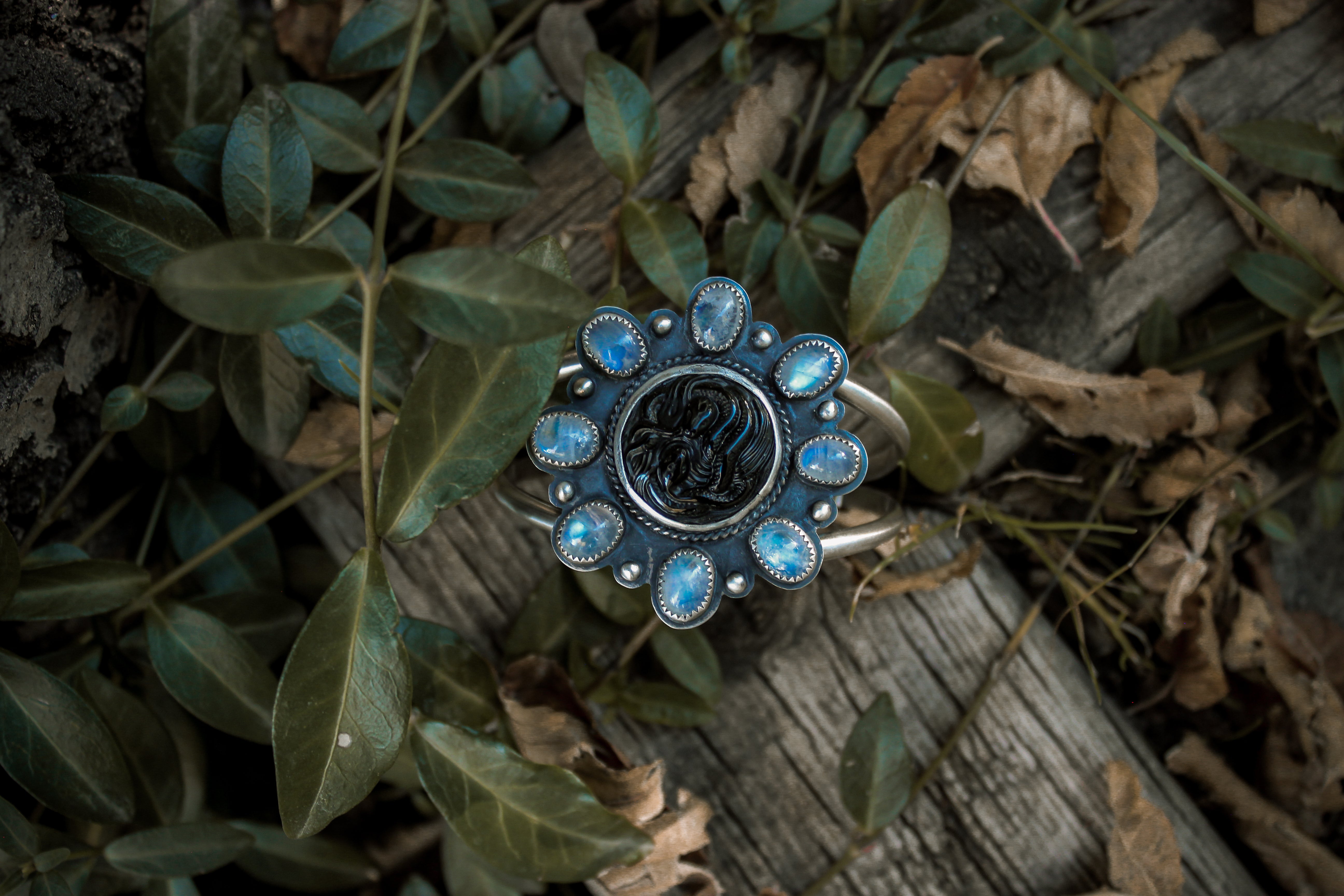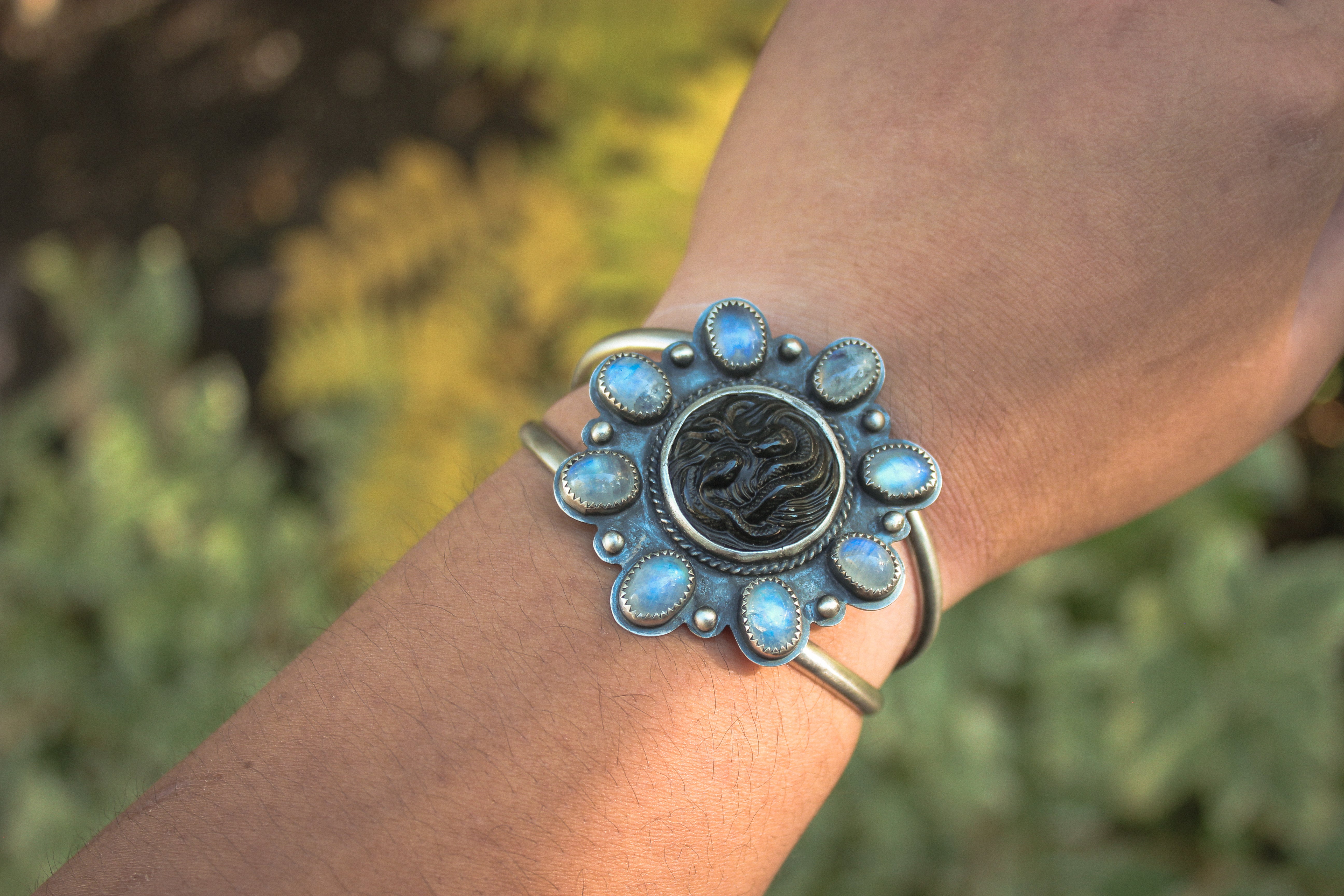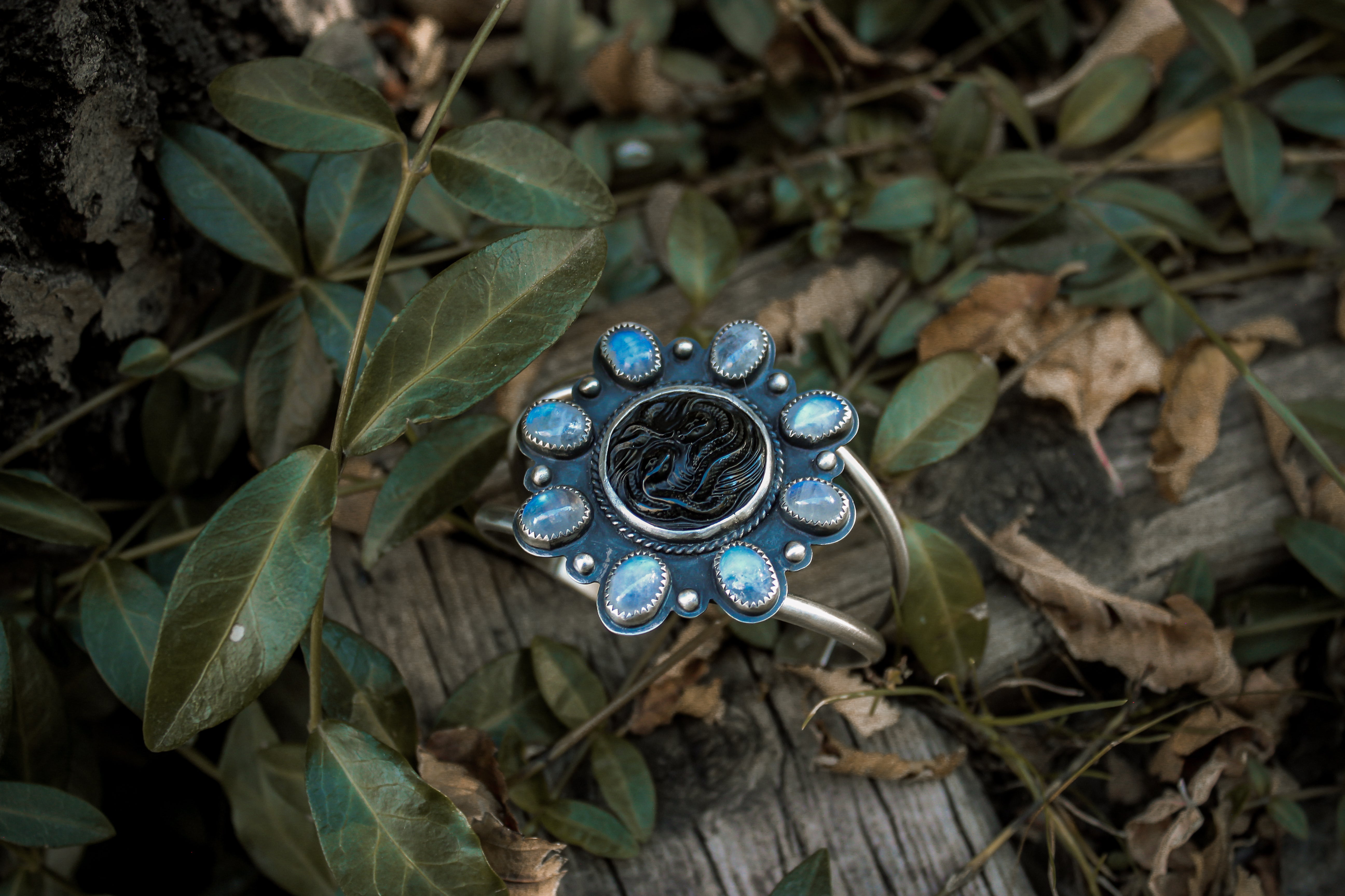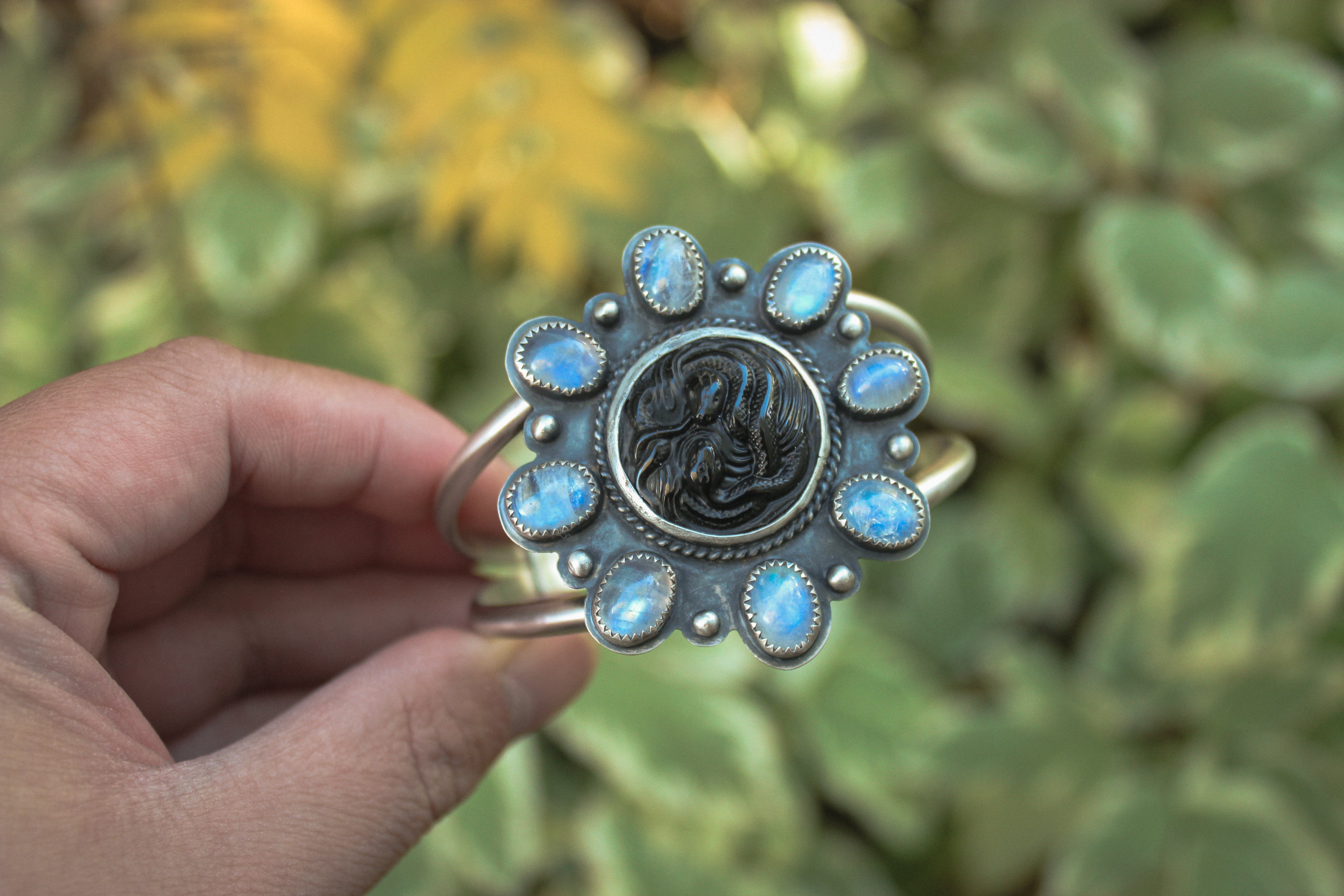 Twisted snakes slither within the center of this stunning statement cuff, carved out of deep black obsidian. A cluster of moonstones have been positioned around the snakes, shimmering lightly as the sun catches their blue flash. Snakes are often used to symbolize new beginnings after death, the cycle of life in its purest form, which is why I positioned everything into a uniform circle. A true statement piece, perfect for those who need a gentle reminder that good things will follow the bad, and they must exist together to form a balance.