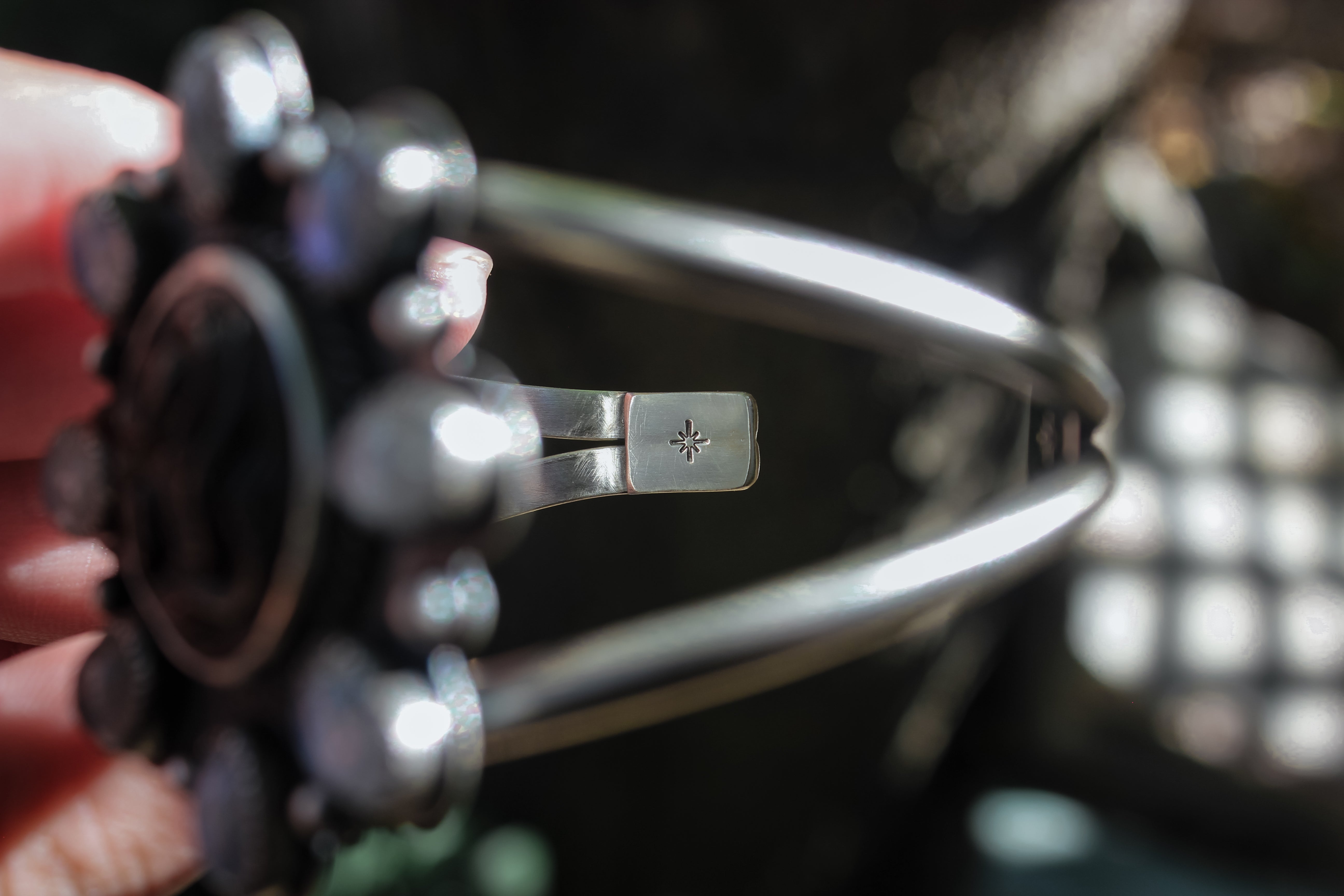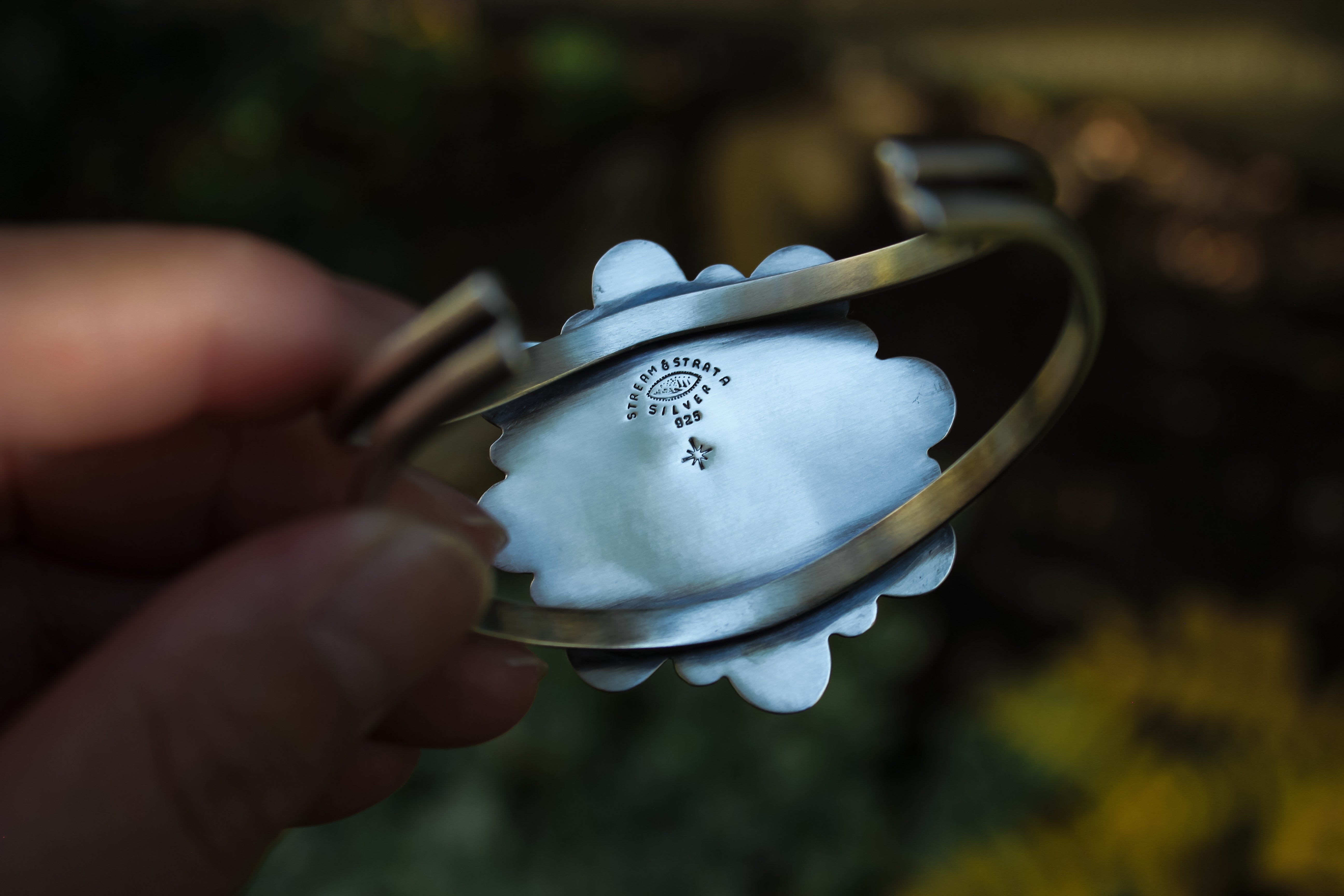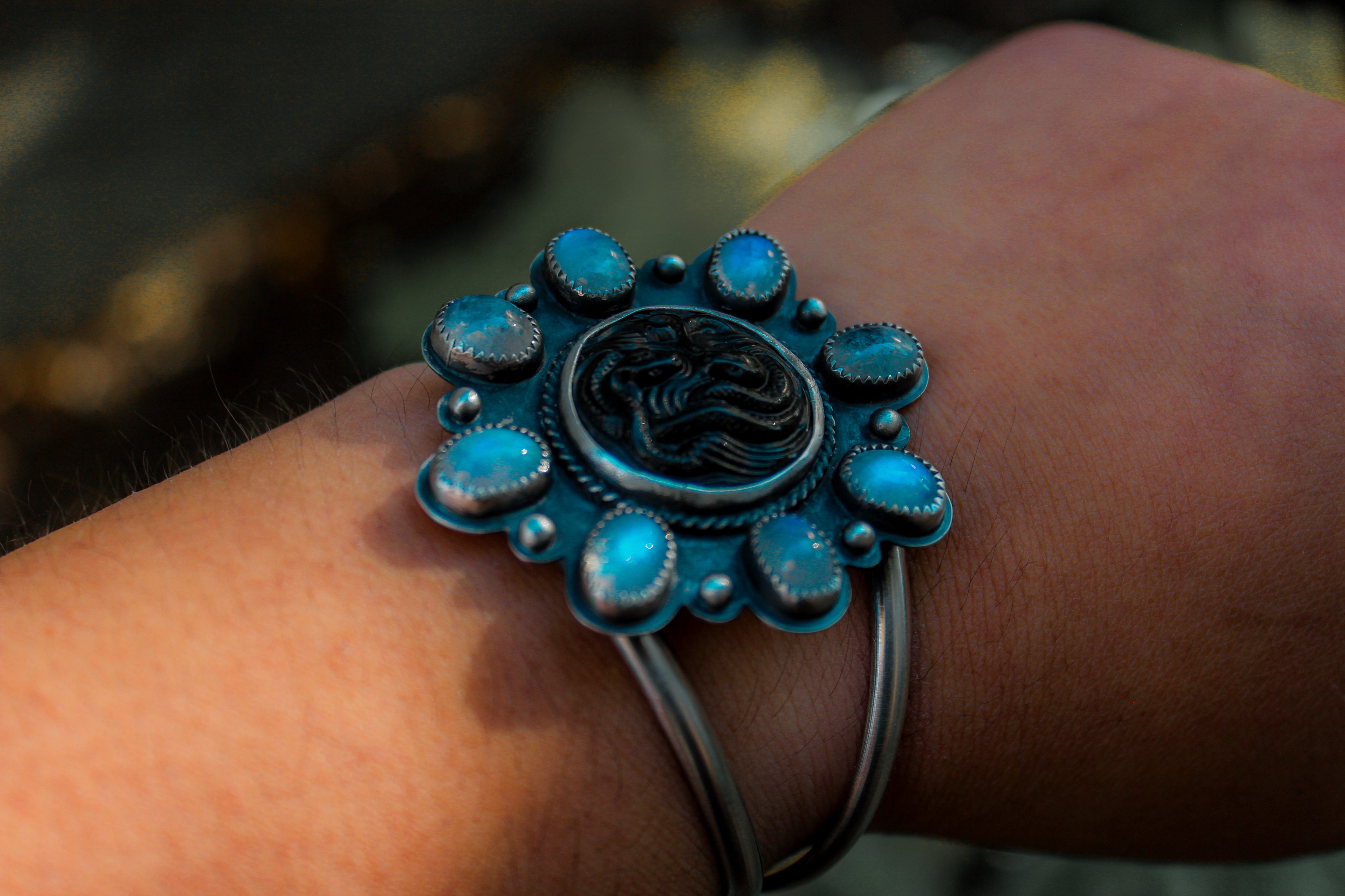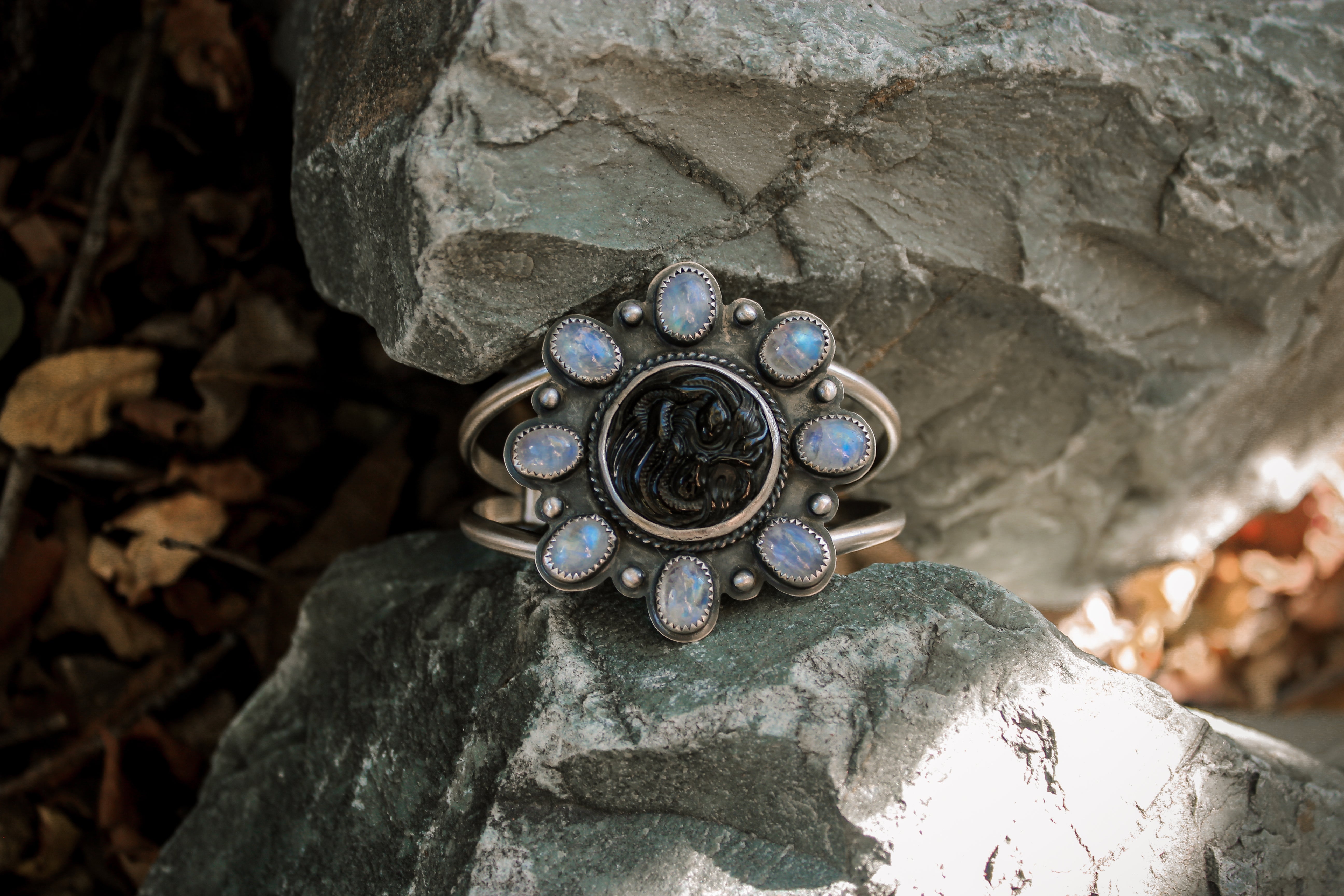 Twisted snakes slither within the center of this stunning statement cuff, carved out of deep black obsidian. A cluster of moonstones have been positioned around the snakes, shimmering lightly as the sun catches their blue flash. Snakes are often used to symbolize new beginnings after death, the cycle of life in its purest form, which is why I positioned everything into a uniform circle. A true statement piece, perfect for those who need a gentle reminder that good things will follow the bad, and they must exist together to form a balance.