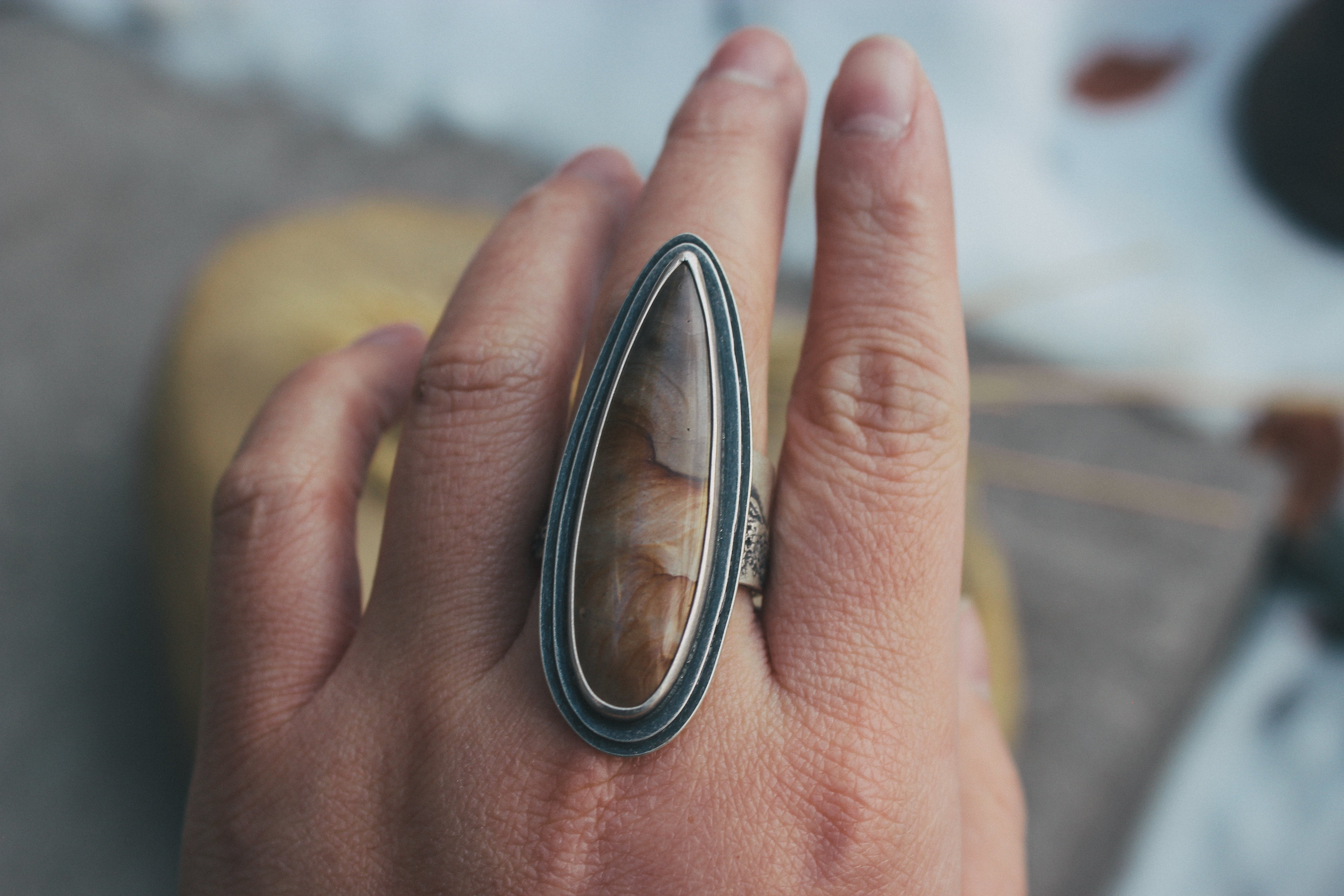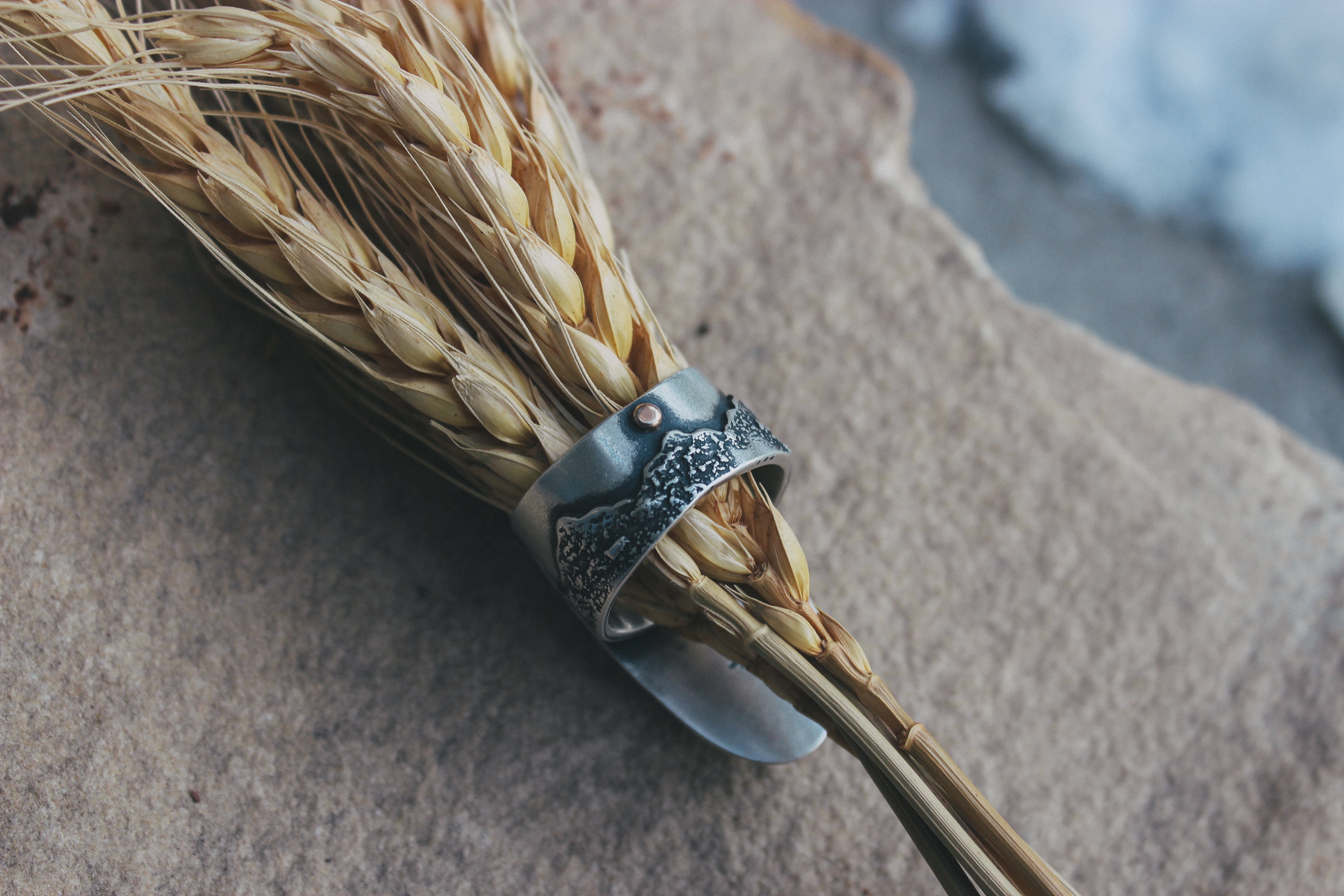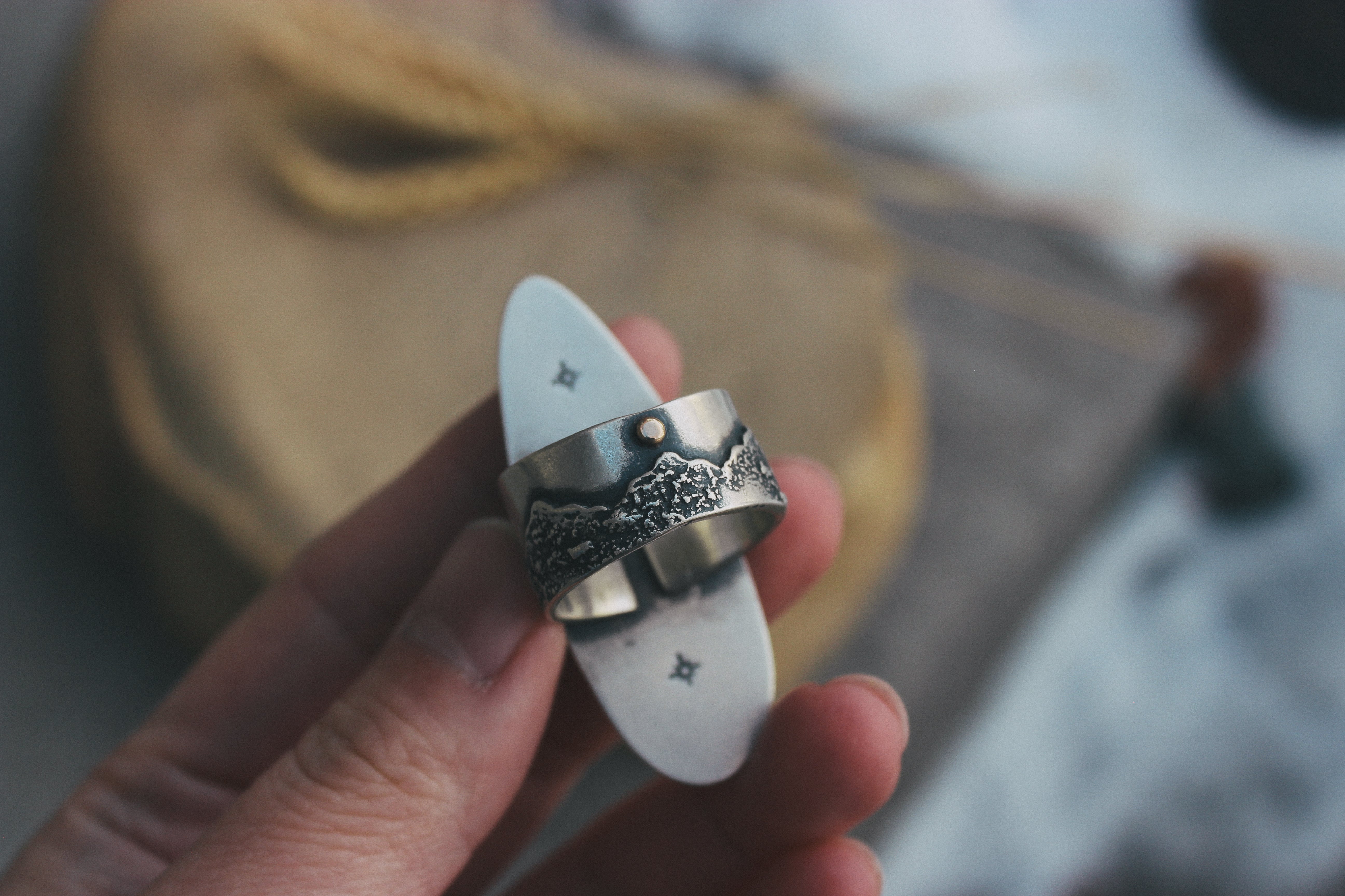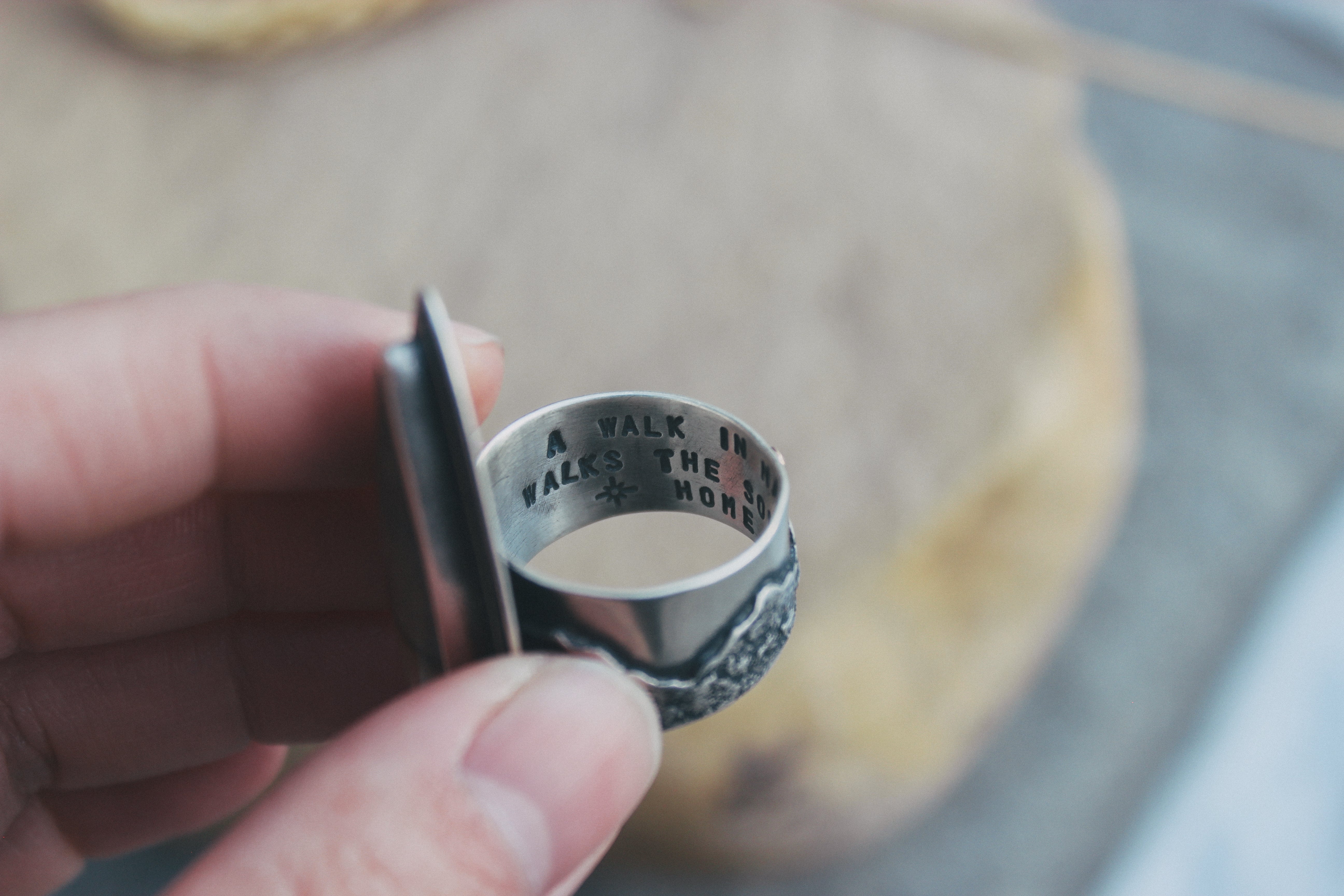 A trip down memory lane with this beauty! This is a ring that I made for myself a couple years ago, with one of my absolute favorite stones (from Lone Peak Cabs no less!) that I've ever purchased. I set it atop a textured mountain band with a 14k gold sun gleaming in the sky. The inside of the band is stamped with the phrase: "A walk in nature walks the soul back home". A reminder to get out there and release your wild side, reconnect with the earth and all that she has to offer.