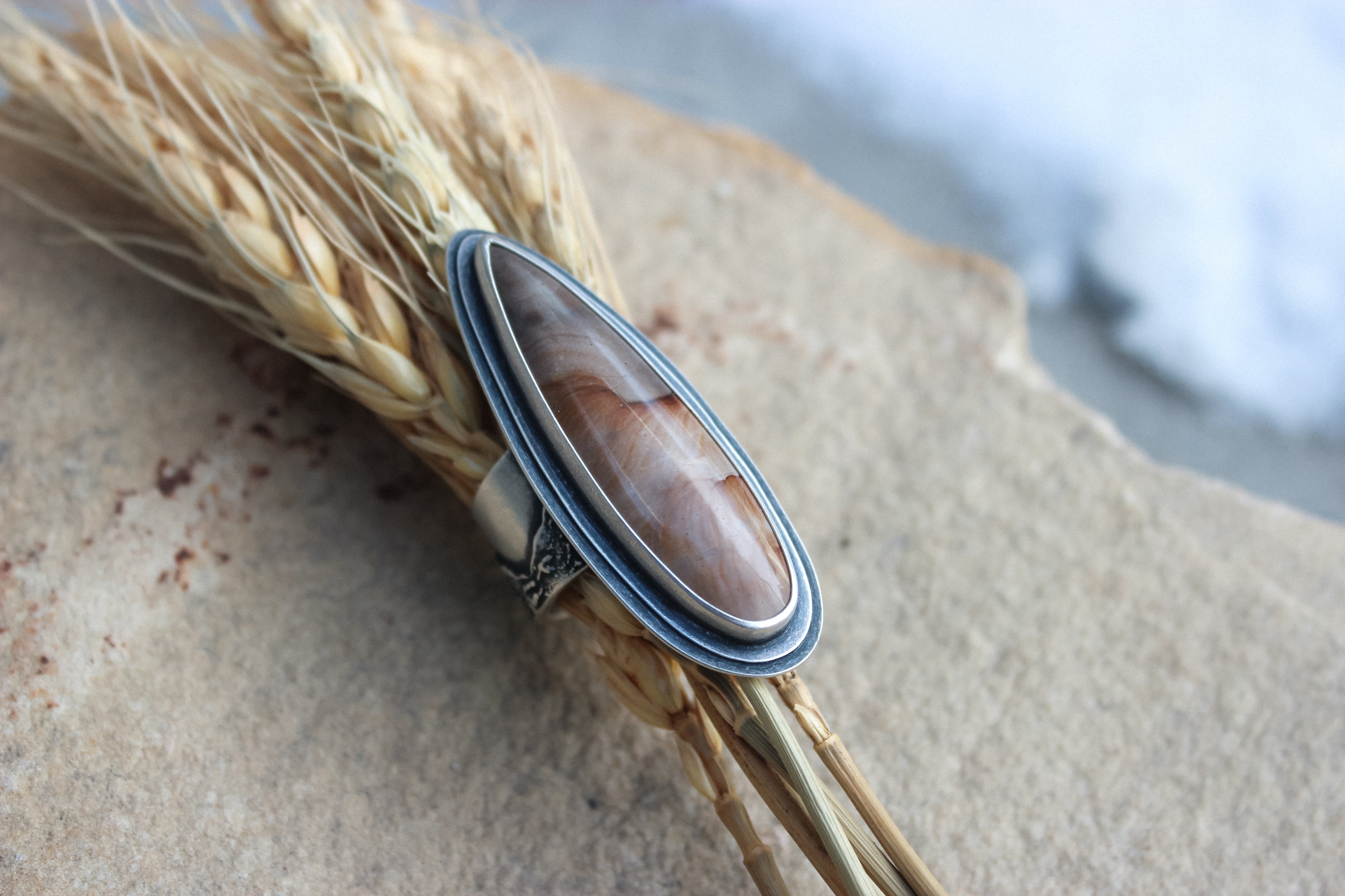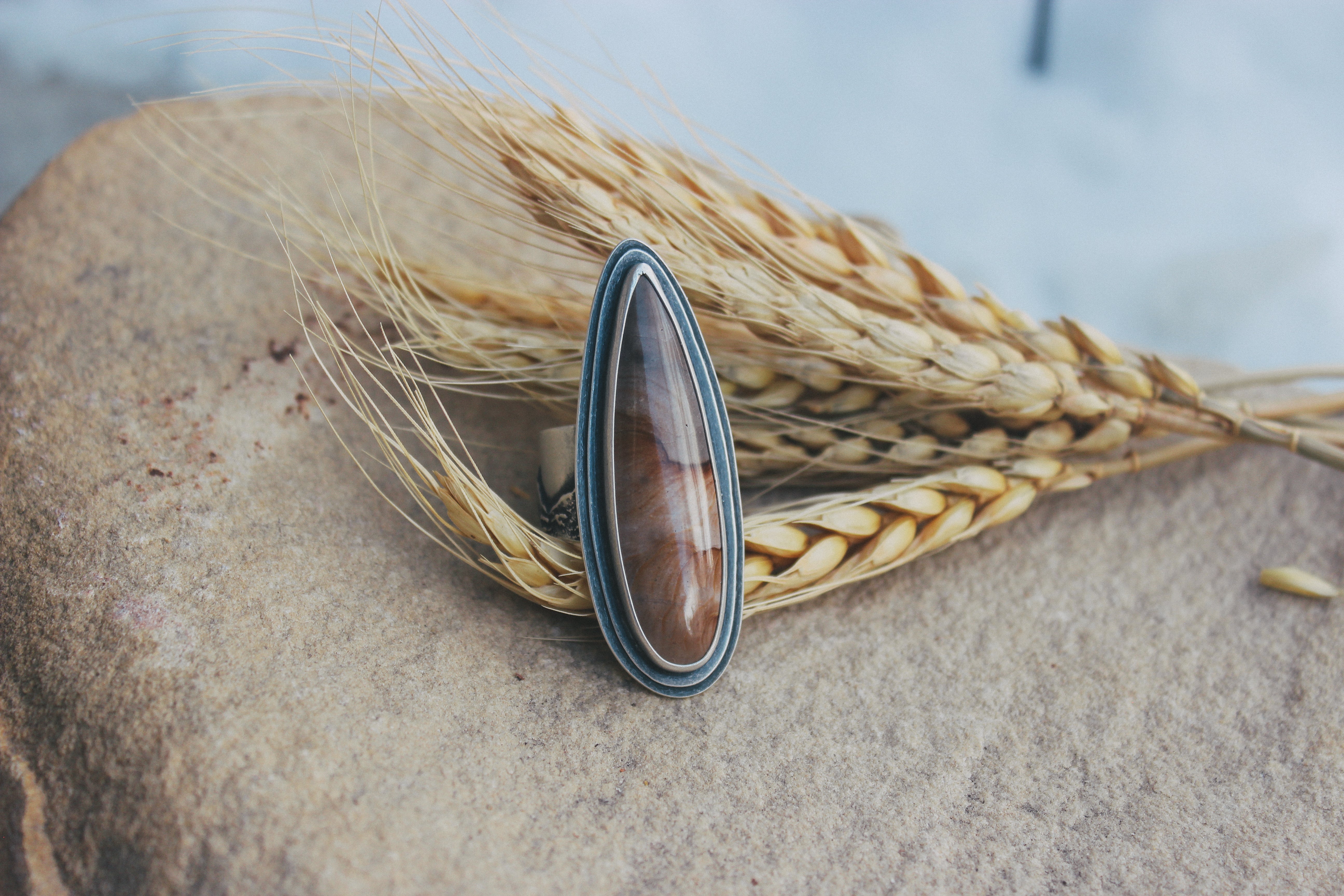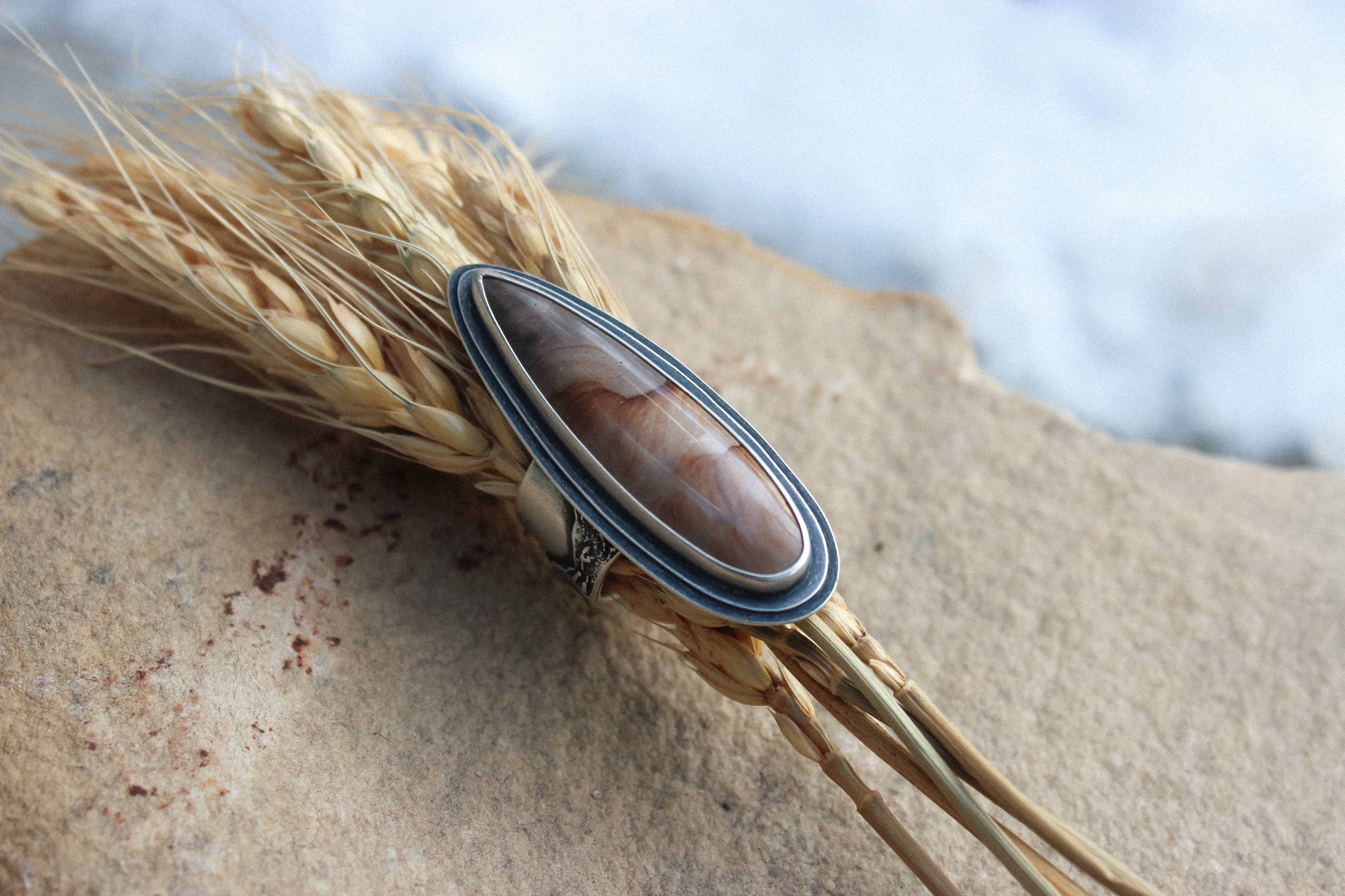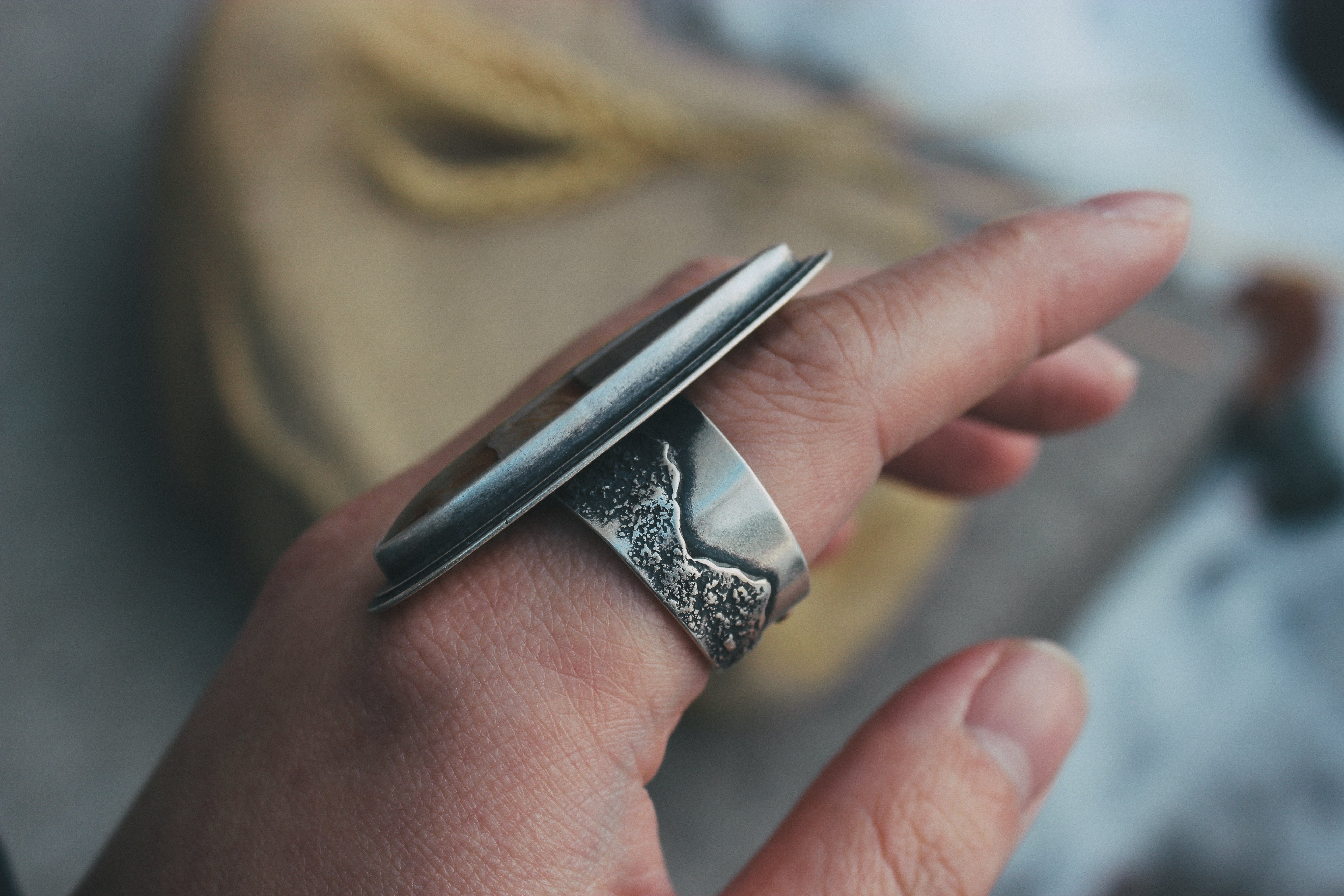 A trip down memory lane with this beauty! This is a ring that I made for myself a couple years ago, with one of my absolute favorite stones (from Lone Peak Cabs no less!) that I've ever purchased. I set it atop a textured mountain band with a 14k gold sun gleaming in the sky. The inside of the band is stamped with the phrase: "A walk in nature walks the soul back home". A reminder to get out there and release your wild side, reconnect with the earth and all that she has to offer.