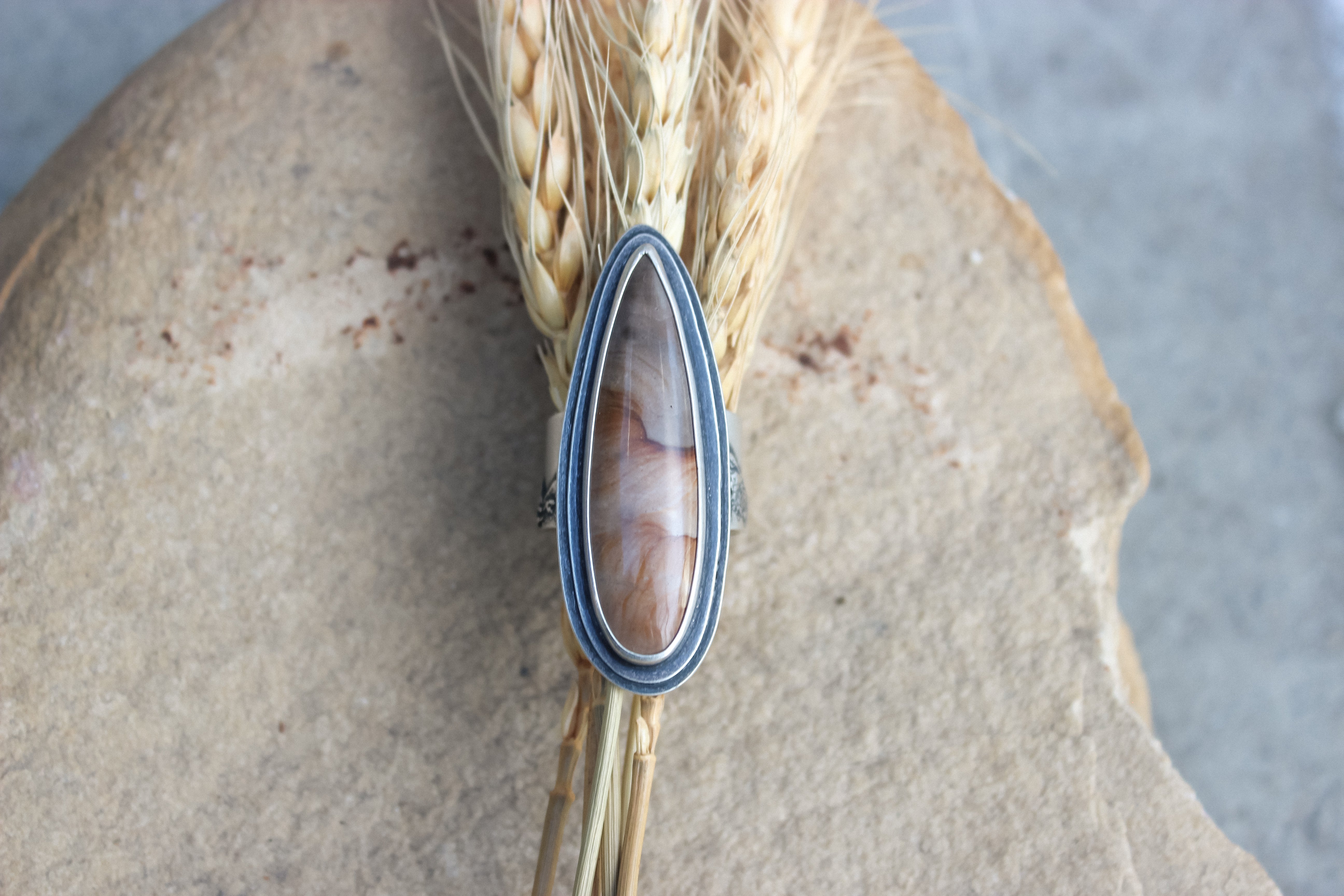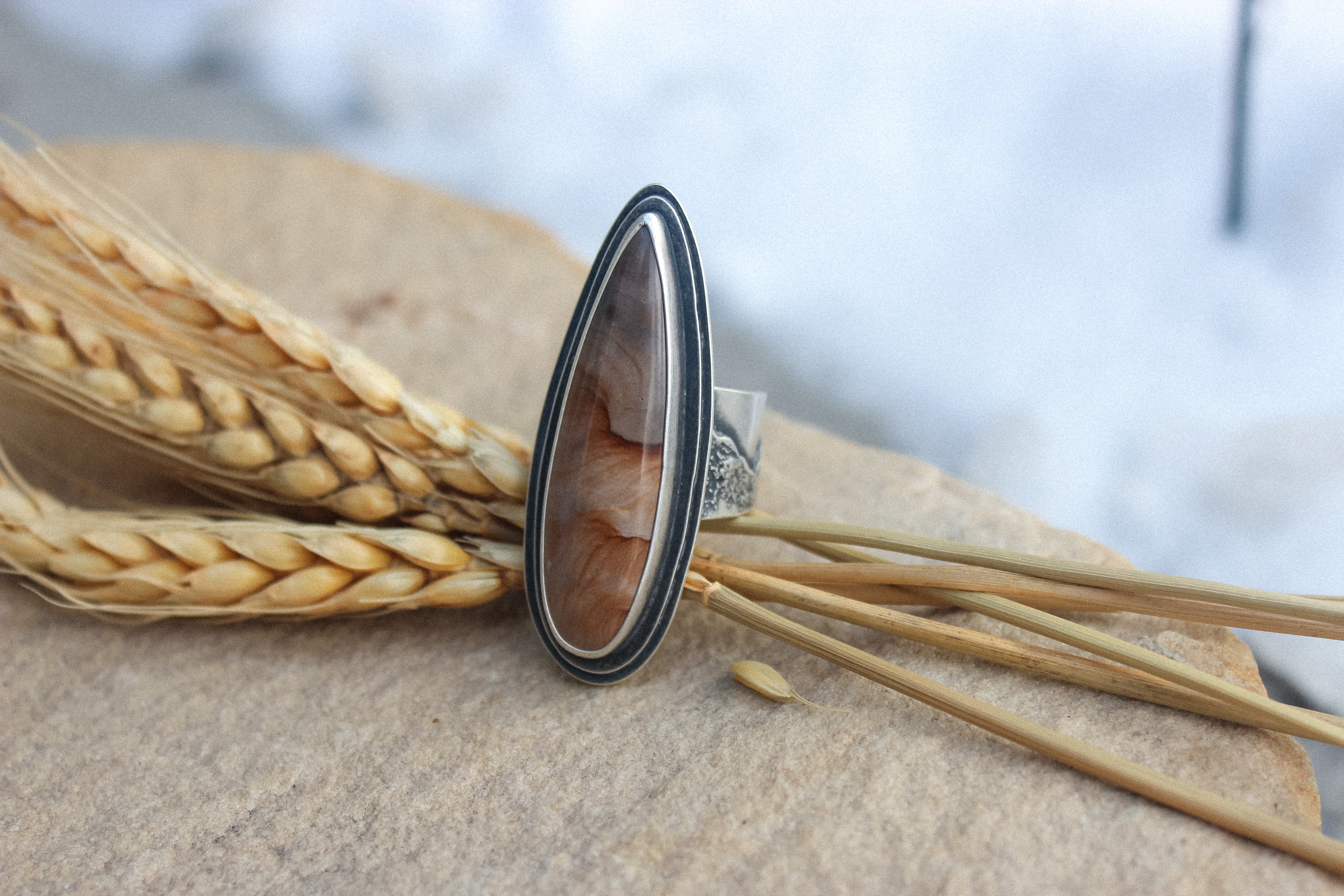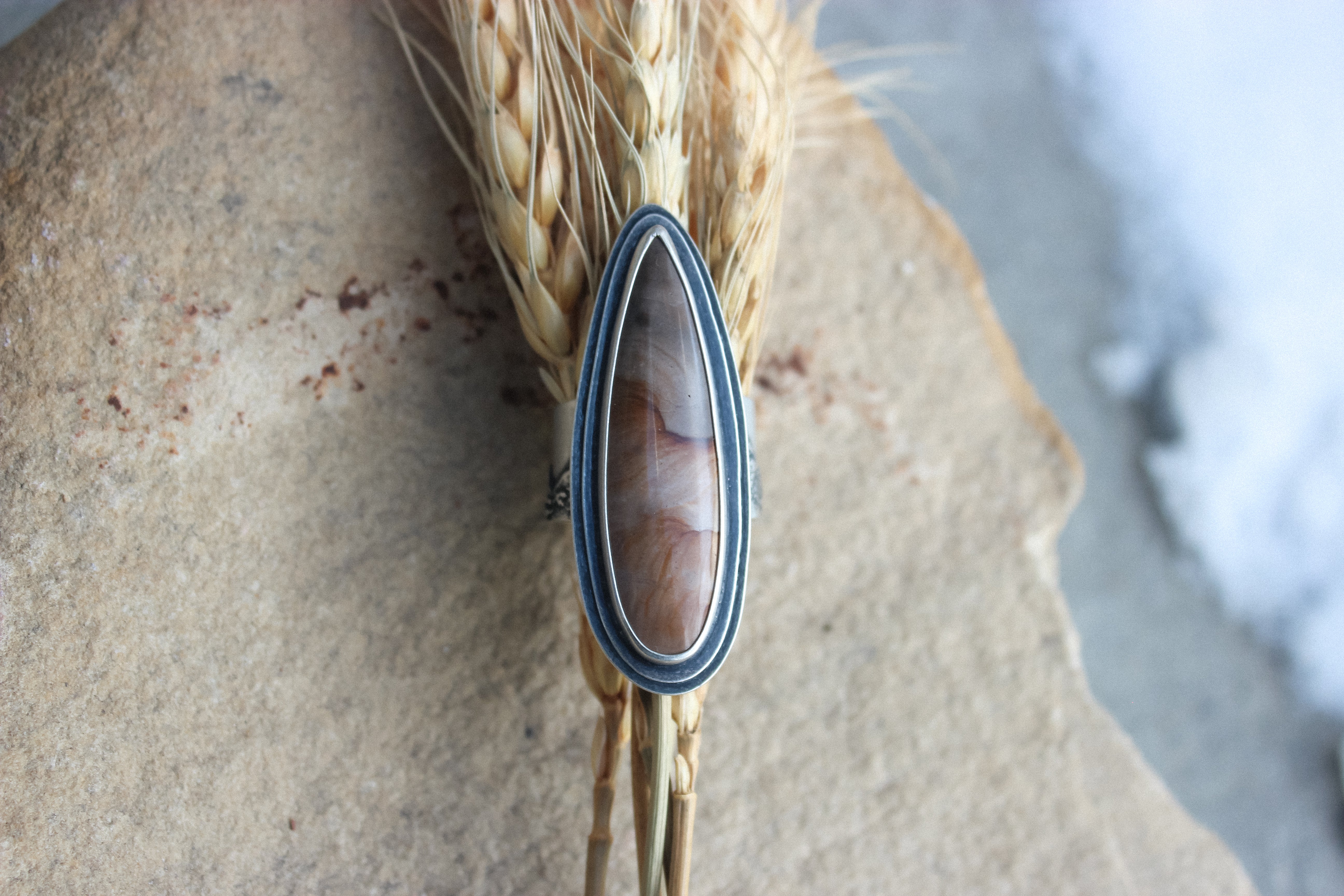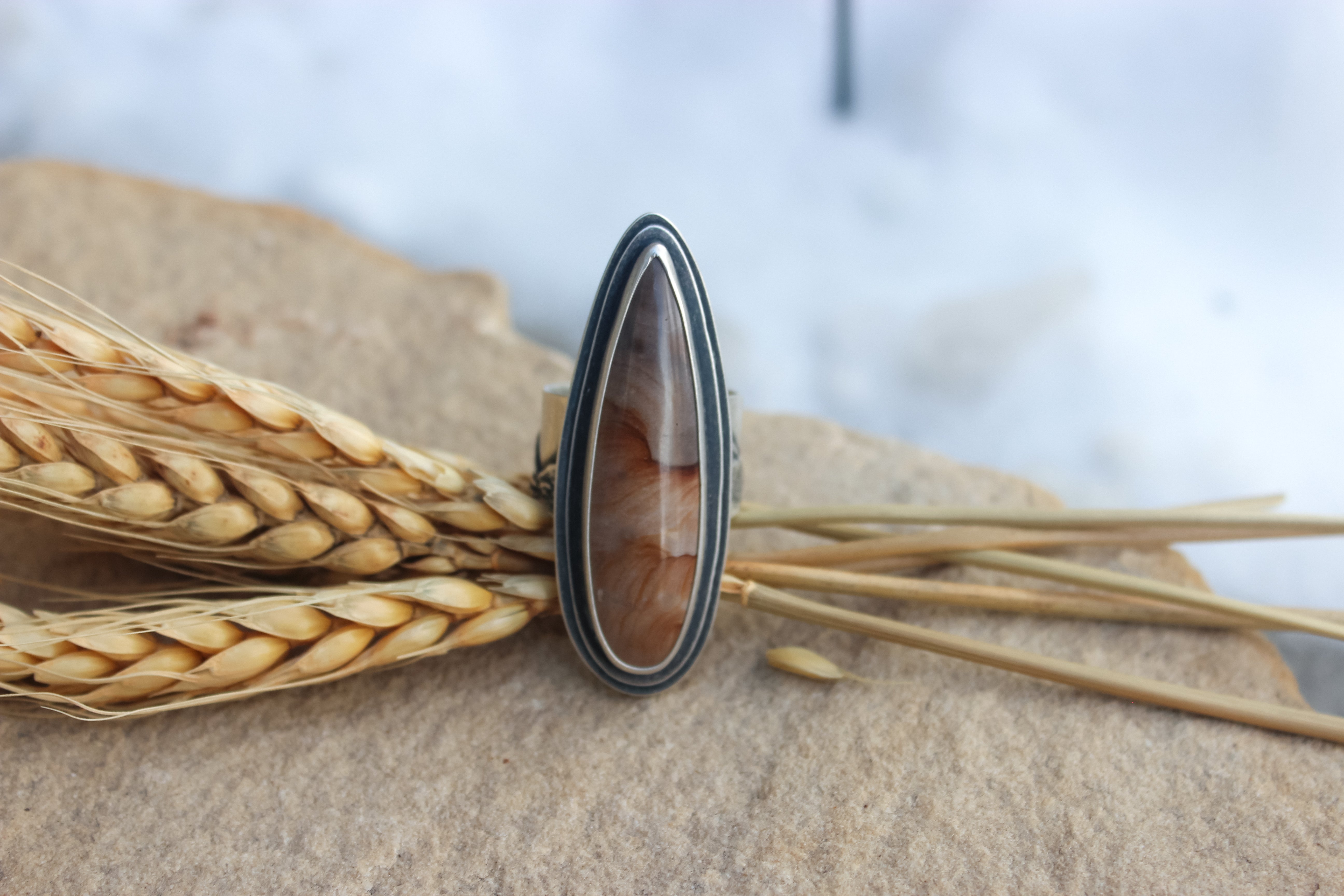 A trip down memory lane with this beauty! This is a ring that I made for myself a couple years ago, with one of my absolute favorite stones (from Lone Peak Cabs no less!) that I've ever purchased. I set it atop a textured mountain band with a 14k gold sun gleaming in the sky. The inside of the band is stamped with the phrase: "A walk in nature walks the soul back home". A reminder to get out there and release your wild side, reconnect with the earth and all that she has to offer.