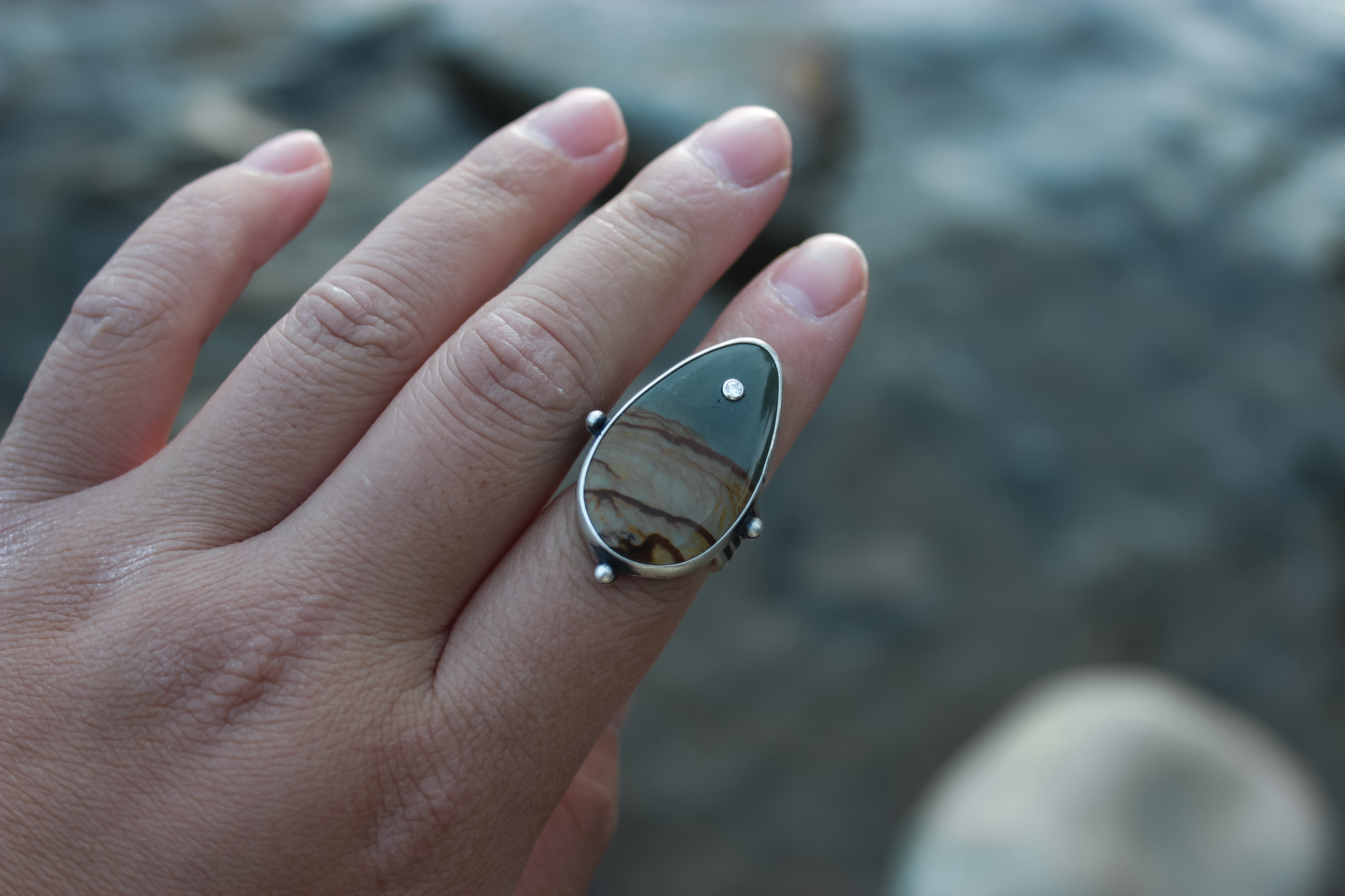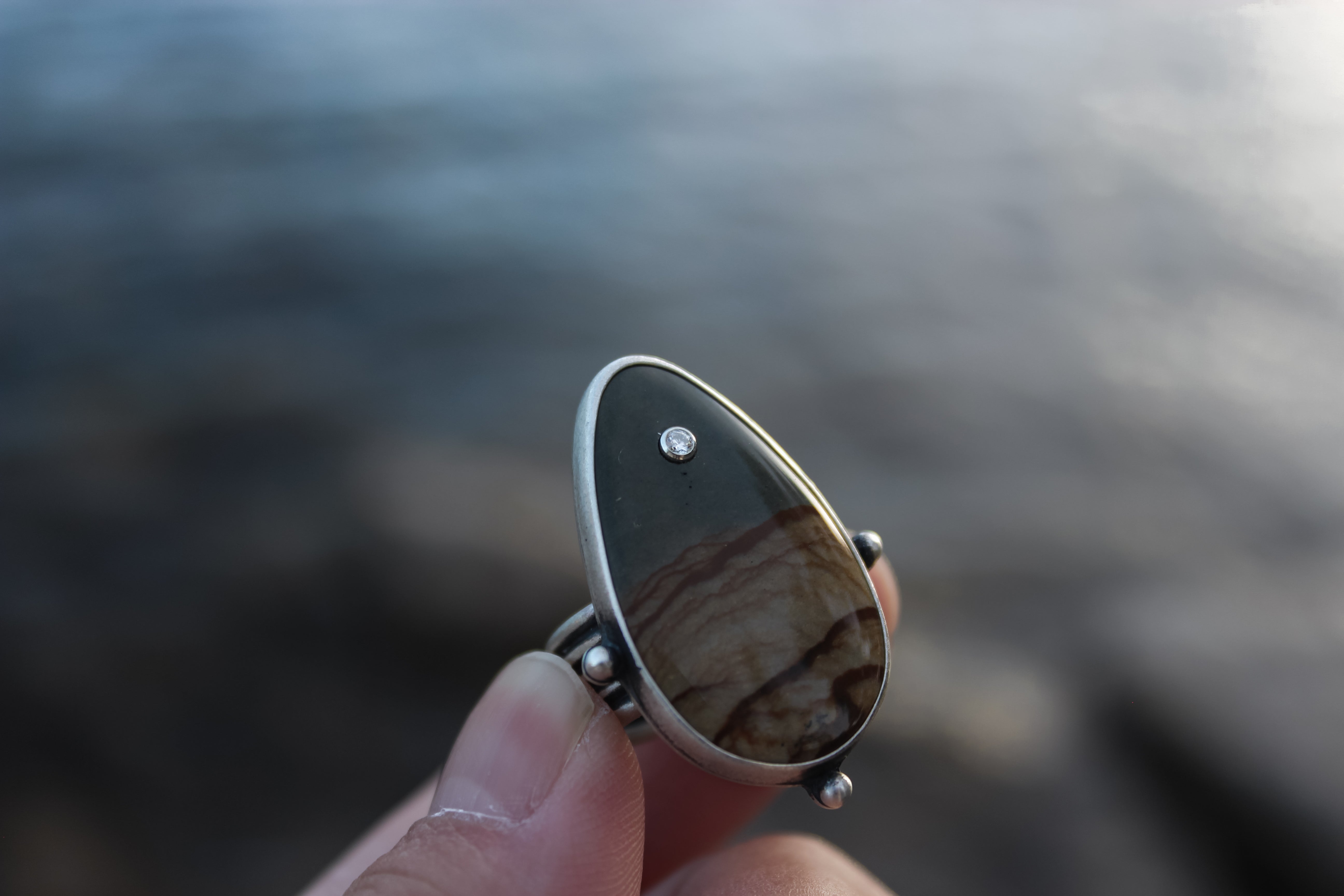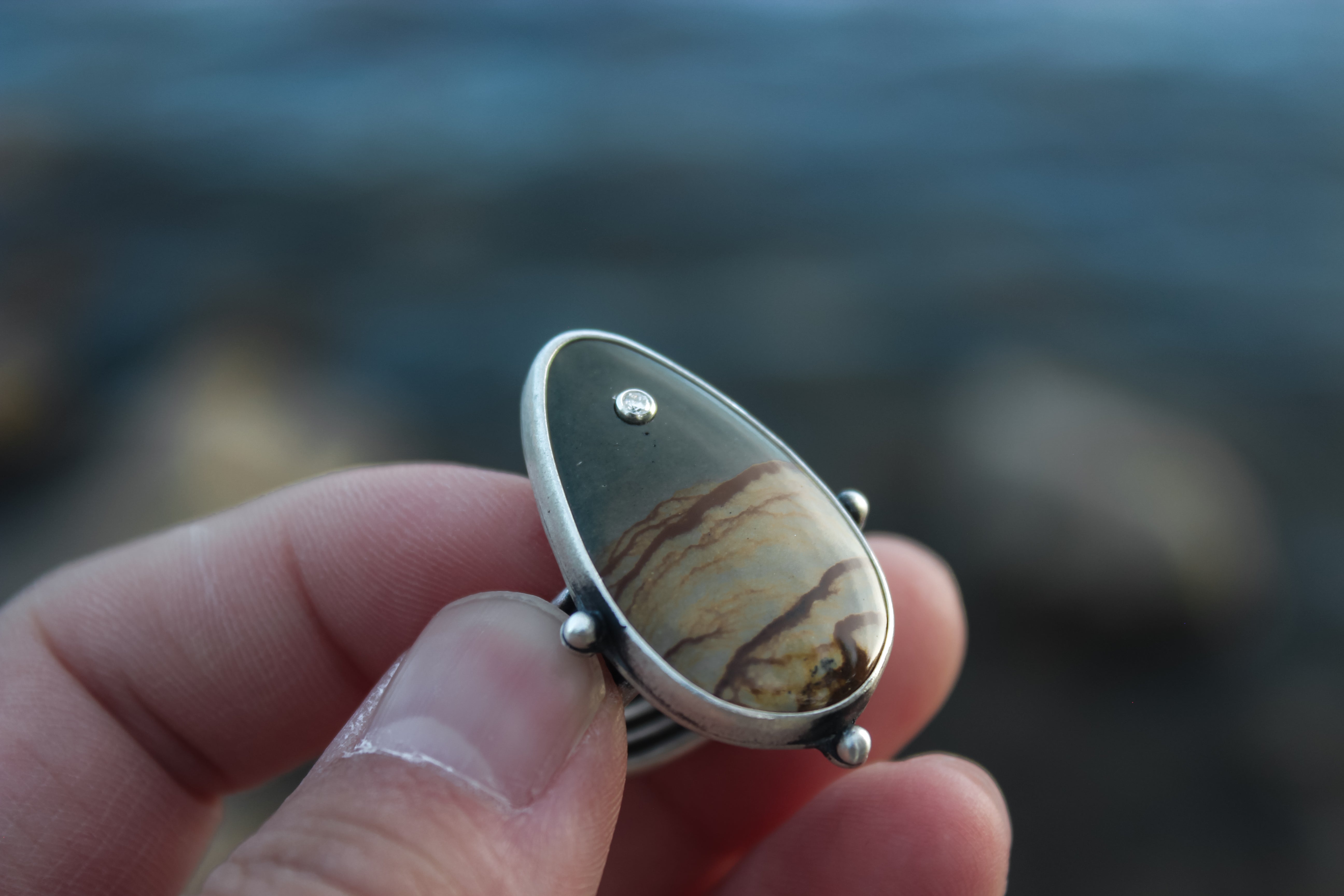 Cripple Creek Jasper with a 2mm moissanite set within silver, nestled into the stone