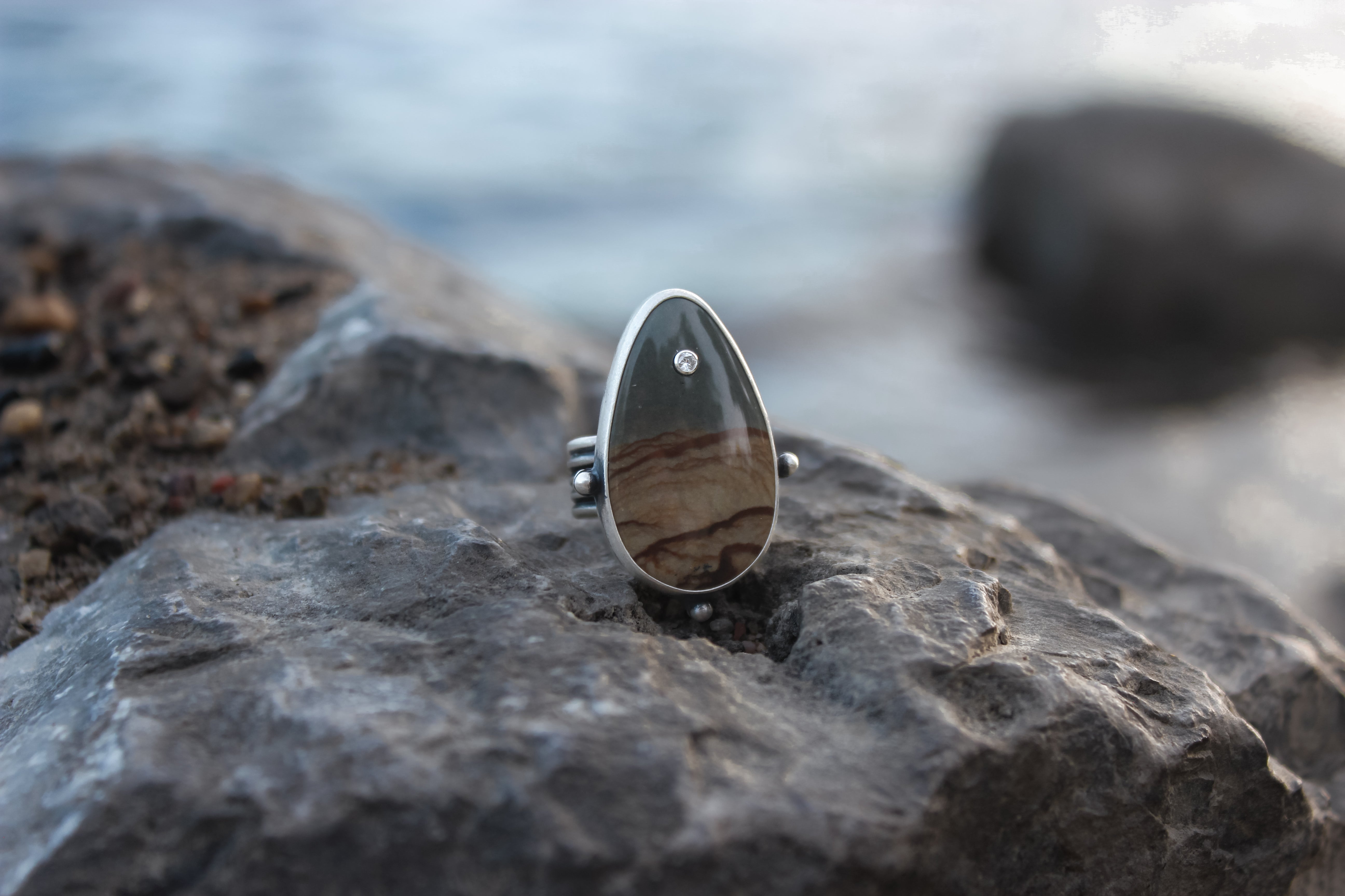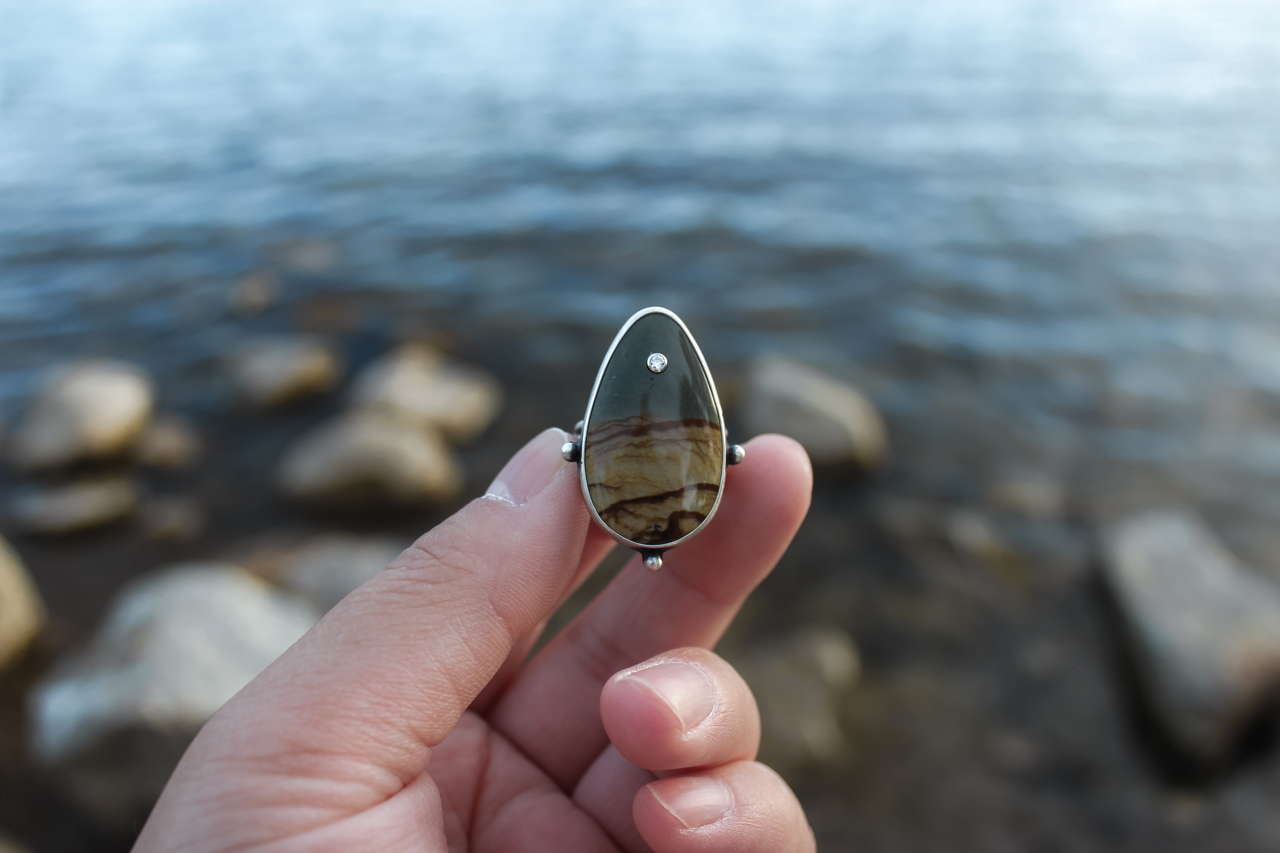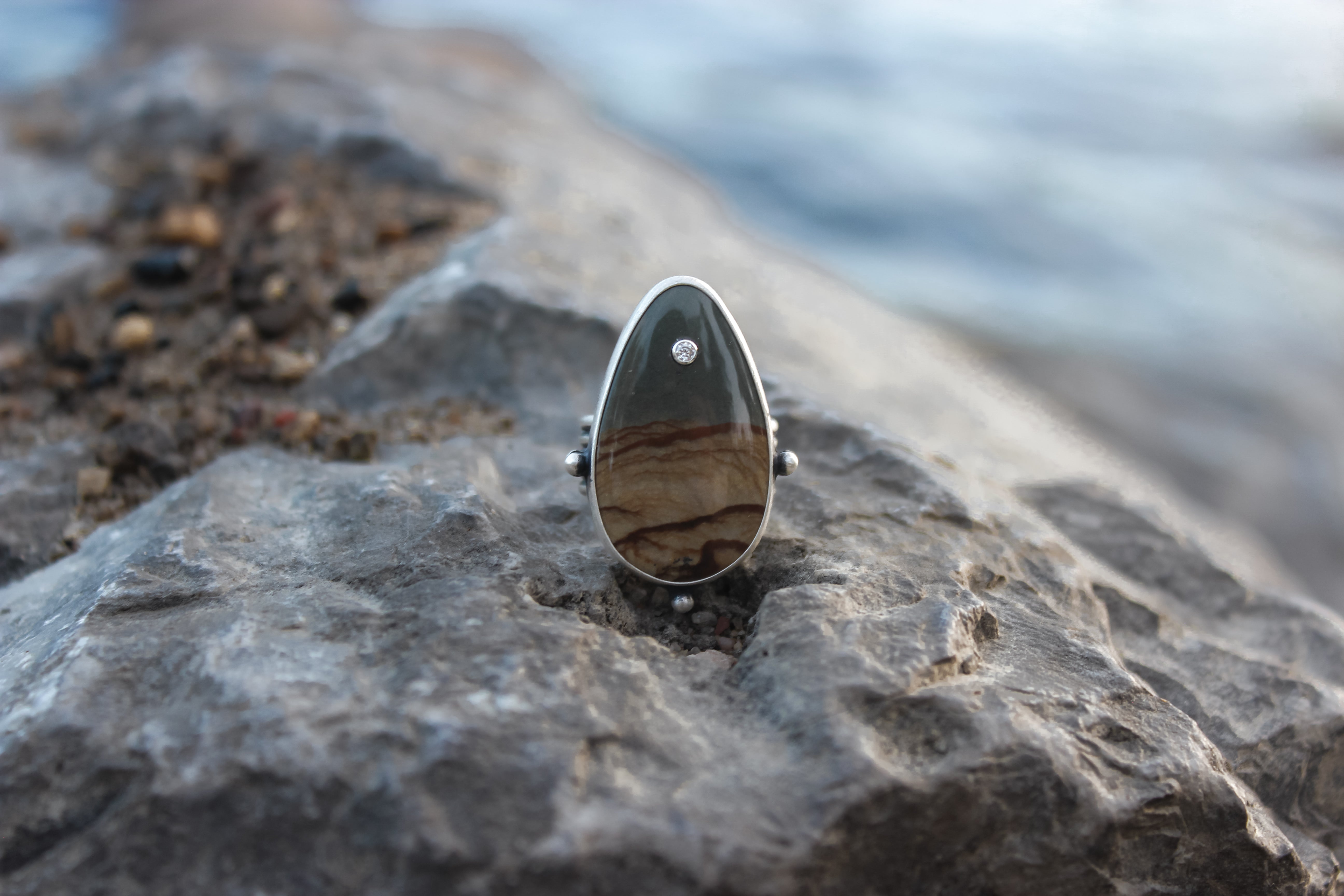 Cripple Creek Jasper with a 2mm moissanite set within silver, nestled into the stone