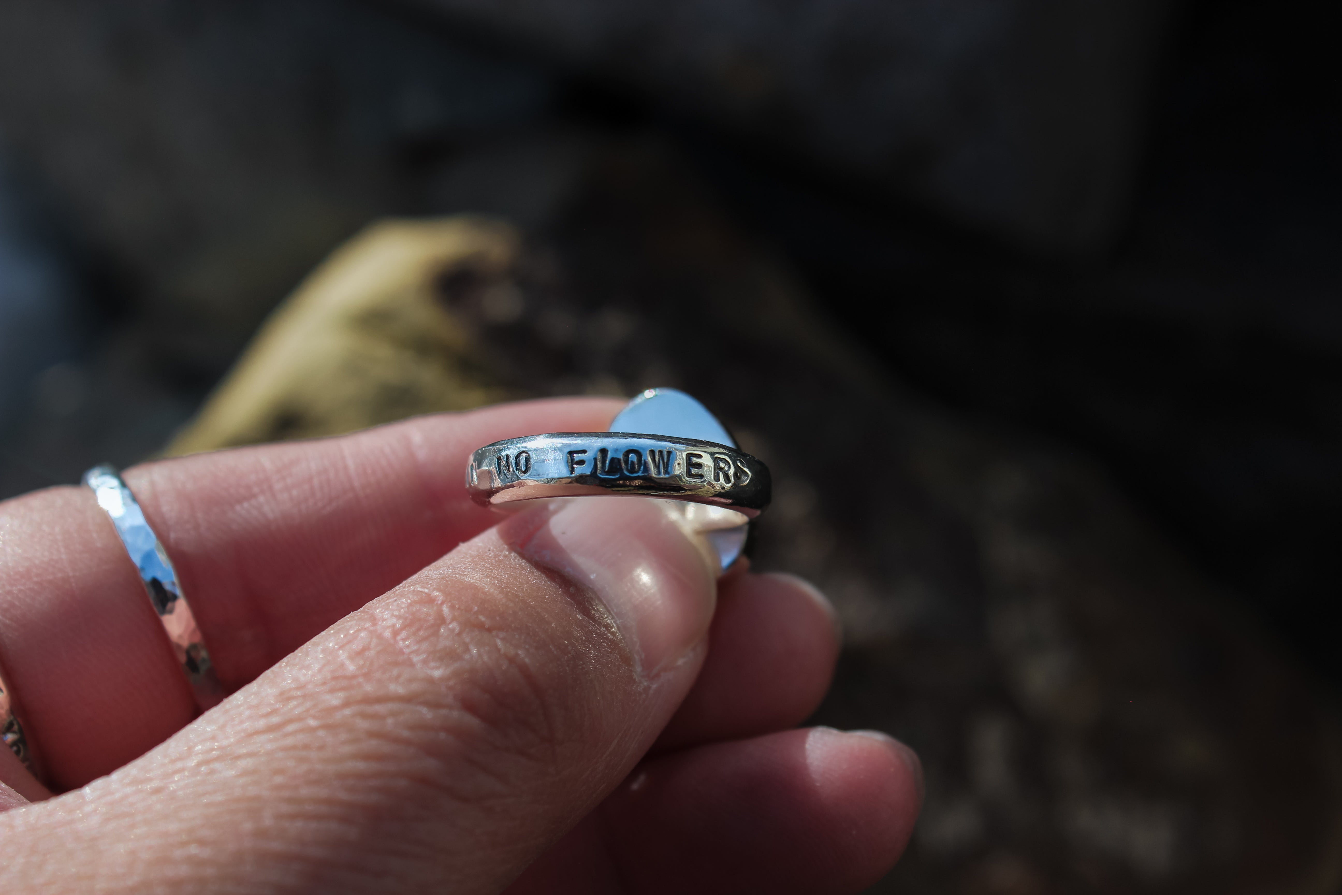 Along the band is stamped with No Rain No Flowers, with an icy blue Calypso variscite stone wrapped in 14k gold filled metal. Comes with an extra stacker for easy everyday wear.