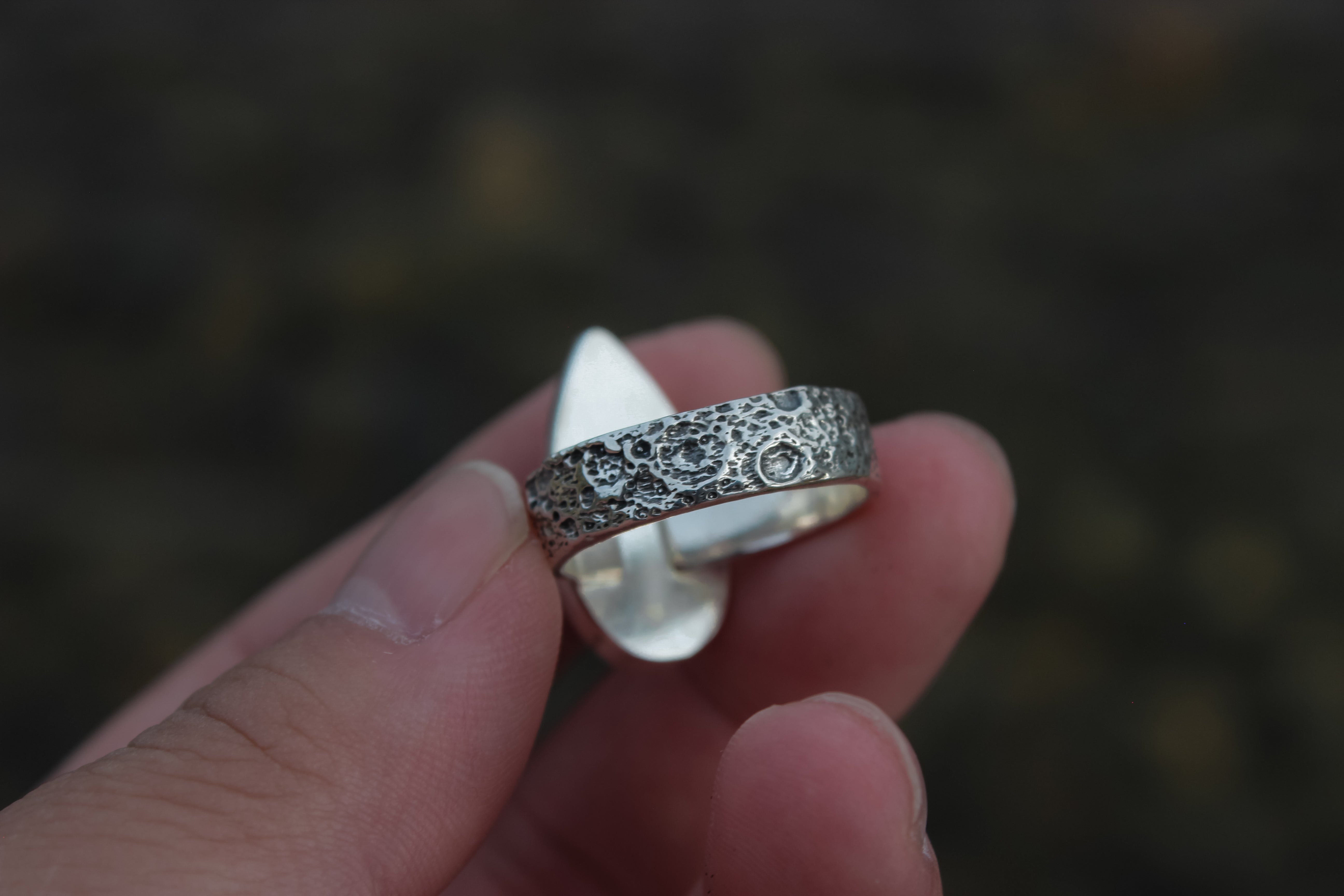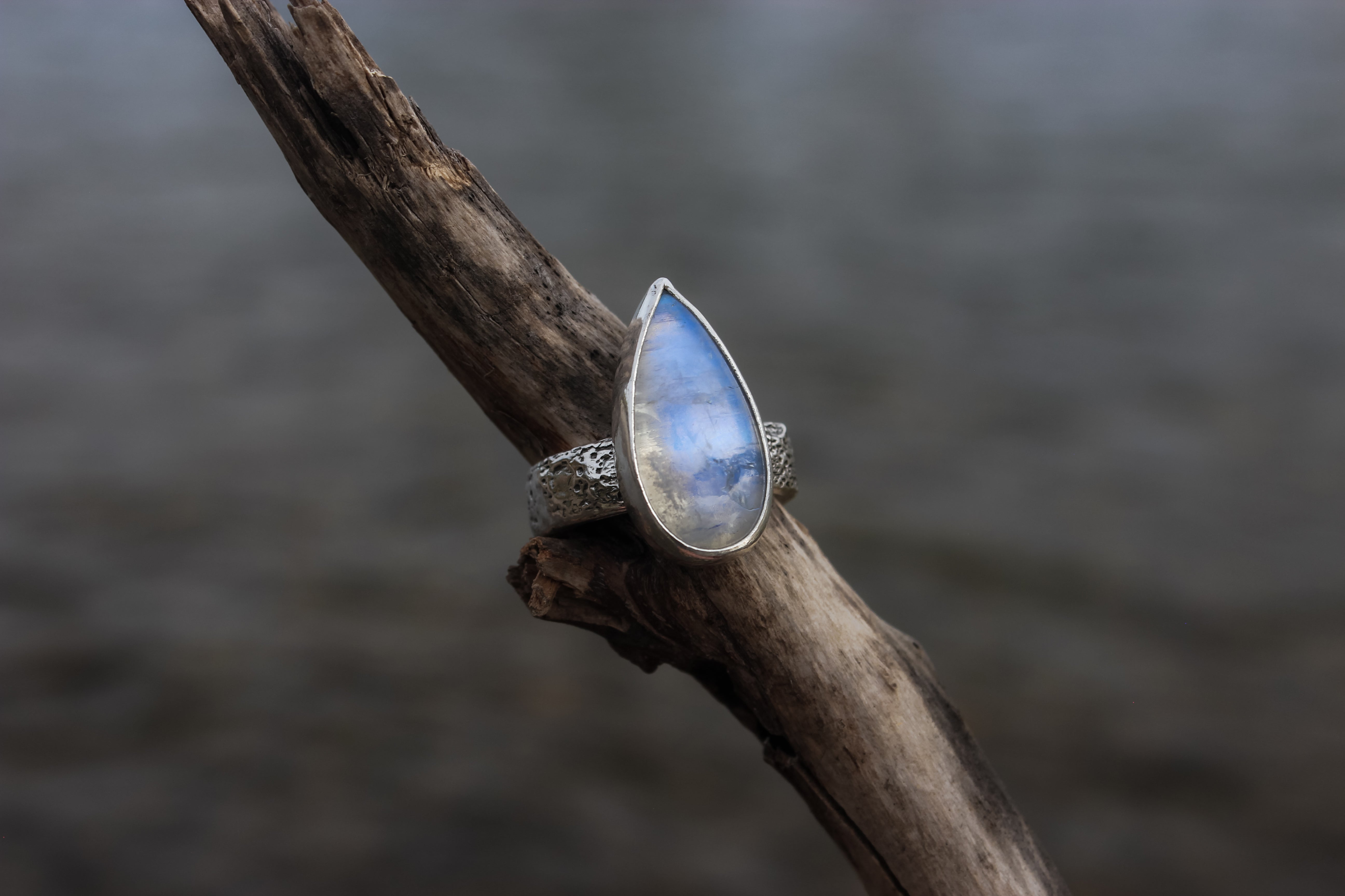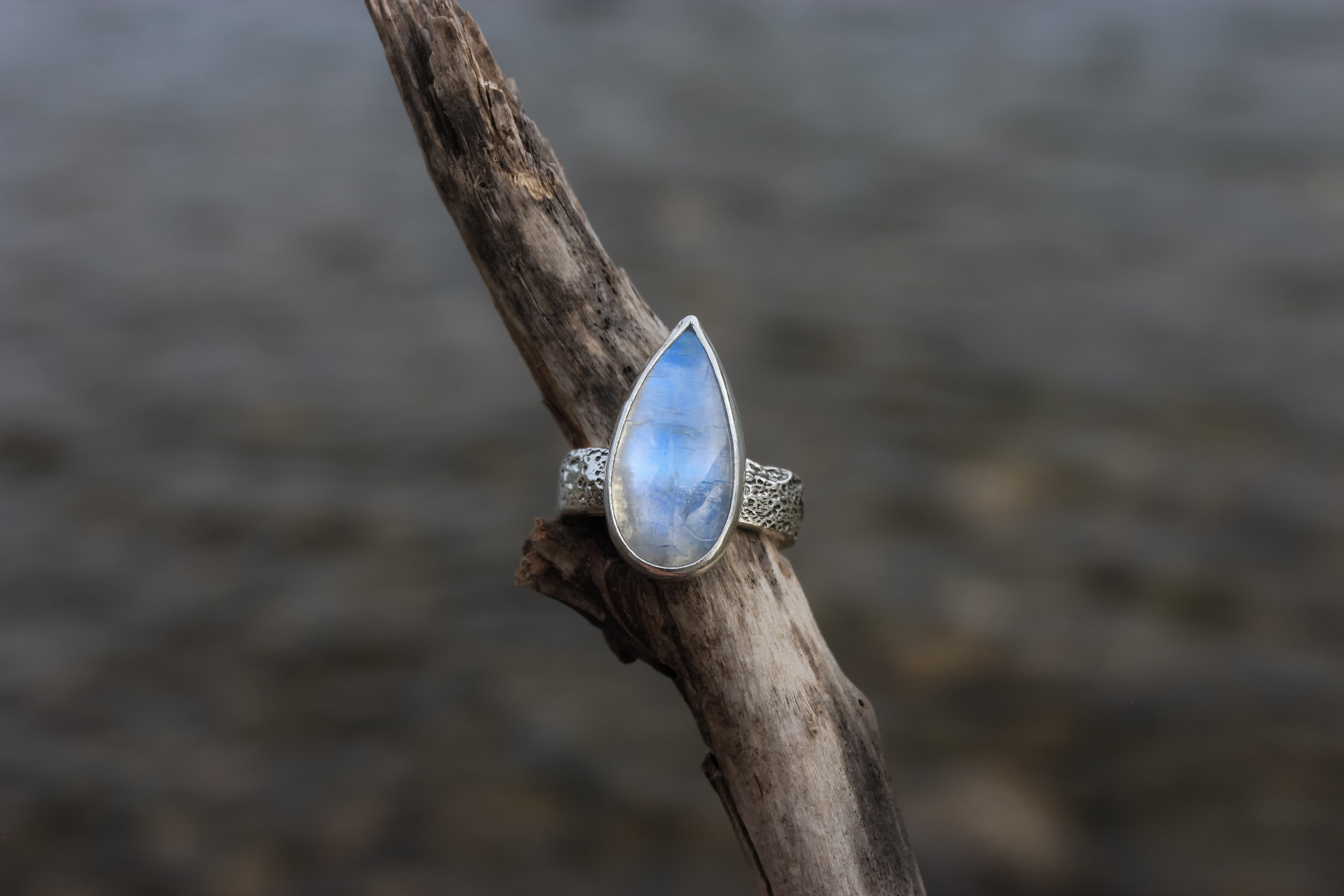 The flash on this rainbow moonstone is like the beams of the moon have been encapsulated within its icy hold. It flashes pure blue from all angles, and is one of my most precious pieces that I've been holding onto since I started this metalsmithing journey. It sits atop a textured lunar band, complete with craters and dips like the surface of the moon.